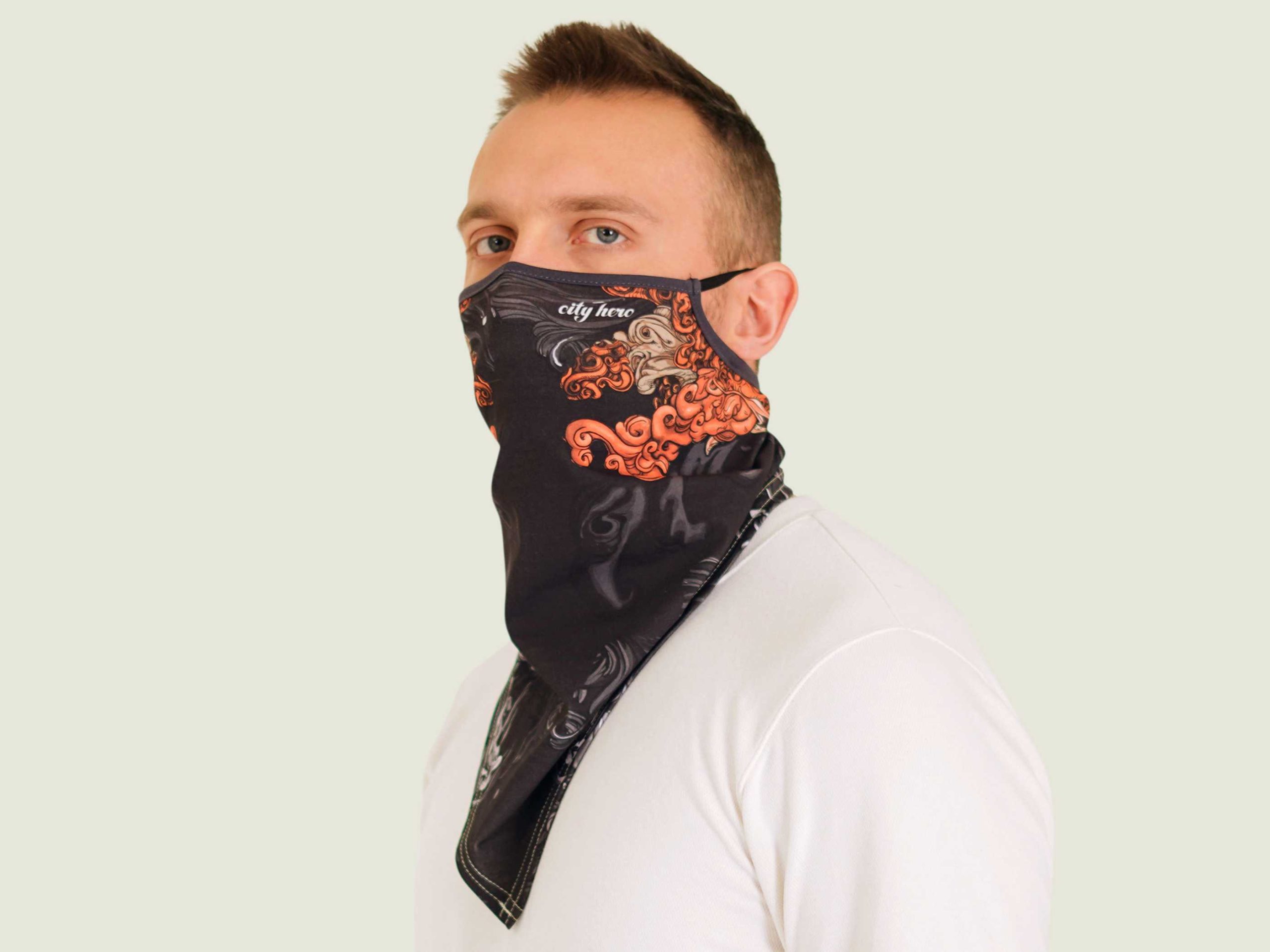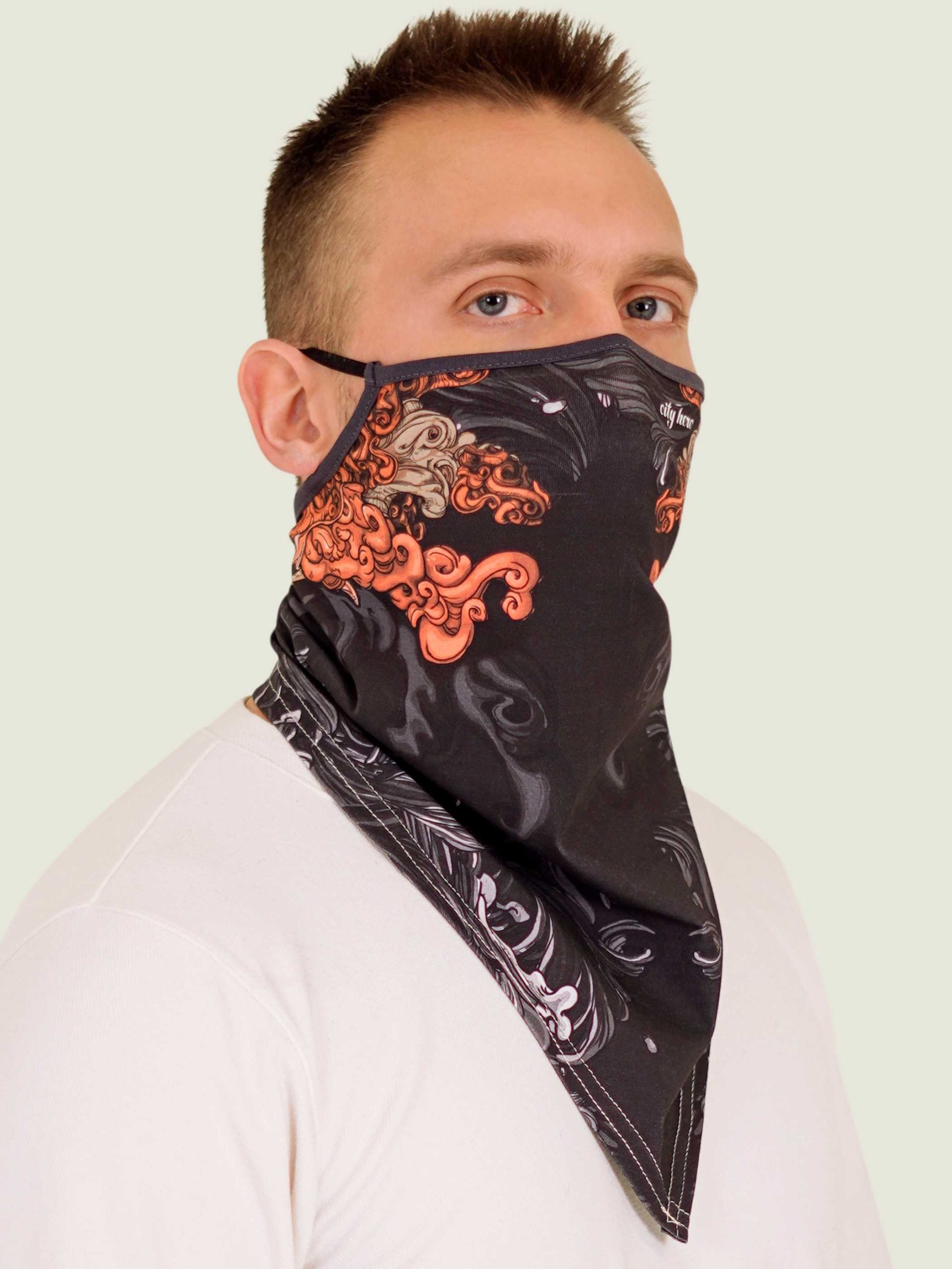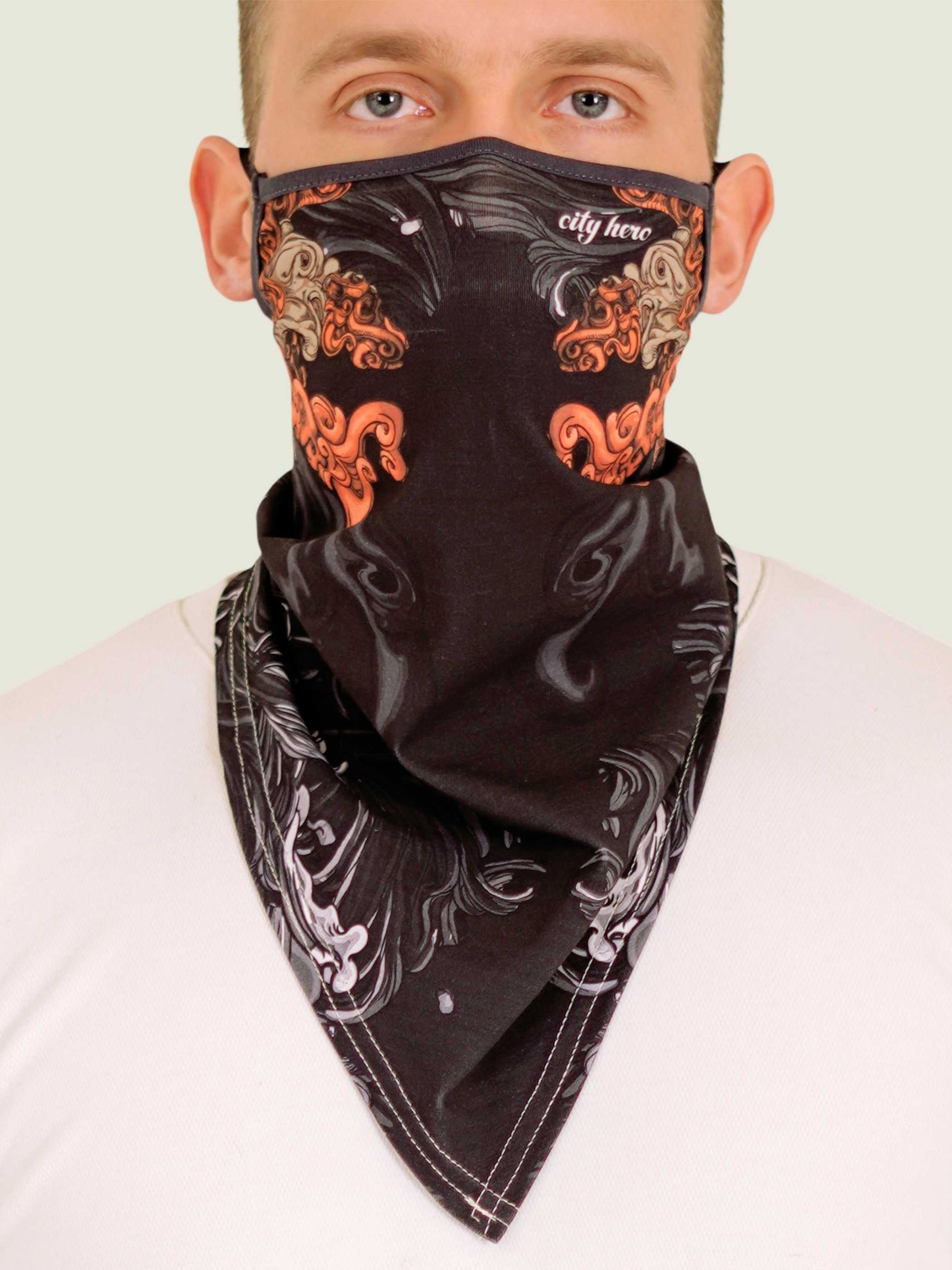 Удобная маска-платок из нежного хлопкового трикотажа с принтом AKITA SAMURAI BLACK и логотипом Мастерской. Ультра-легкие резинки не давят и не натирают уши. Мы позаботились о том, чтобы в надетом виде в маске было легко дышать, а в спущенном она приятно оборачивала шею. Маска-платок хорошо сочетается почти со всеми принтами CITY HERO, дополняя ваш образ и делая его более сложным.