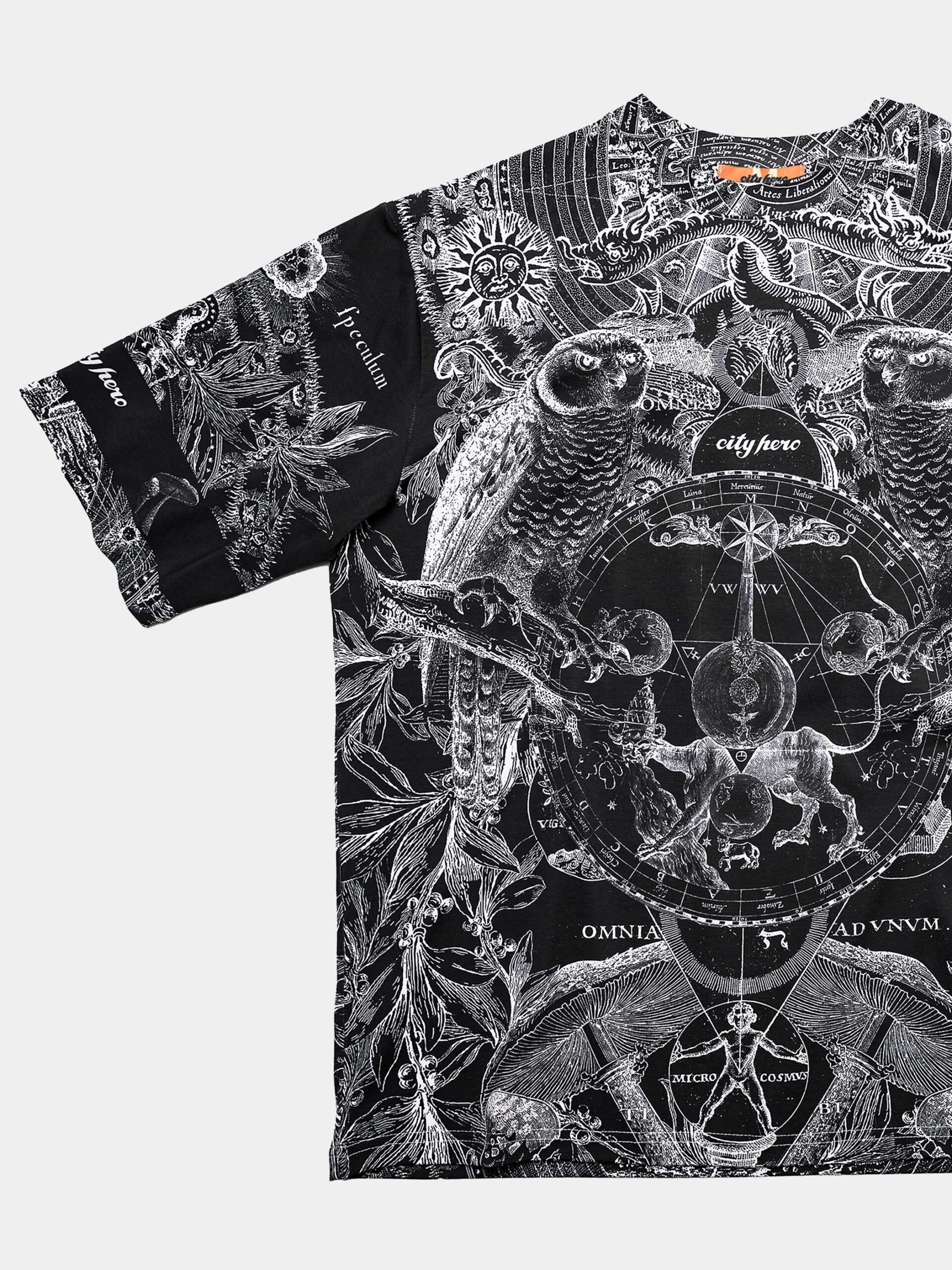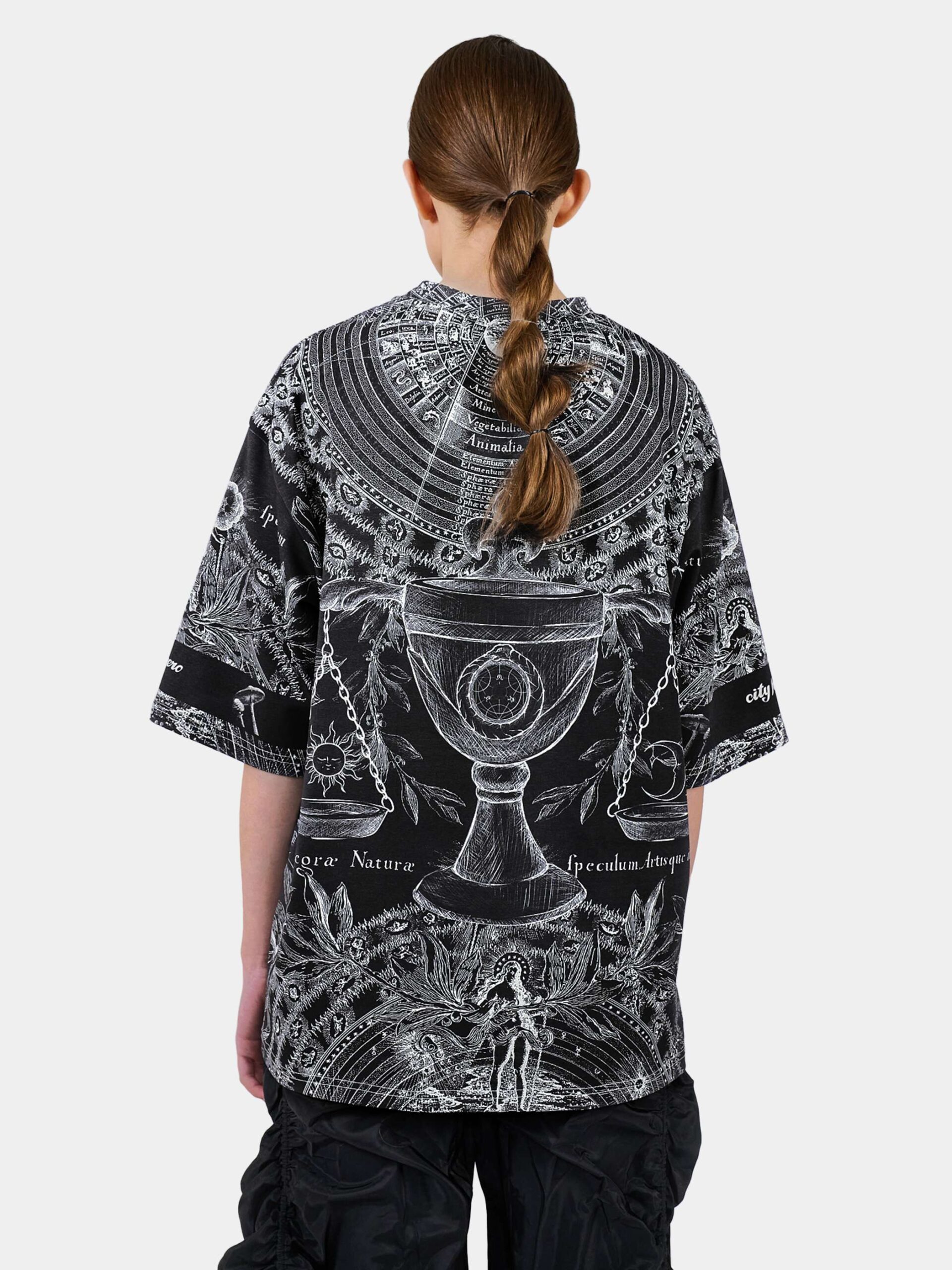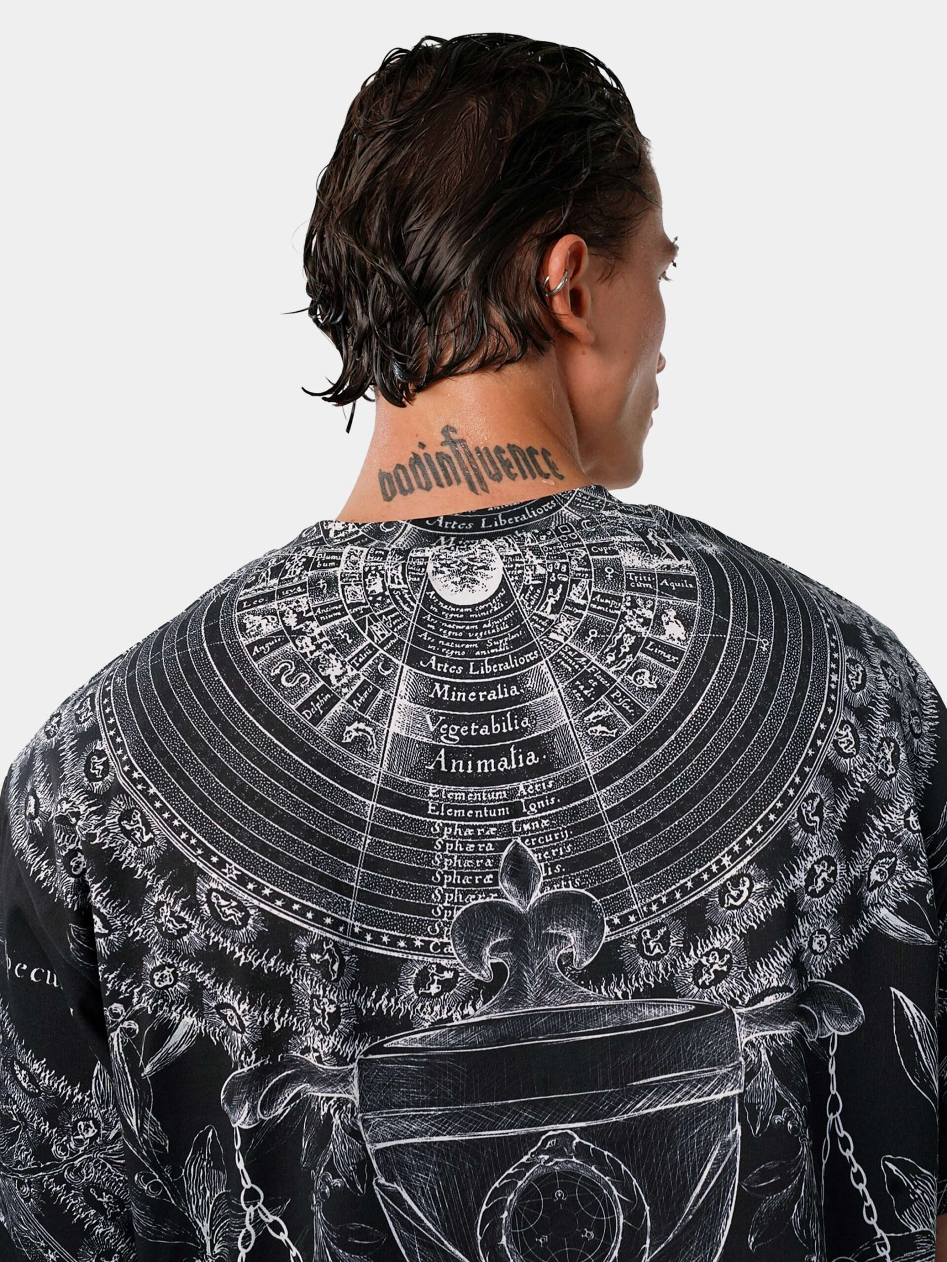 Футболка второго поколения в стиле интеллиджент оверсайз в черном цвете с принтом в виде старинной мистической гравюры с алхимическими элементами и символами.
