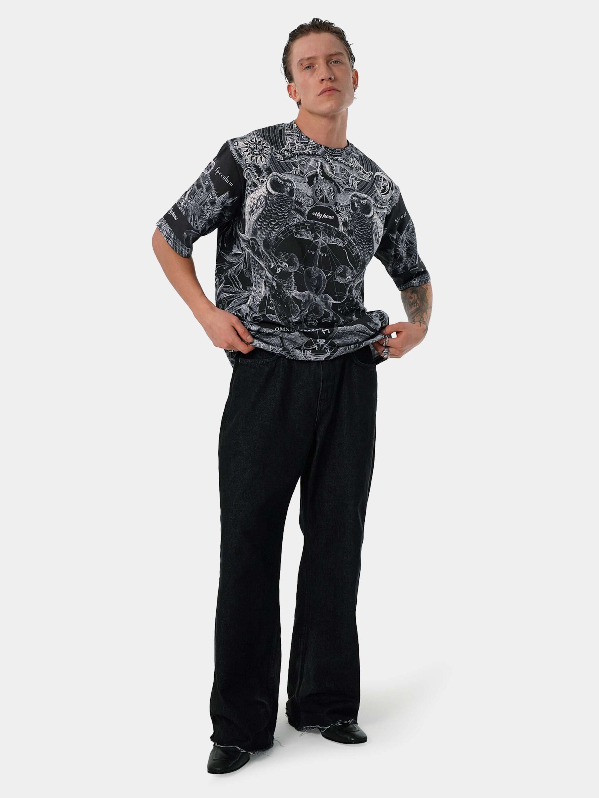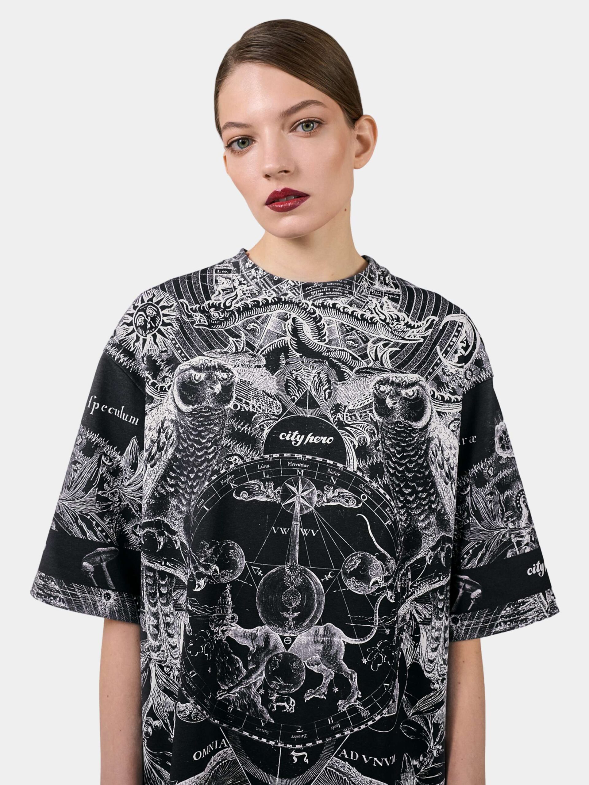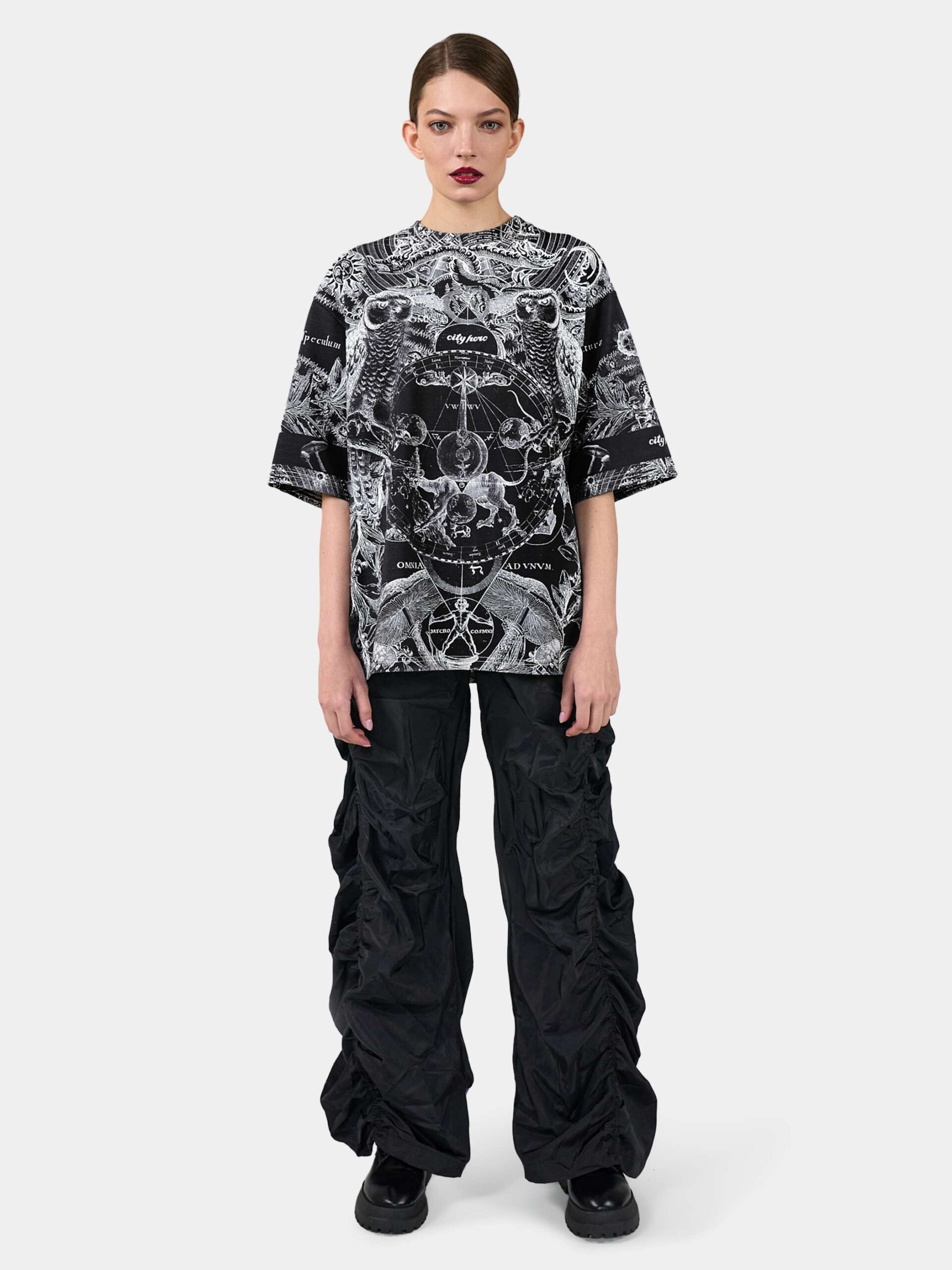 Футболка второго поколения в стиле интеллиджент оверсайз в черном цвете с принтом в виде старинной мистической гравюры с алхимическими элементами и символами.