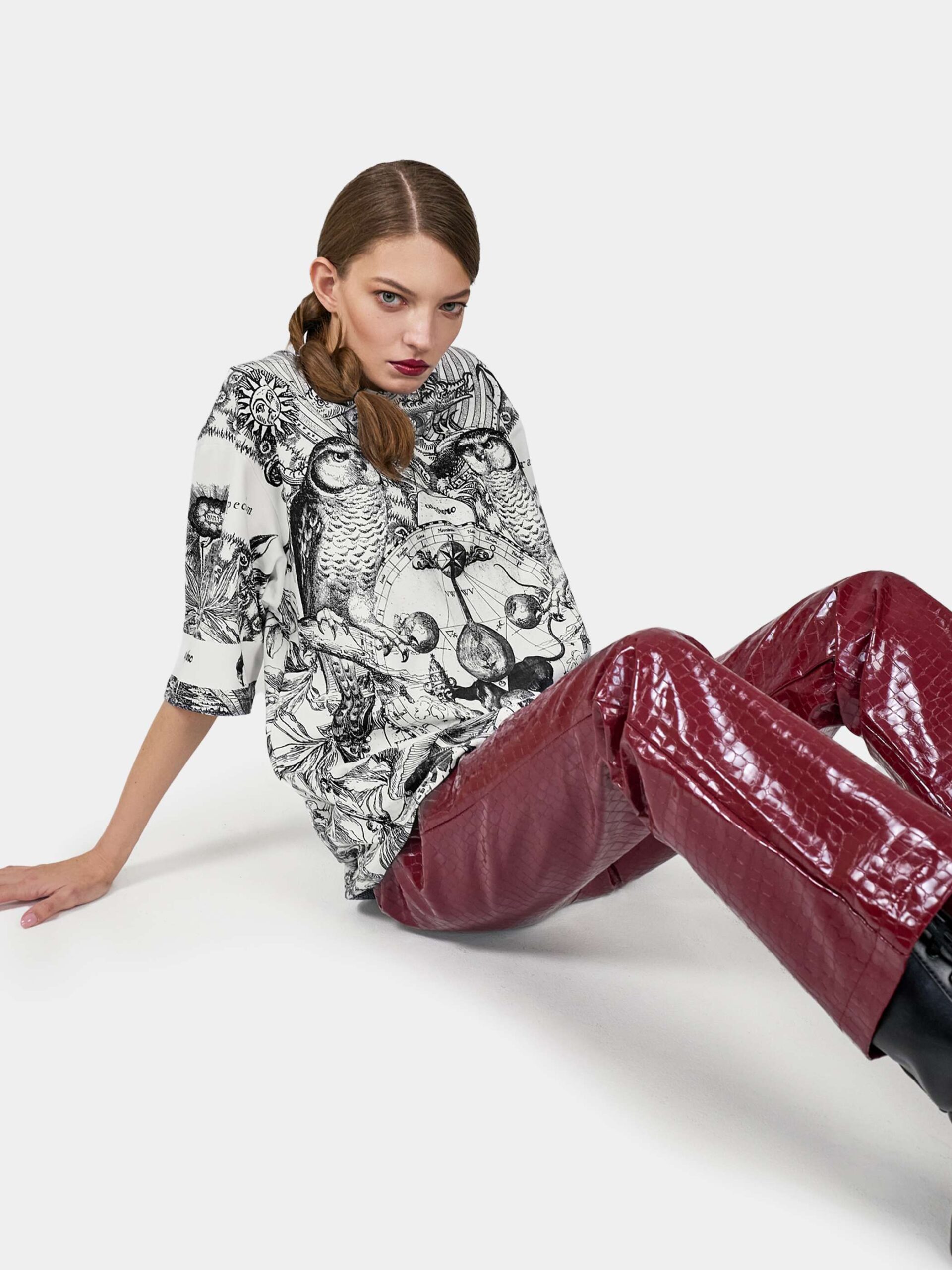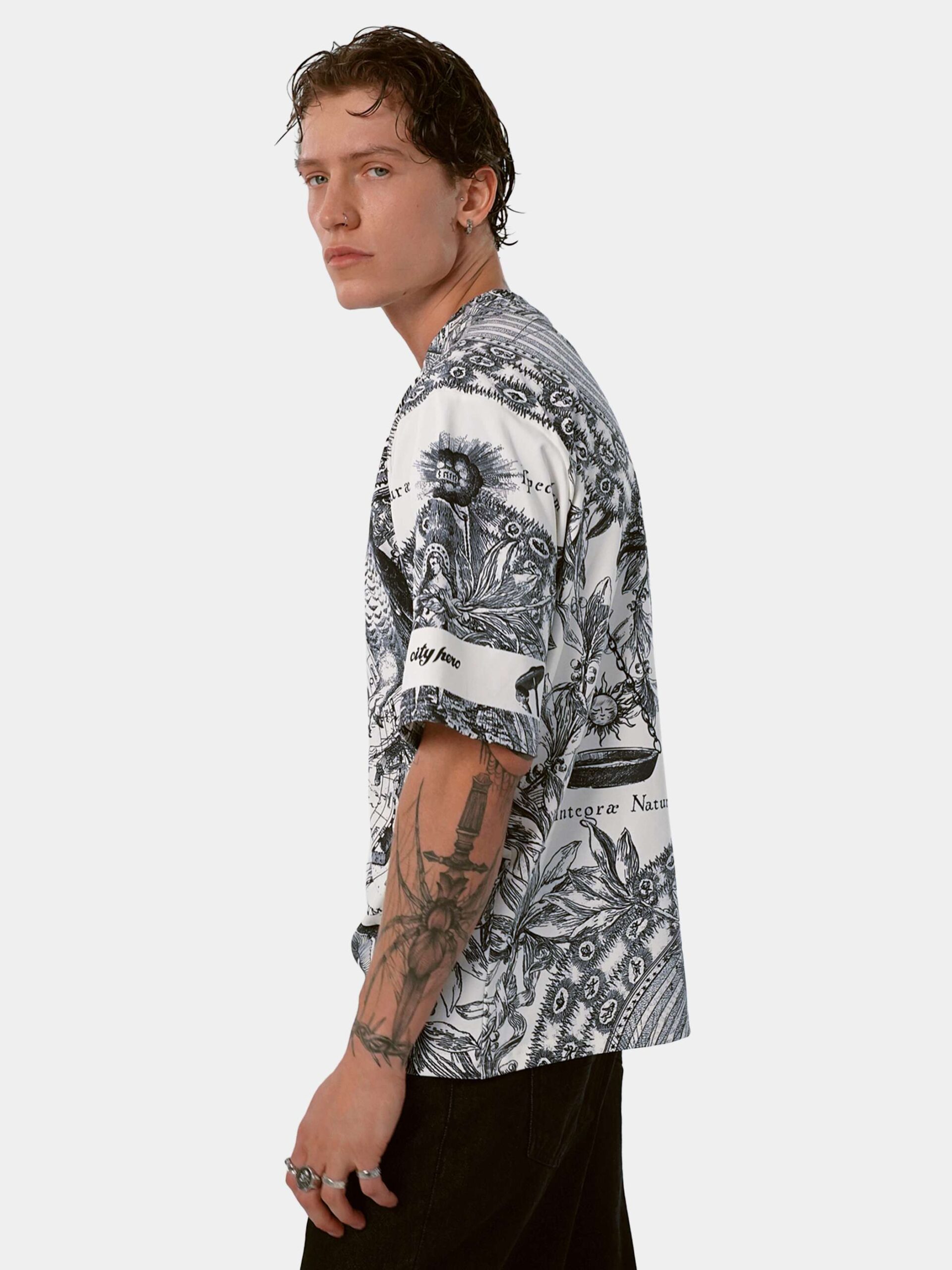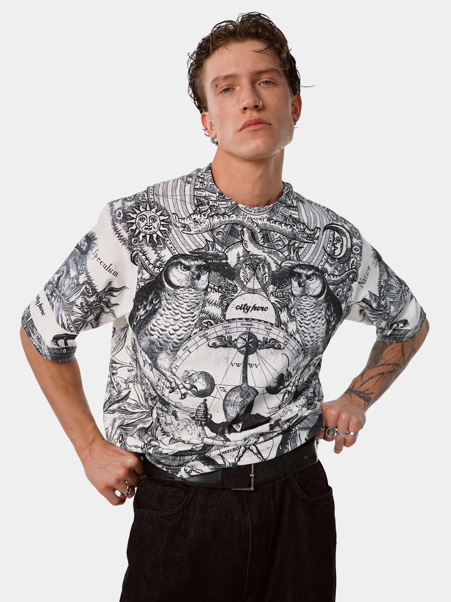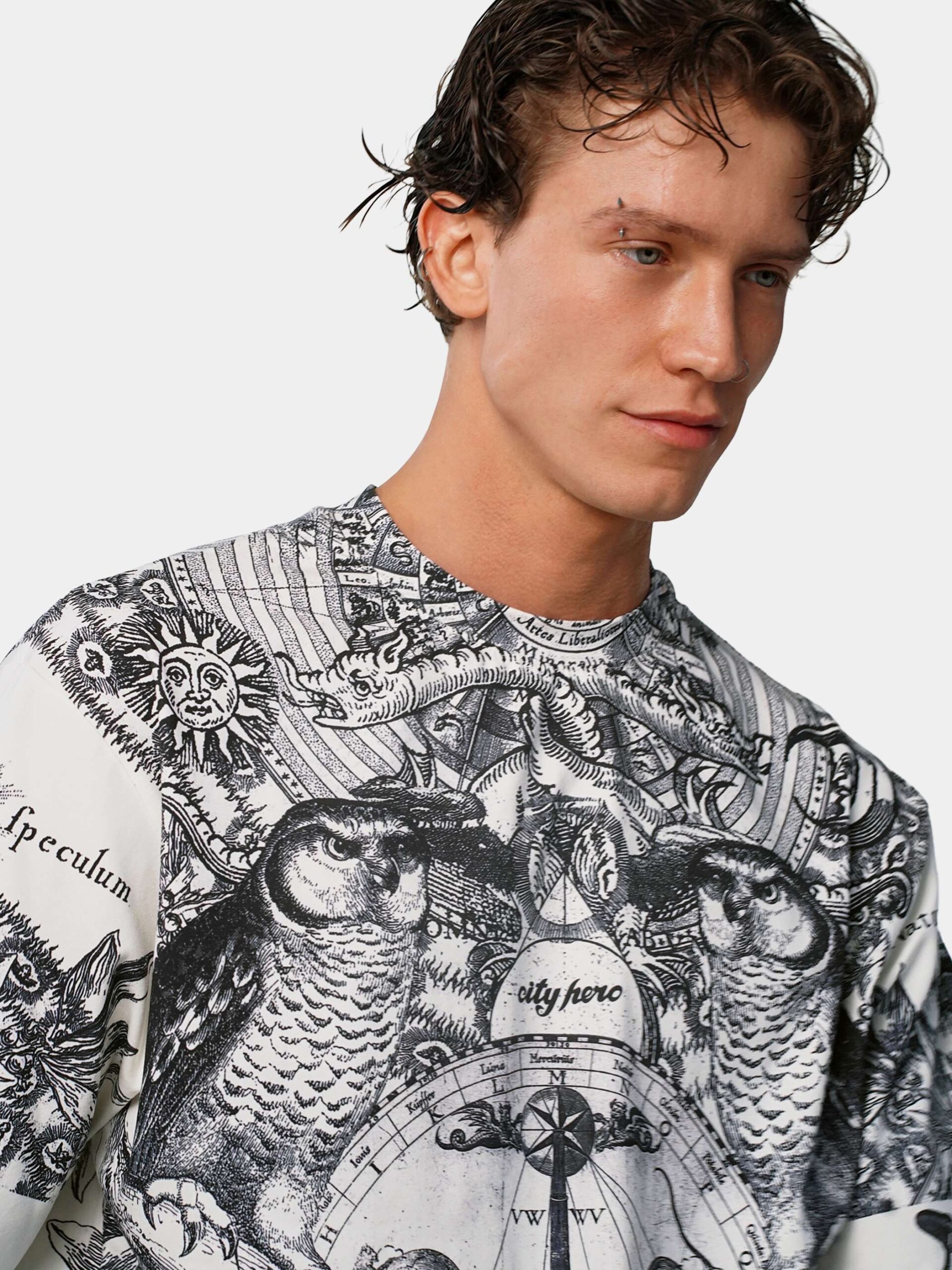 Футболка второго поколения в стиле интеллиджент оверсайз в черно-белых тонах с принтом в виде старинной мистической гравюры с алхимическими элементами и символами.