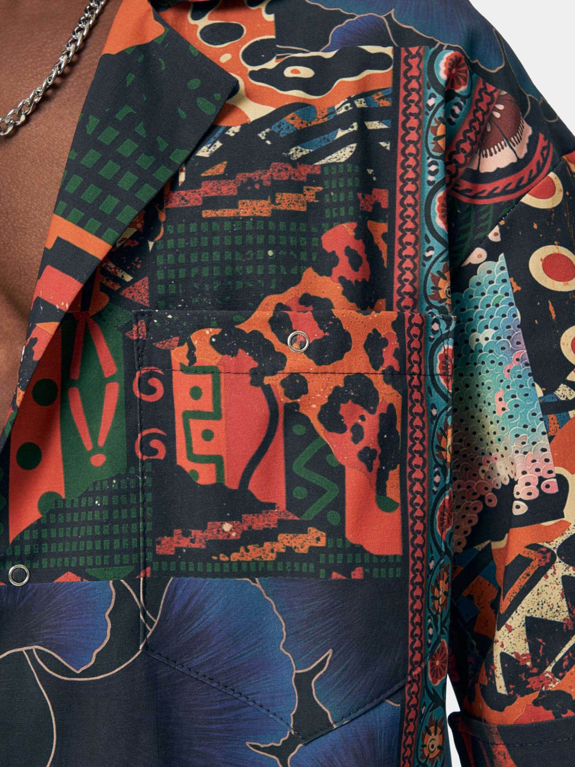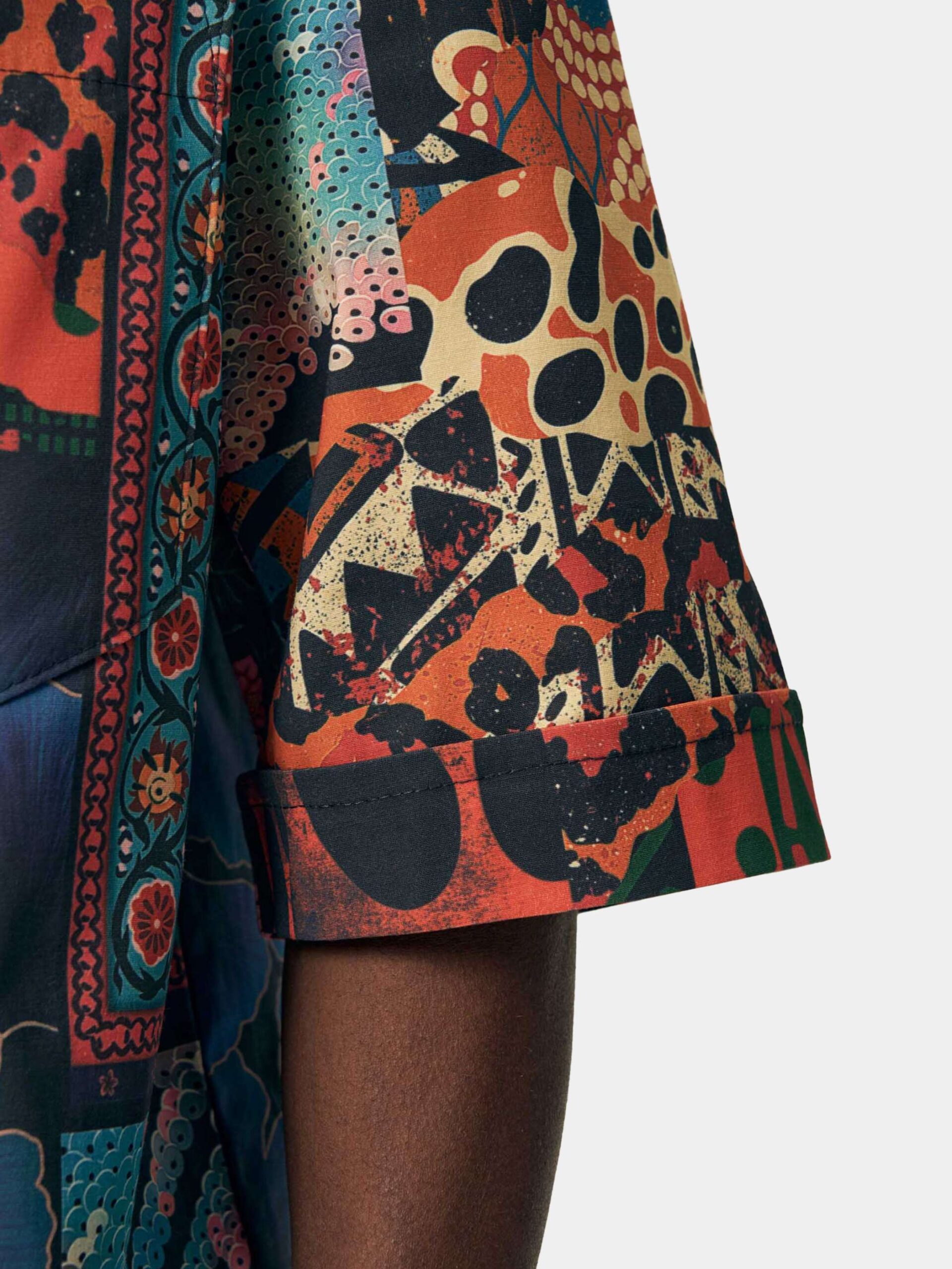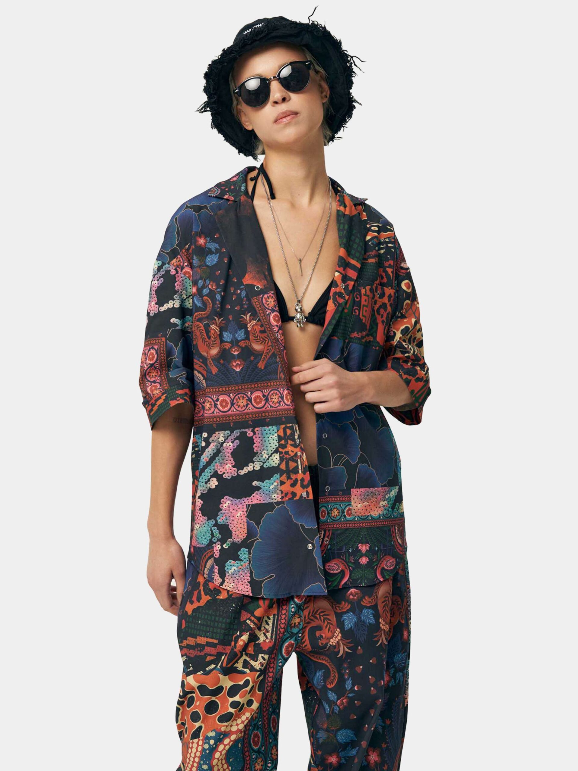Рубашка с короткими рукавами с принтом в стиле «Бохо». Многодетальный принт, состоящий из фрагментов анималистики, пайеток и орнаментов, образующих контролируемый хаос. Выполнена в контрастных, преимущественно тёмно-синих тонах. Рубашка второго поколения в стиле оверсайз.