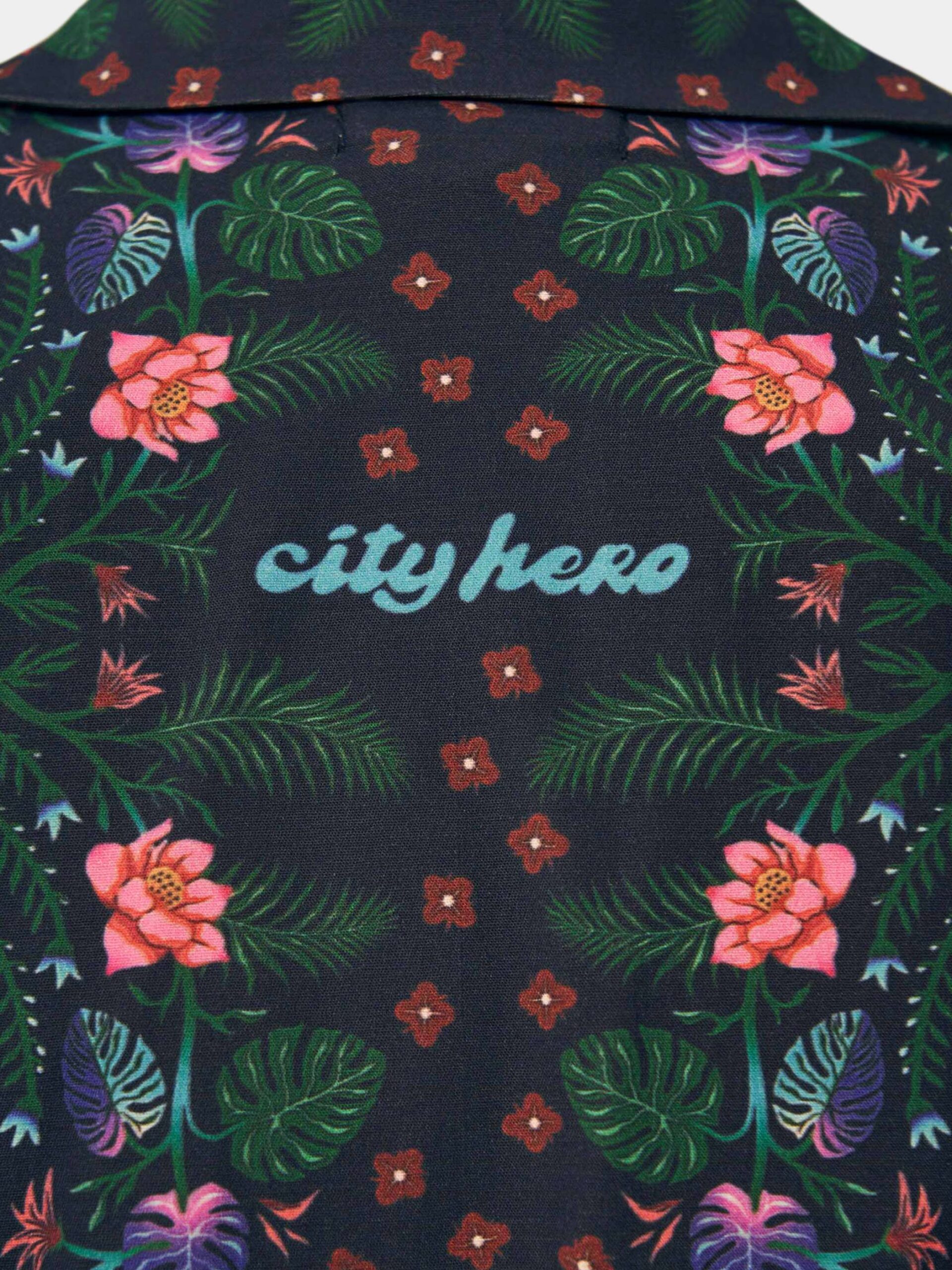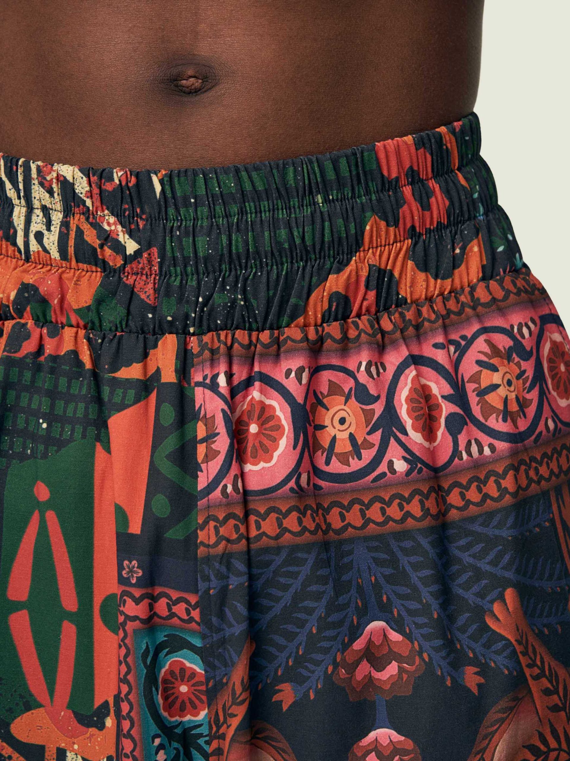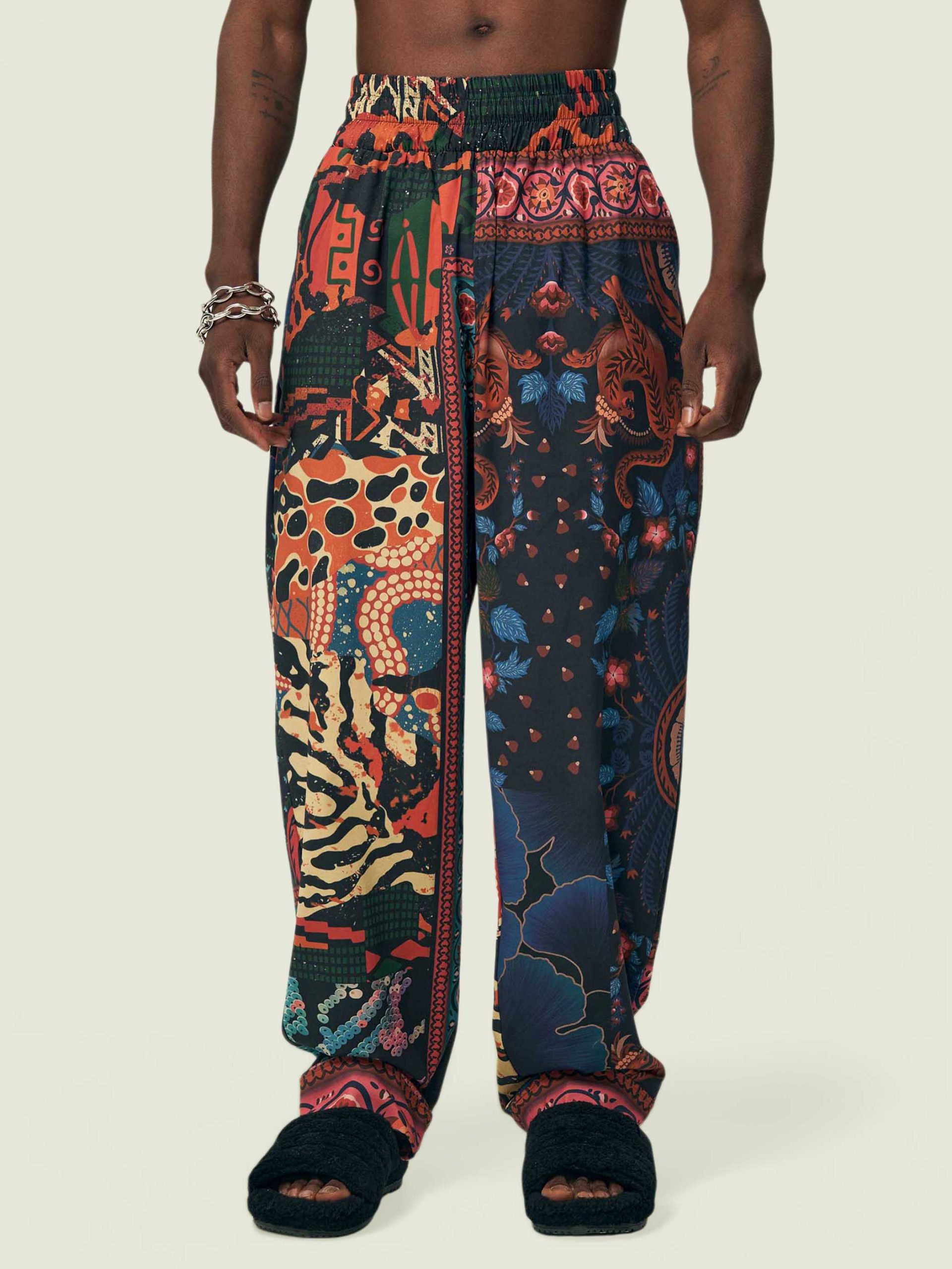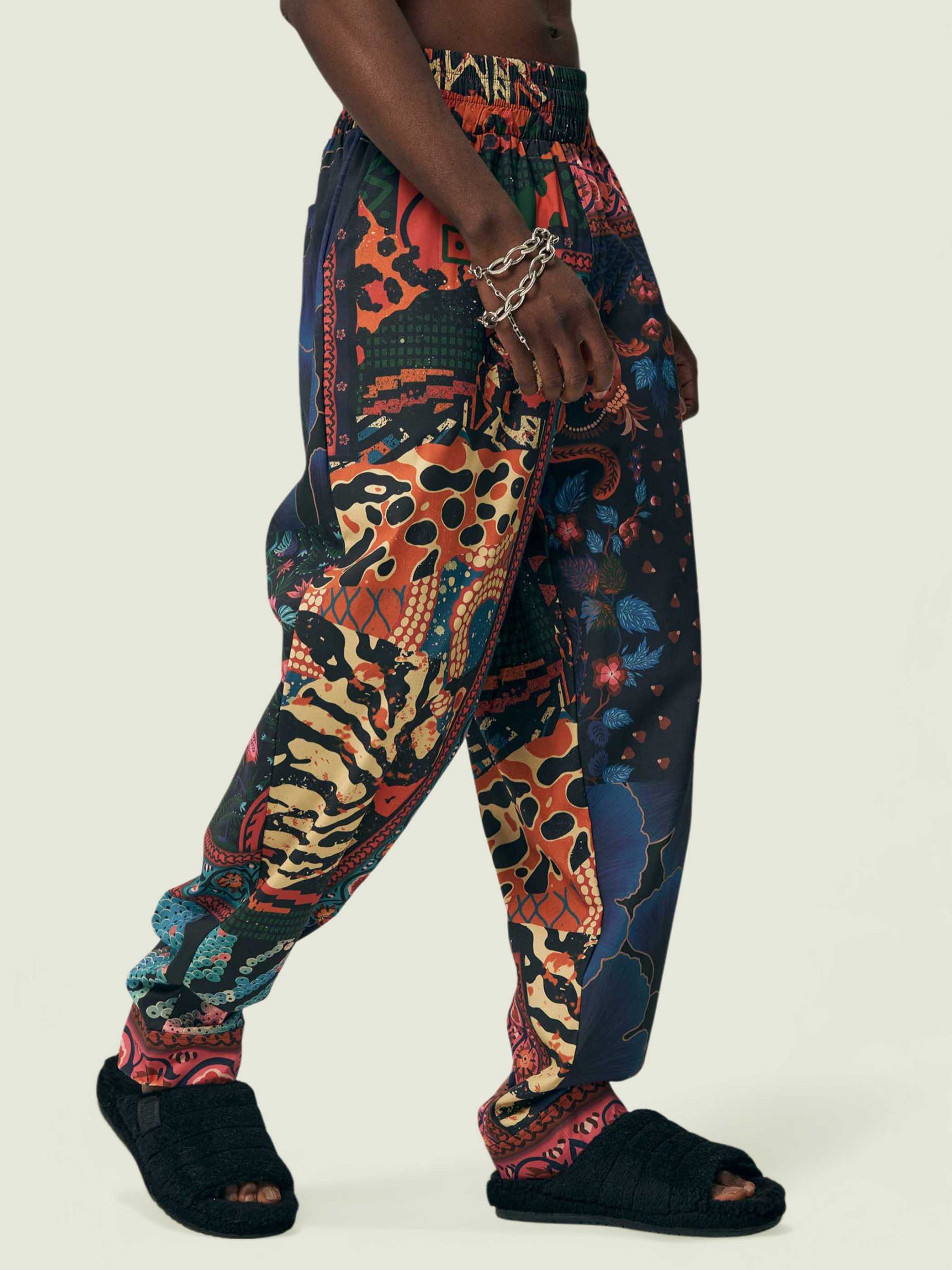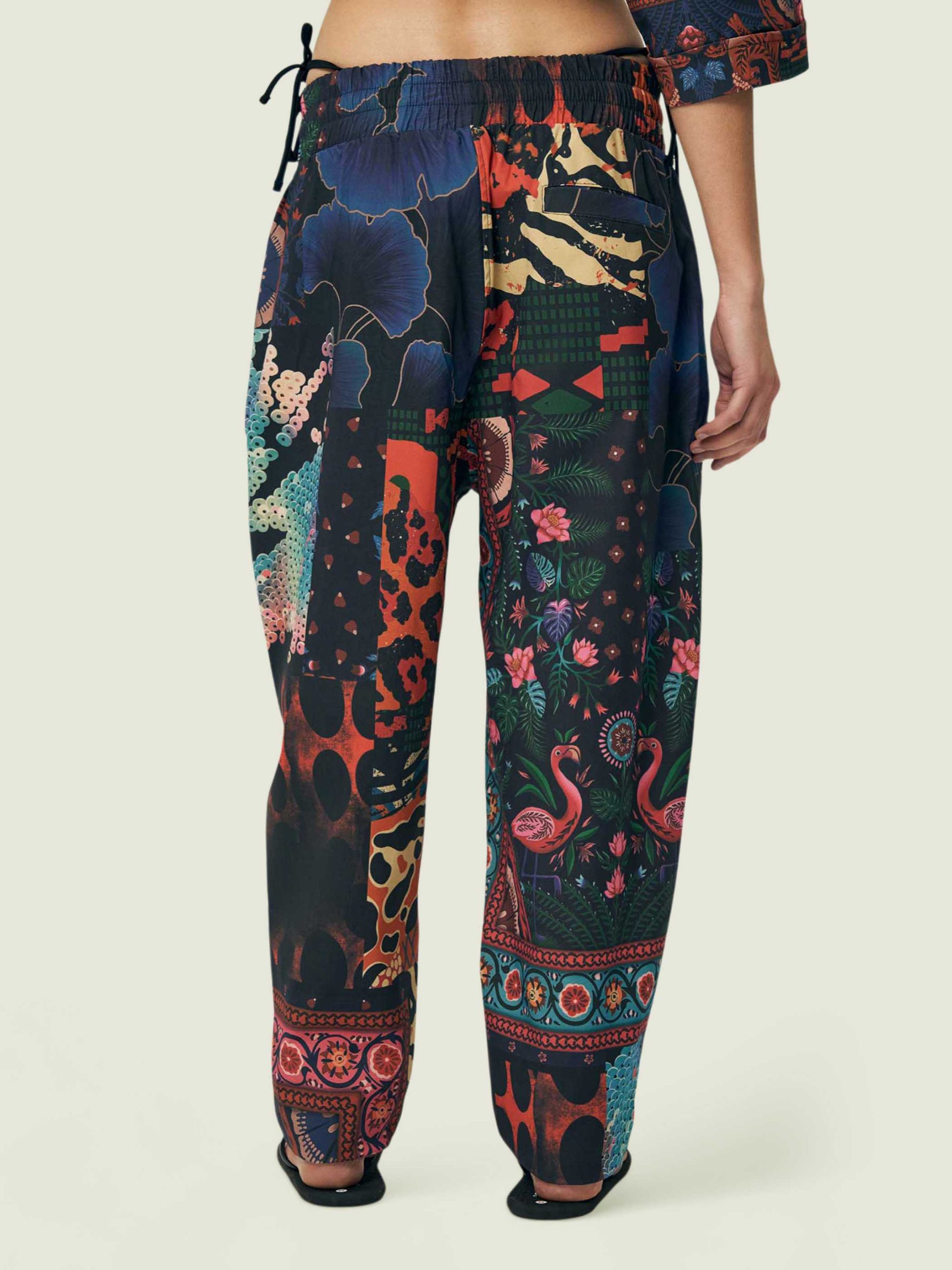 Летний костюм с принтом в стиле «Бохо». Многодетальный принт, состоящий из фрагментов анималистики, пайеток и орнаментов, образующих контролируемый хаос. Костюм выполнен в контрастных, преимущественно тёмно-синих тонах. Уличная пижама второго поколения в стиле оверсайз.