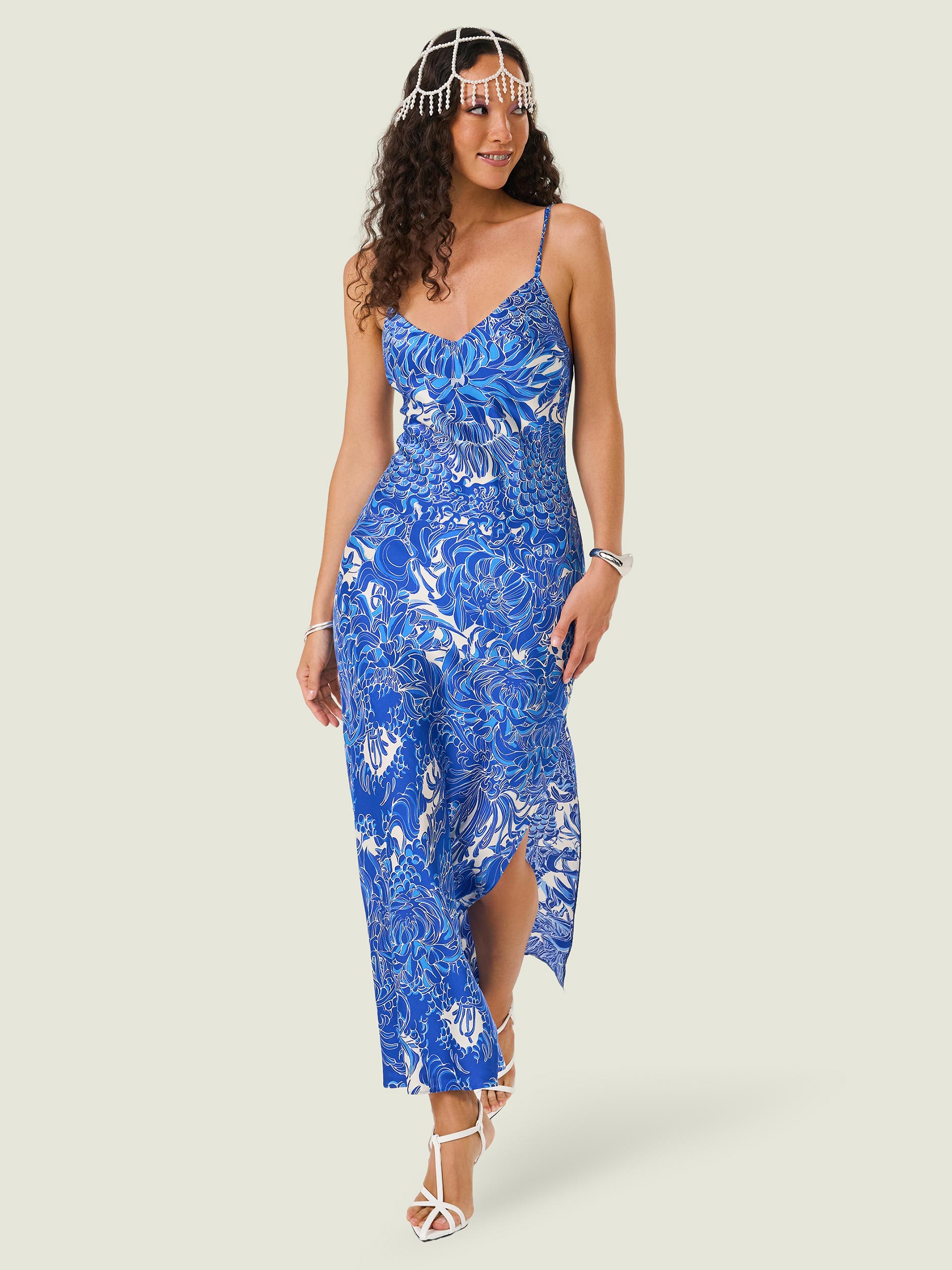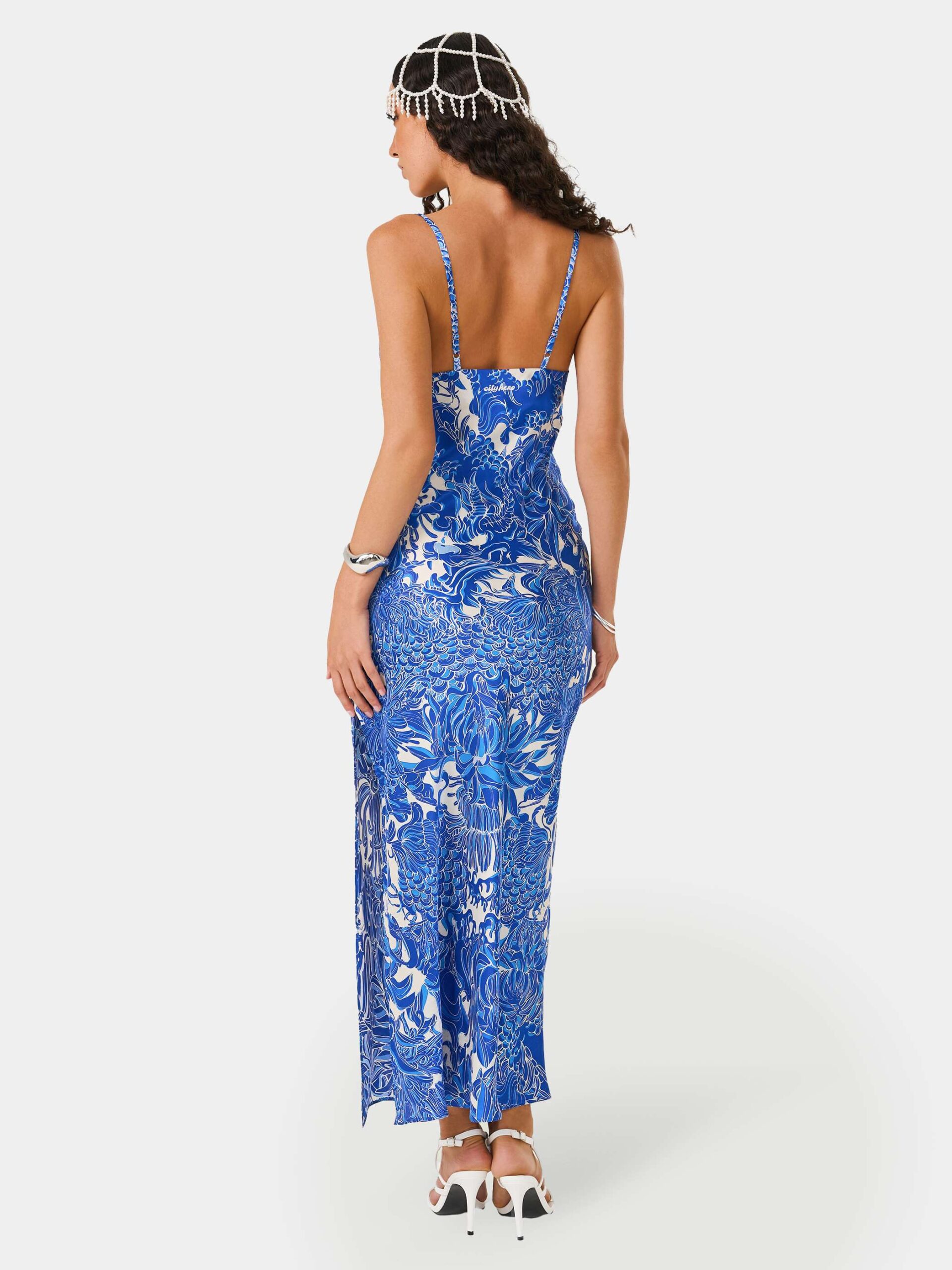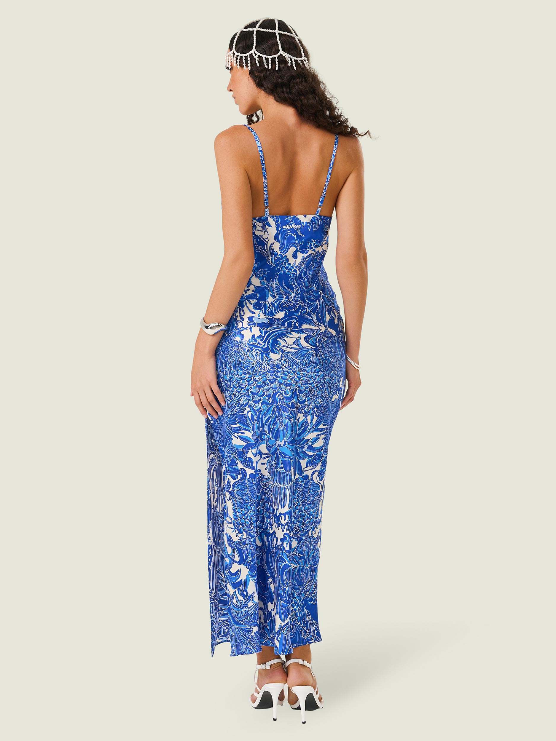 Изящное платье-комбинация с графикой в японском стиле выполнено в сочных синих тонах с высоко детализированным принтом в виде маски самурая мэнгу, дракона и разнообразных цветов.