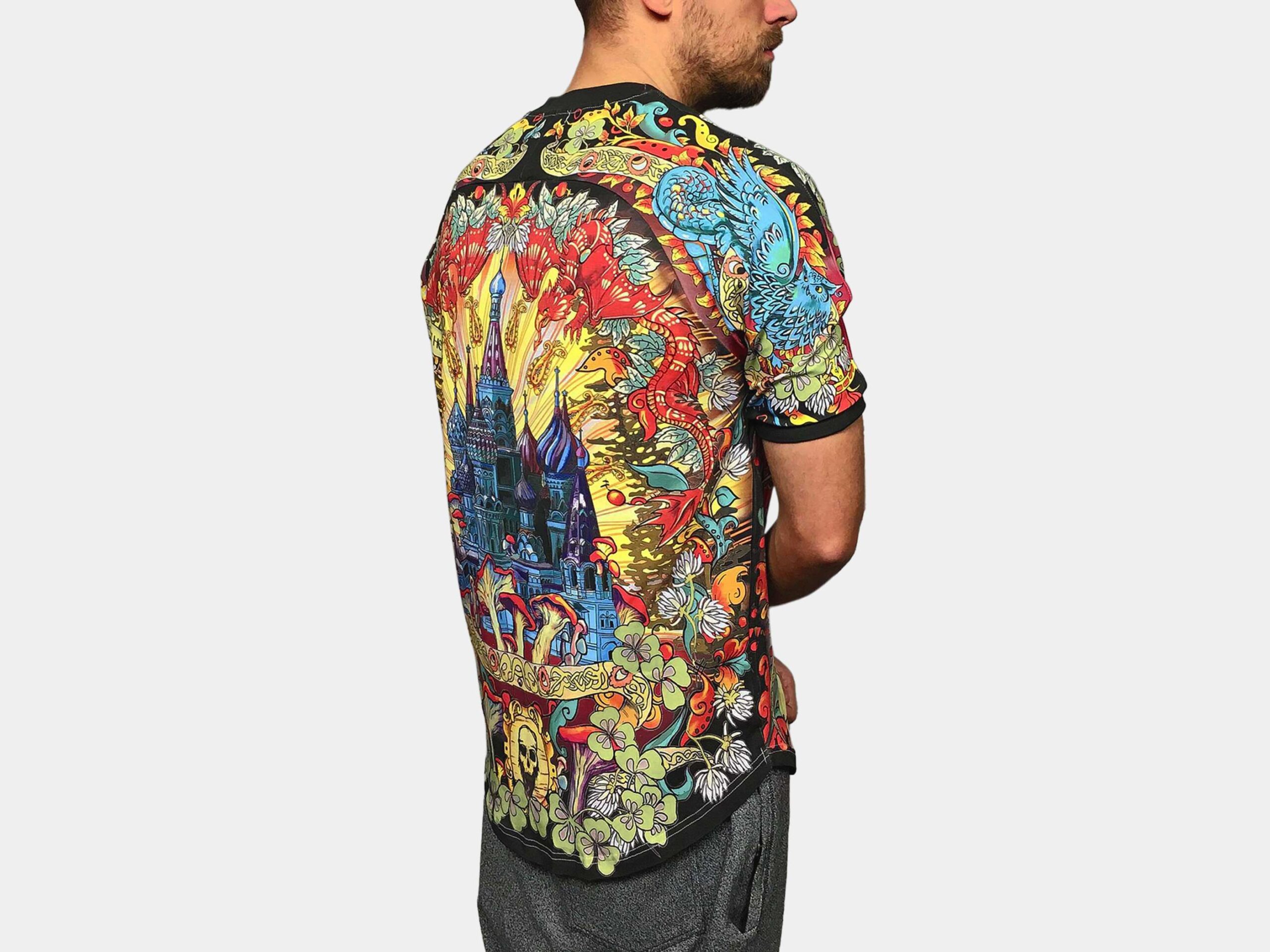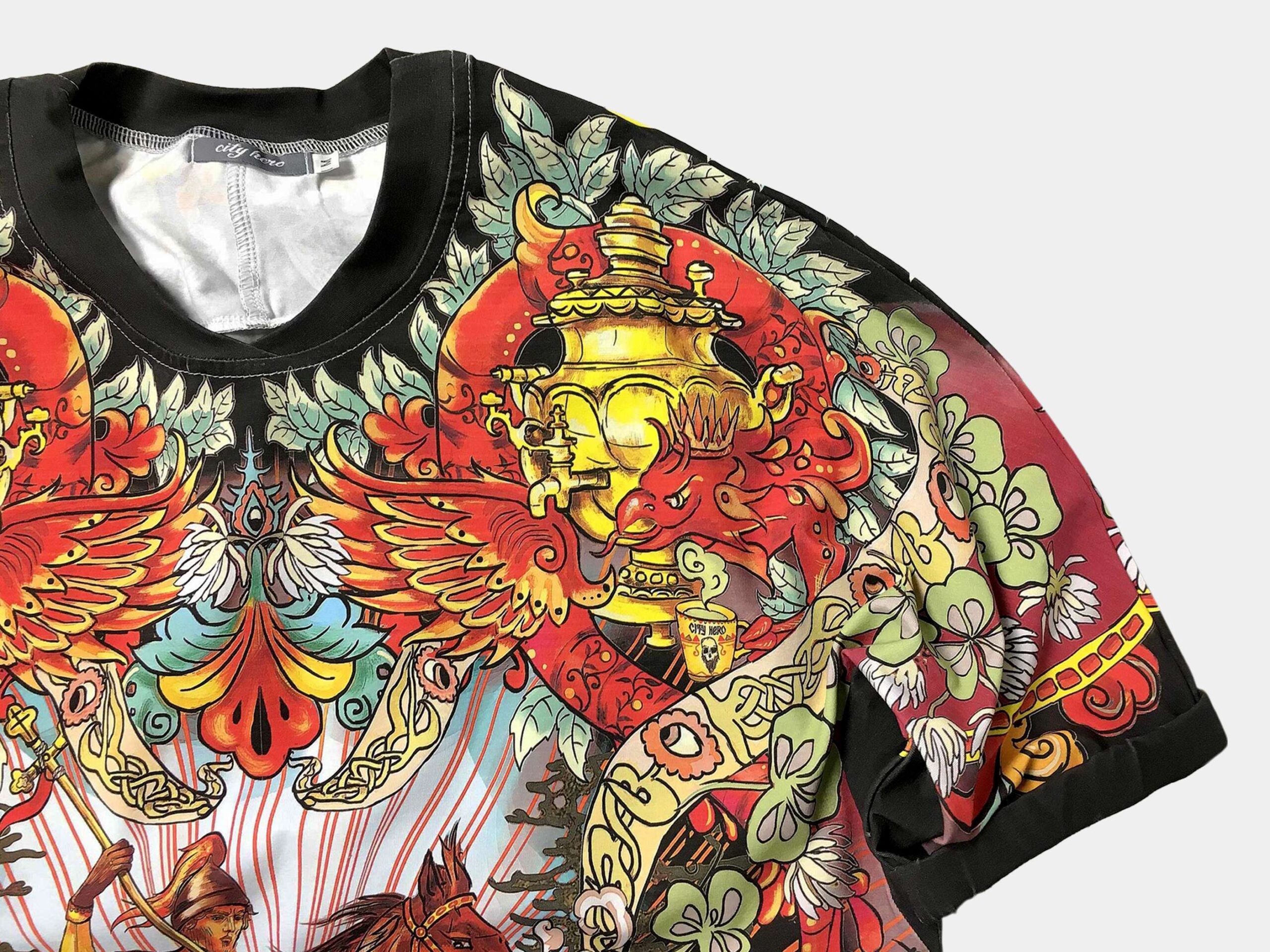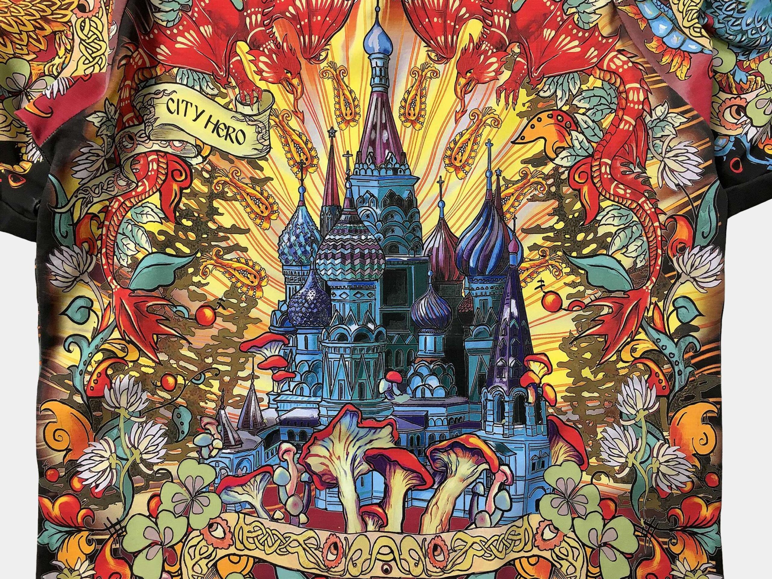 ЧЁРНАЯ СОЛЯНКА — Этот дизайн воплотил в себе собирательный образ Москвы. В его центре — сюжет, изображенный на гербе города: Св. Георгий, поражающий копьем змея, на спине — знаменитый Храм Василия Блаженного. Композиция дополнена фантастическими драконами, волшебными грибами и заплетена в единую канву расписными лентами и полевым клевером.