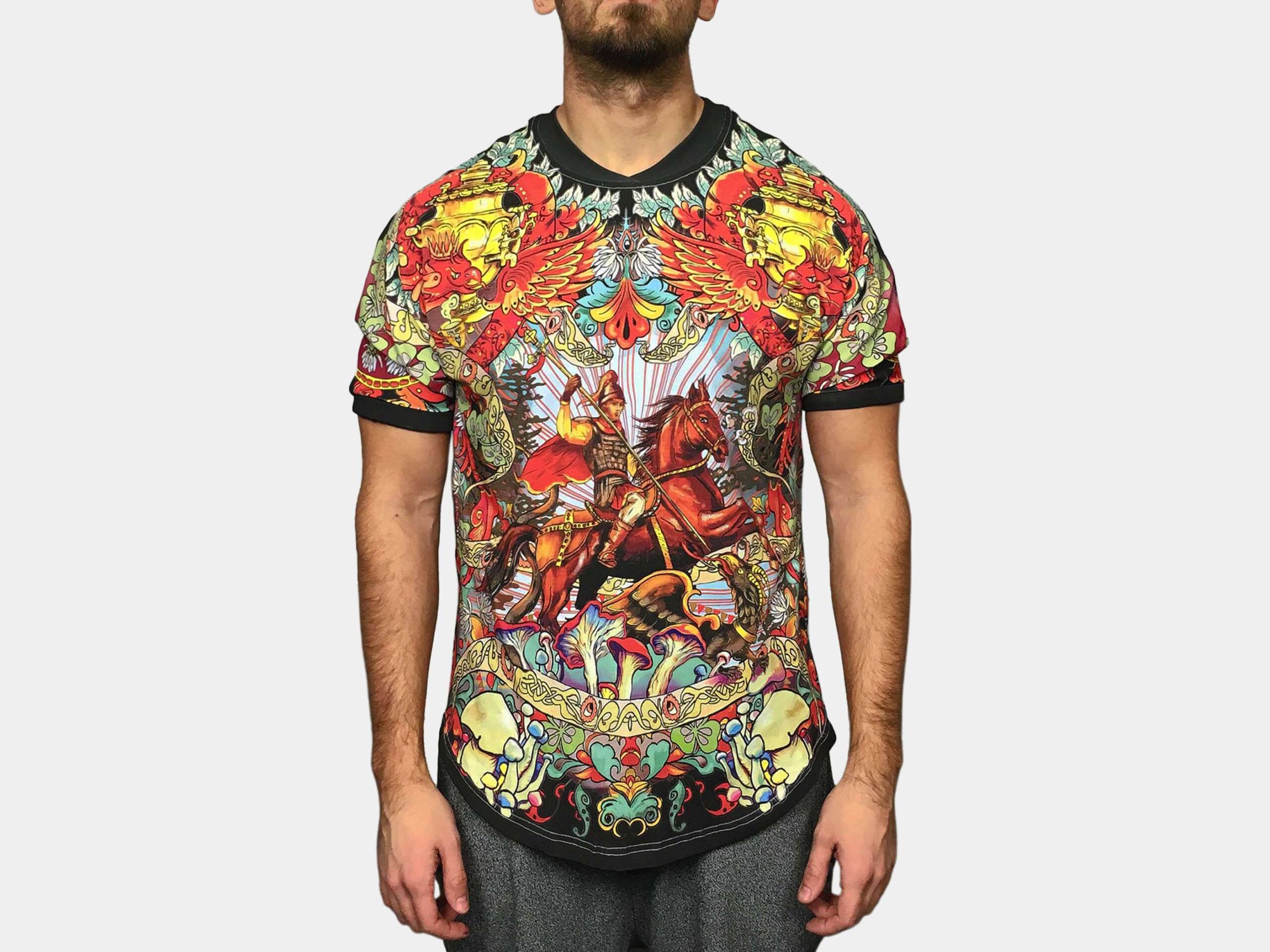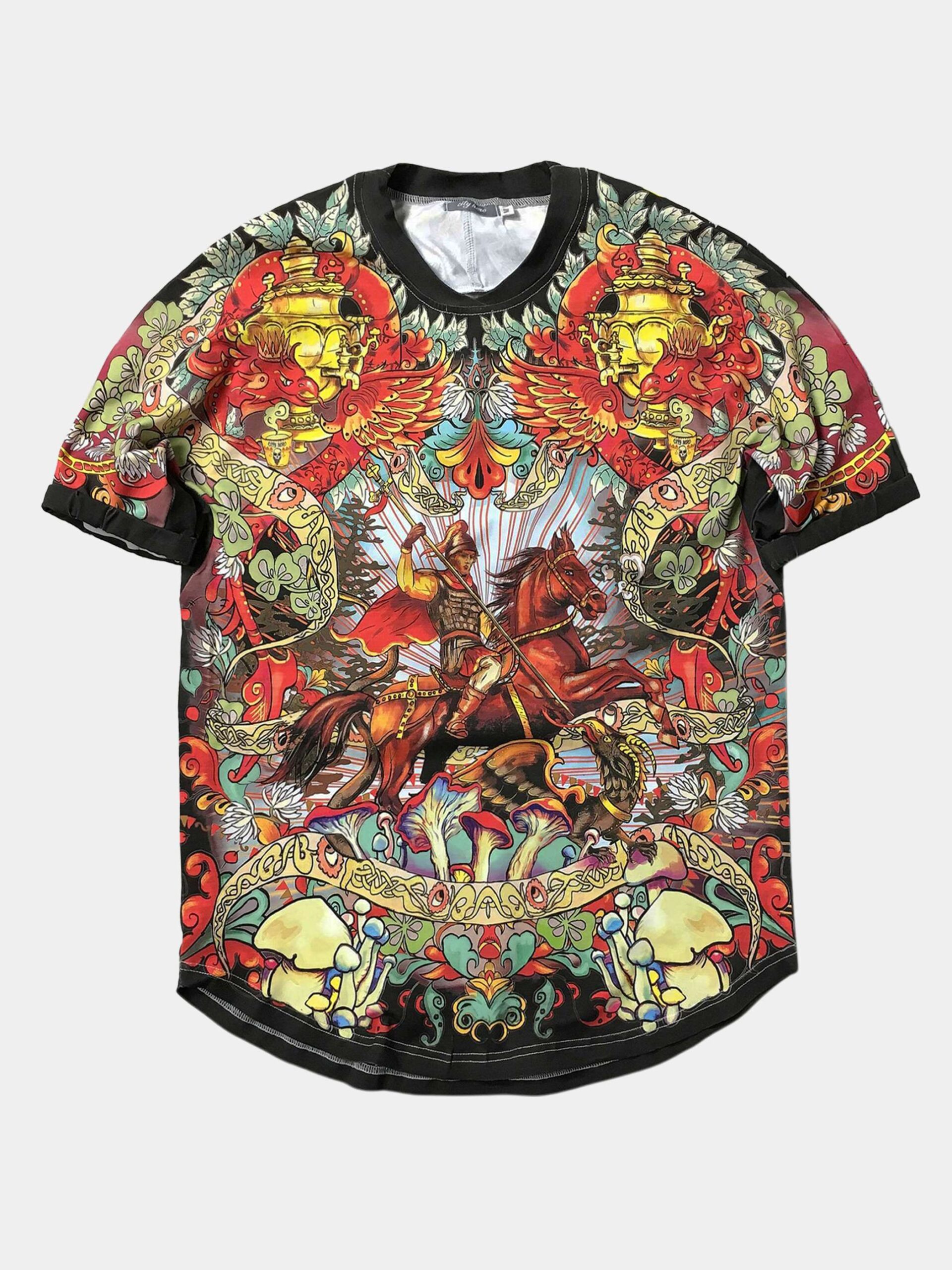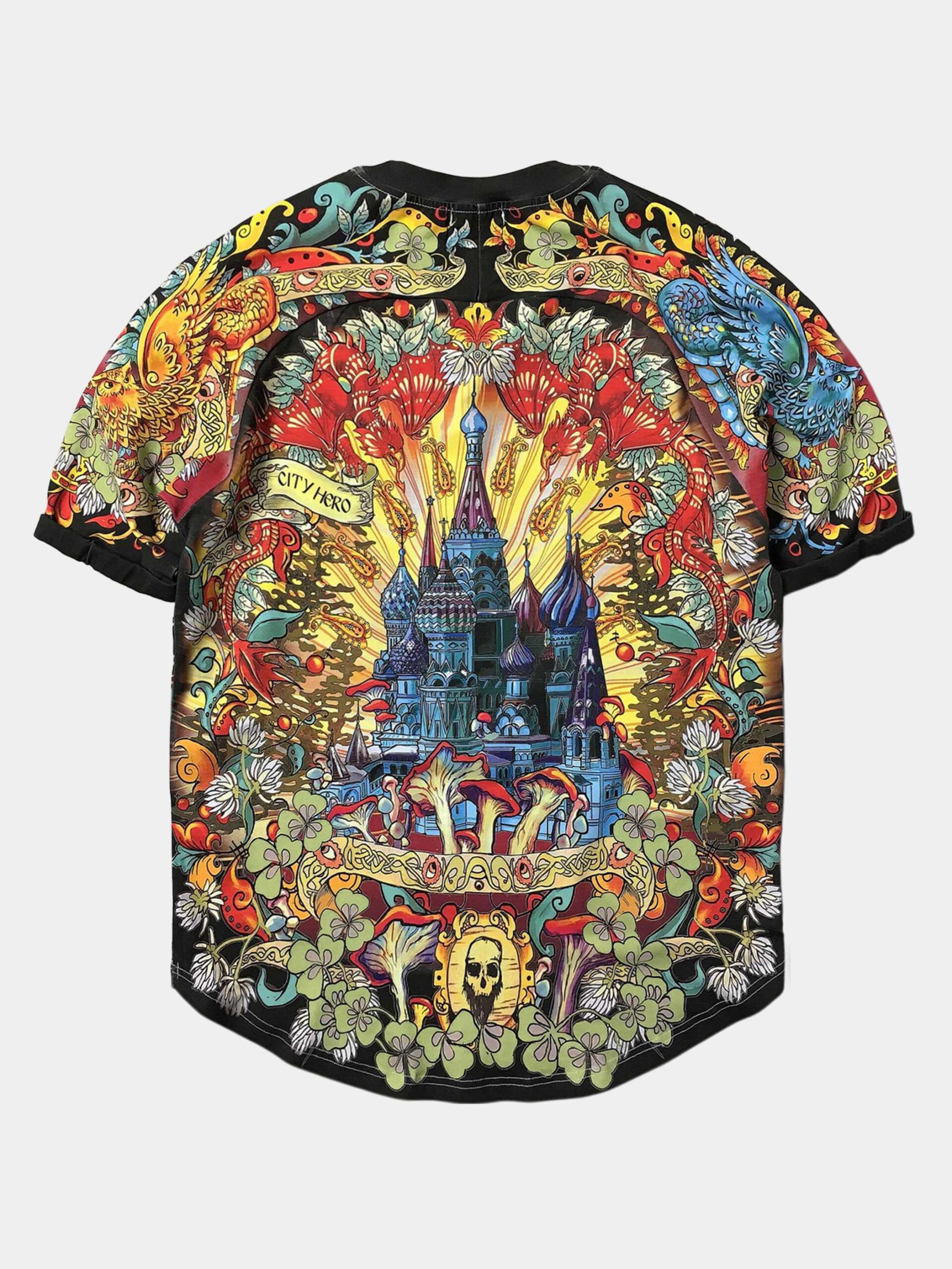 ЧЁРНАЯ СОЛЯНКА — Этот дизайн воплотил в себе собирательный образ Москвы. В его центре — сюжет, изображенный на гербе города: Св. Георгий, поражающий копьем змея, на спине — знаменитый Храм Василия Блаженного. Композиция дополнена фантастическими драконами, волшебными грибами и заплетена в единую канву расписными лентами и полевым клевером.