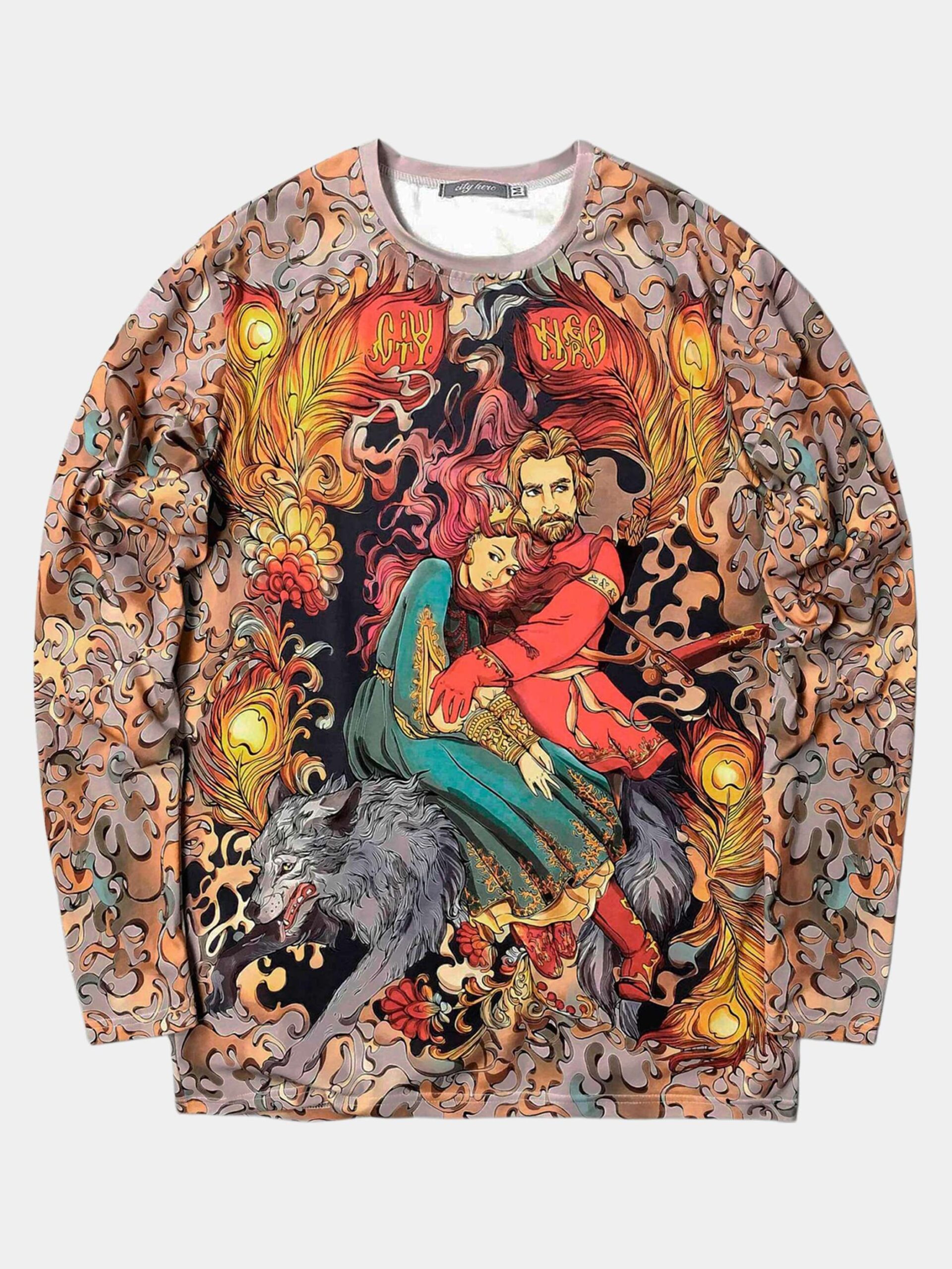 ЦАРЕВИЧ — Сел Иван-царевич на серого волка, посадил на спину Елену-прекрасную и поспешили они за Жар-птицей..Сюжет русской народной сказки лег в основу этого красочного дизайна. Спереди изображены герои сказки верхом на сером волке, а на спине, величественно раскинула волшебные перья Жар-птица.