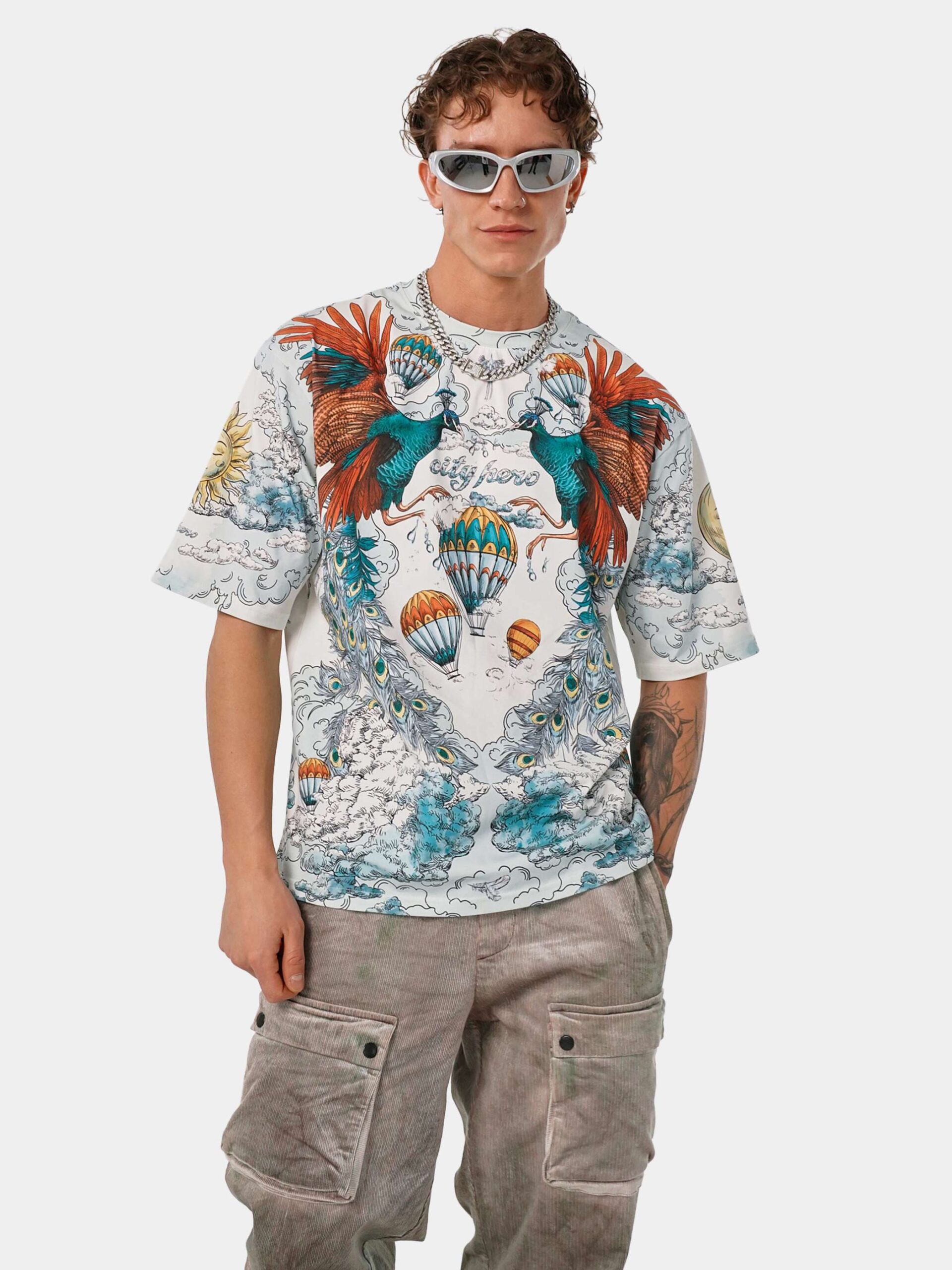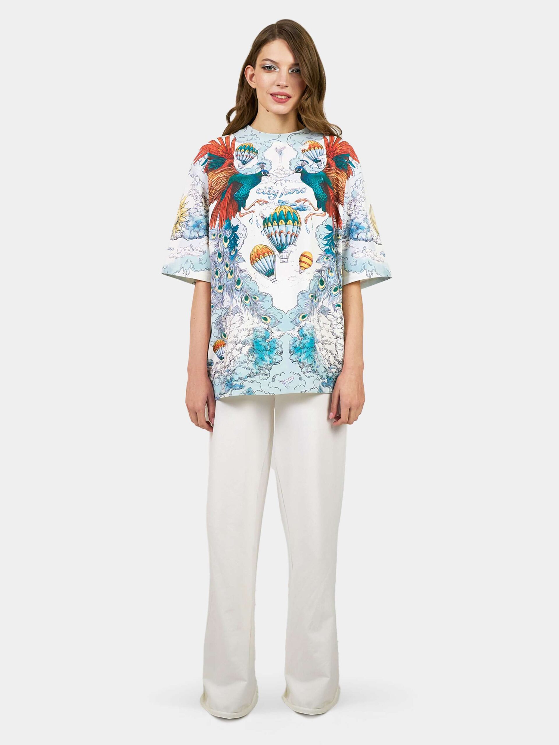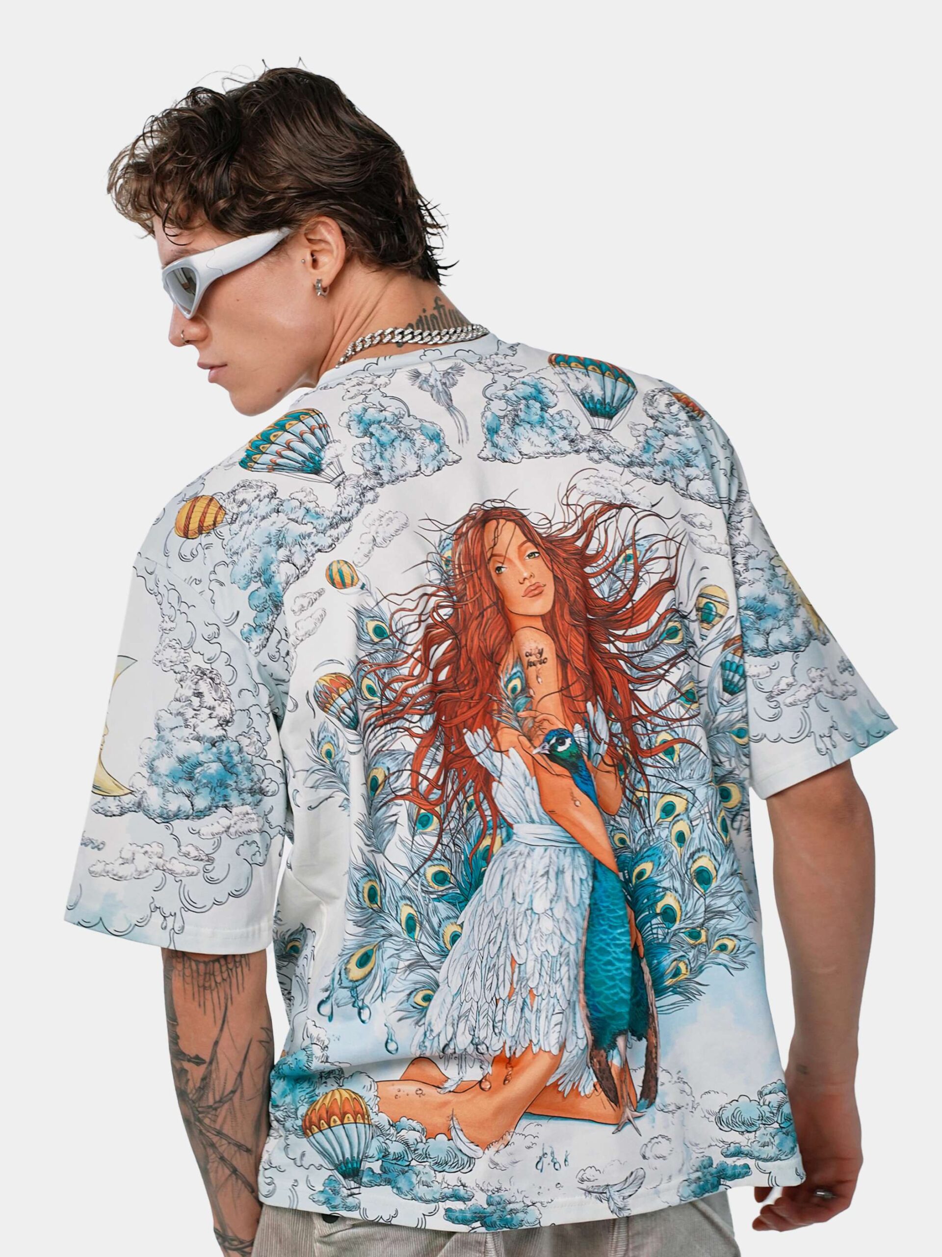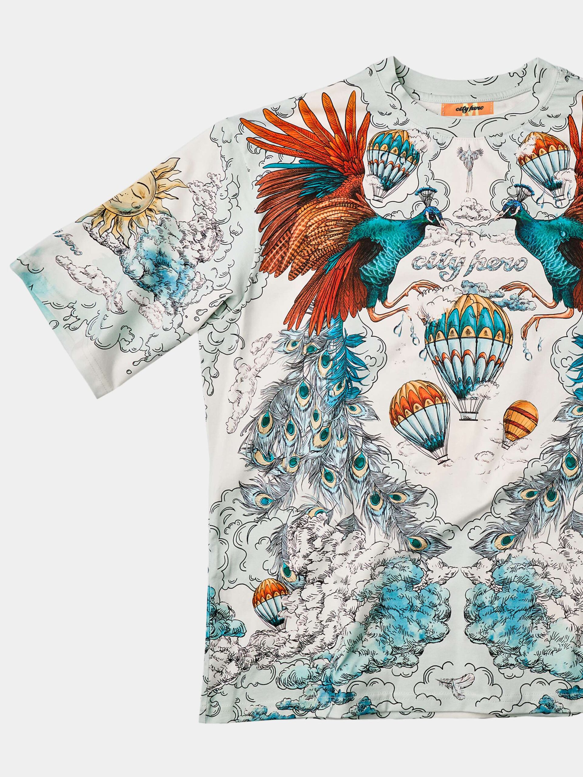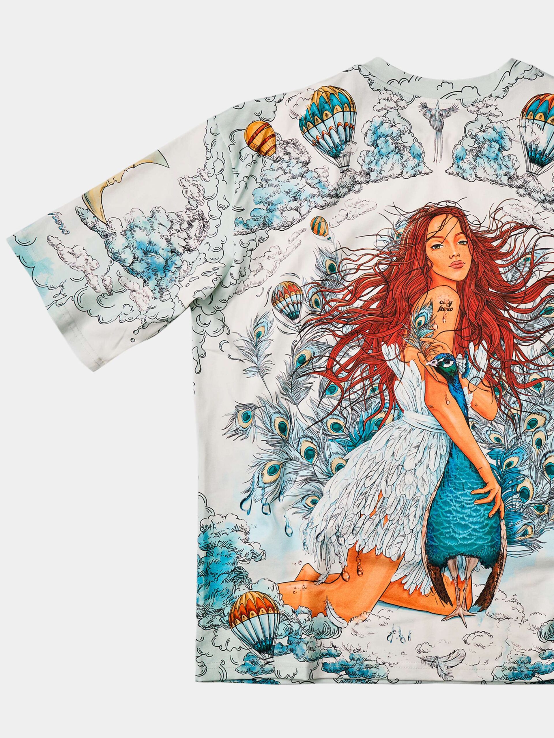 Футболка второго поколения в стиле интеллиджент оверсайз в воздушных голубых, насыщенных бирюзовых и красных тонах с принтом в виде красивой девушки, павлинов, облаков и воздушных шаров.