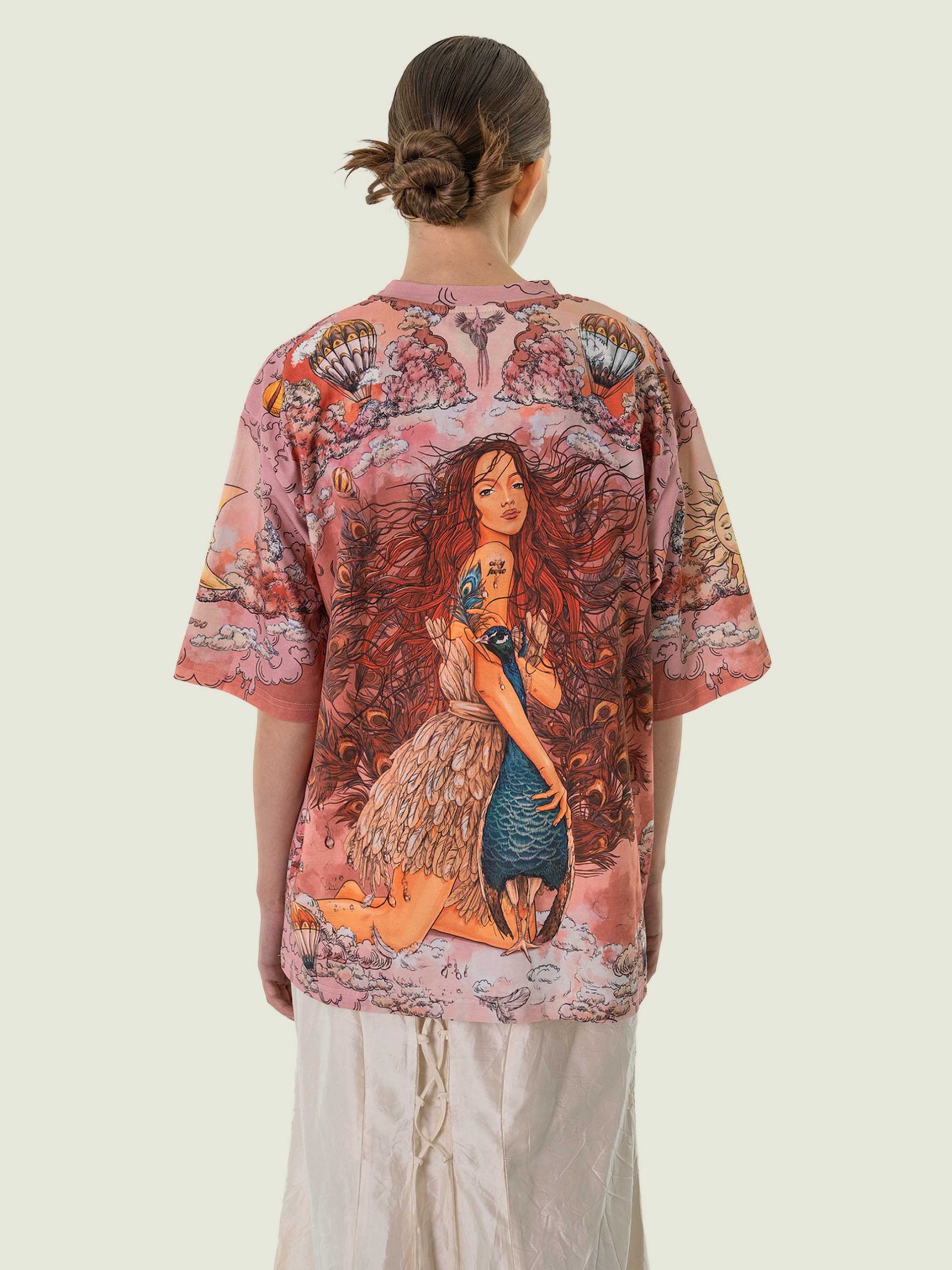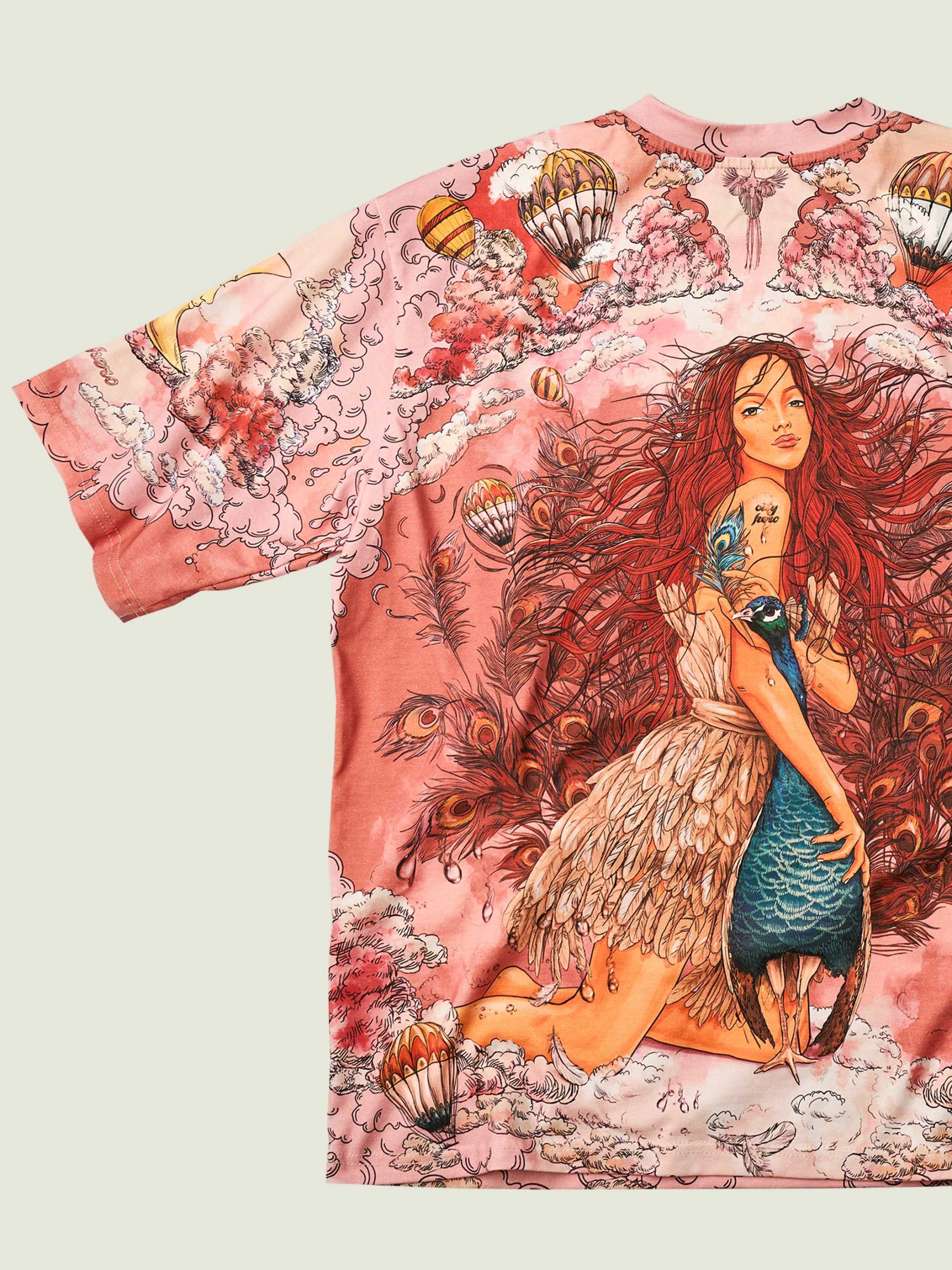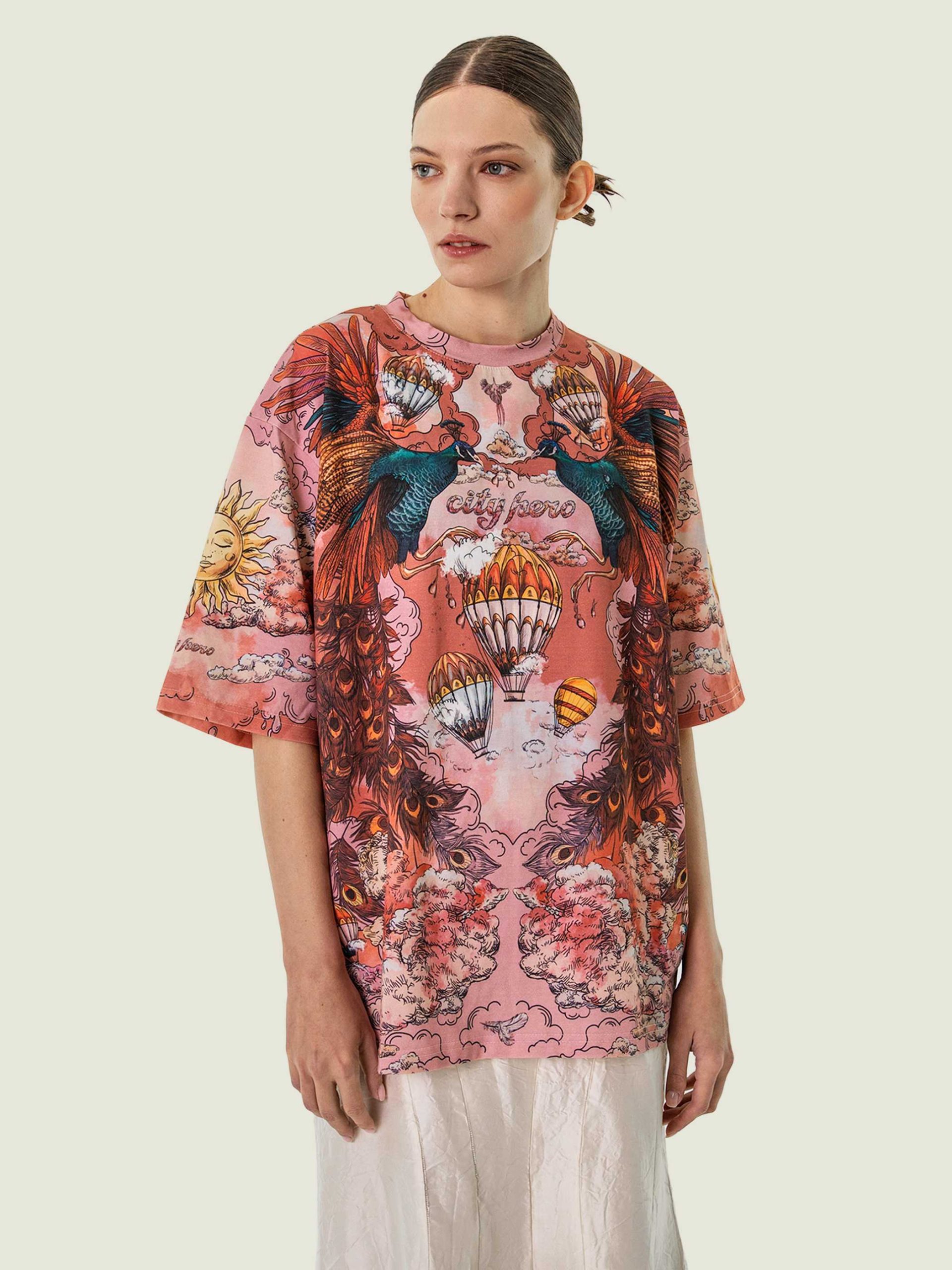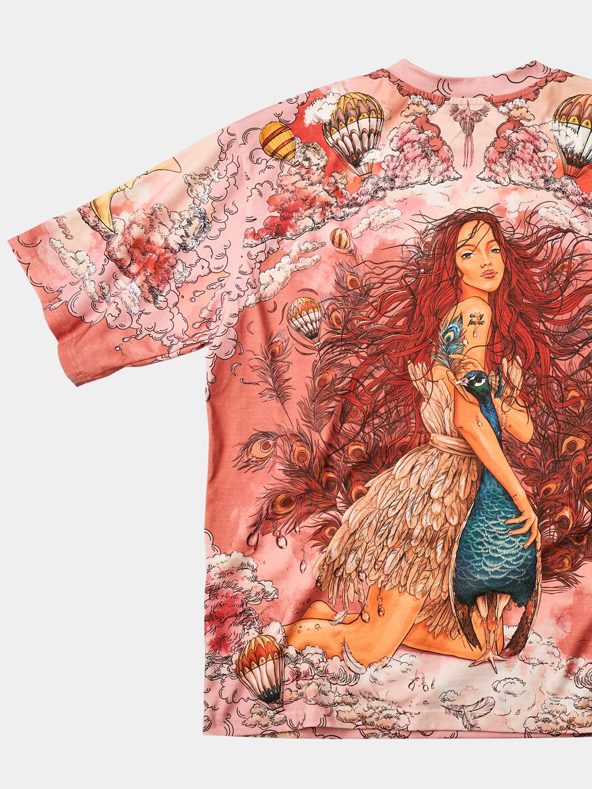 Футболка второго поколения в стиле интеллиджент оверсайз в элегантных розовых тонах с принтом в виде красивой девушки, павлинов, облаков и воздушных шаров.