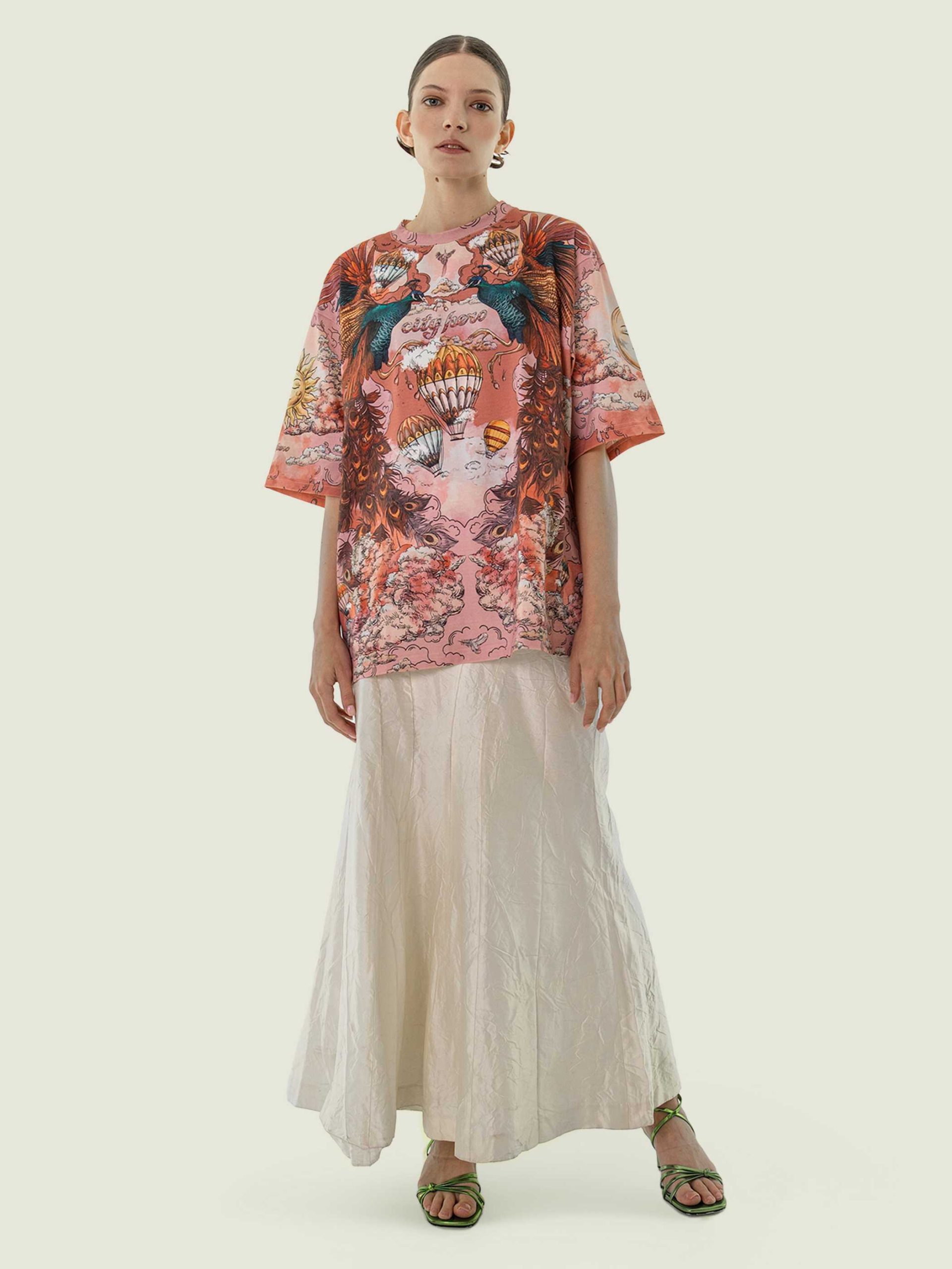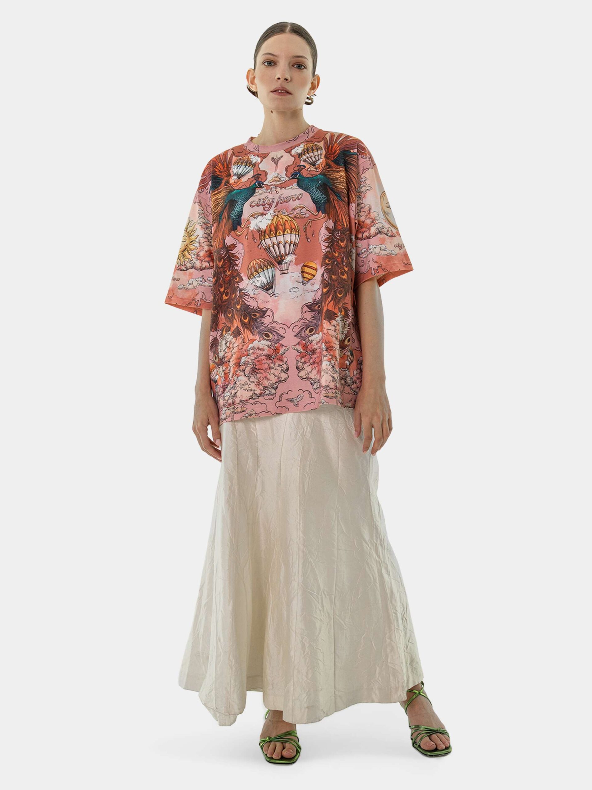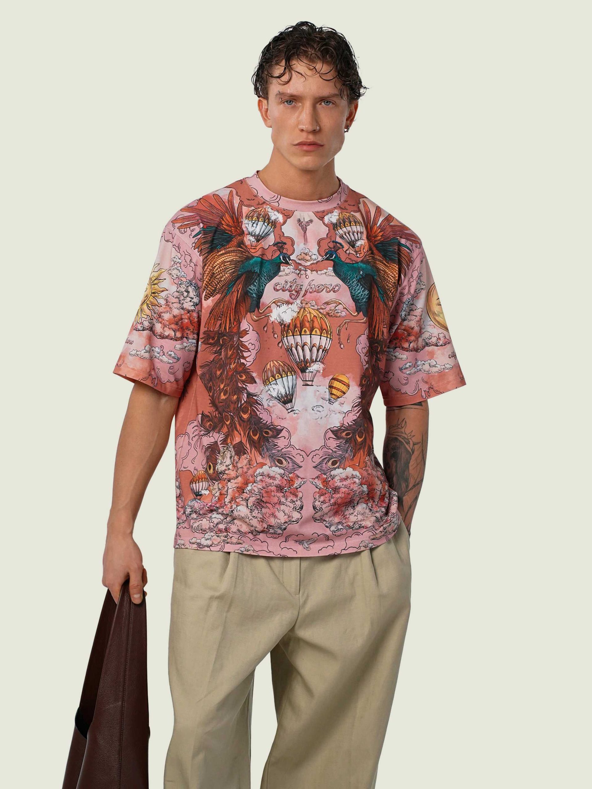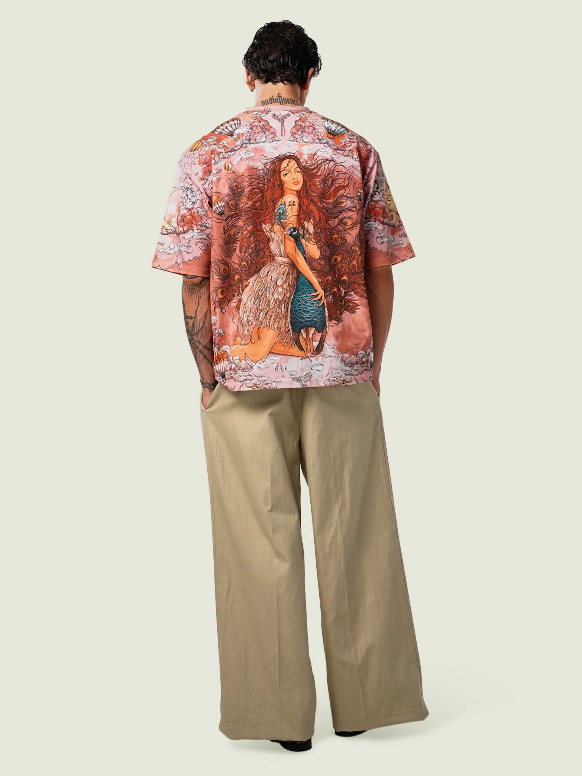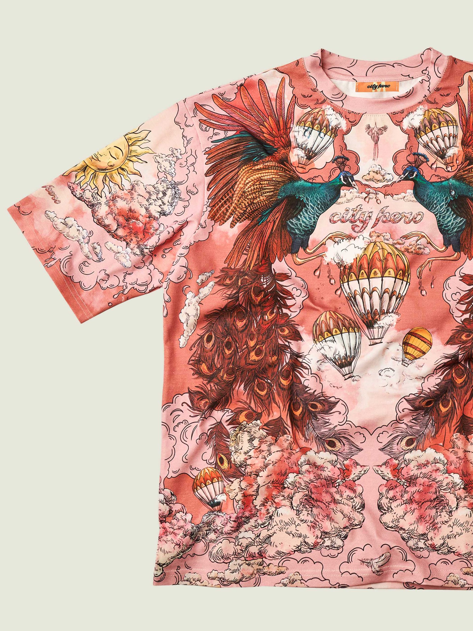 Футболка второго поколения в стиле интеллиджент оверсайз в элегантных розовых тонах с принтом в виде красивой девушки, павлинов, облаков и воздушных шаров.
