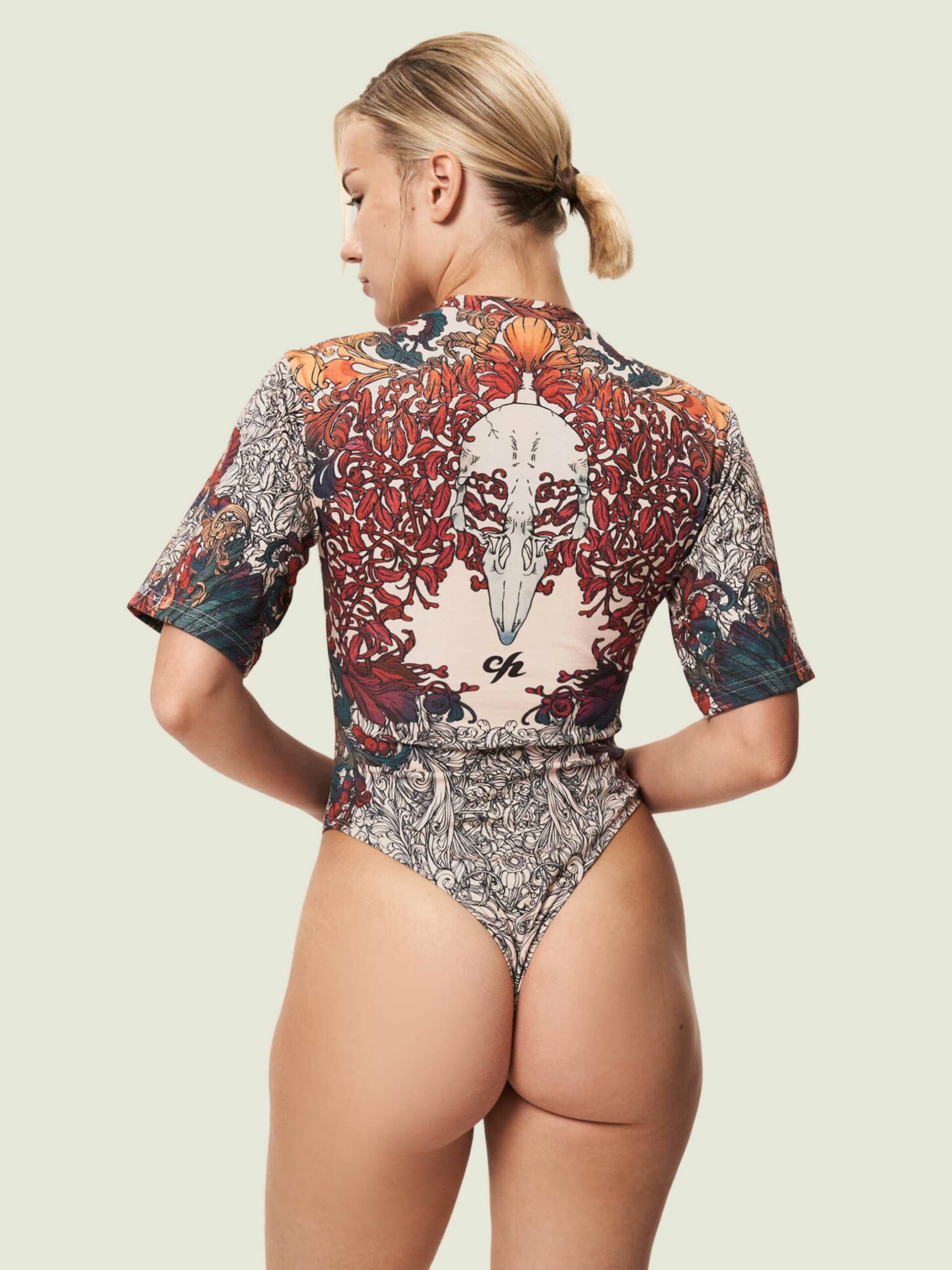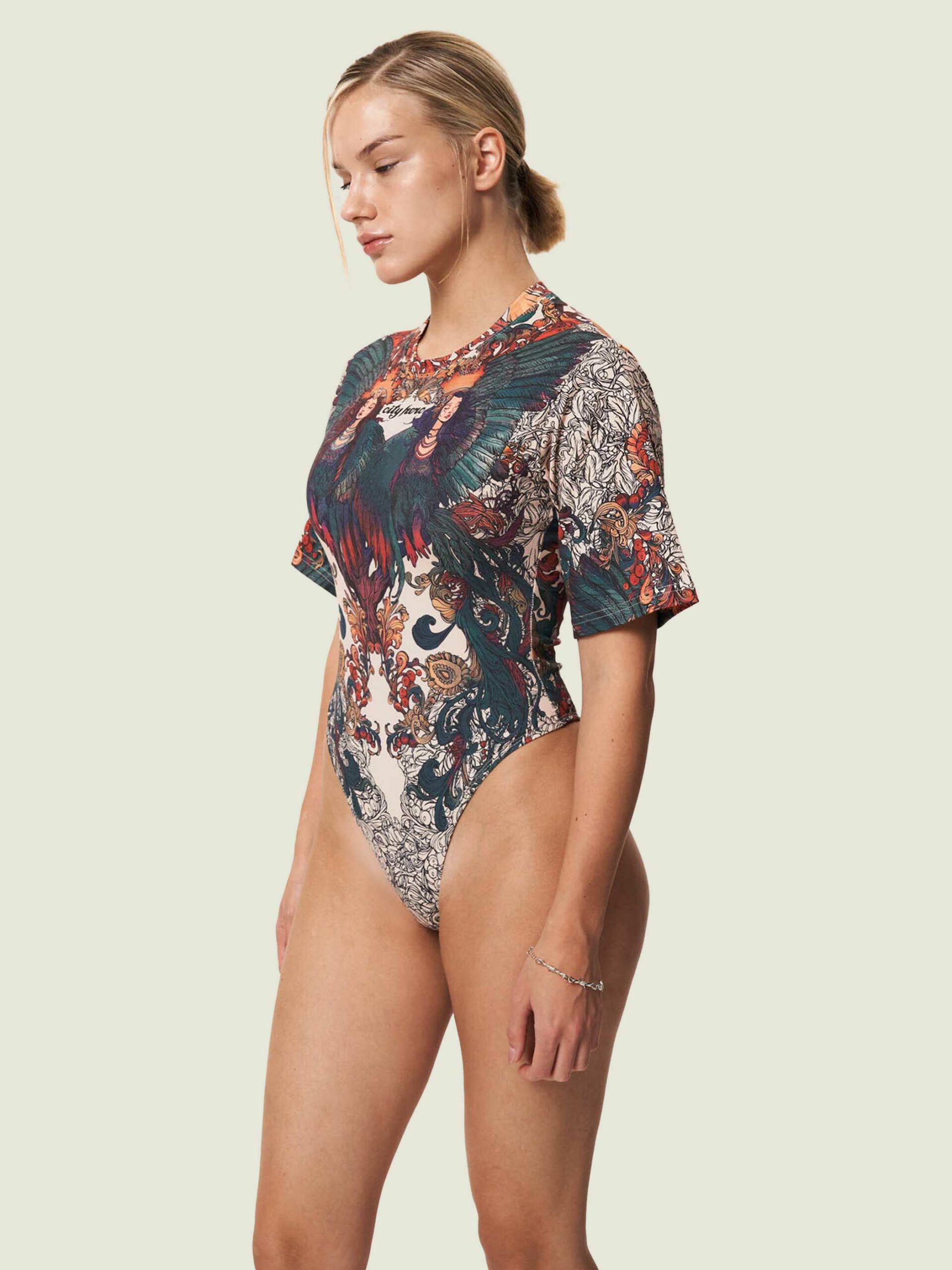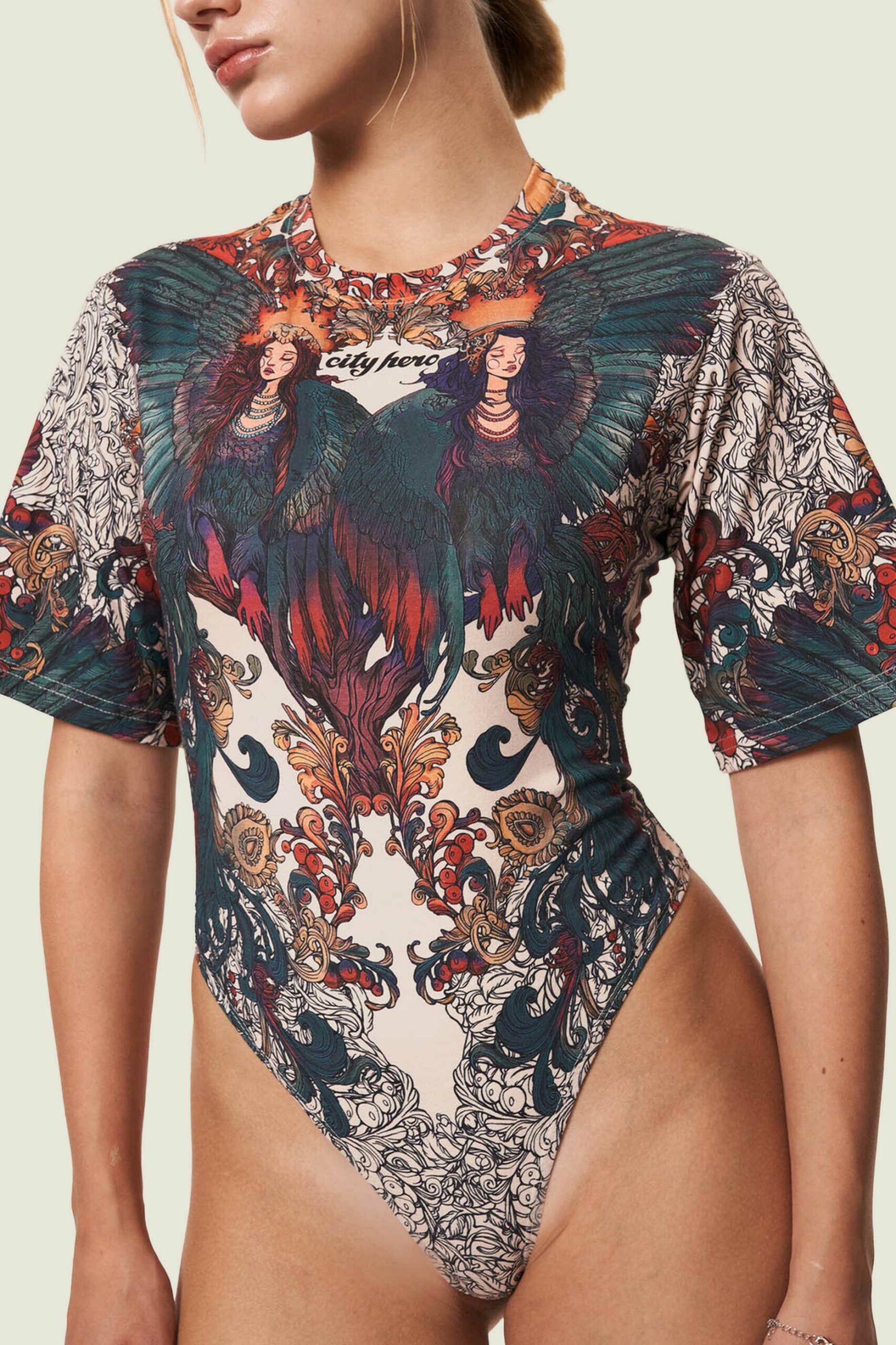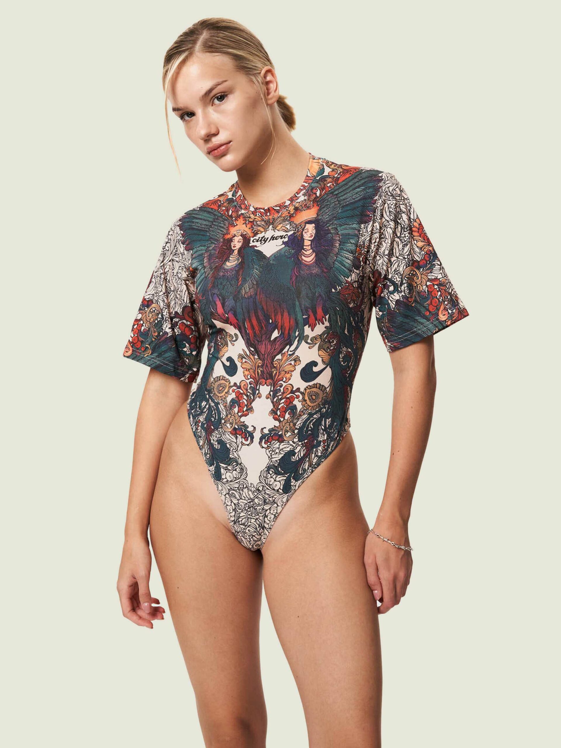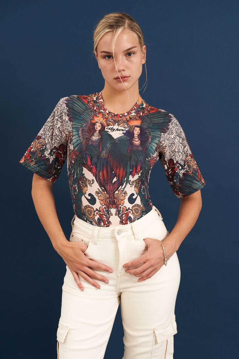 Боди-футболка универсальной формы, с широкими рукавами и прилегающим кроем. Боди можно комбинировать как с базовыми вещами, так и с изделиями CITY HERO того же или другого дизайна.