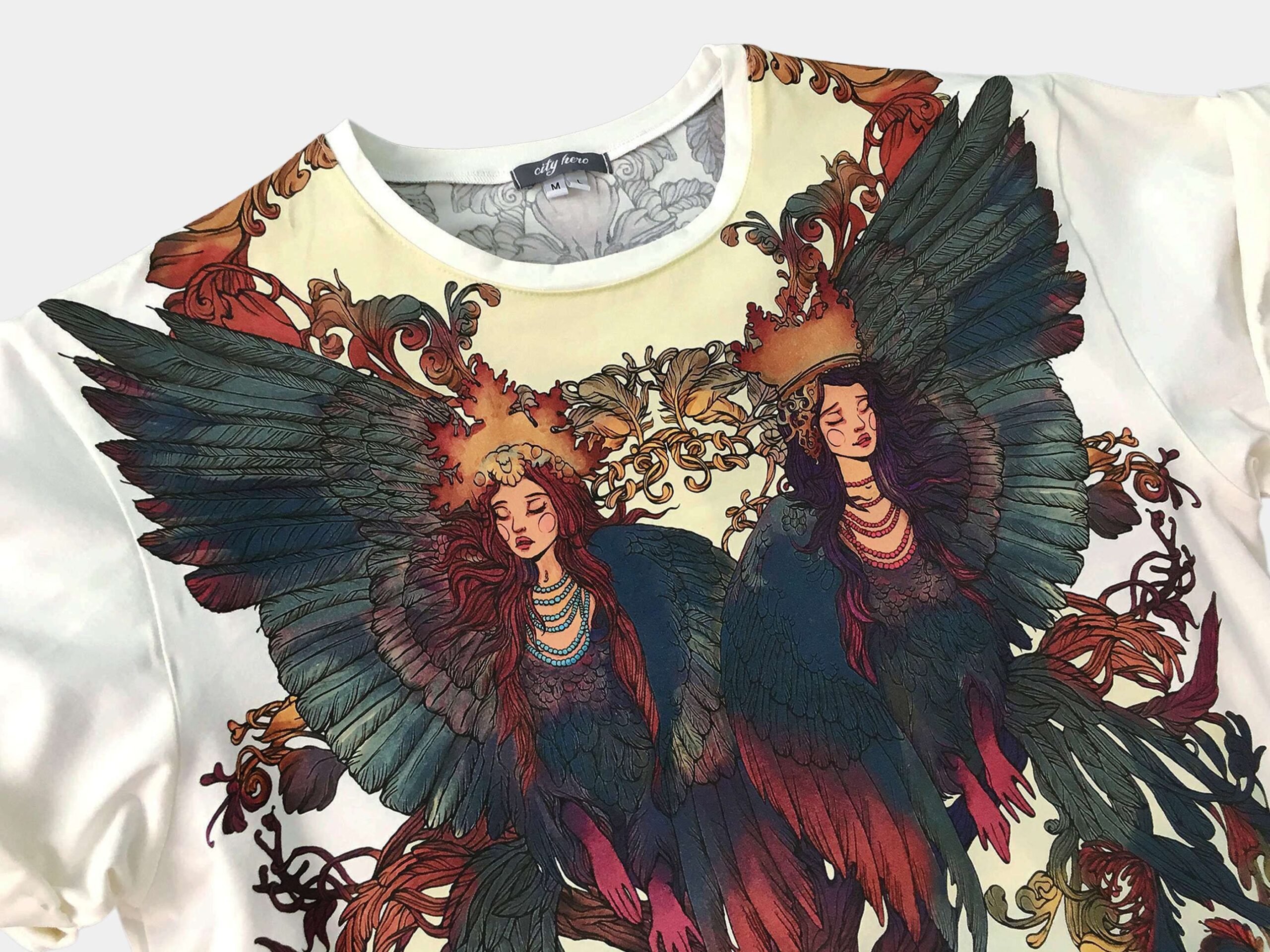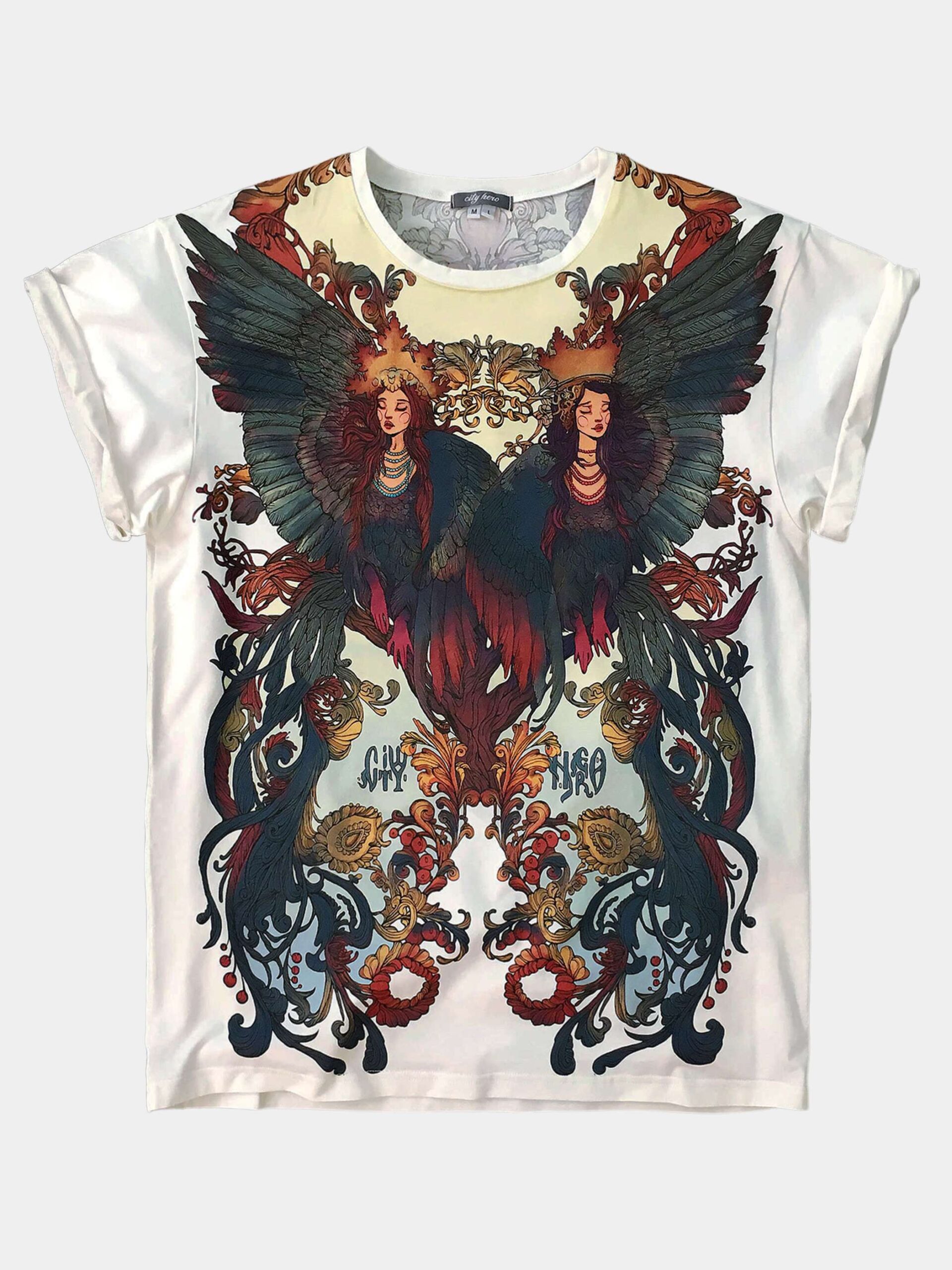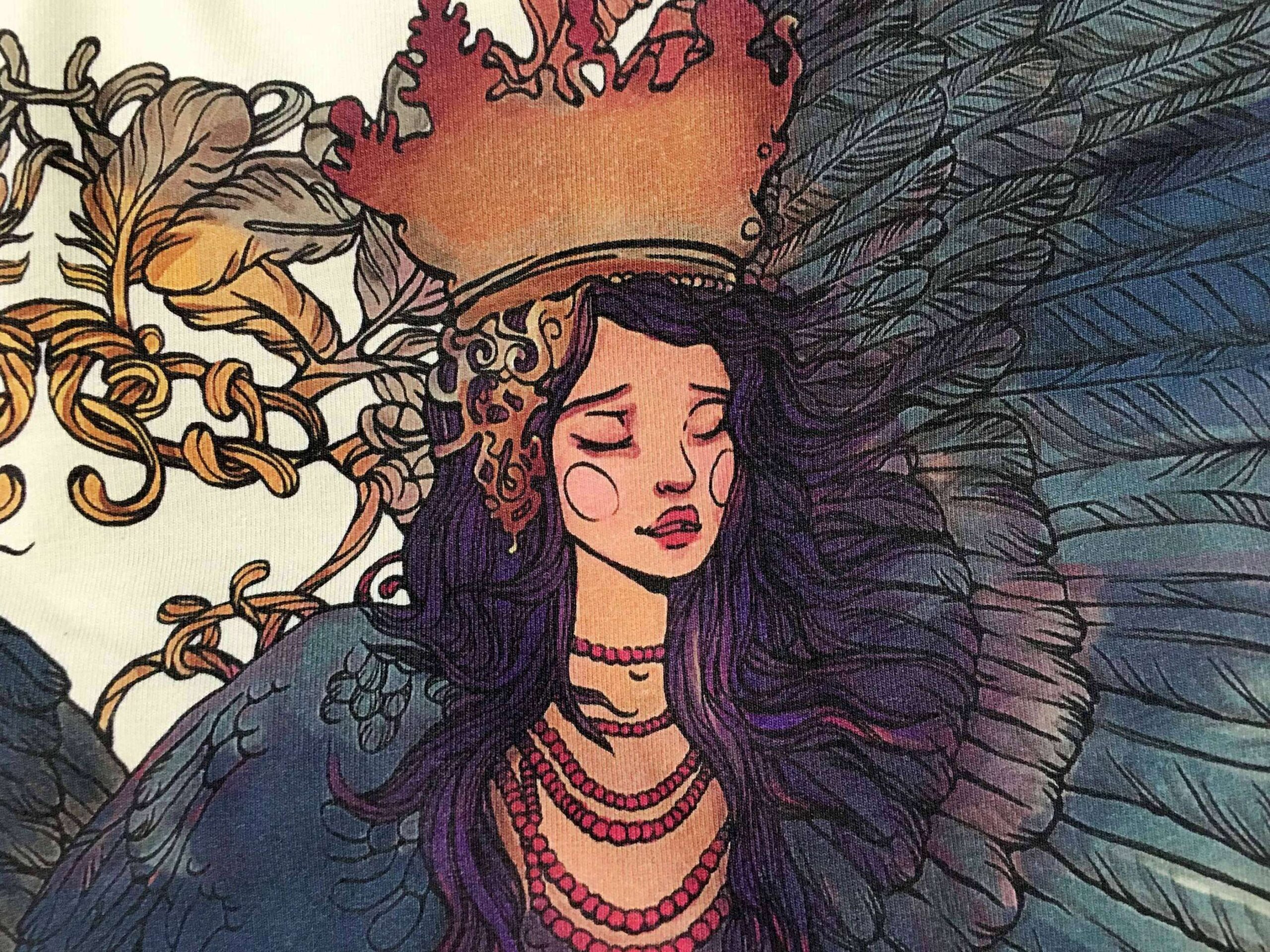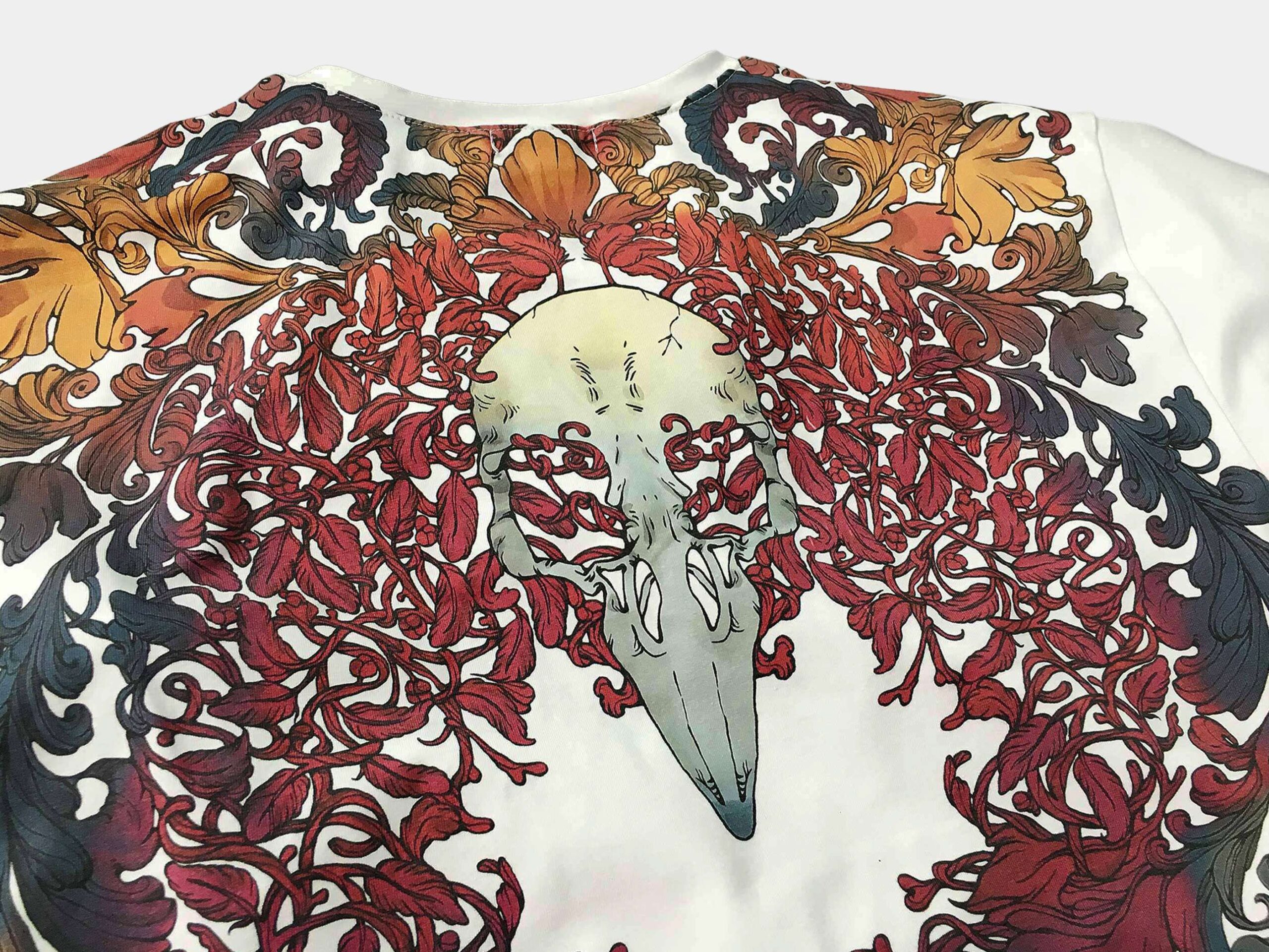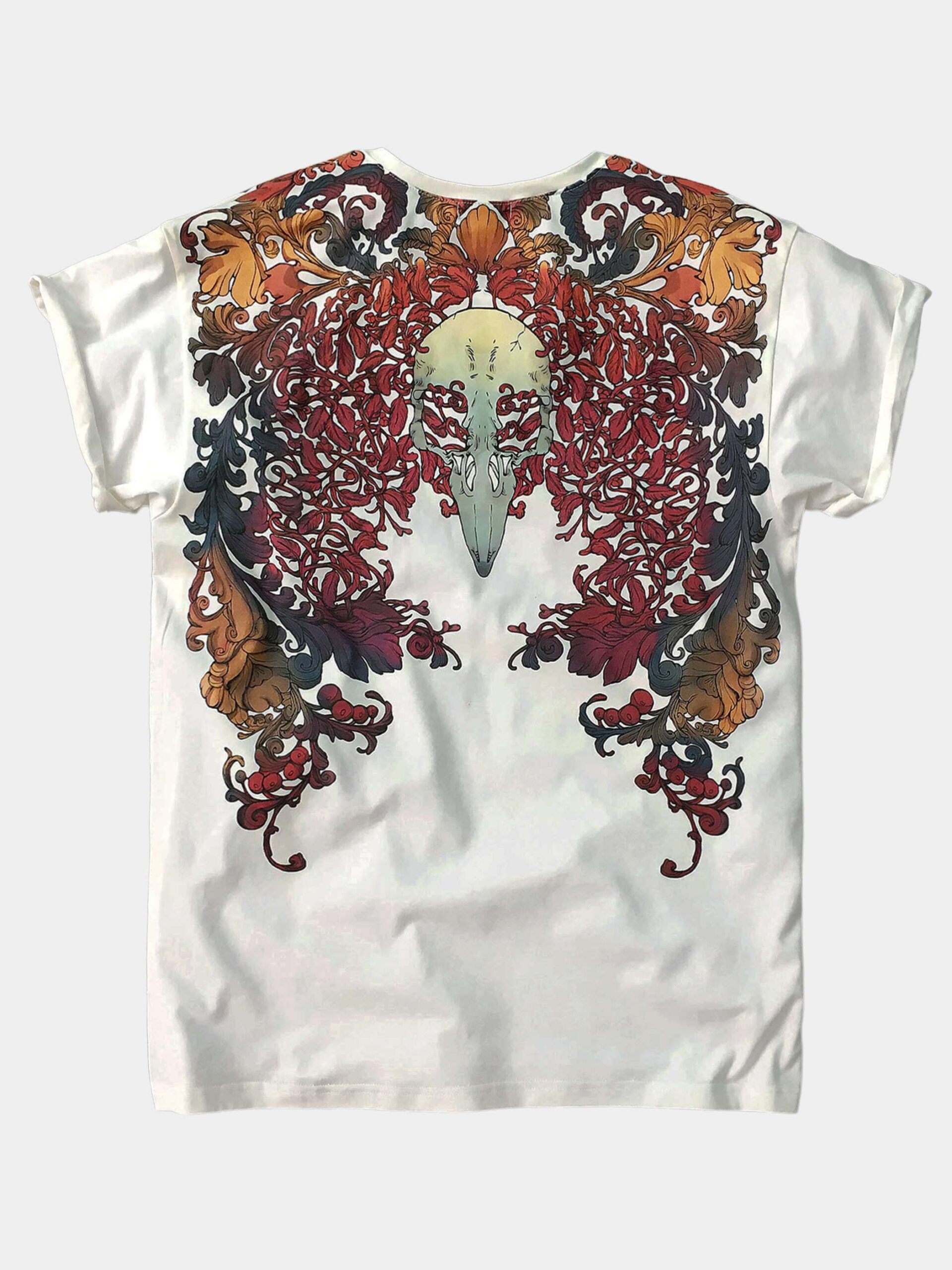 ГАМАЮН — Две мифические птицы с женскими лицами вдохновлены образом райской птицы Гамаюн, пение которой приносит блаженство каждому, кому посчастливится ее услышать. Причудливый орнамент переплетается с перьями птиц и перетекает на спину. На спине, между лопаток, изображен череп вороны.