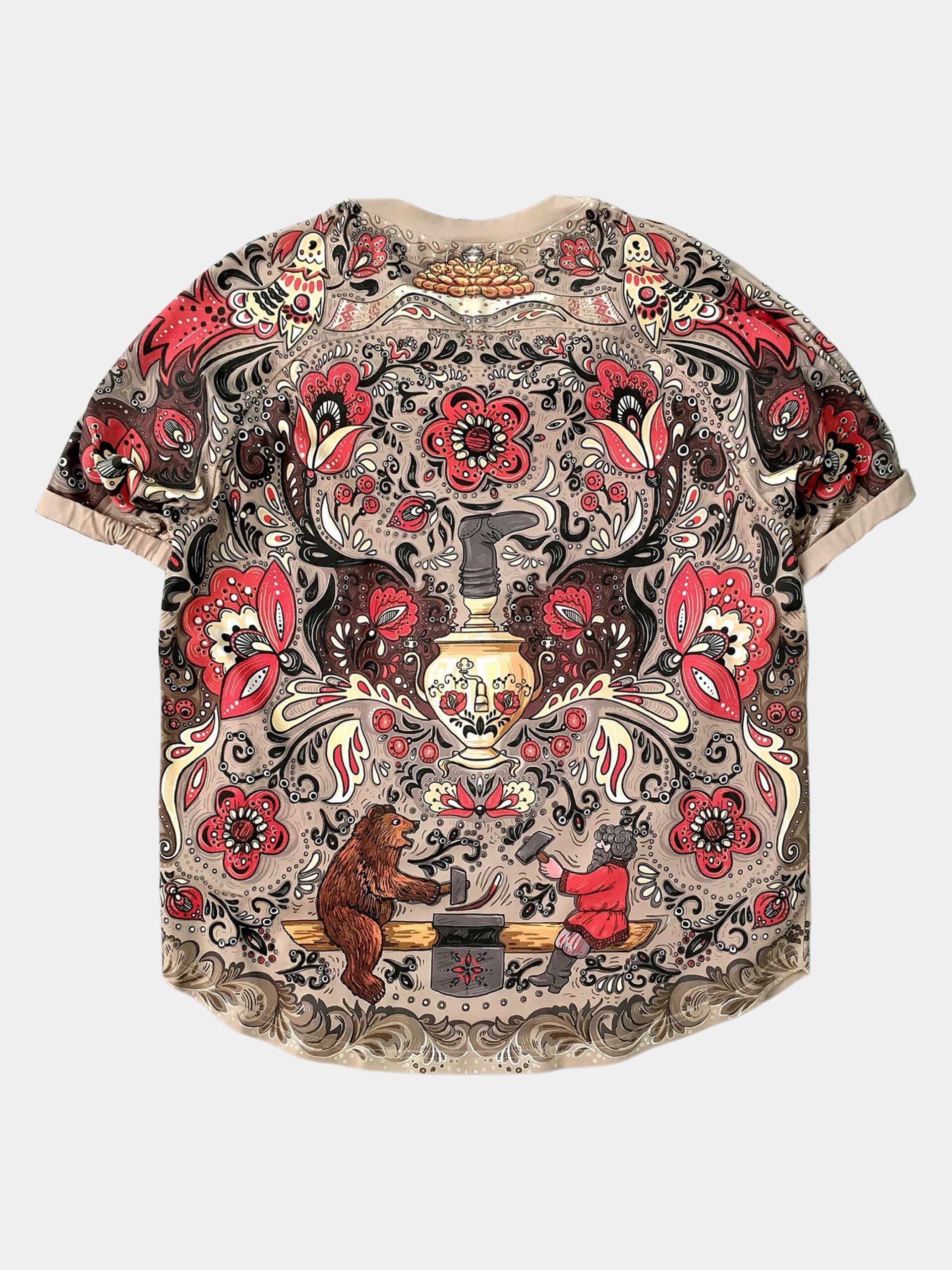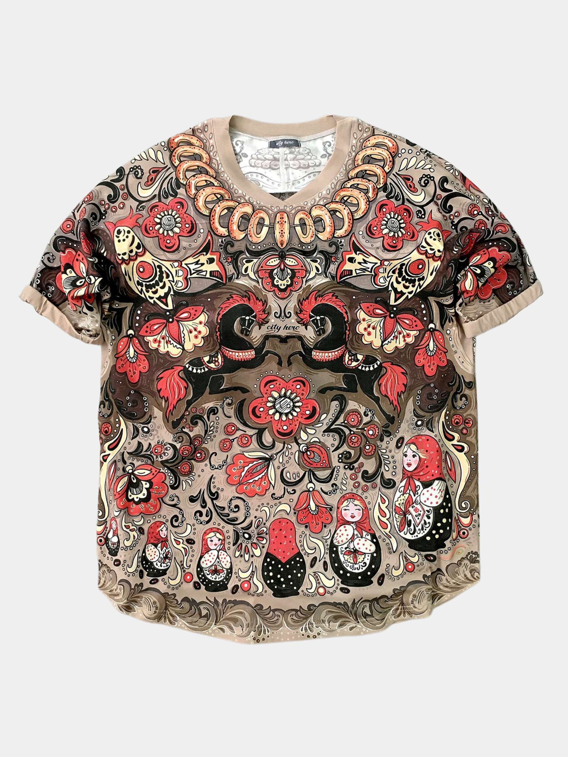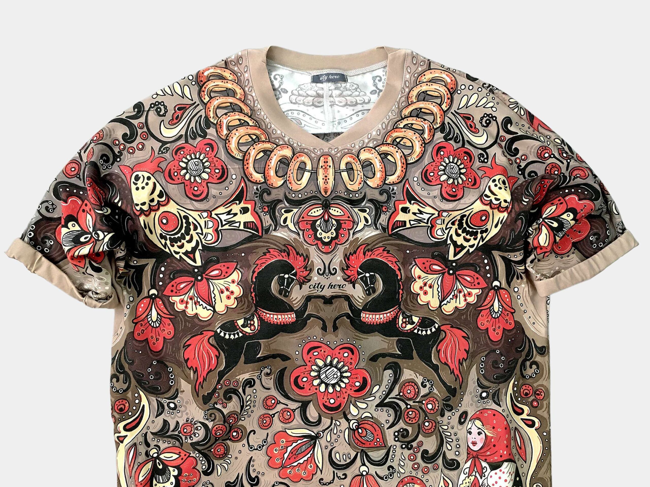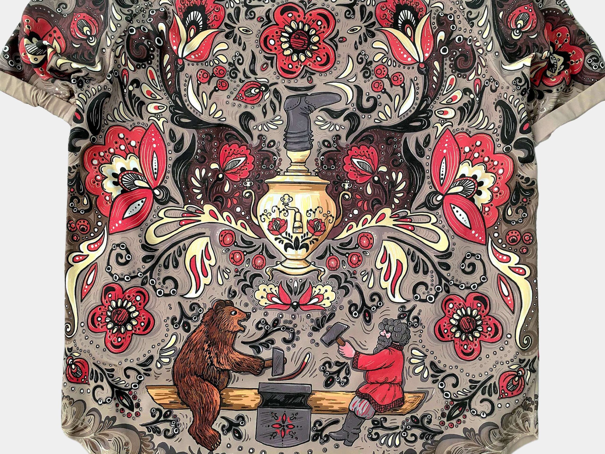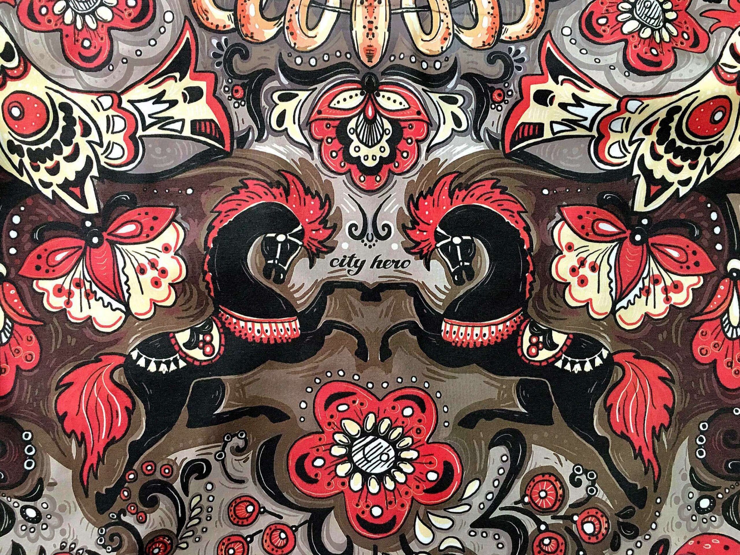 ХОХЛОМА — Атрибуты русской народной культуры соединены в этом дизайне в стилистике иллюстраций из любимых с детства сказок. Игривые кони, расписные матрешки, связка баранок, самовар, увенчанный сапогом создают праздничное настроение. Дизайн выдержан в золотисто- красно-черных тонах, благодаря чему и получил свое название — “хохлома”.