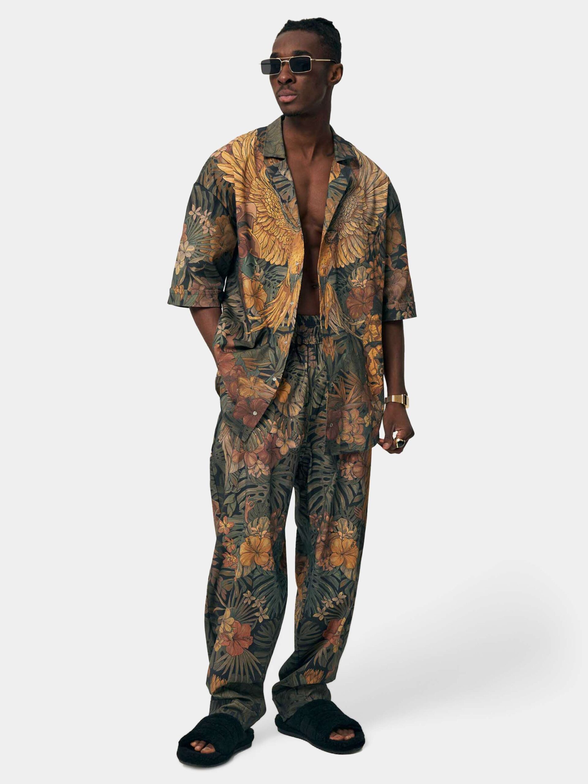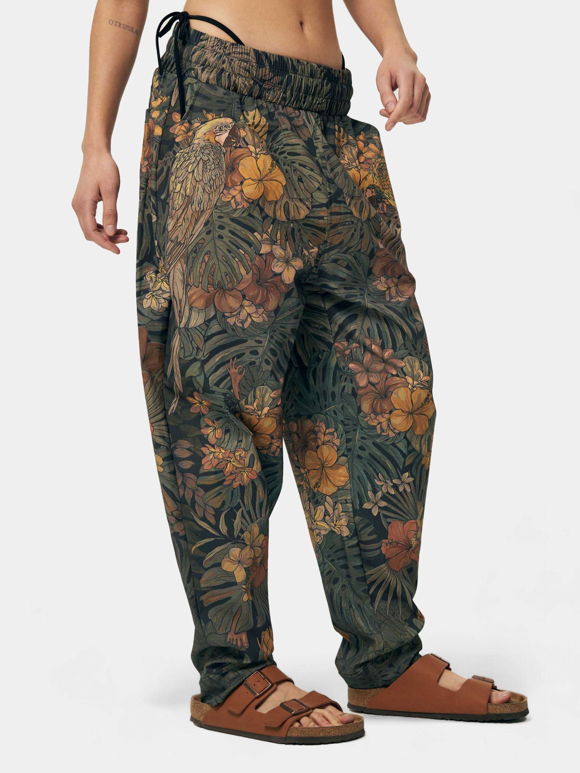 Брюки с графикой в тропическом стиле. В растительный принт мы замешали племенные маски народов Мексики и Индонезии. Принт исполнен в сдержанных зелёных тонах.