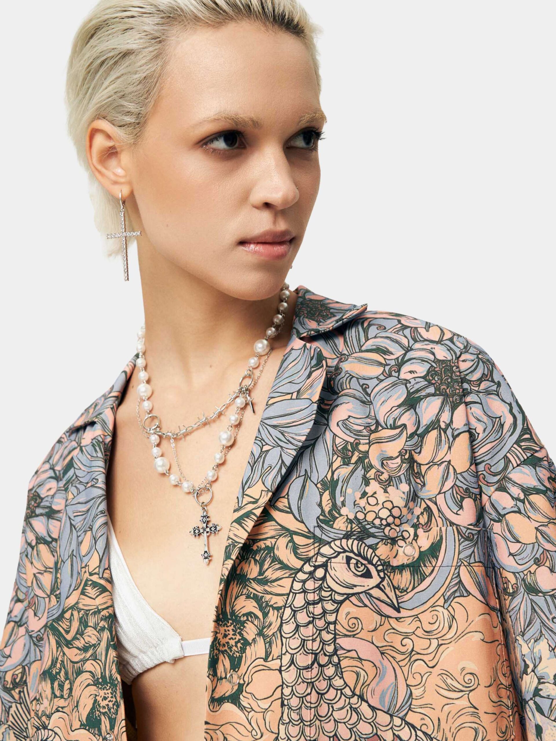 Рубашка с короткими рукавами с графикой в японском летнем стиле. В растительный принт японской флоры замешаны павлины, аист и мифические животные-стражи комаину (смесь собаки и льва). Выполнена в нежных голубых и персиковых тонах. Уличная рубашка второго поколения в стиле оверсайз.