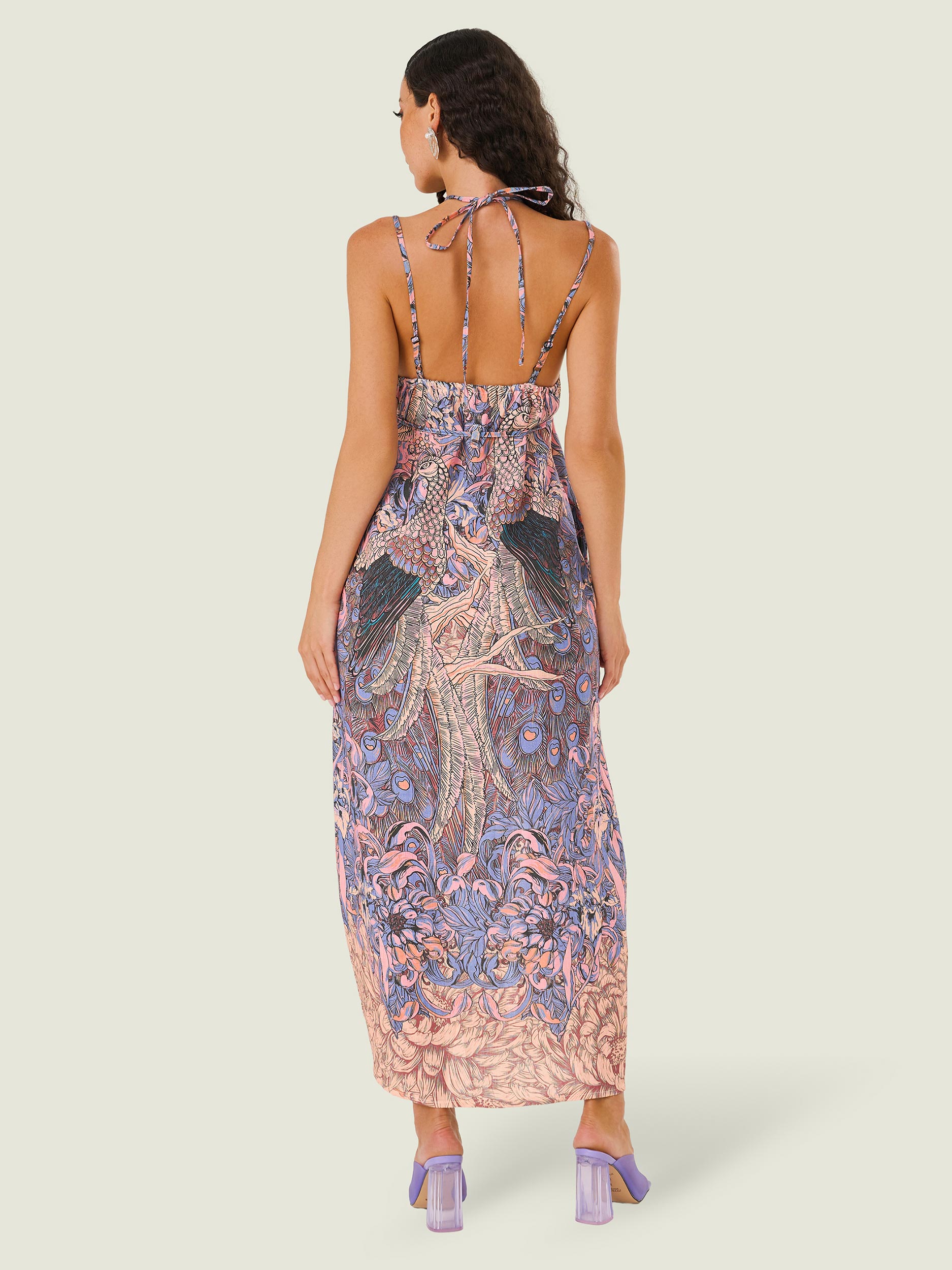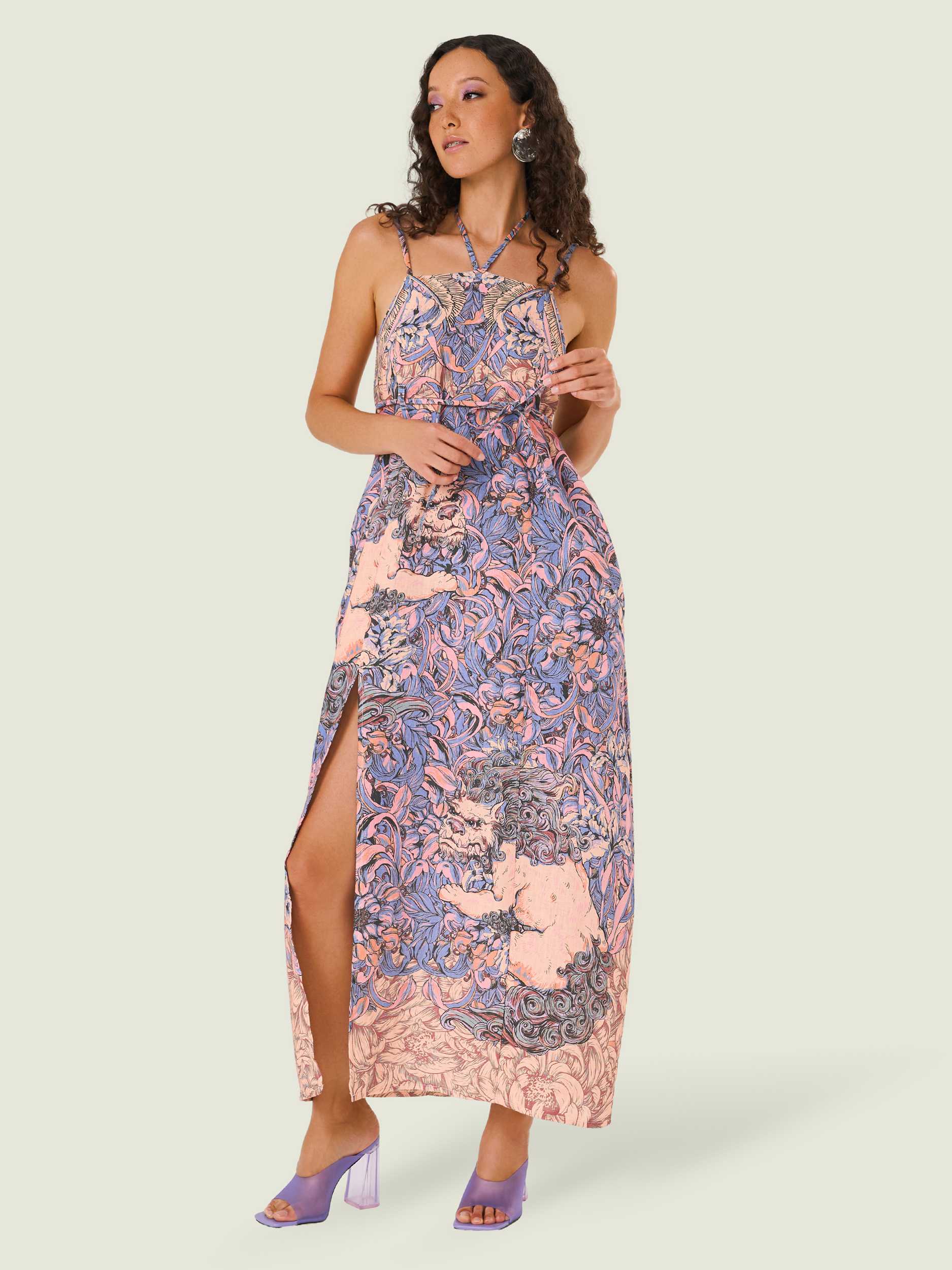 Сарафан-банан с графикой в японском стиле. В растительный принт японской флоры замешаны павлины, аист и мифические животные-стражи комаину (смесь собаки и льва). Сарафан выполнен в нежных голубых и персиковых тонах.