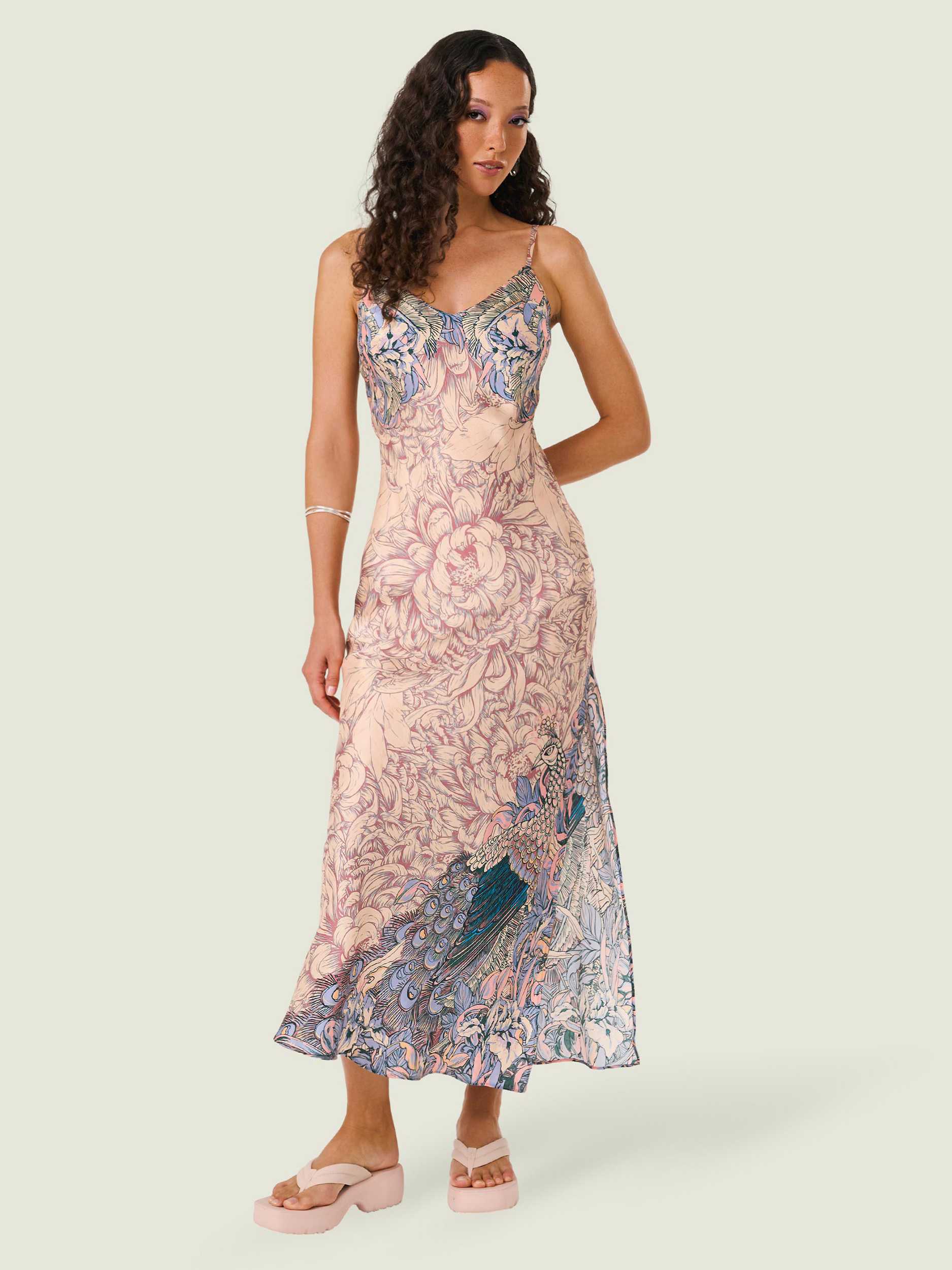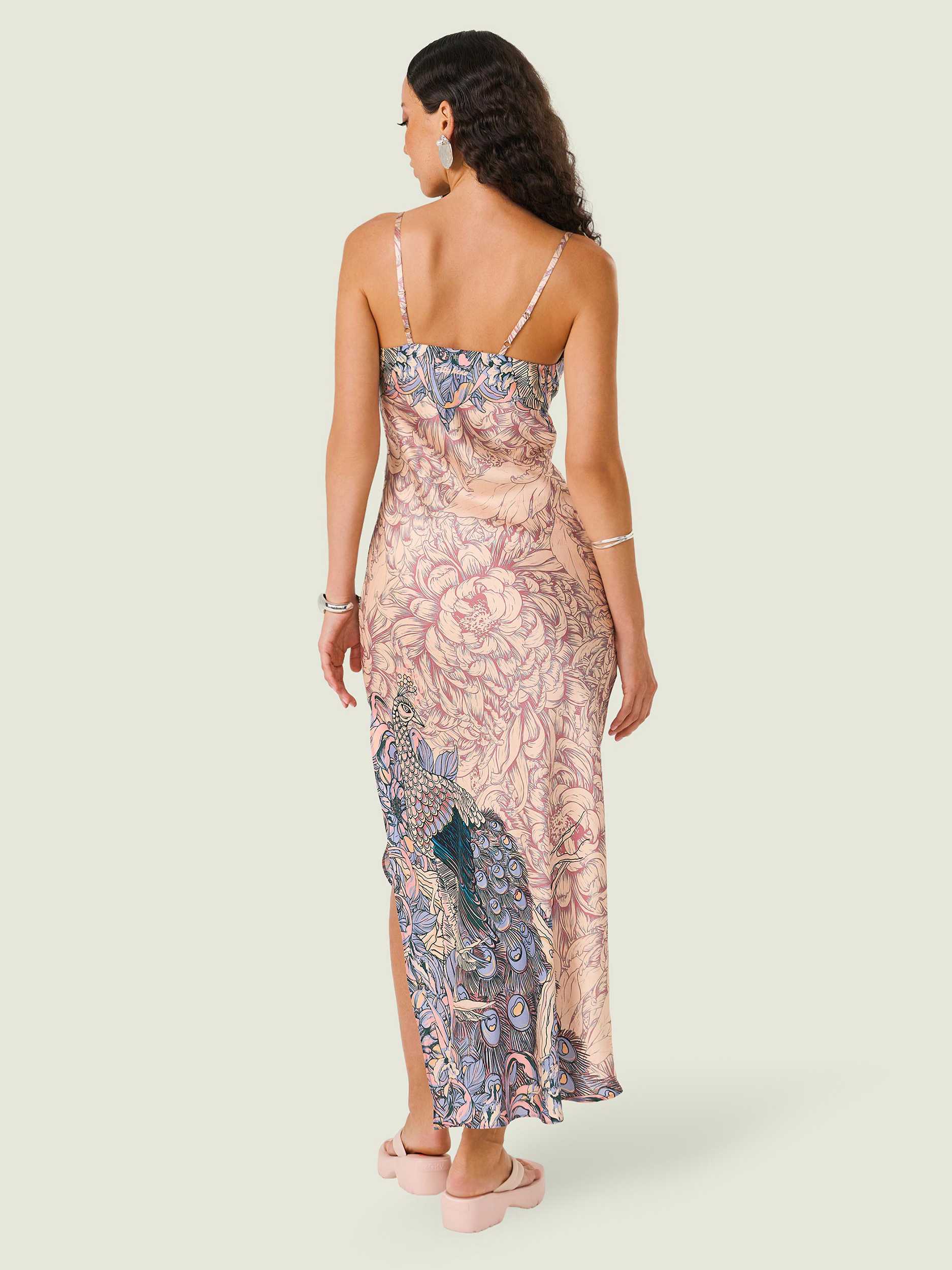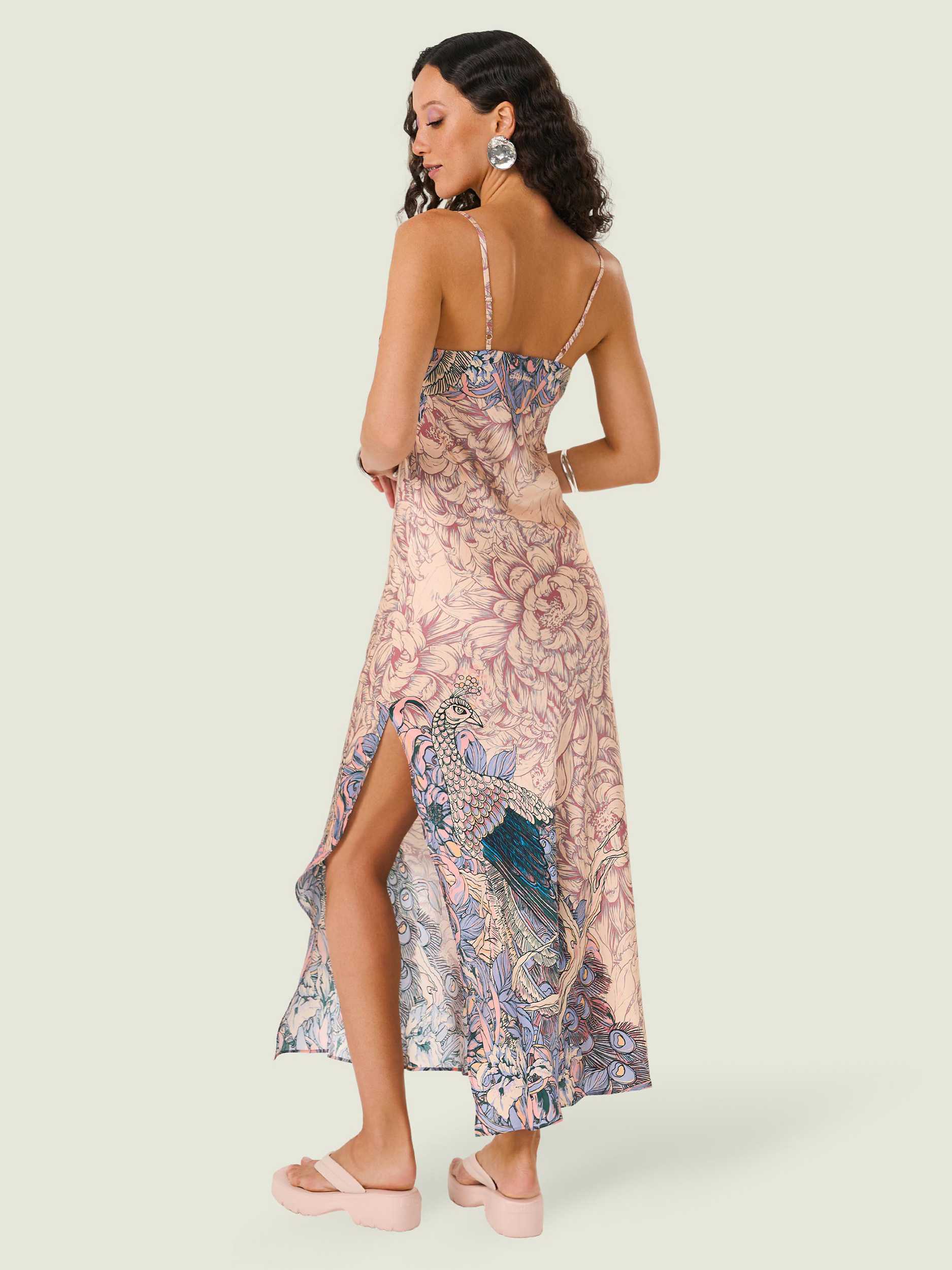 Изящное платье-комбинация с графикой в японском летнем стиле. В растительный принт японской флоры замешаны чудесные павлины. Платье выполнено в нежных голубых и персиковых тонах.