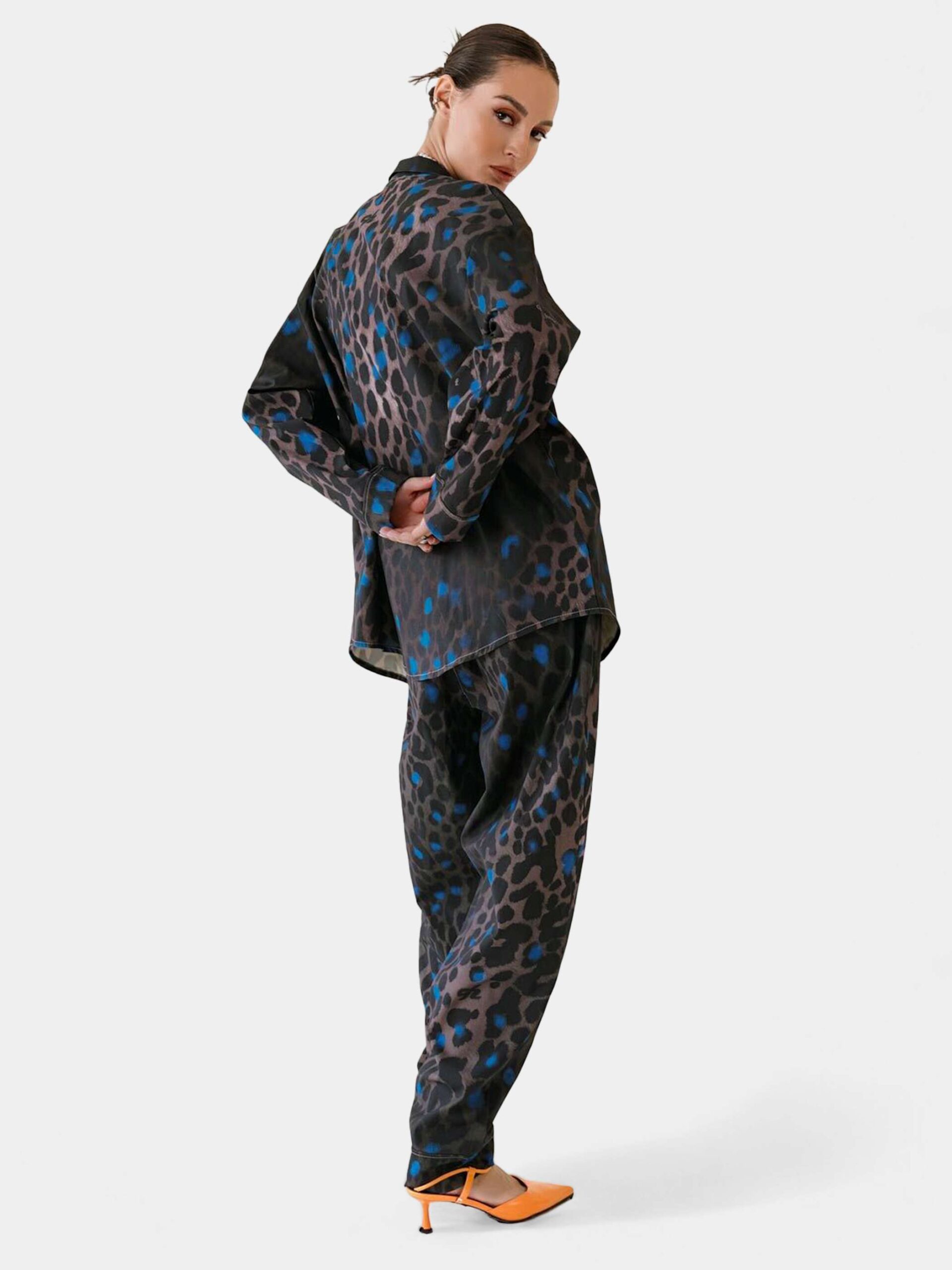 Брюки второго поколения в стиле оверсайз со стилизованным анималистичным принтом Леопард. Стилизацию мы назвали «анютины глазки». Великолепие и богатство синего цвета в сочетании с «успокоенным» леопардовым паттерном делает этот принт почти идеальным.
