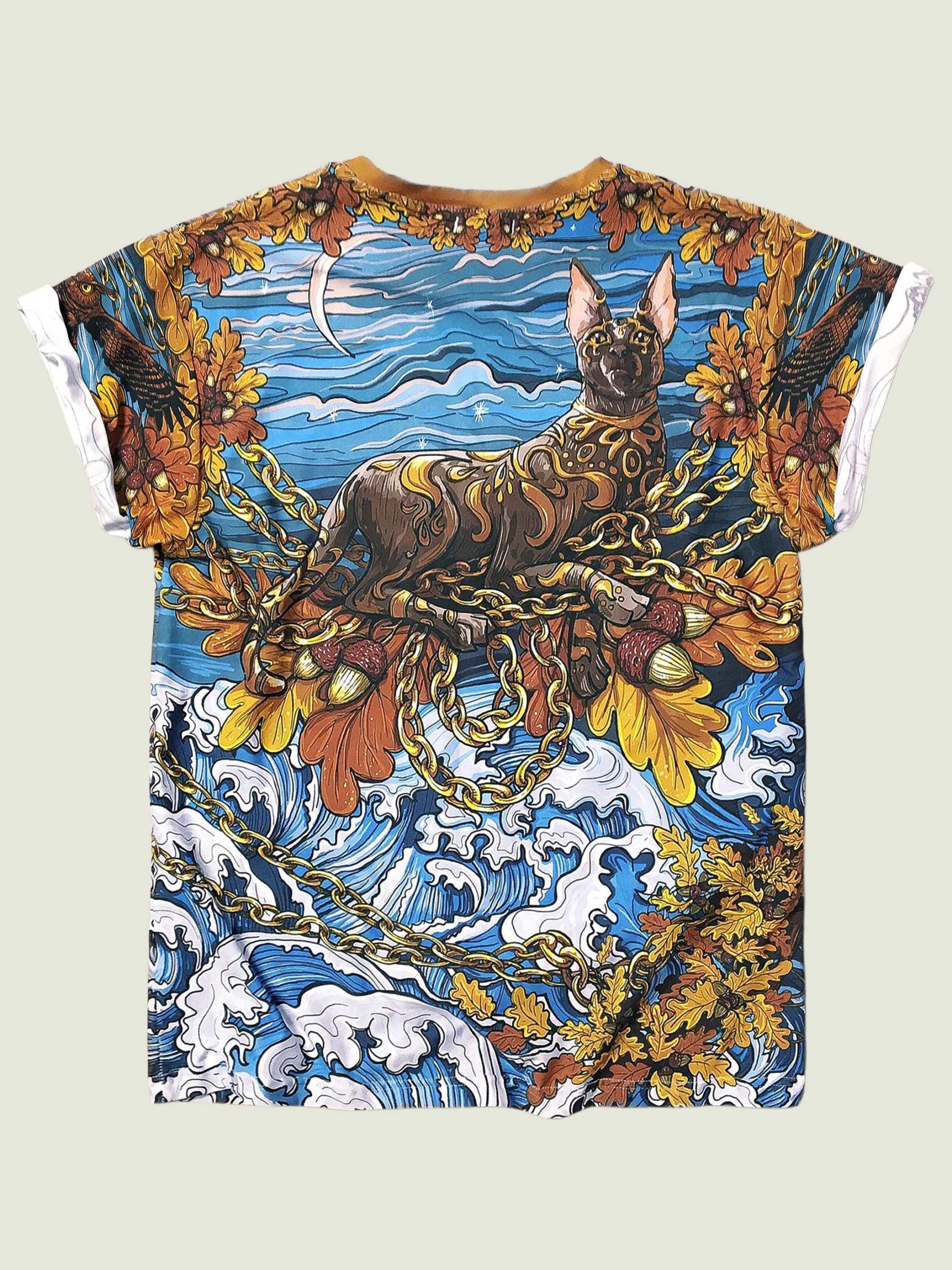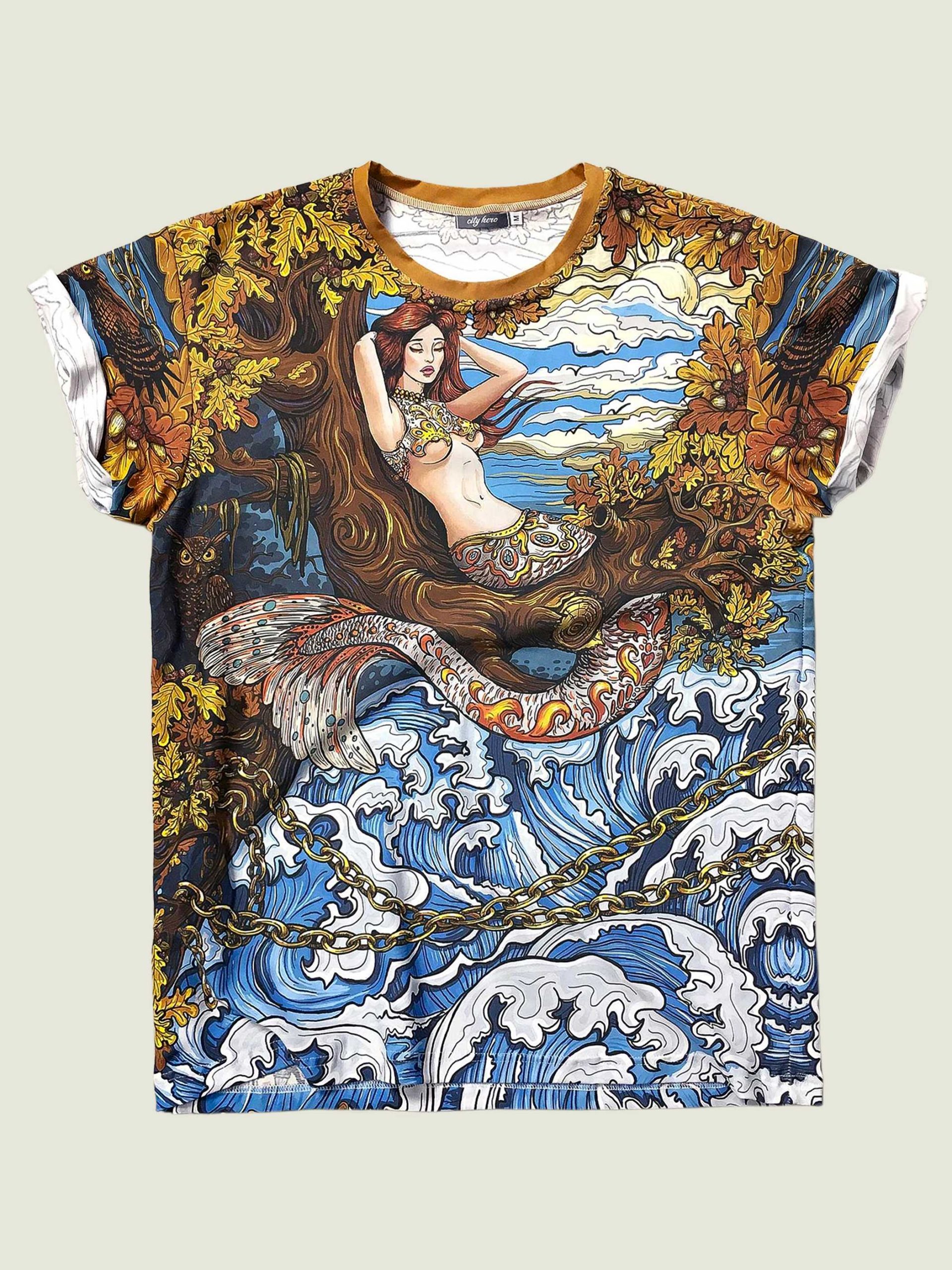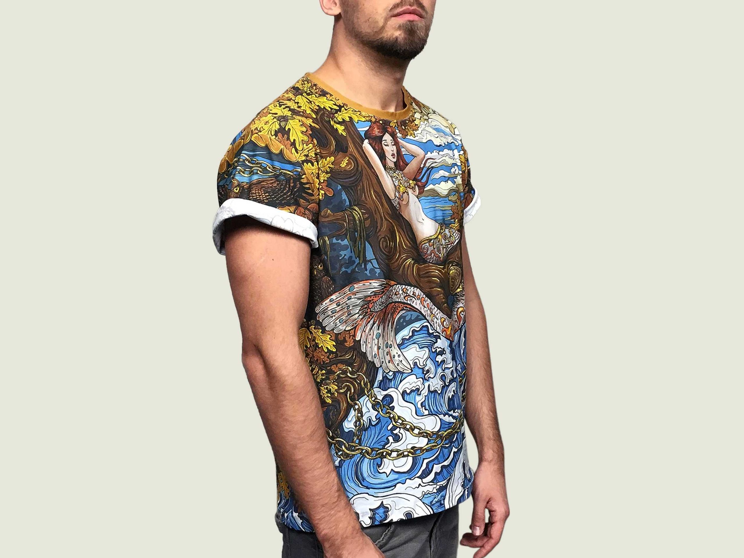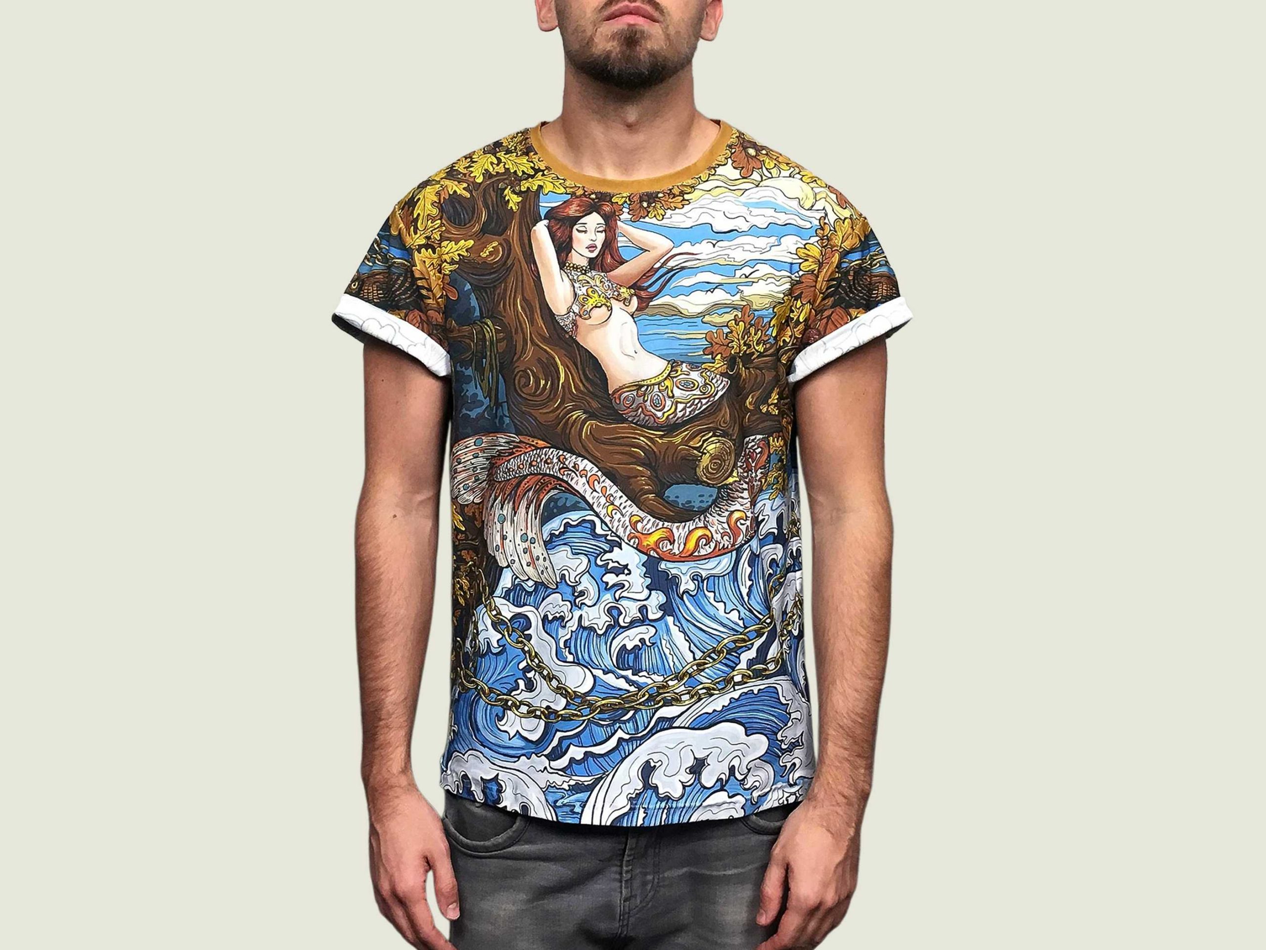Дизайн, навеянный волшебным миром Пушкинского Лукоморья, полным чудес и сказочных персонажей. Прекрасная русалка сидит на раскидистых ветвях мистического дуба, нахлынувшие волны несут с собой тридцать отважных витязей, а в лесной чаще таятся невиданные звери.