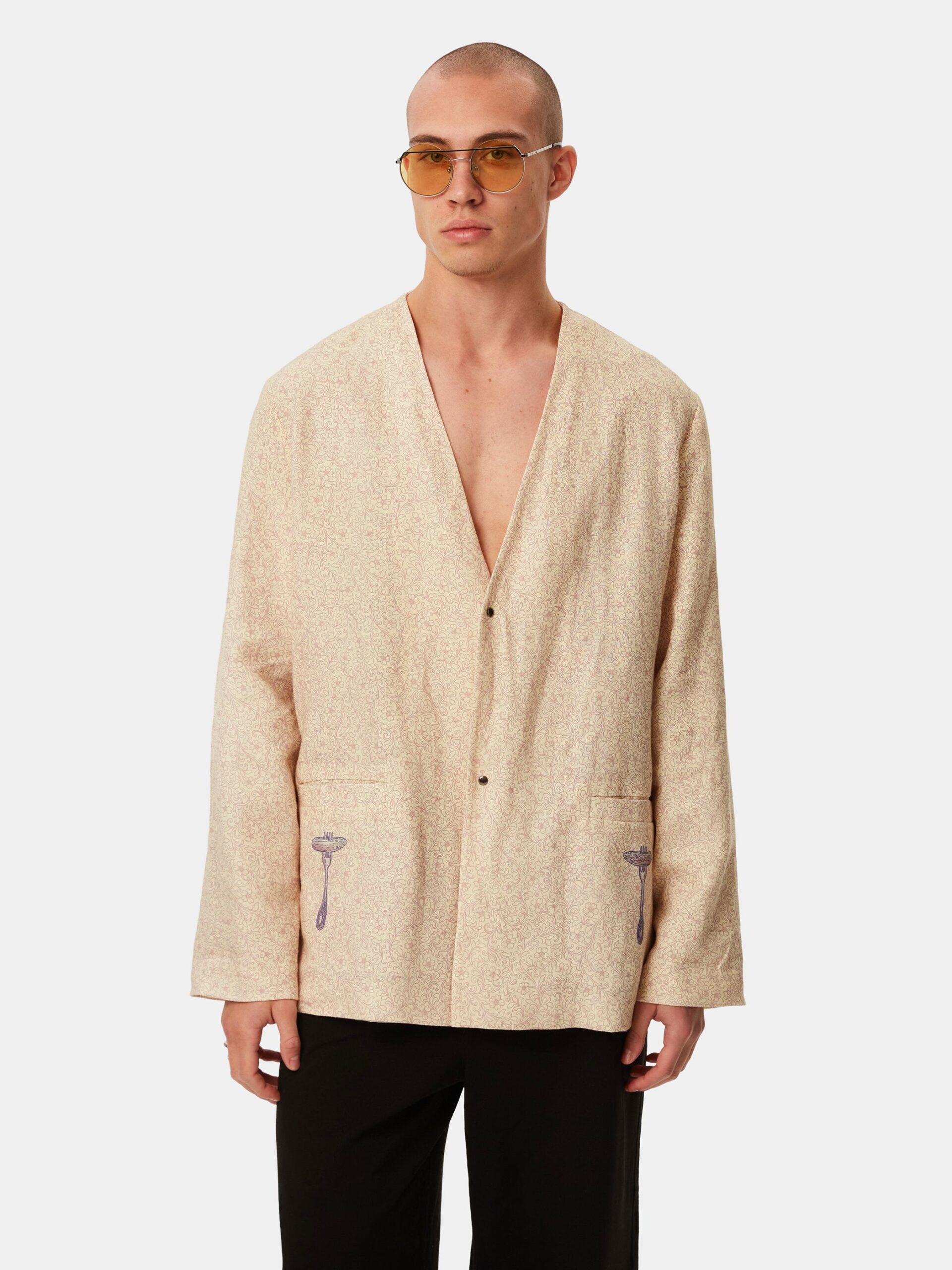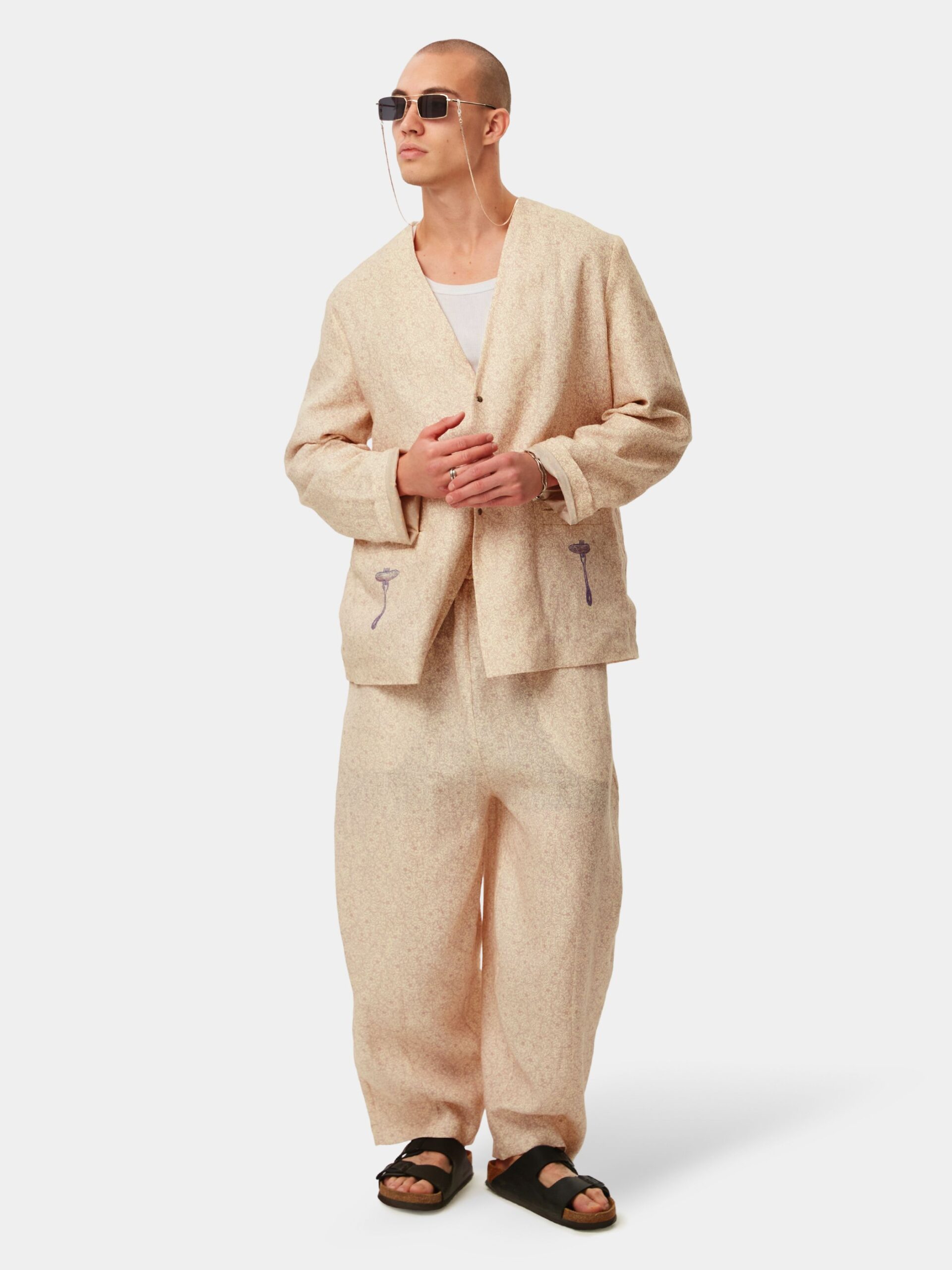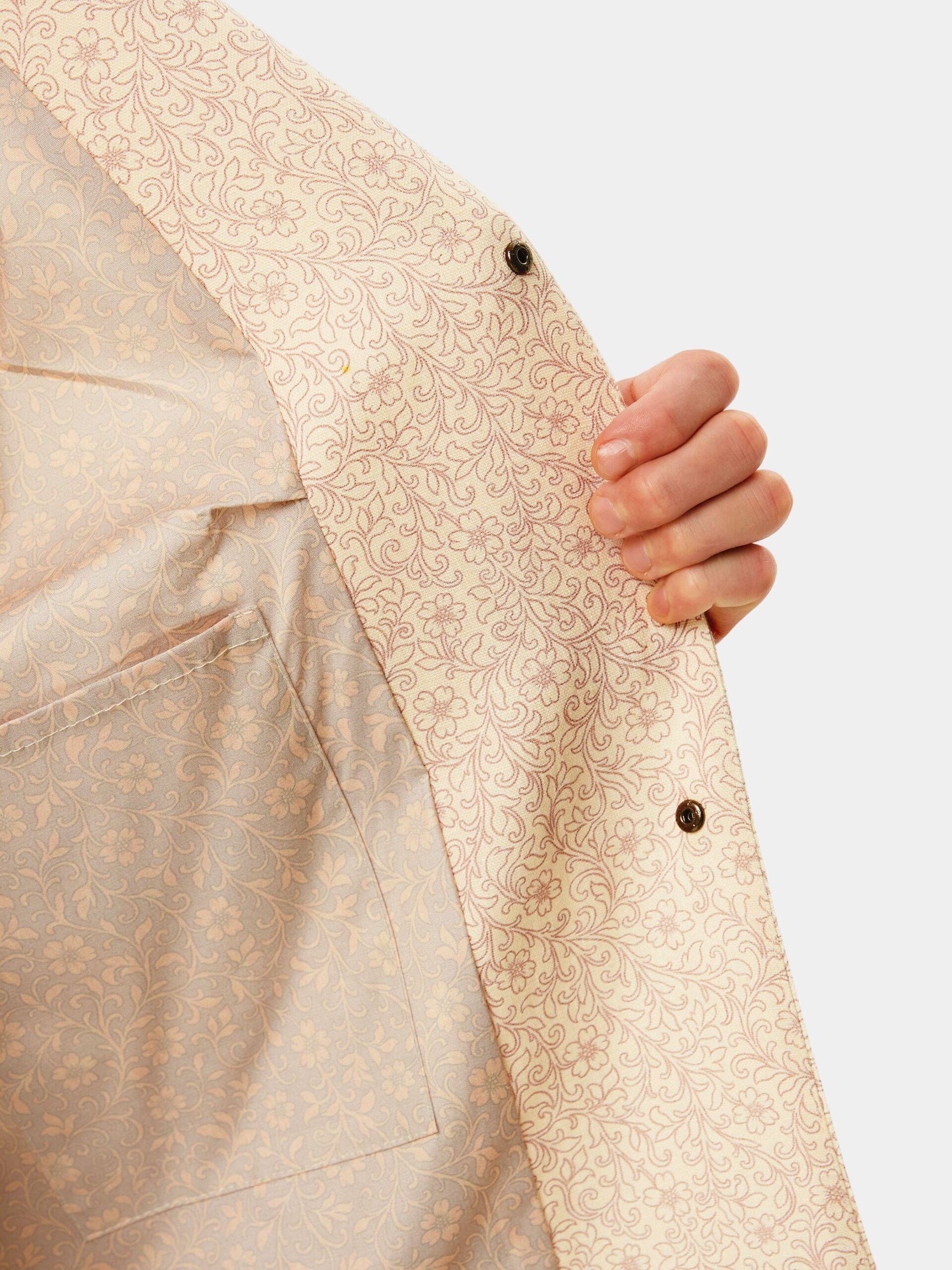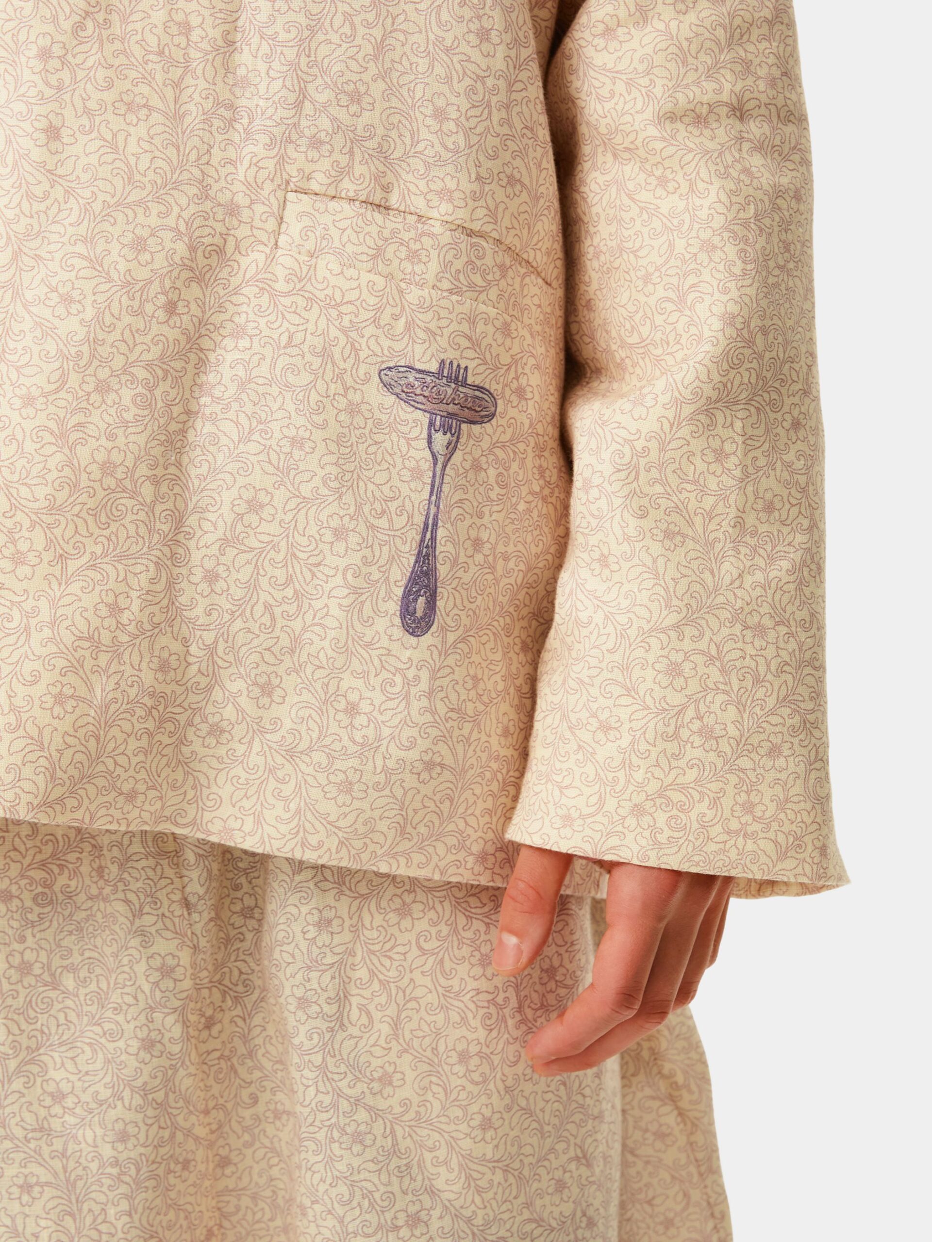 Мы разбавили его озорными элементами графики: под карманами расположили изящные вилочки с солеными огурчиками! На подкладке пиджака бежево-кремовый флористичный паттерн.