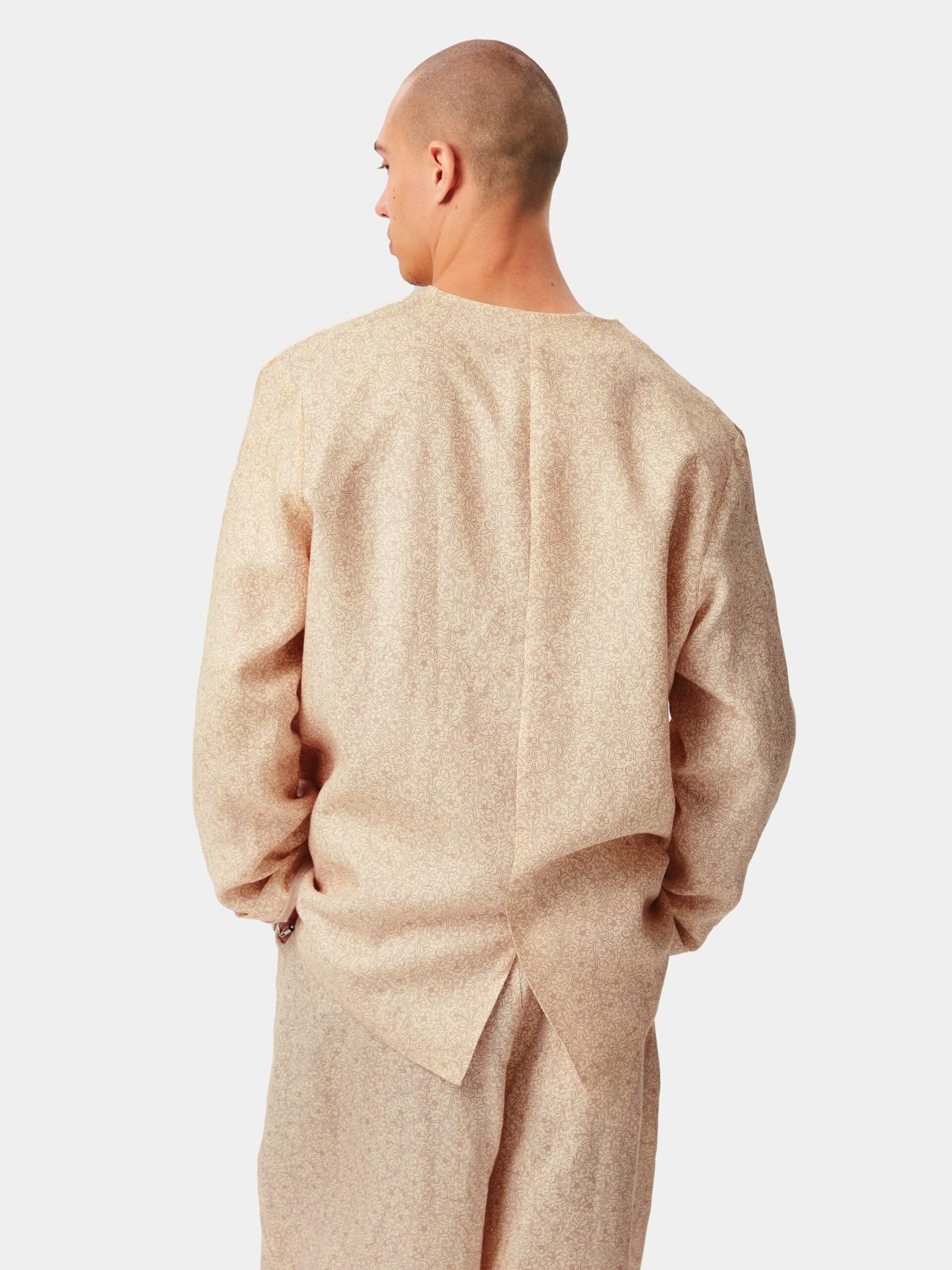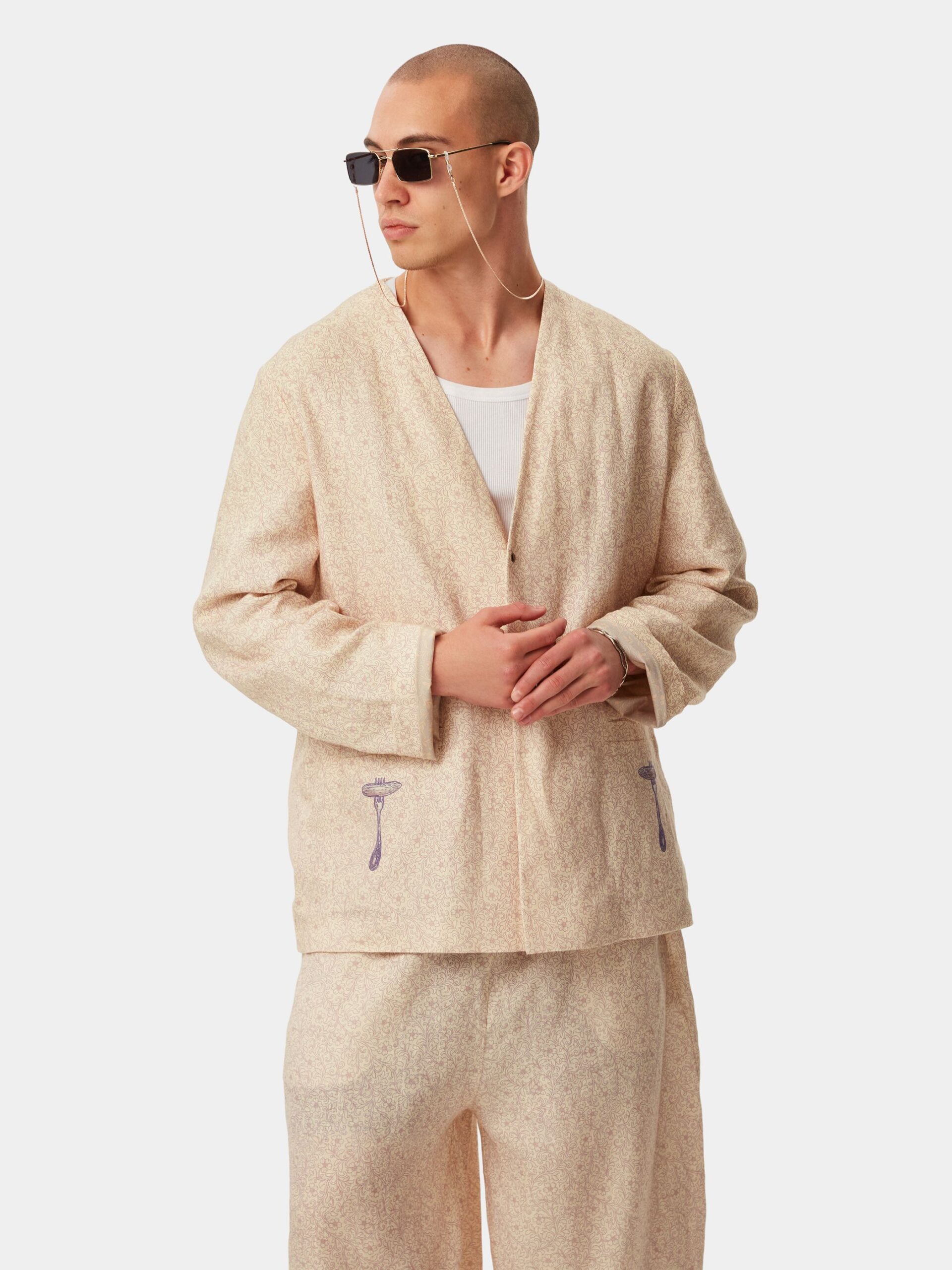 Пиджак из натурального льна без воротника и лацканов — чистая форма без лишнего.