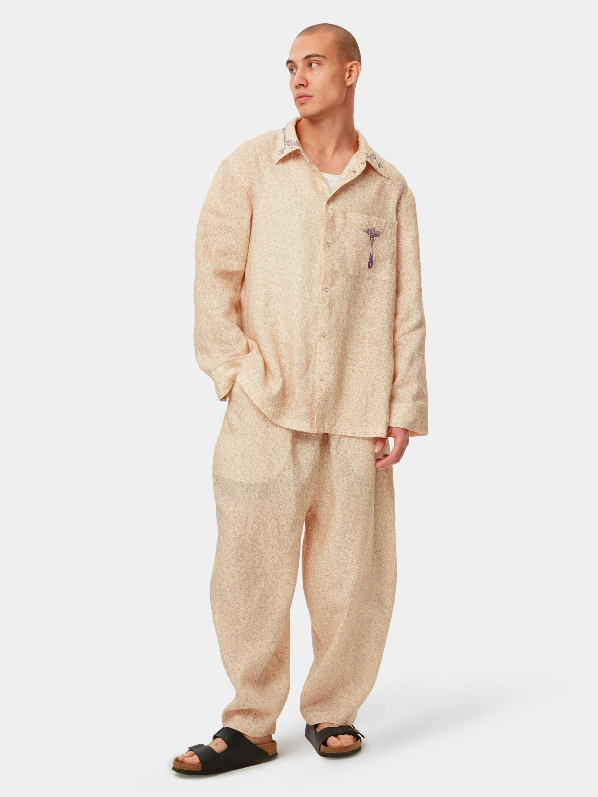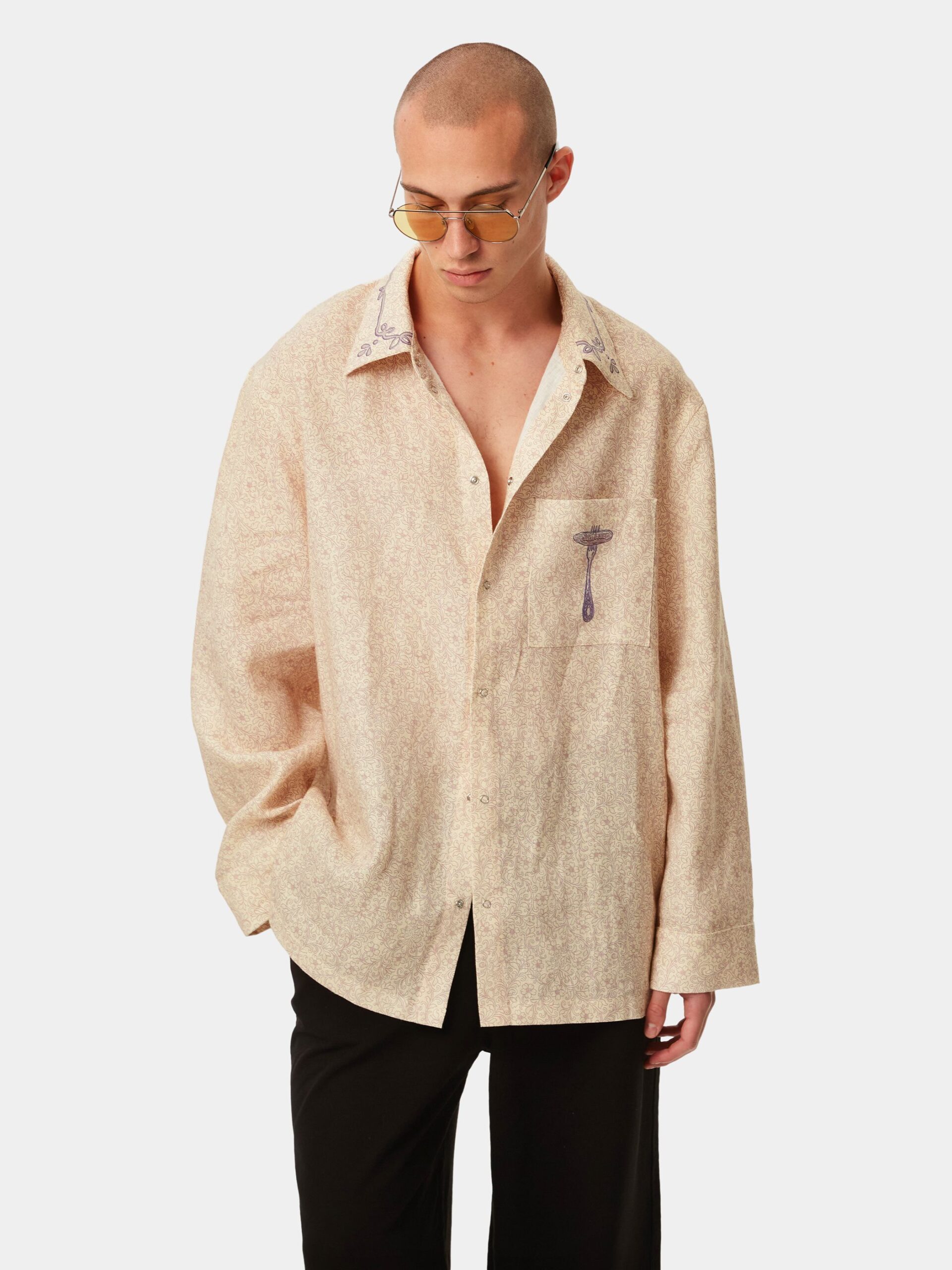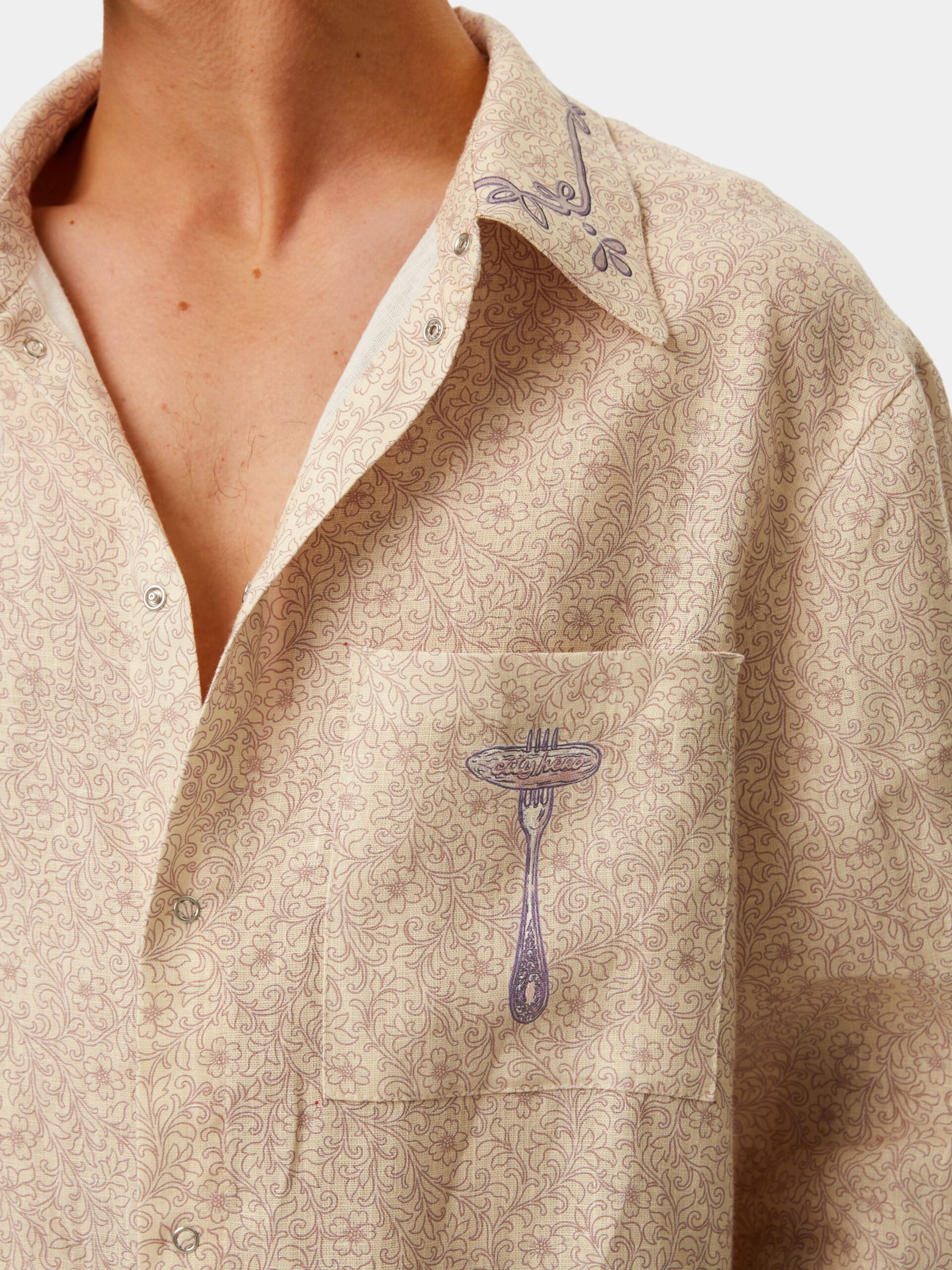 Мы разбавили его озорным элементом графики в виде изящной вилки с соленым огурчиком. А на воротнике-стойке расположили красивый узор. Рубашка из натурального льна в стиле оверсайз.