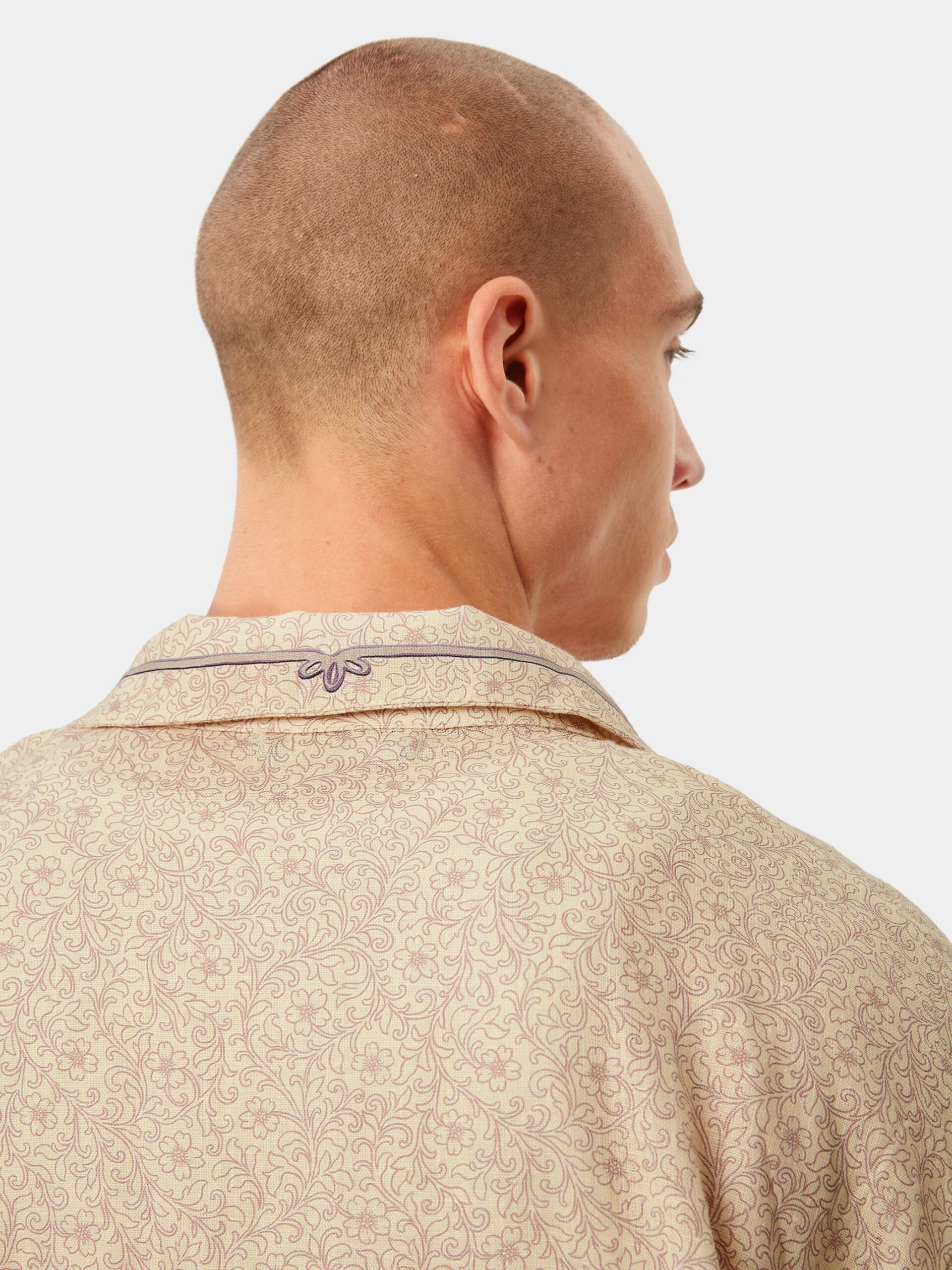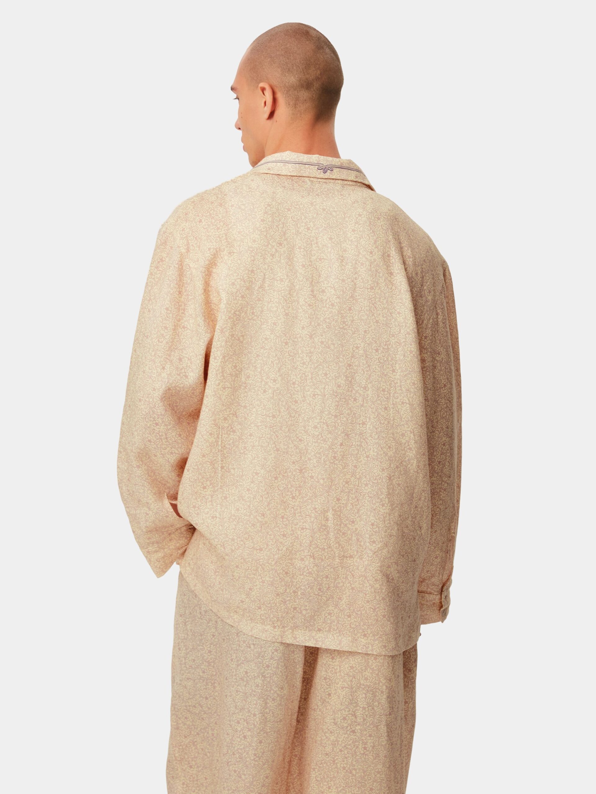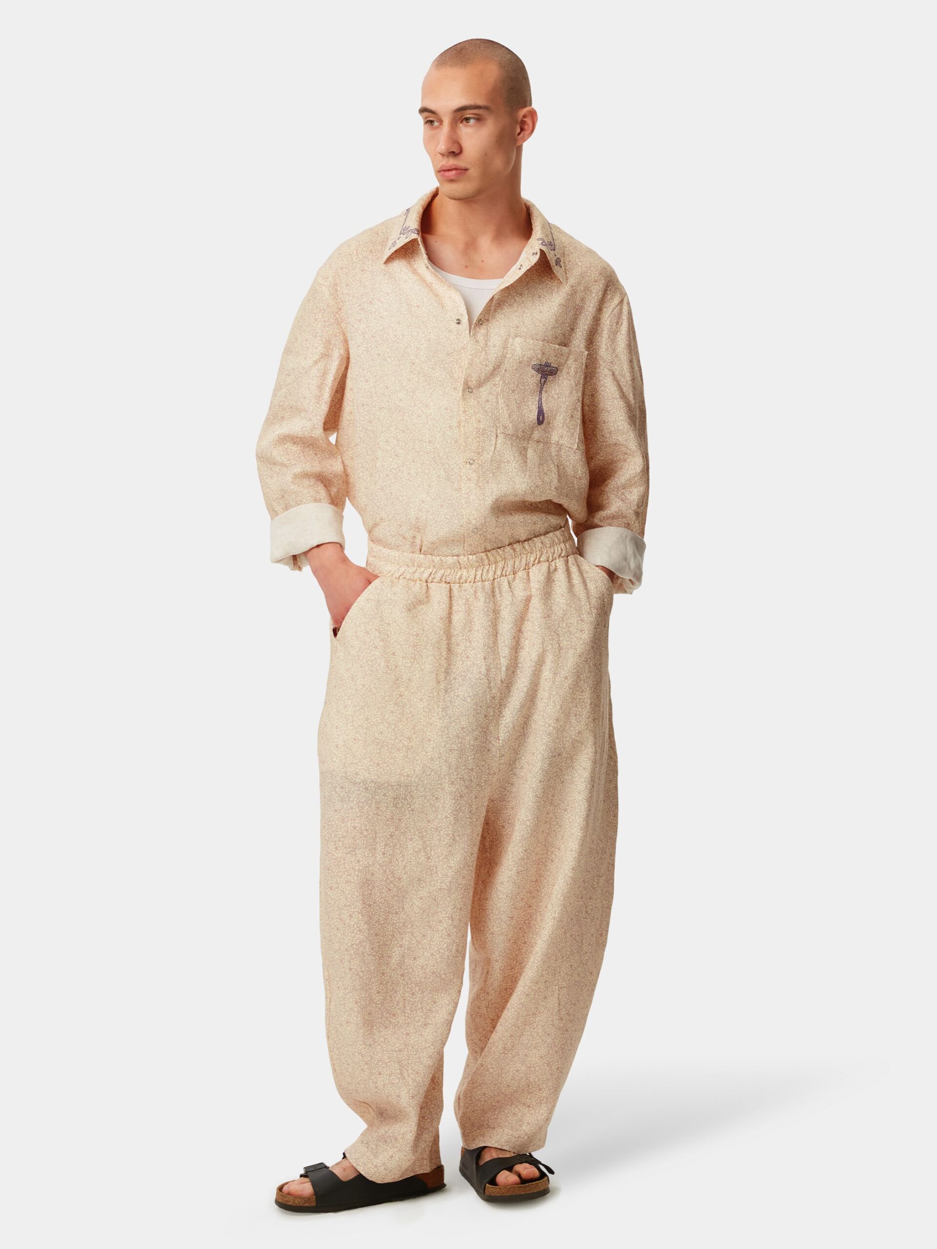 Мы разбавили его озорным элементом графики в виде изящной вилки с соленым огурчиком. А на воротнике-стойке расположили красивый узор. Рубашка из натурального льна в стиле оверсайз.
