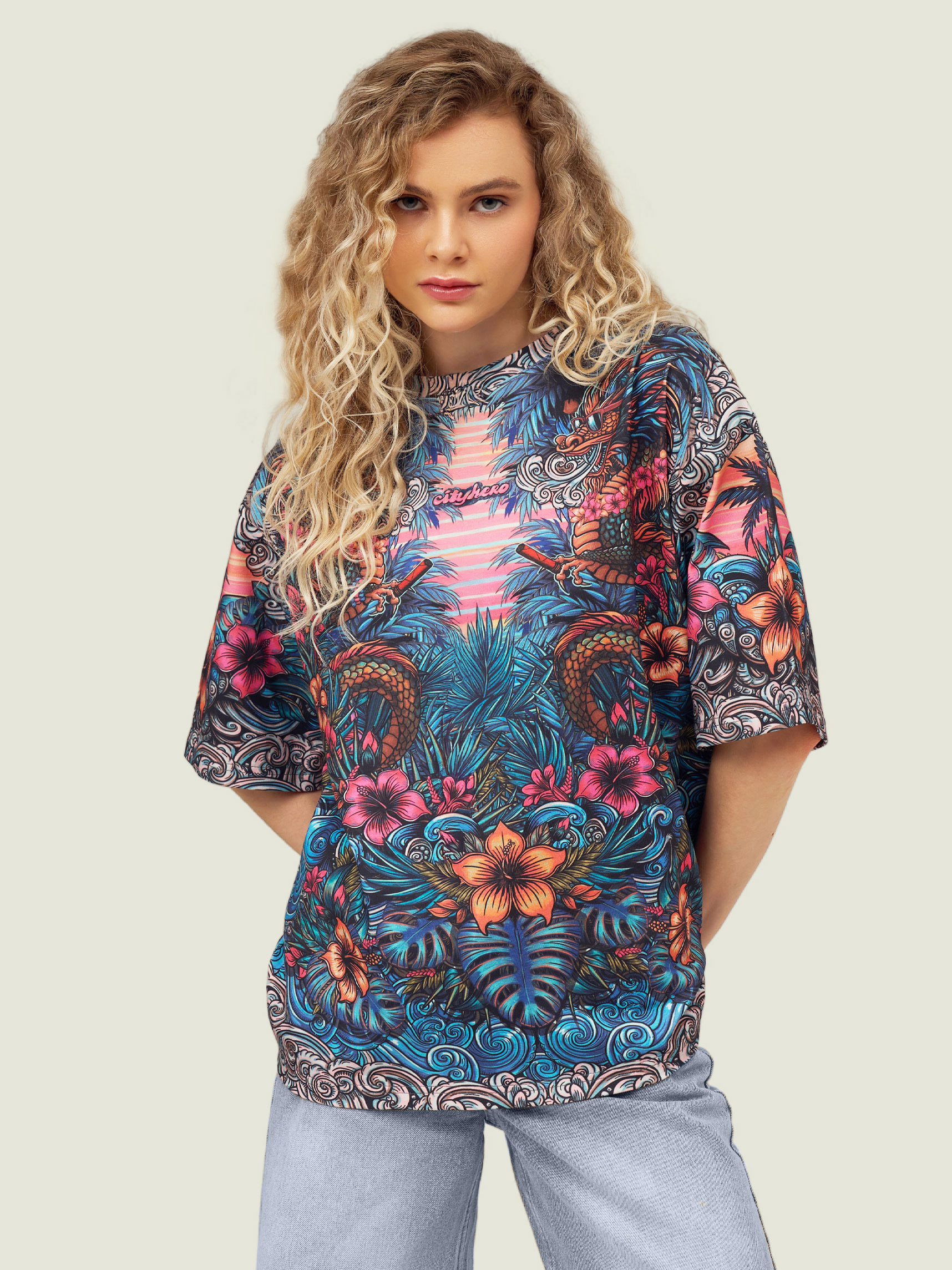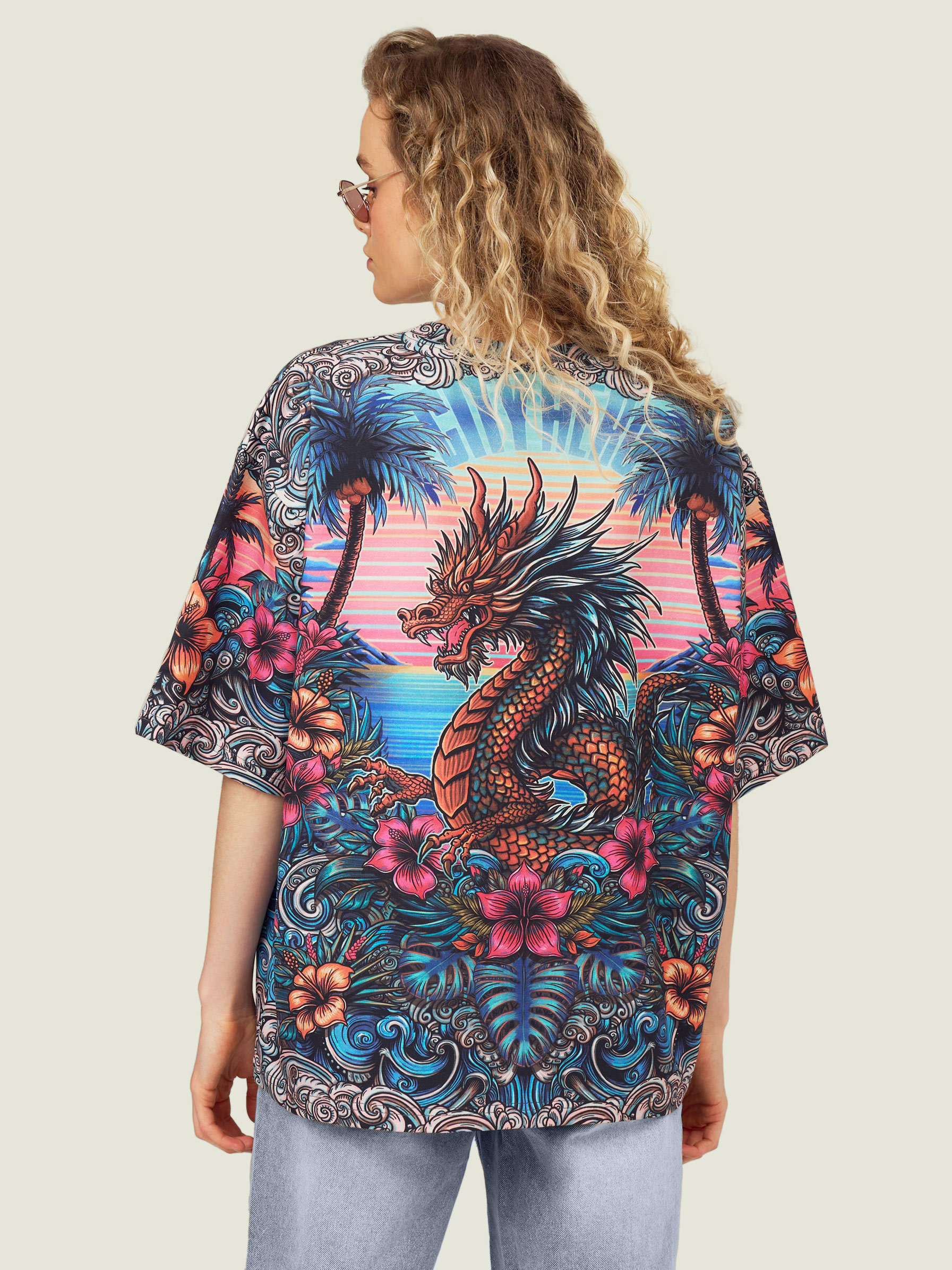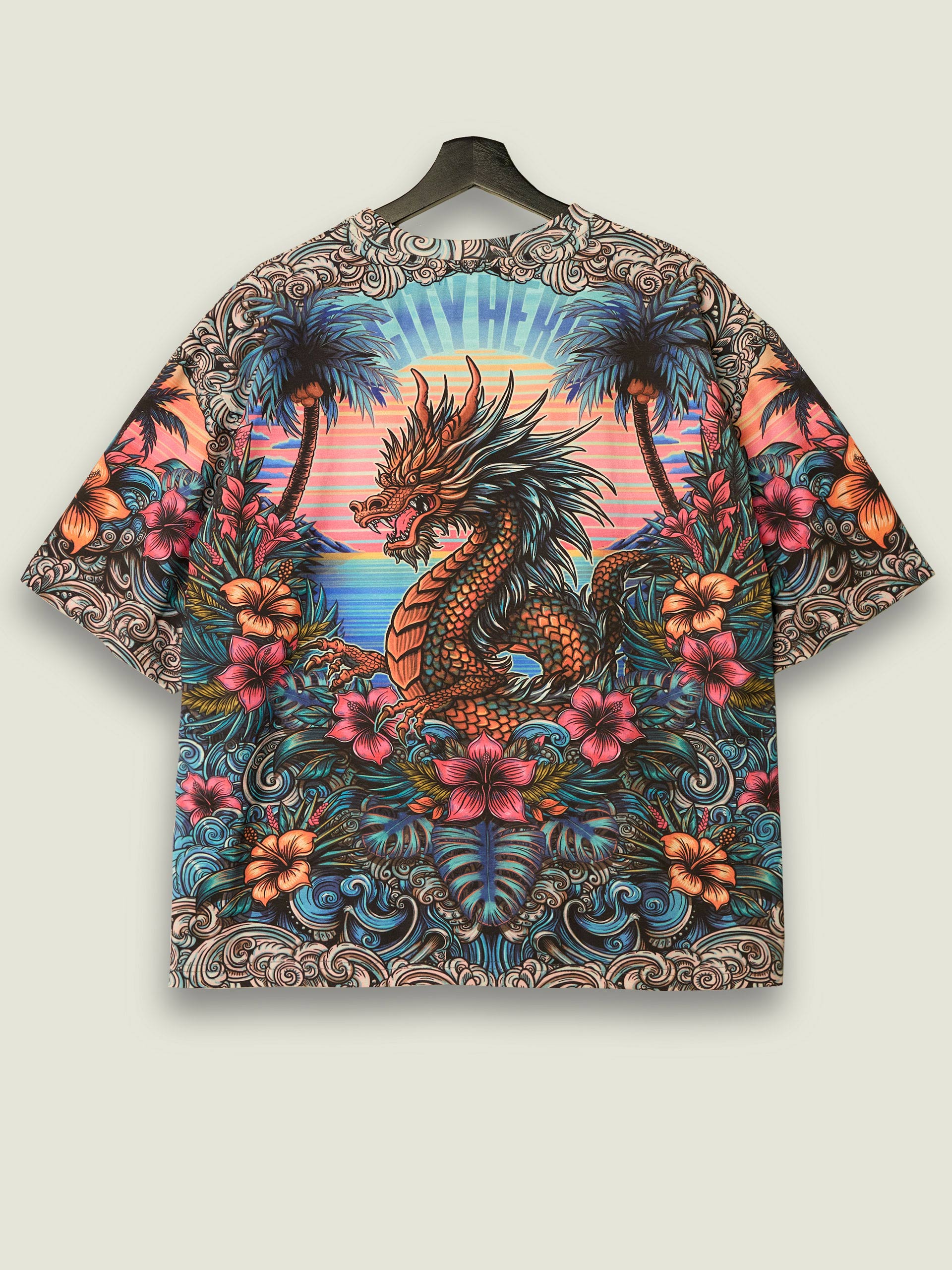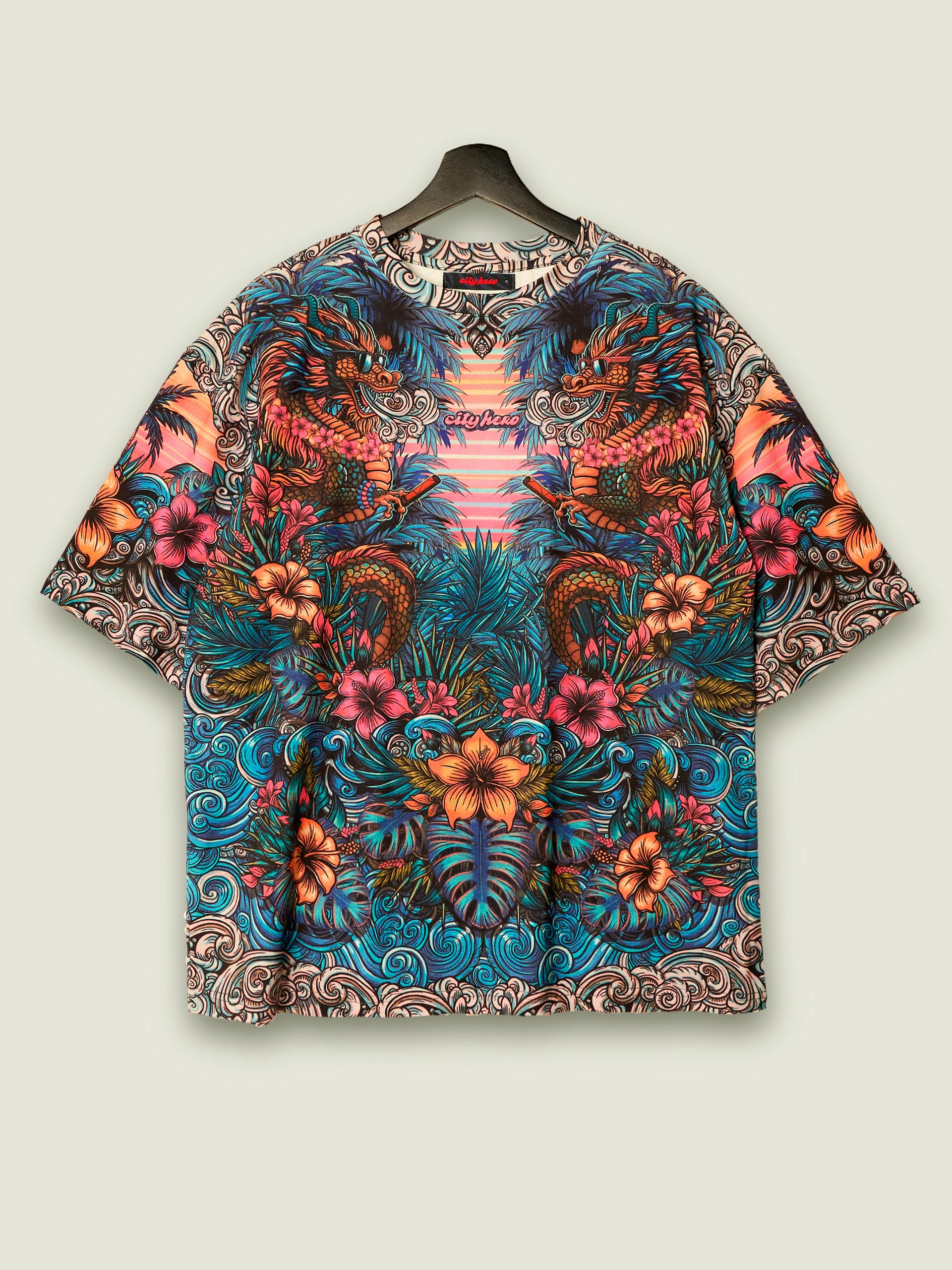 Когда хочется комфорта и яркости. Изящная графика, незабываемые оттенки, могучие и добрые драконы в окружении пальм и цветов. Футболка второго поколения в стиле интеллиджент оверсайз.