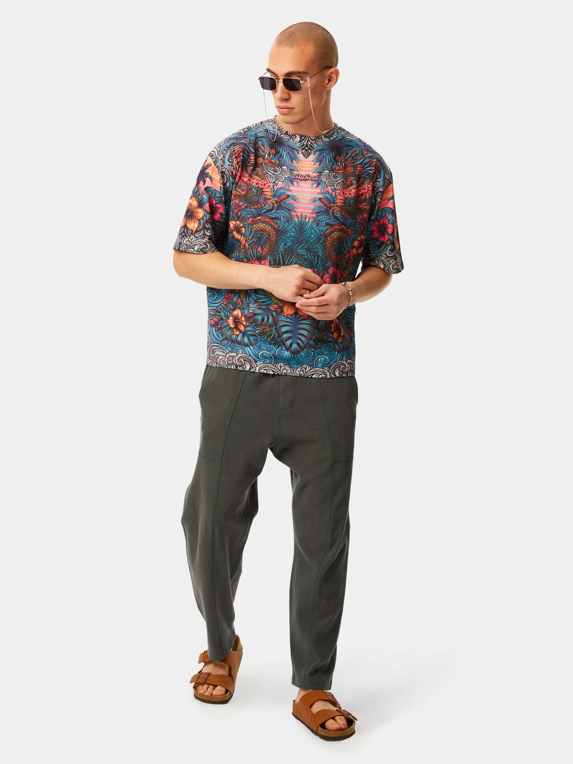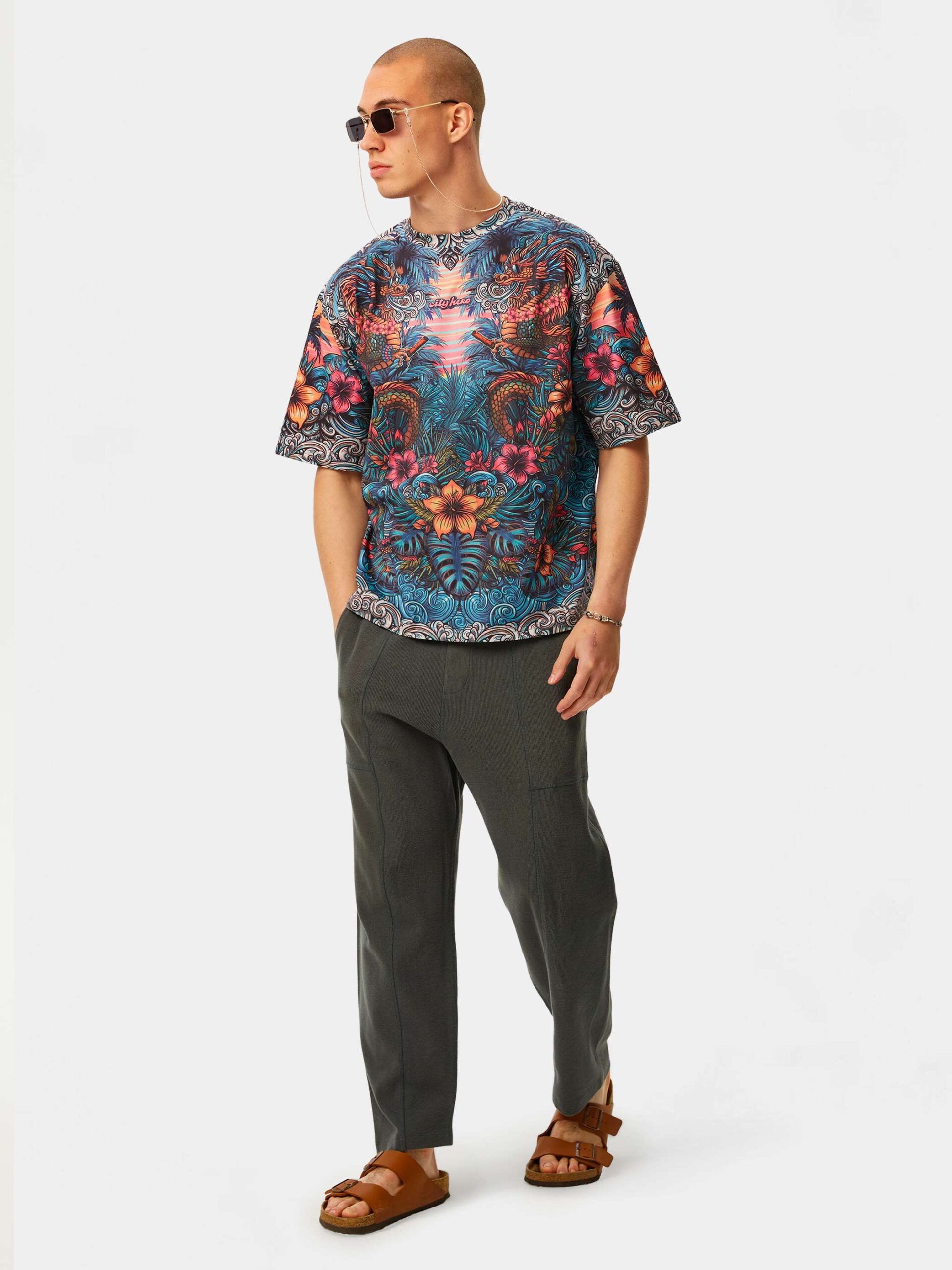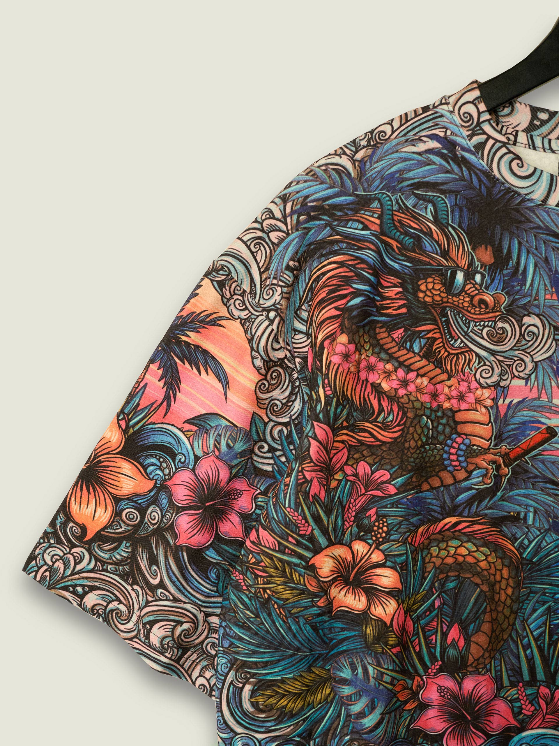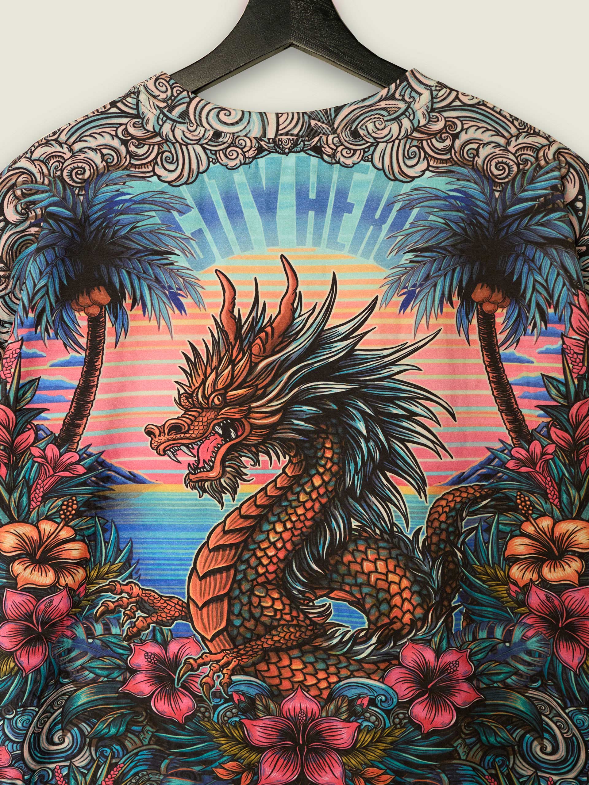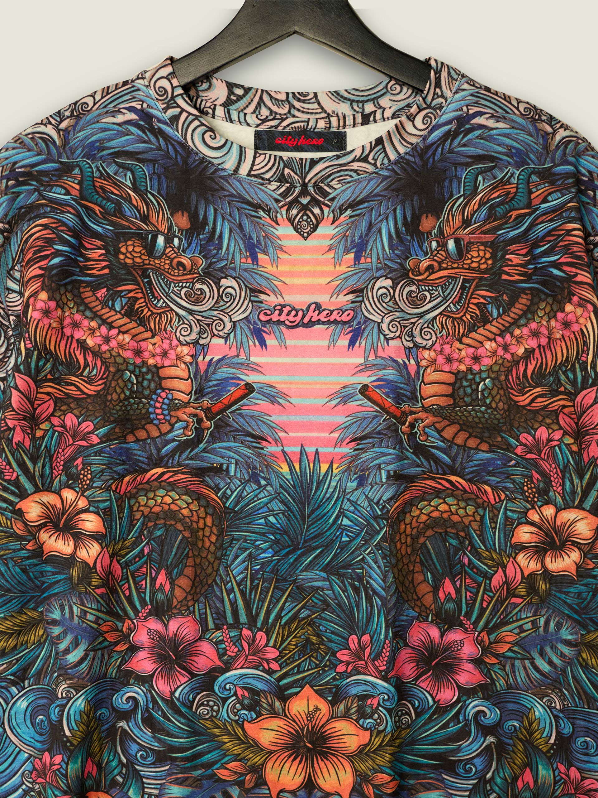 Когда хочется комфорта и яркости. Изящная графика, незабываемые оттенки, могучие и добрые драконы в окружении пальм и цветов. Футболка второго поколения в стиле интеллиджент оверсайз.