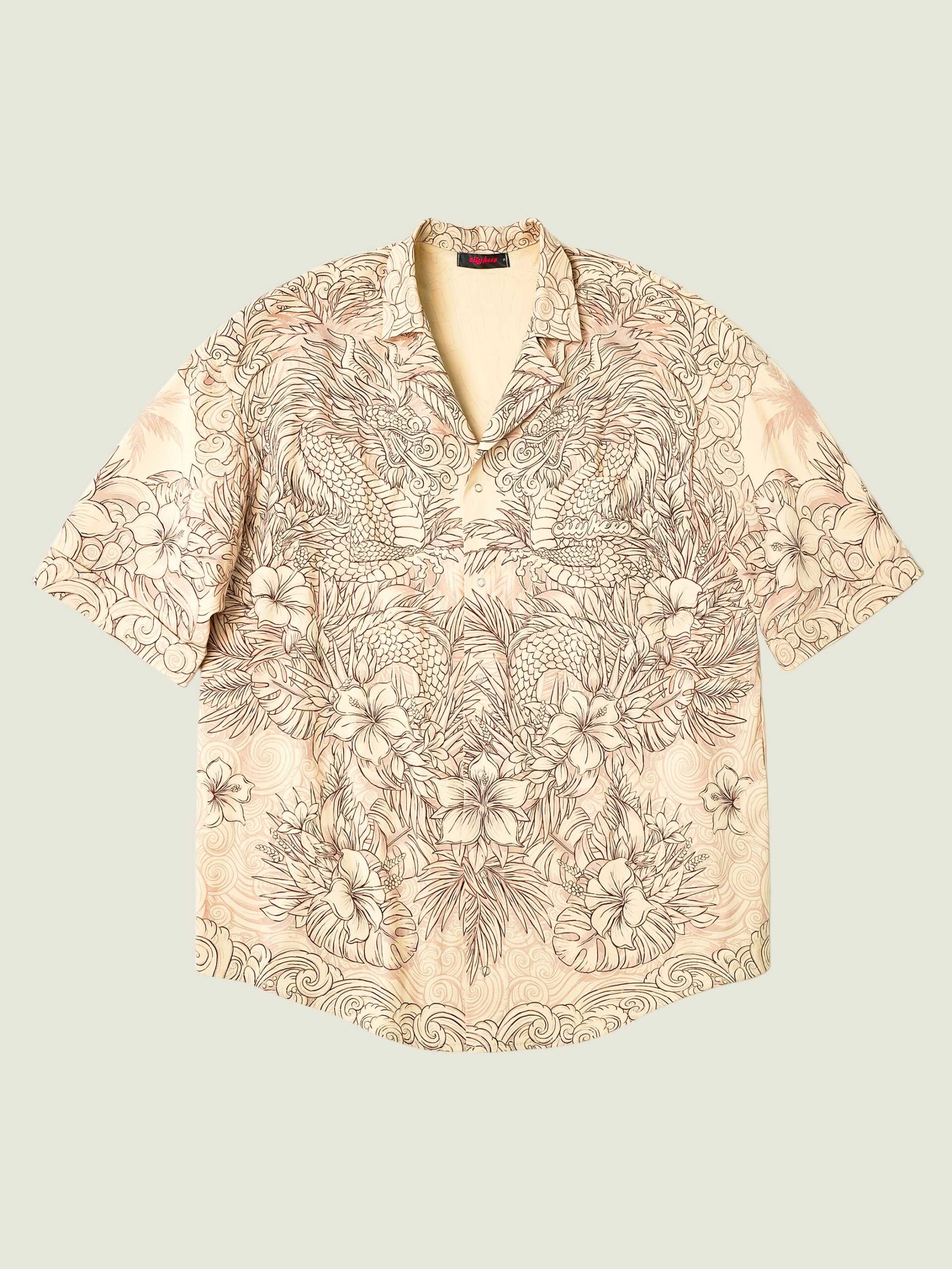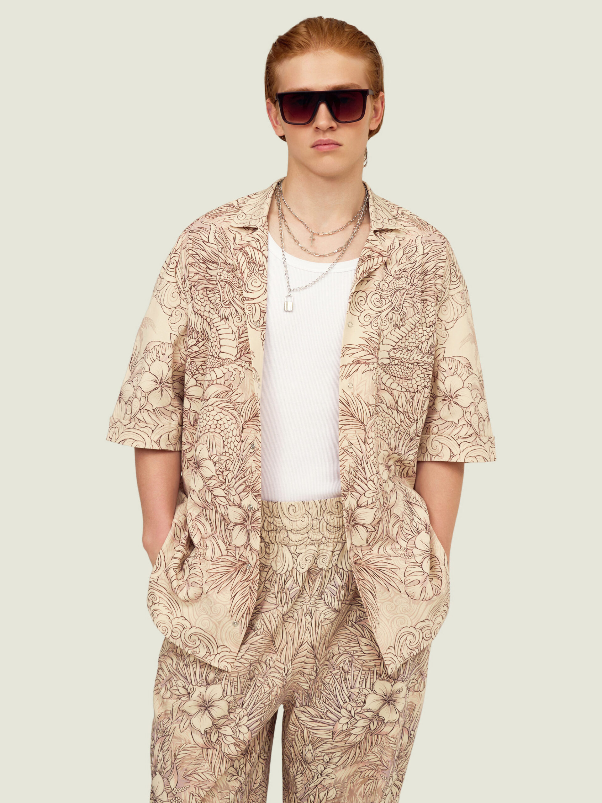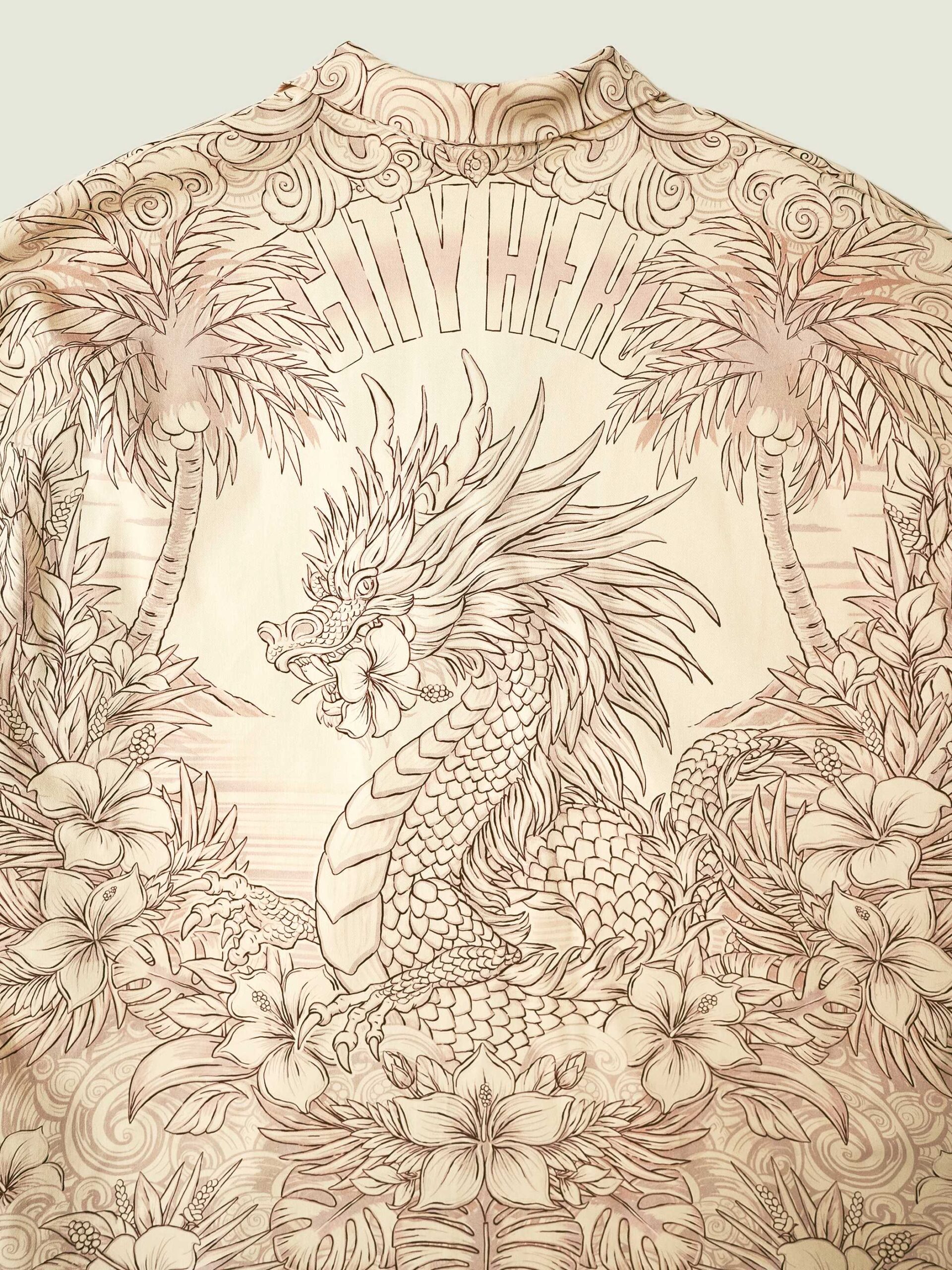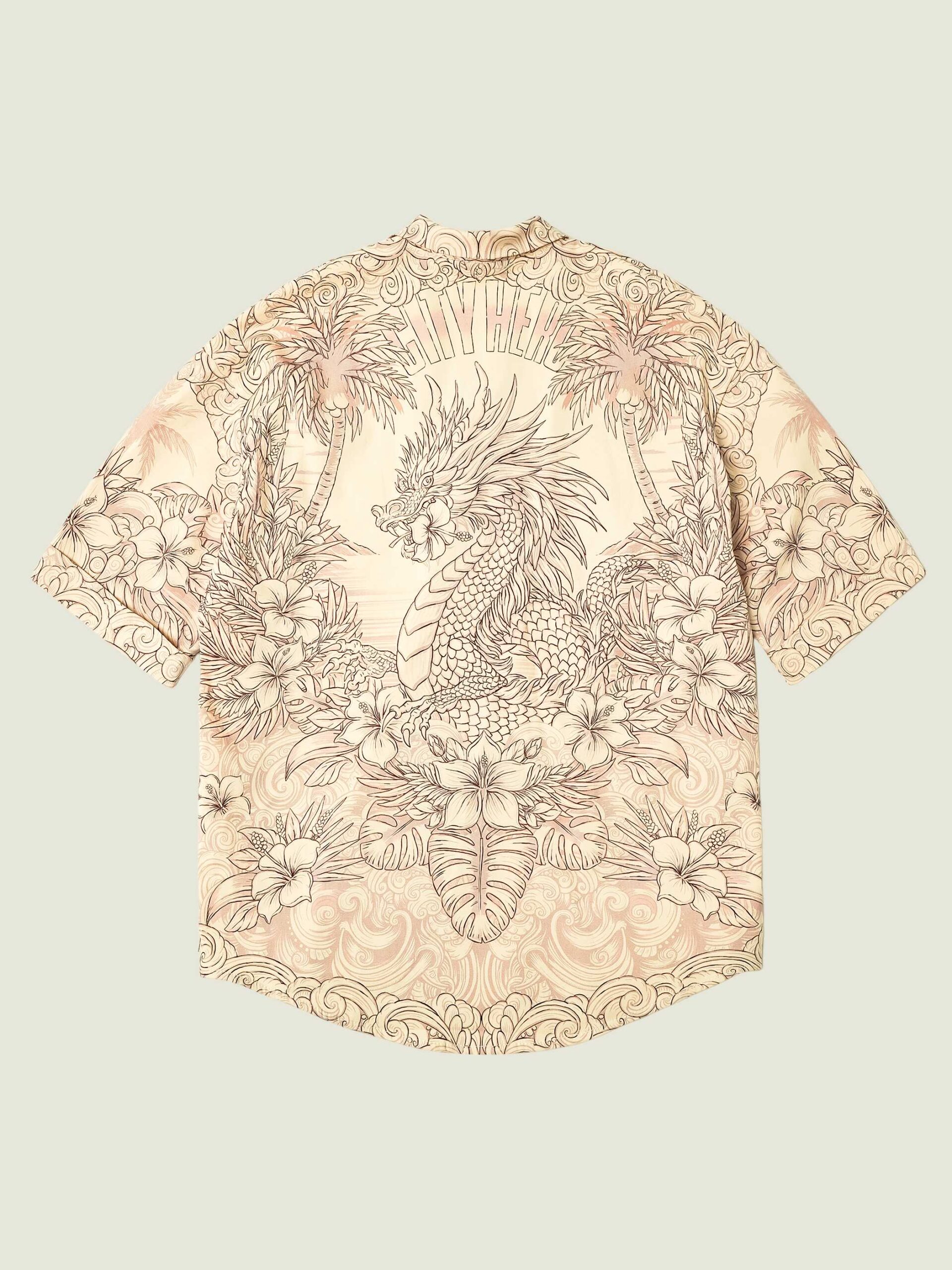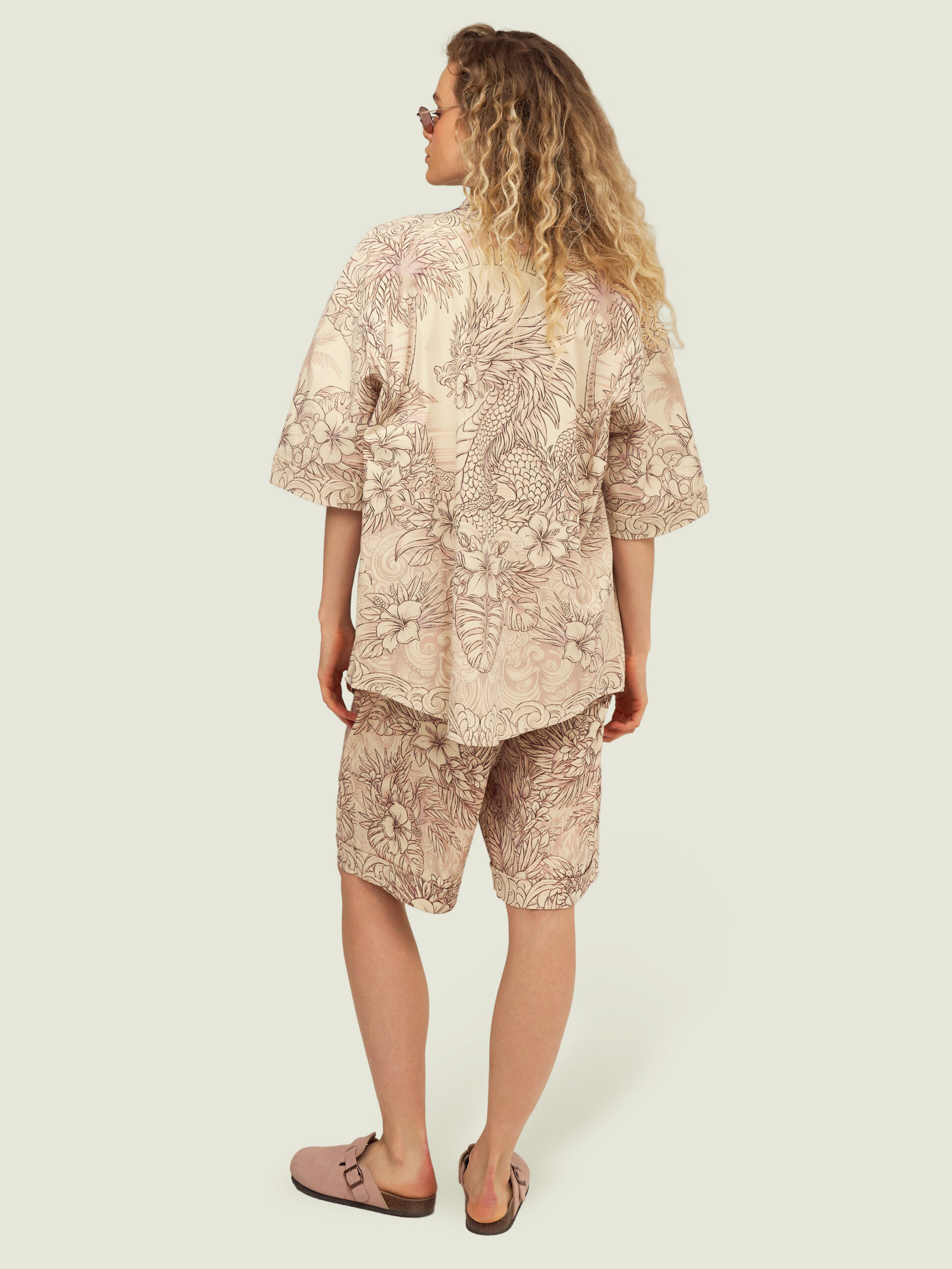 Когда хочется комфорта и нежности. Изящная графика, мягкие зефирные оттенки, могучие и добрые драконы в окружении пальм и цветов. Рубашка с короткими рукавами в стиле оверсайз.
