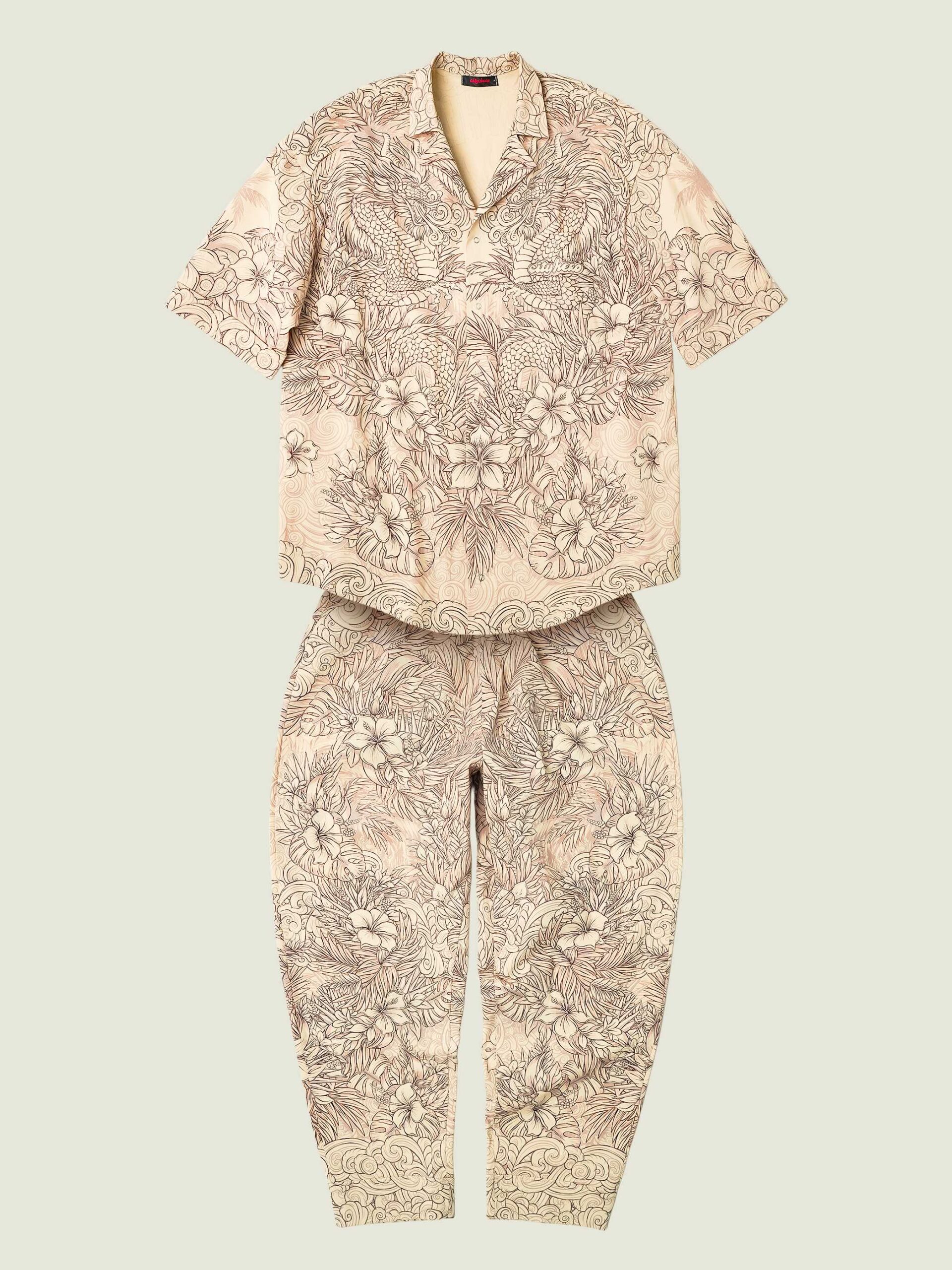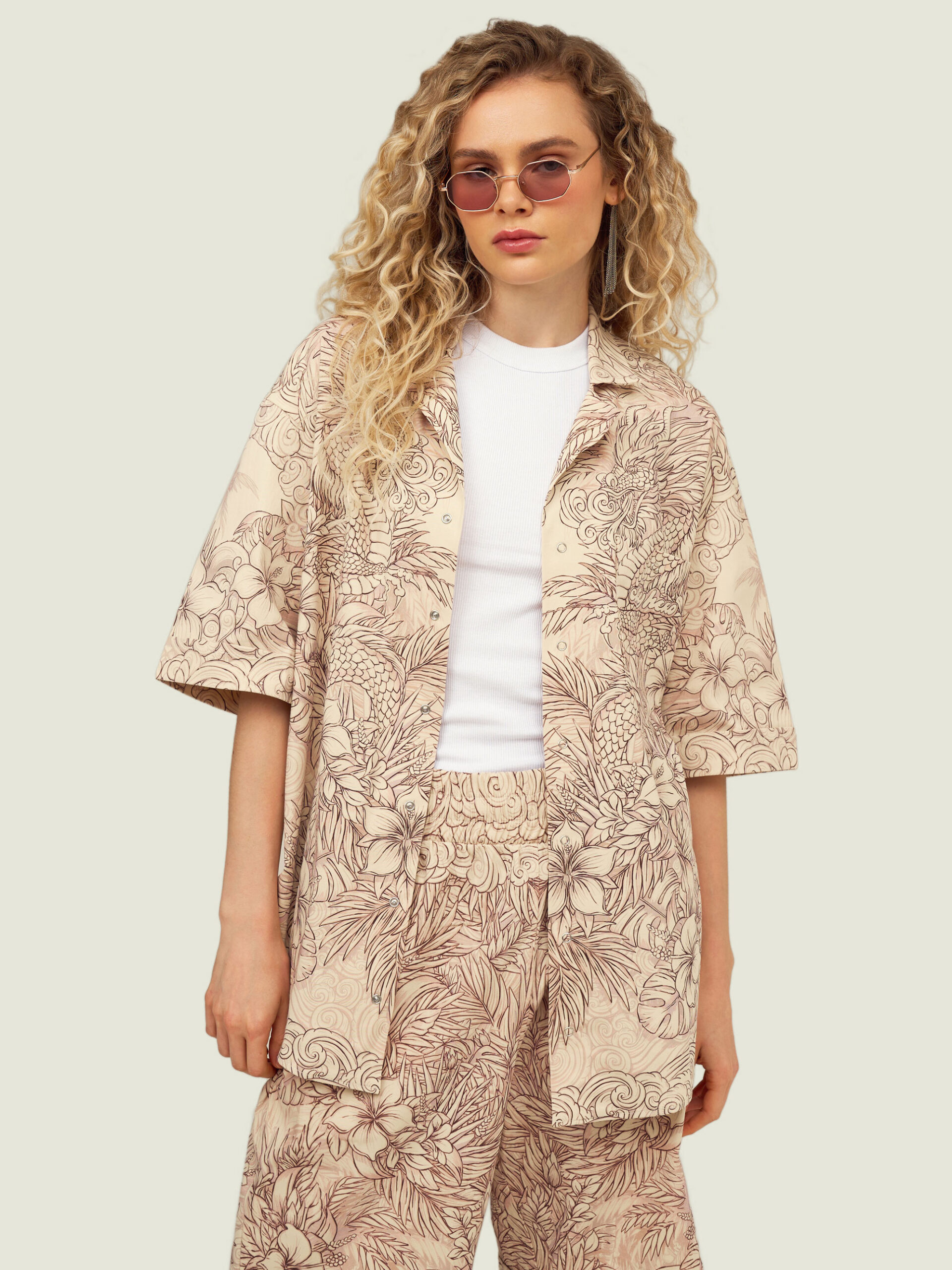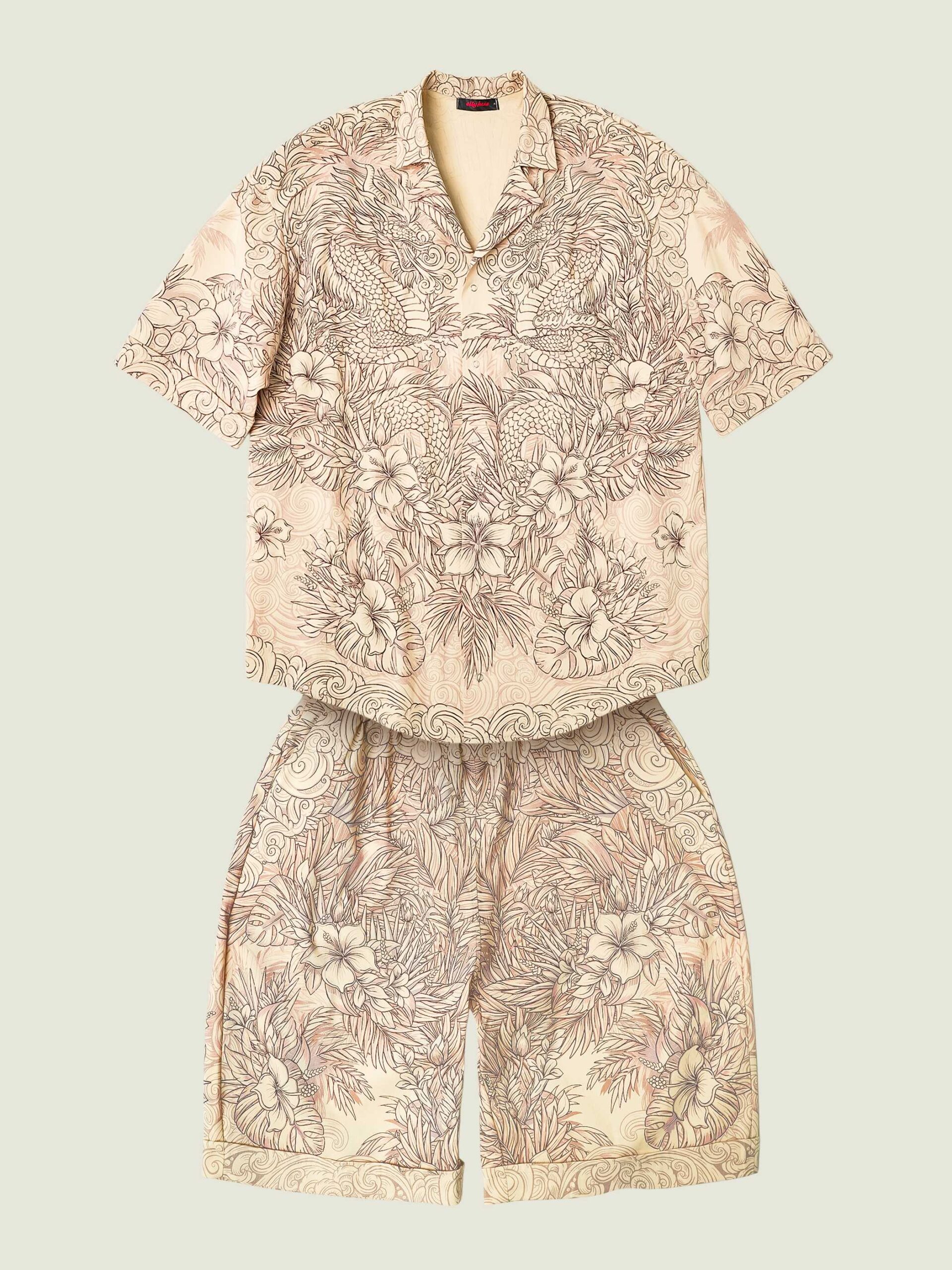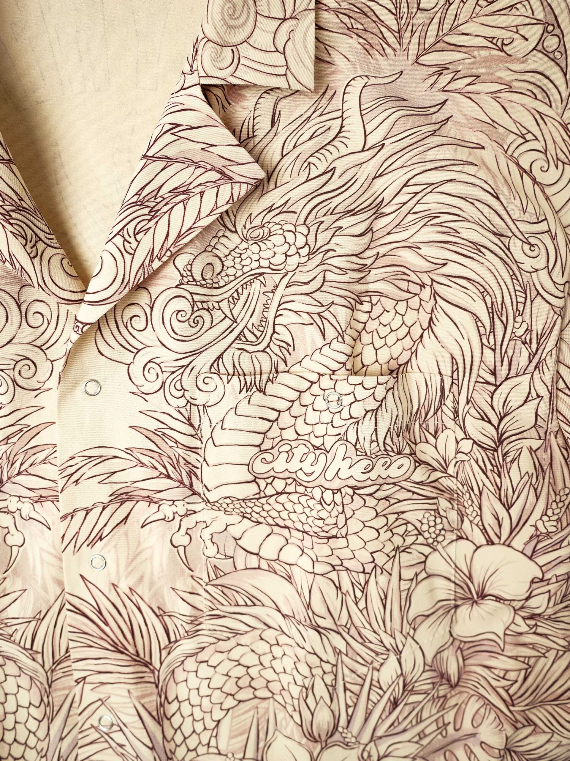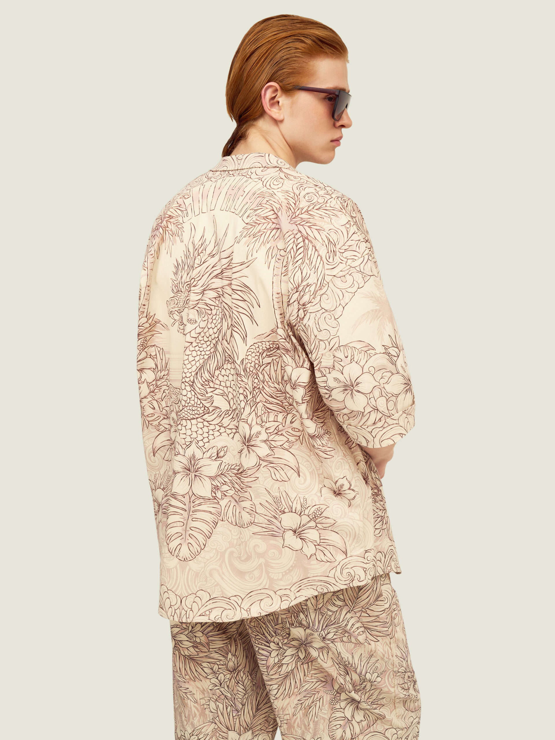 Когда хочется комфорта и нежности. Изящная графика, мягкие зефирные оттенки, могучие и добрые драконы в окружении пальм и цветов. Рубашка с короткими рукавами в стиле оверсайз.