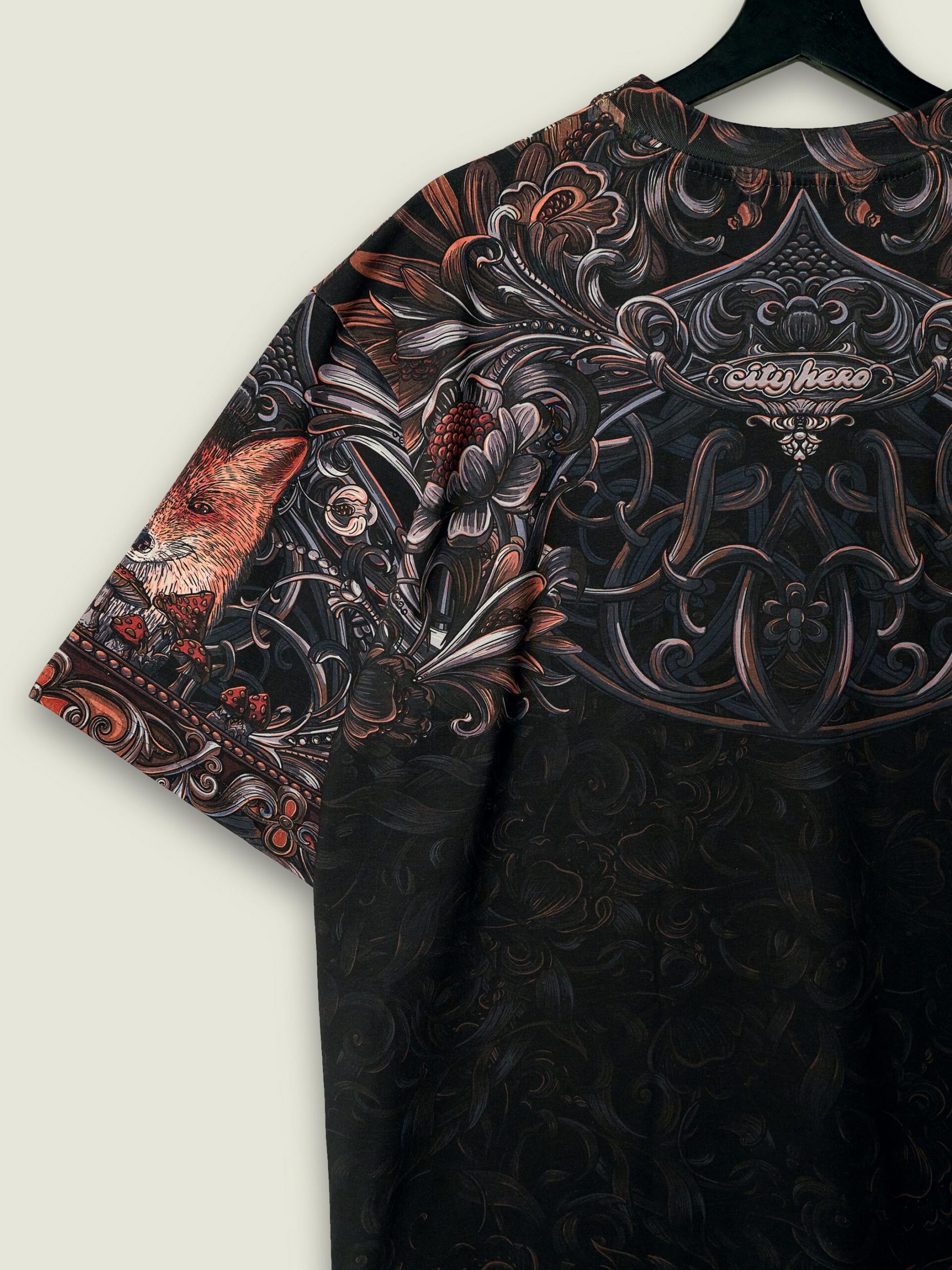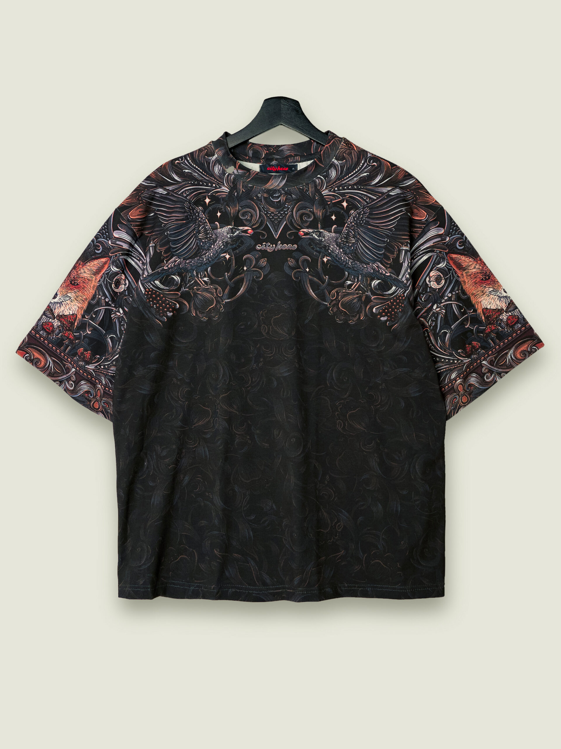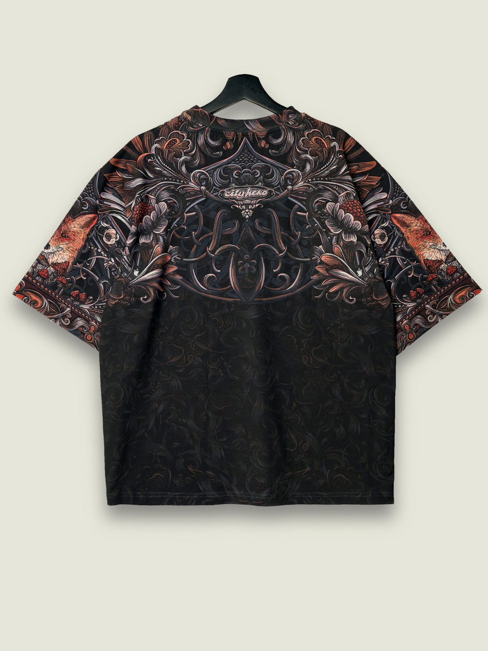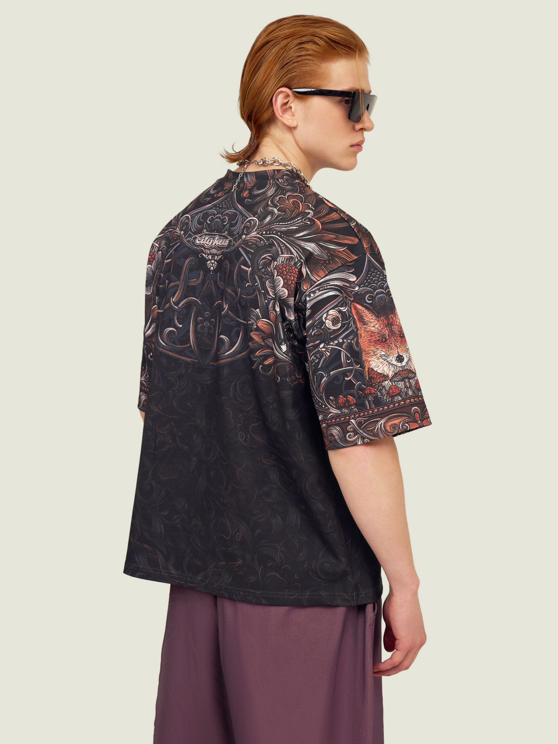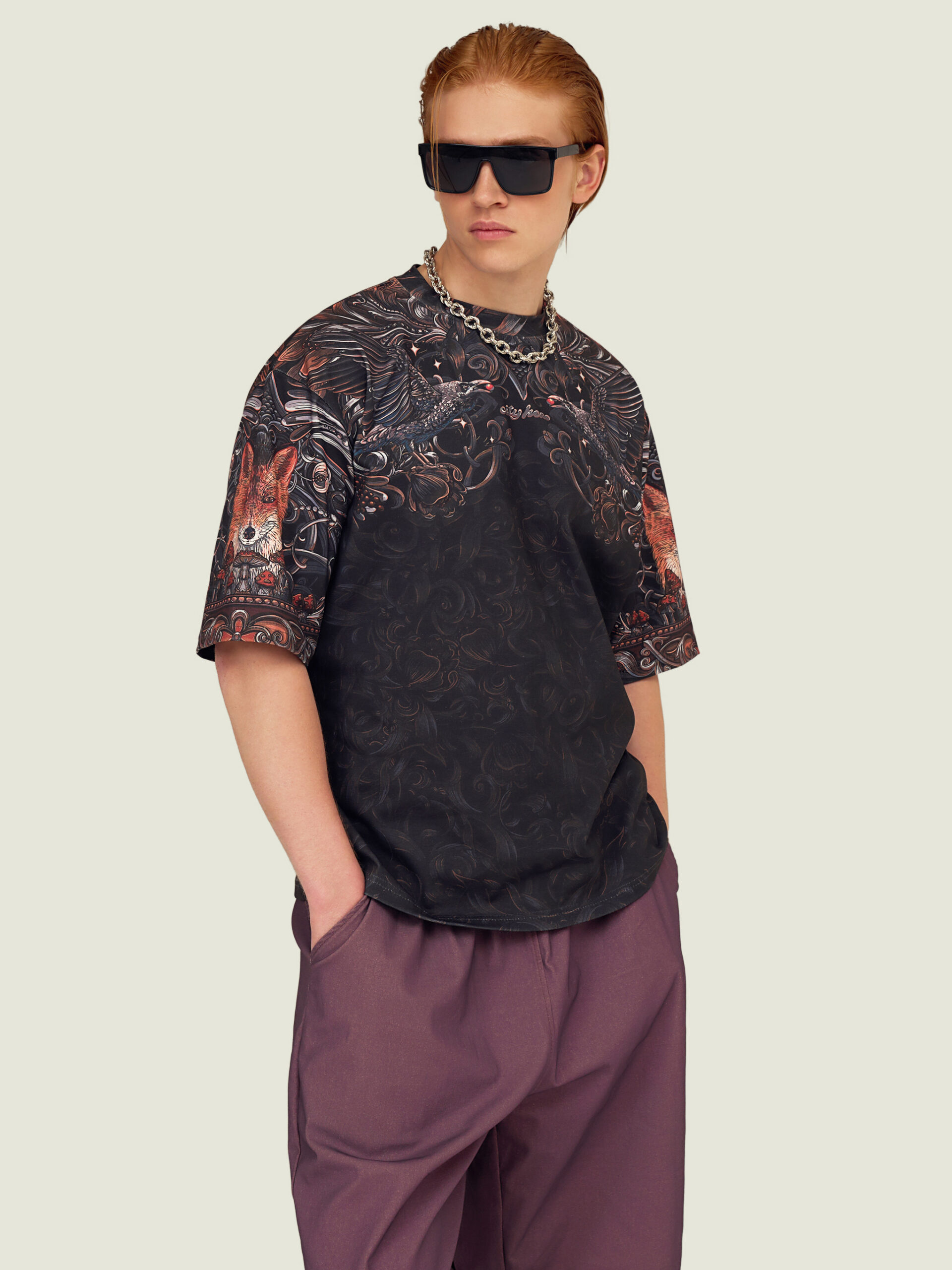 Атмосферный дизайн в черных, серых и золотистых тонах, вдохновленный лесом из русских сказок и его пушистыми обитателями. Футболка второго поколения в стиле интеллиджент оверсайз.