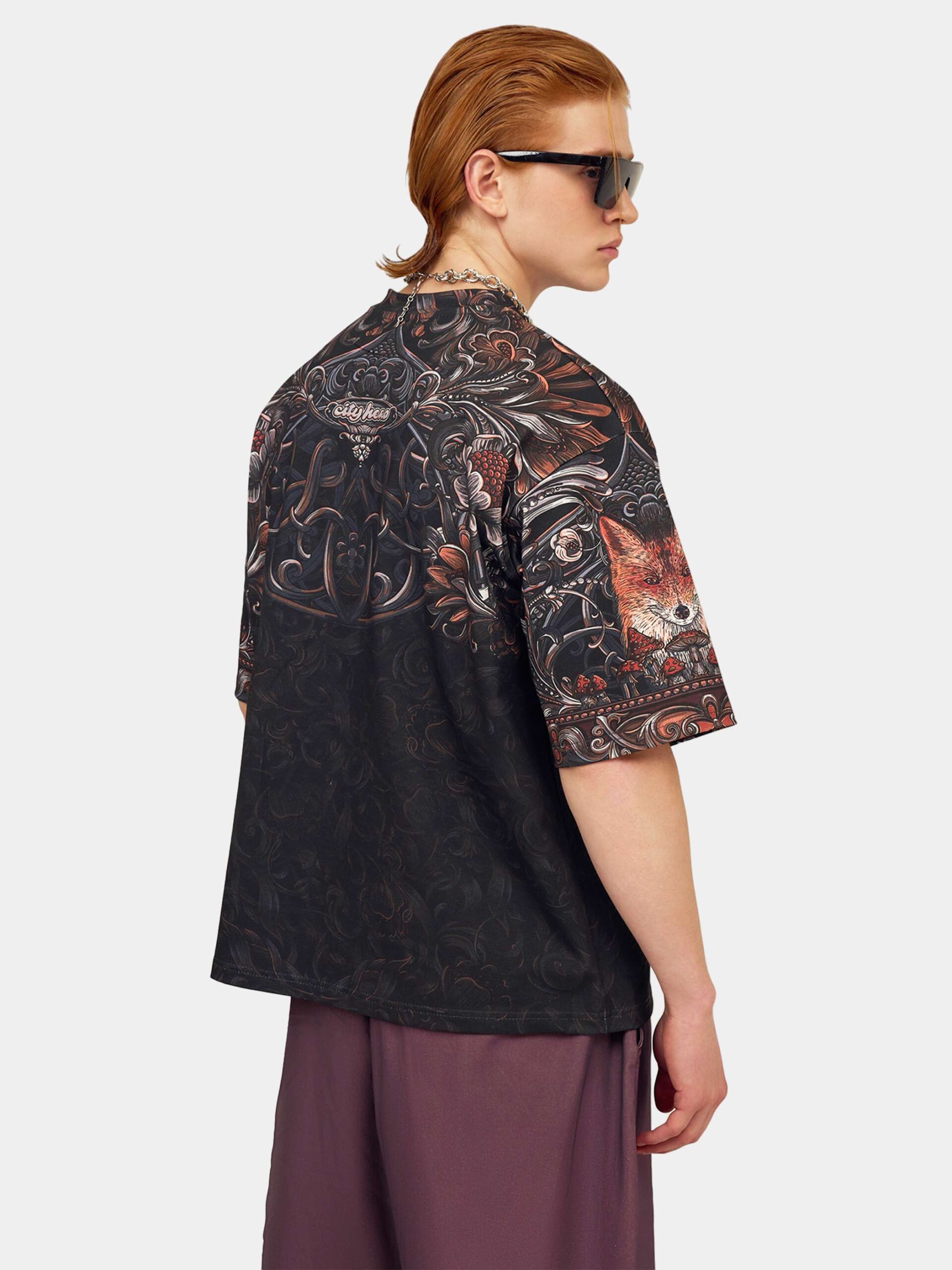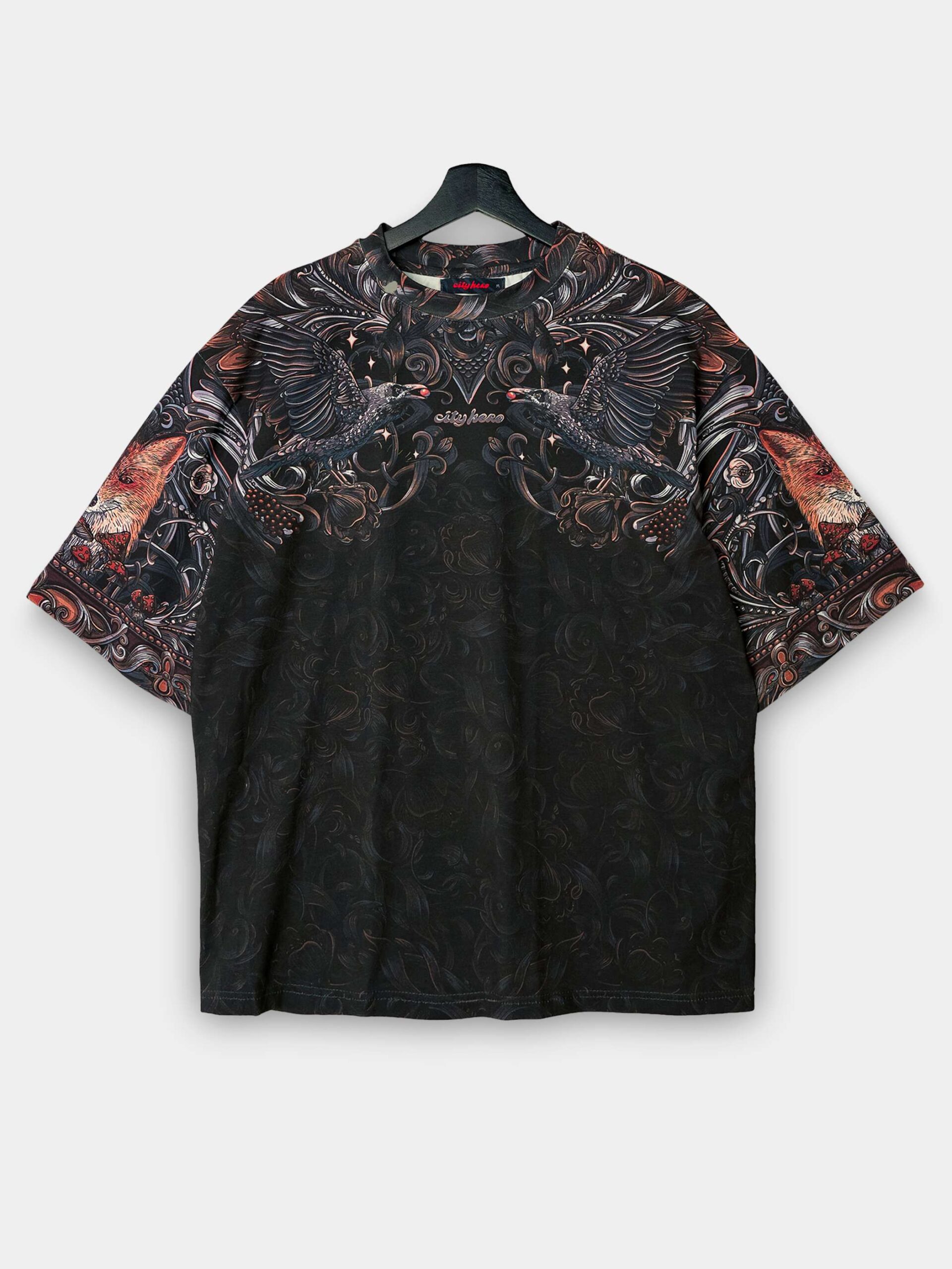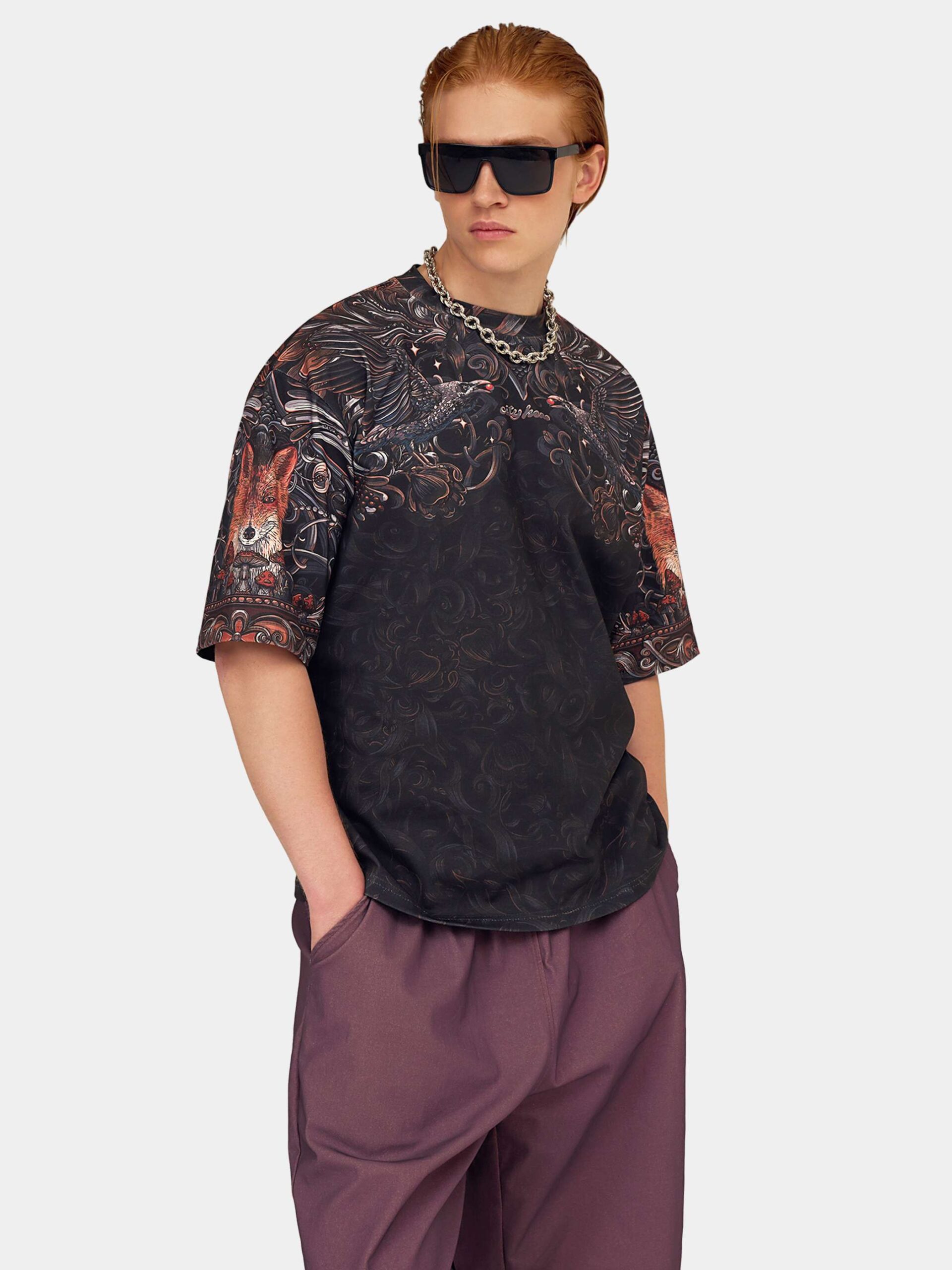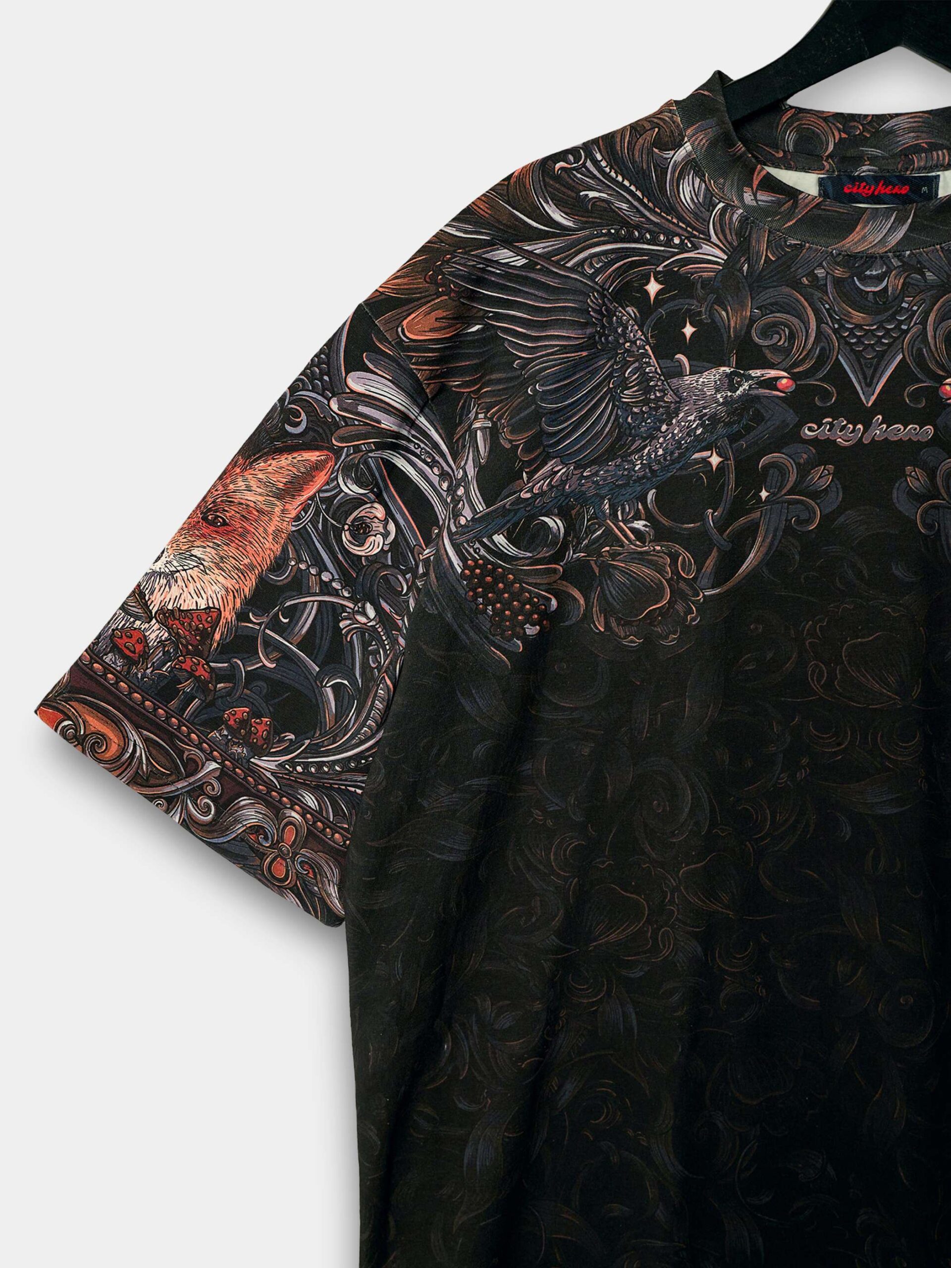 Атмосферный дизайн в черных, серых и золотистых тонах, вдохновленный лесом из русских сказок и его пушистыми обитателями. Футболка второго поколения в стиле интеллиджент оверсайз.