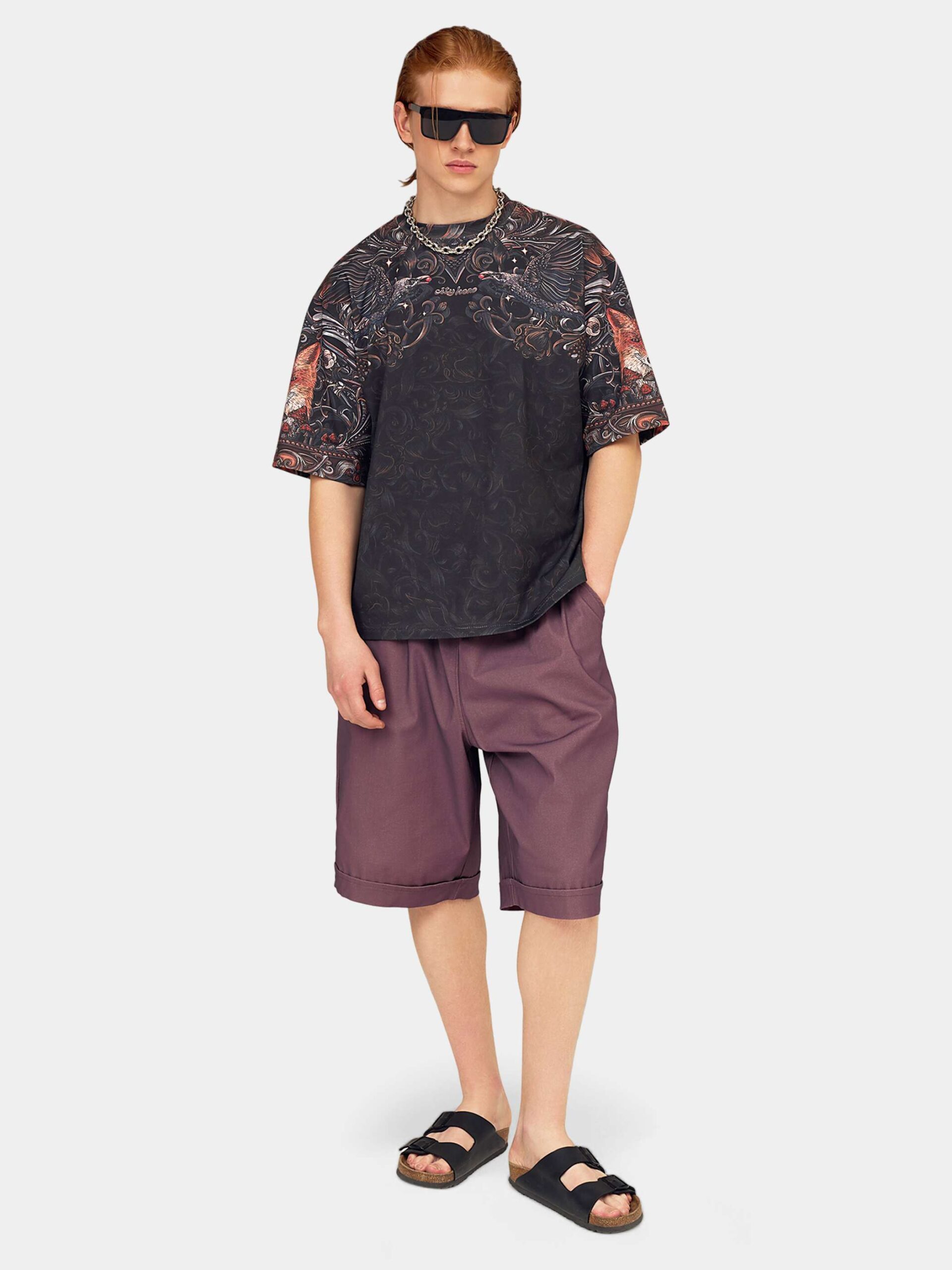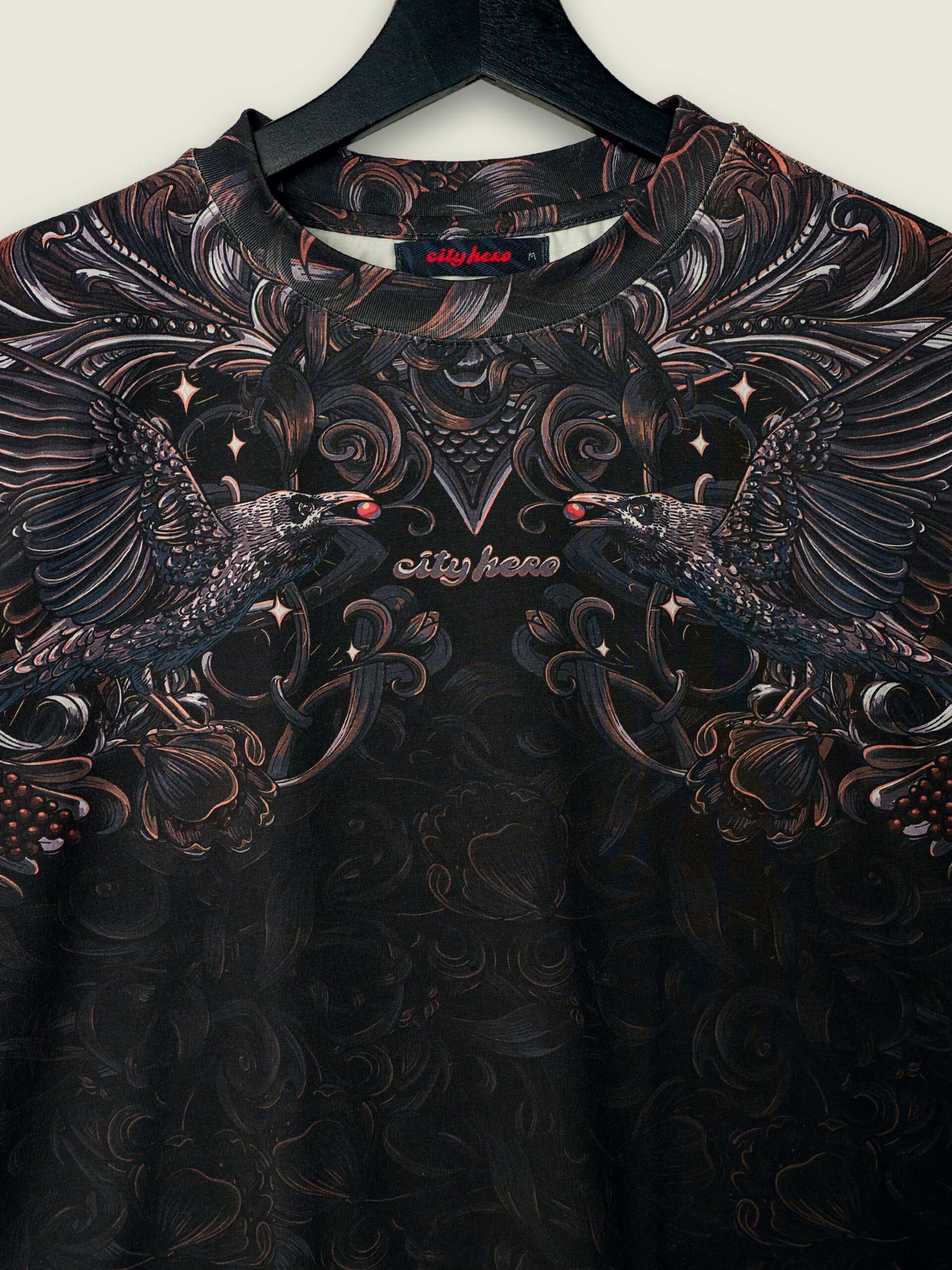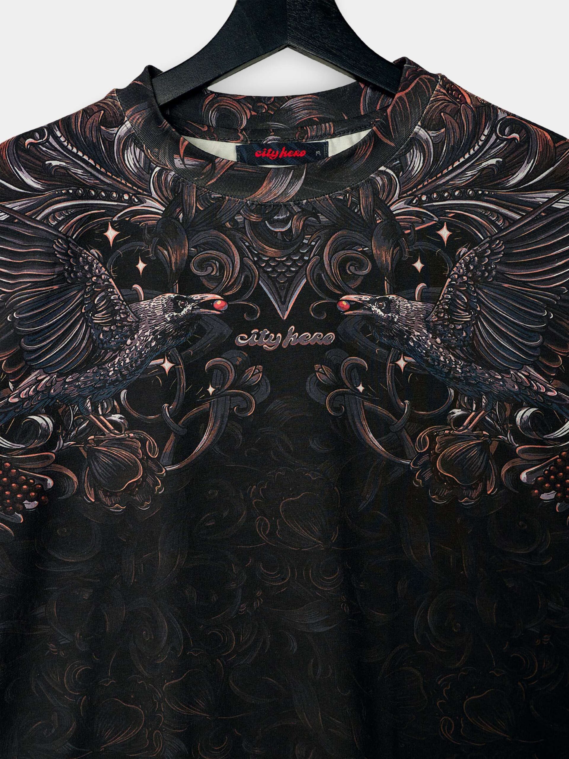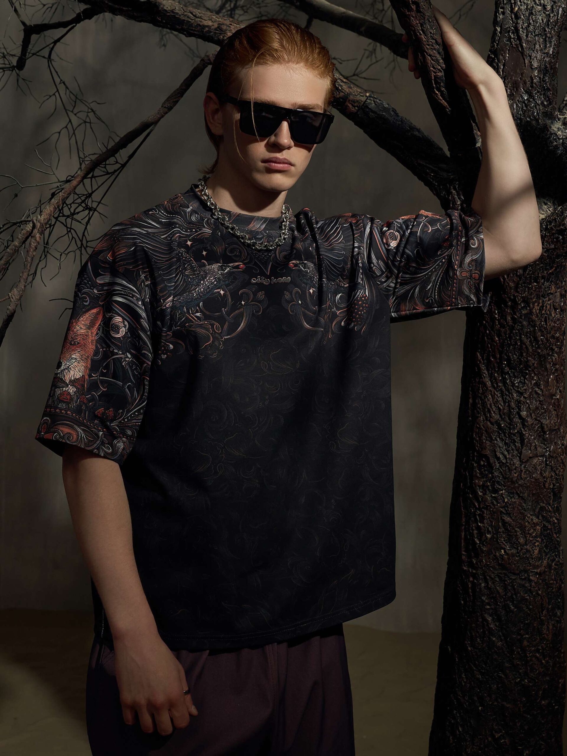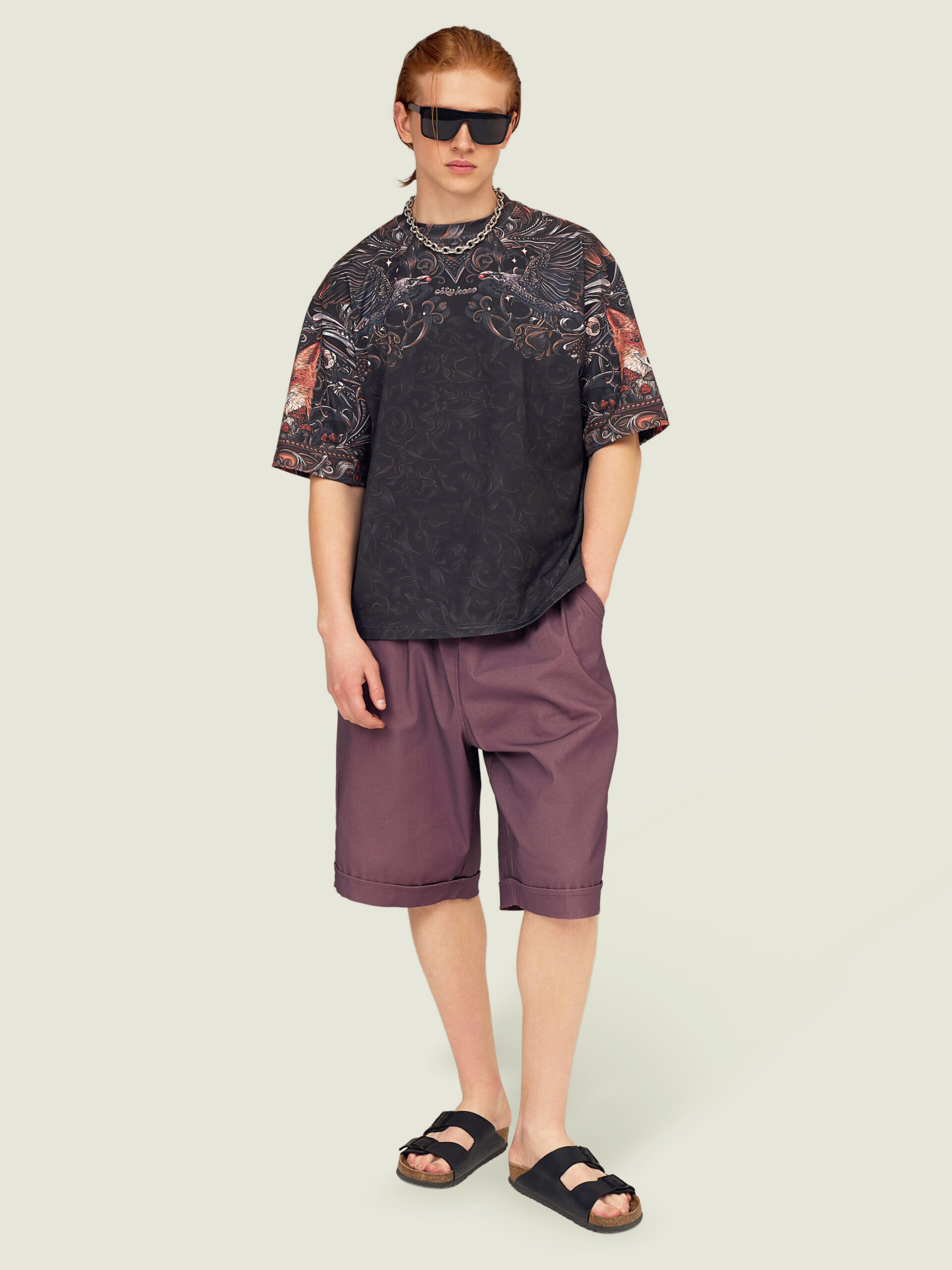 Атмосферный дизайн в черных, серых и золотистых тонах, вдохновленный лесом из русских сказок и его пушистыми обитателями. Футболка второго поколения в стиле интеллиджент оверсайз.