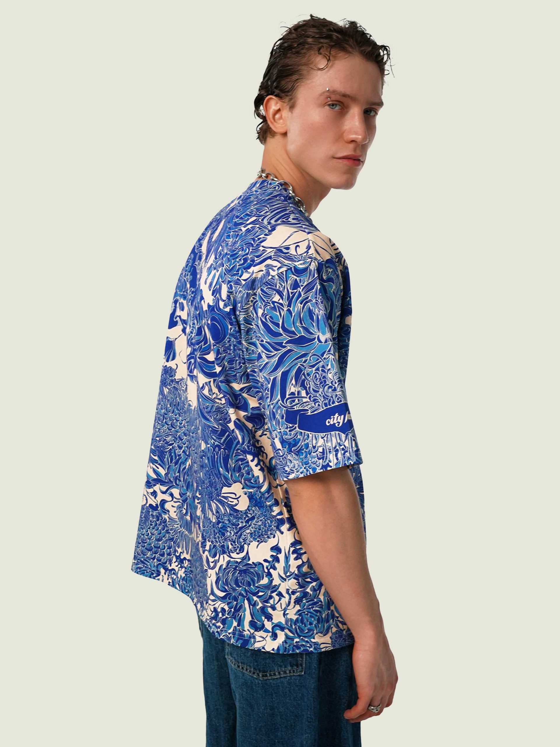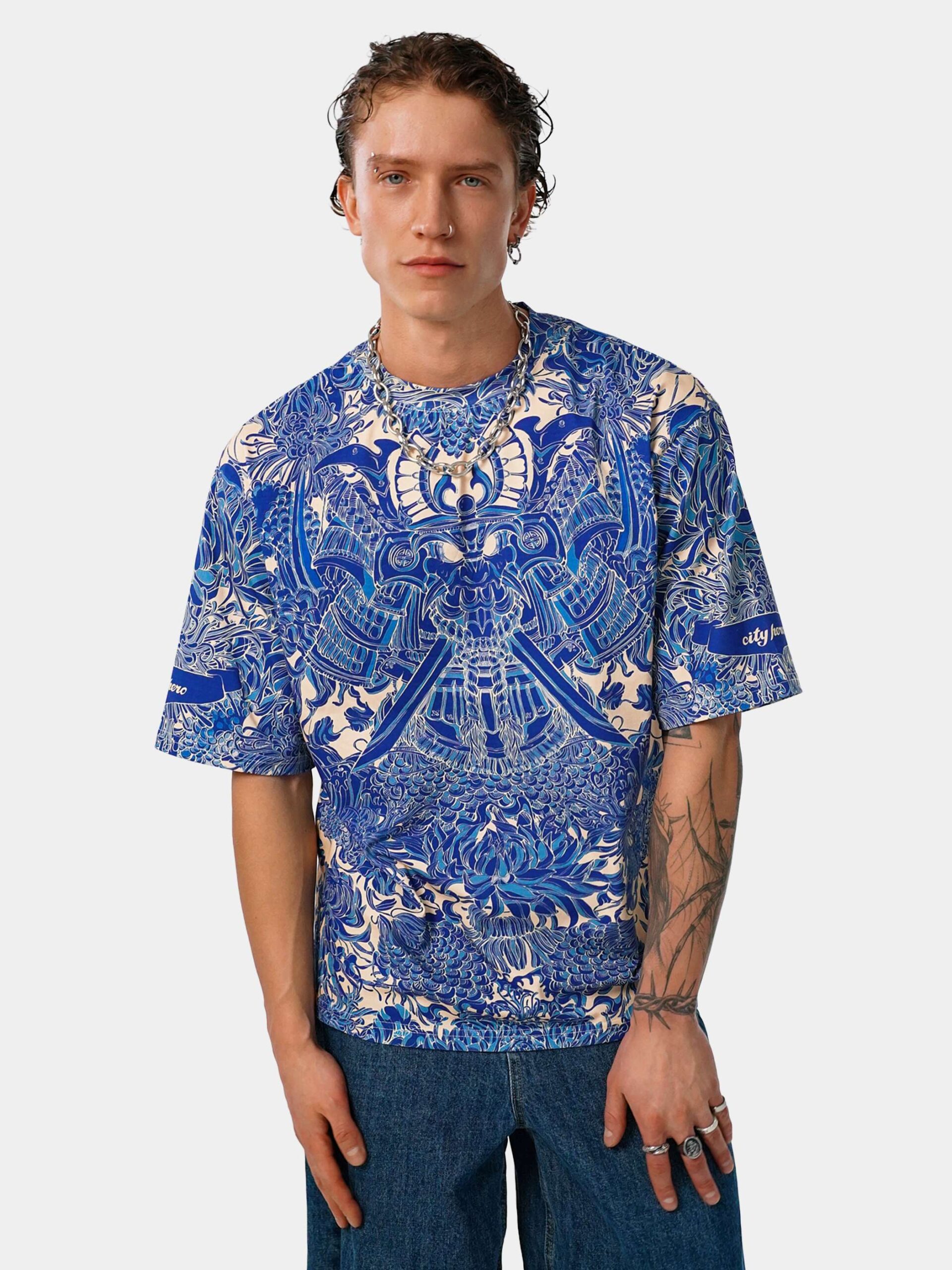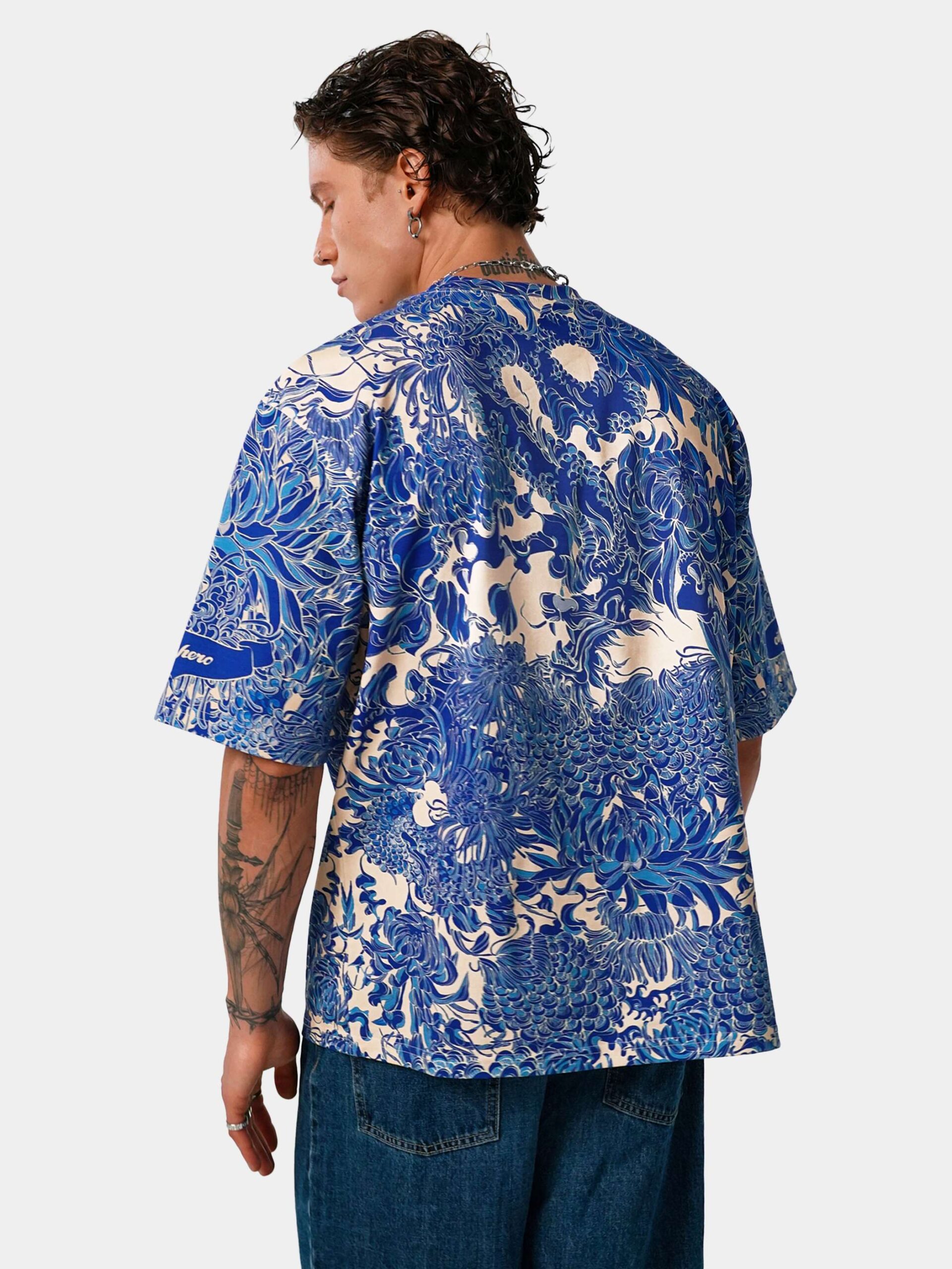 Футболка второго поколения в стиле интеллиджент оверсайз в сочных синих тонах с высоко детализированным принтом в виде маски самурая мэнгу, дракона и разнообразных цветов.