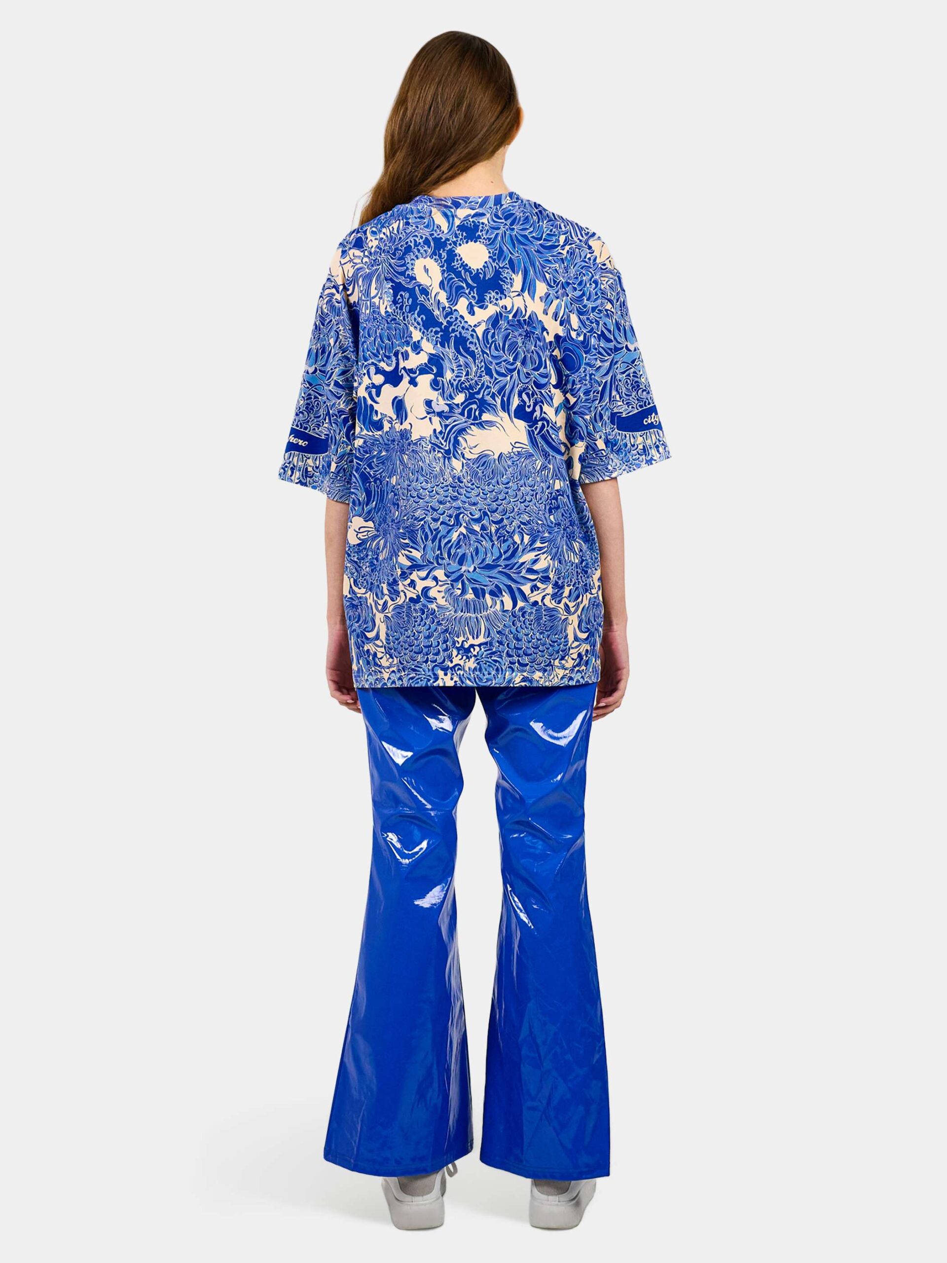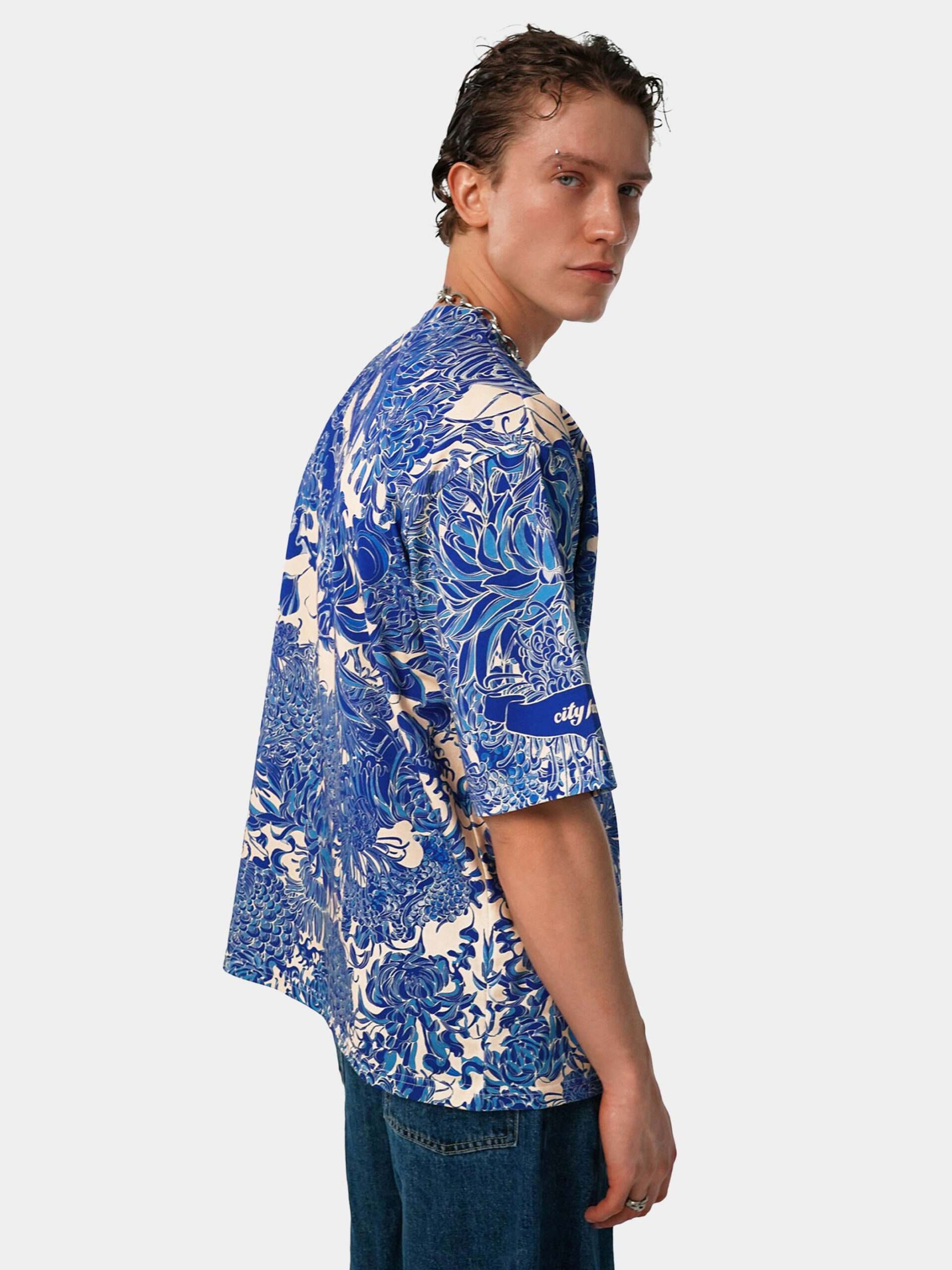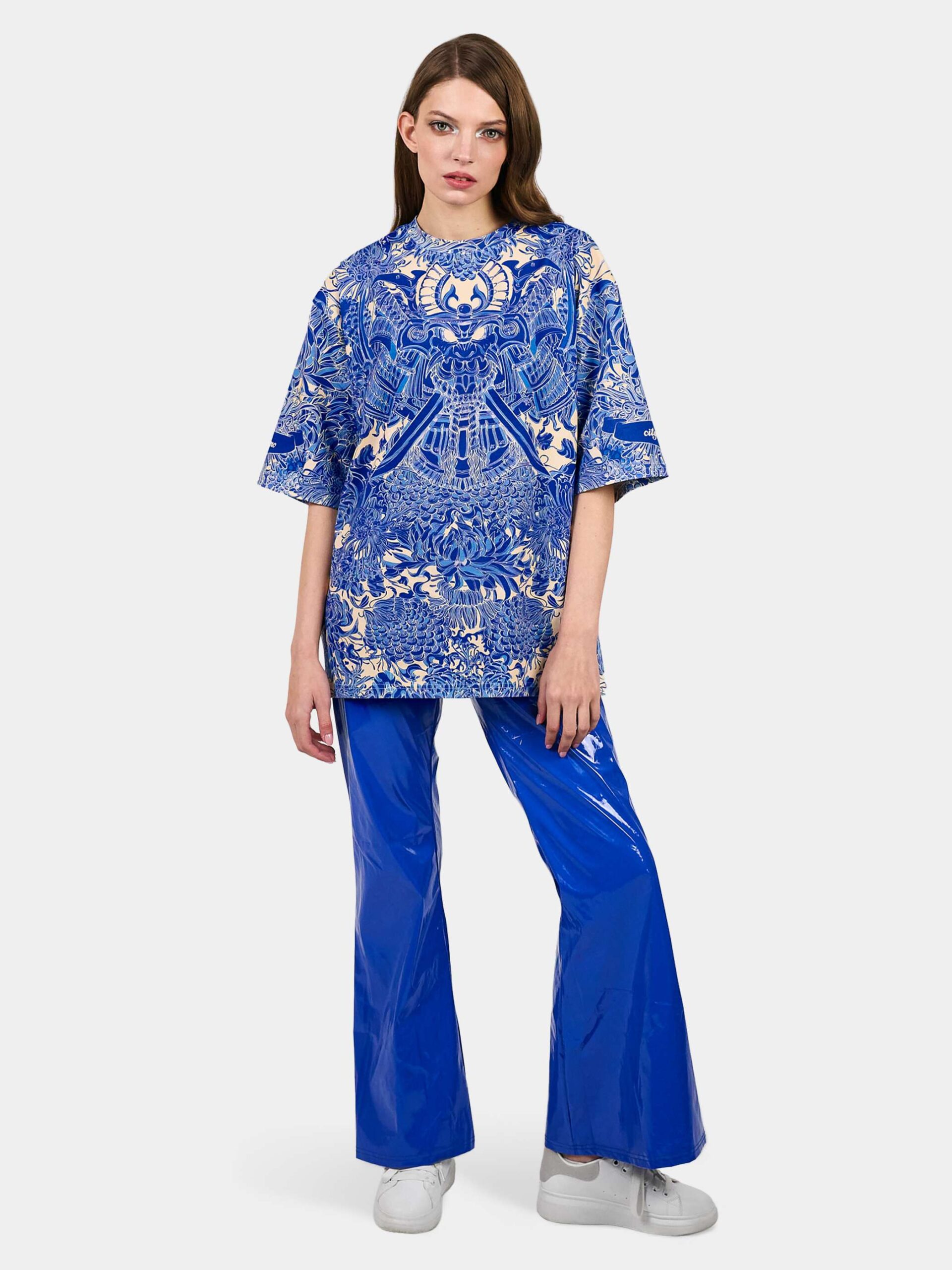 Футболка второго поколения в стиле интеллиджент оверсайз в сочных синих тонах с высоко детализированным принтом в виде маски самурая мэнгу, дракона и разнообразных цветов.