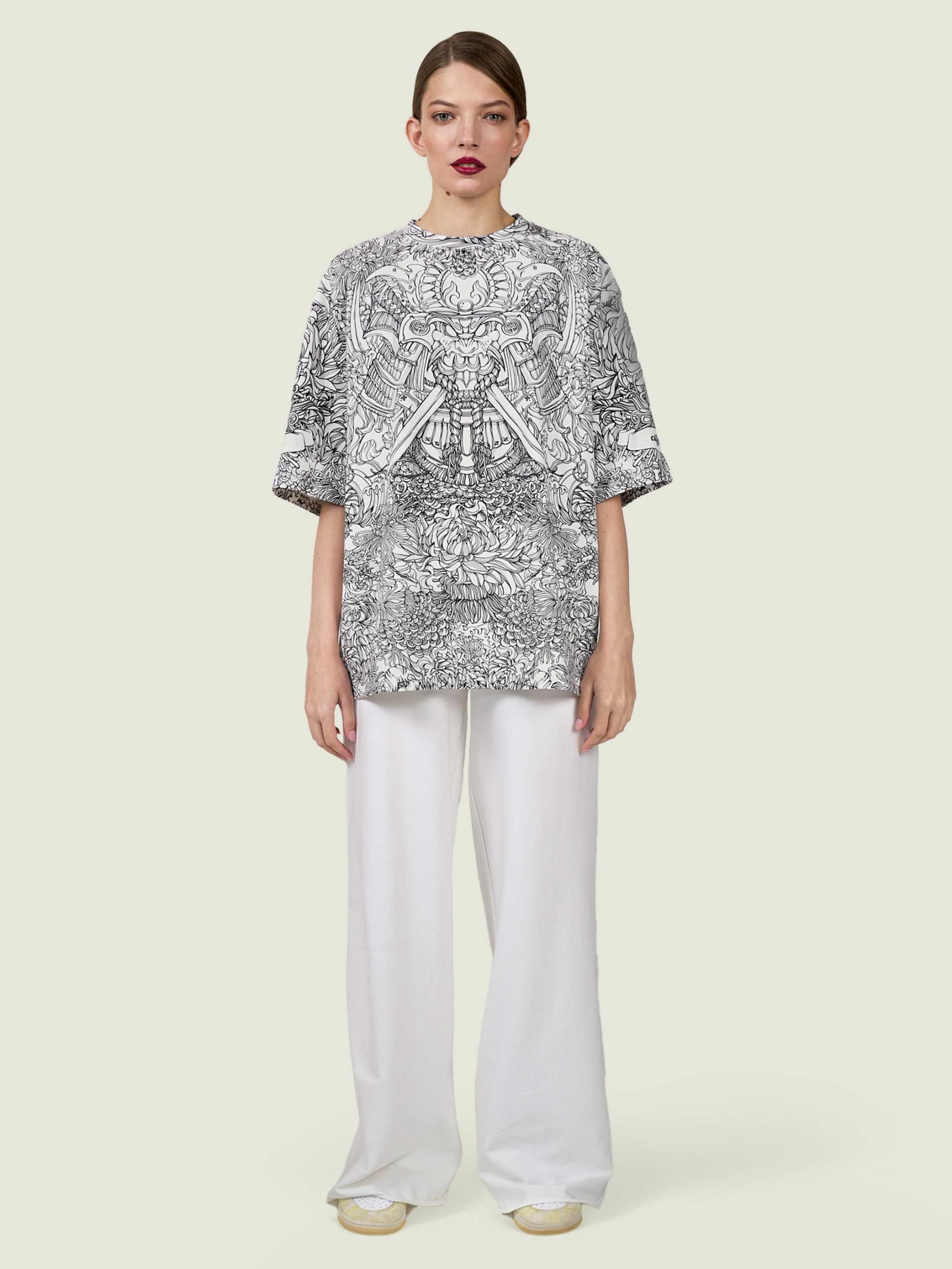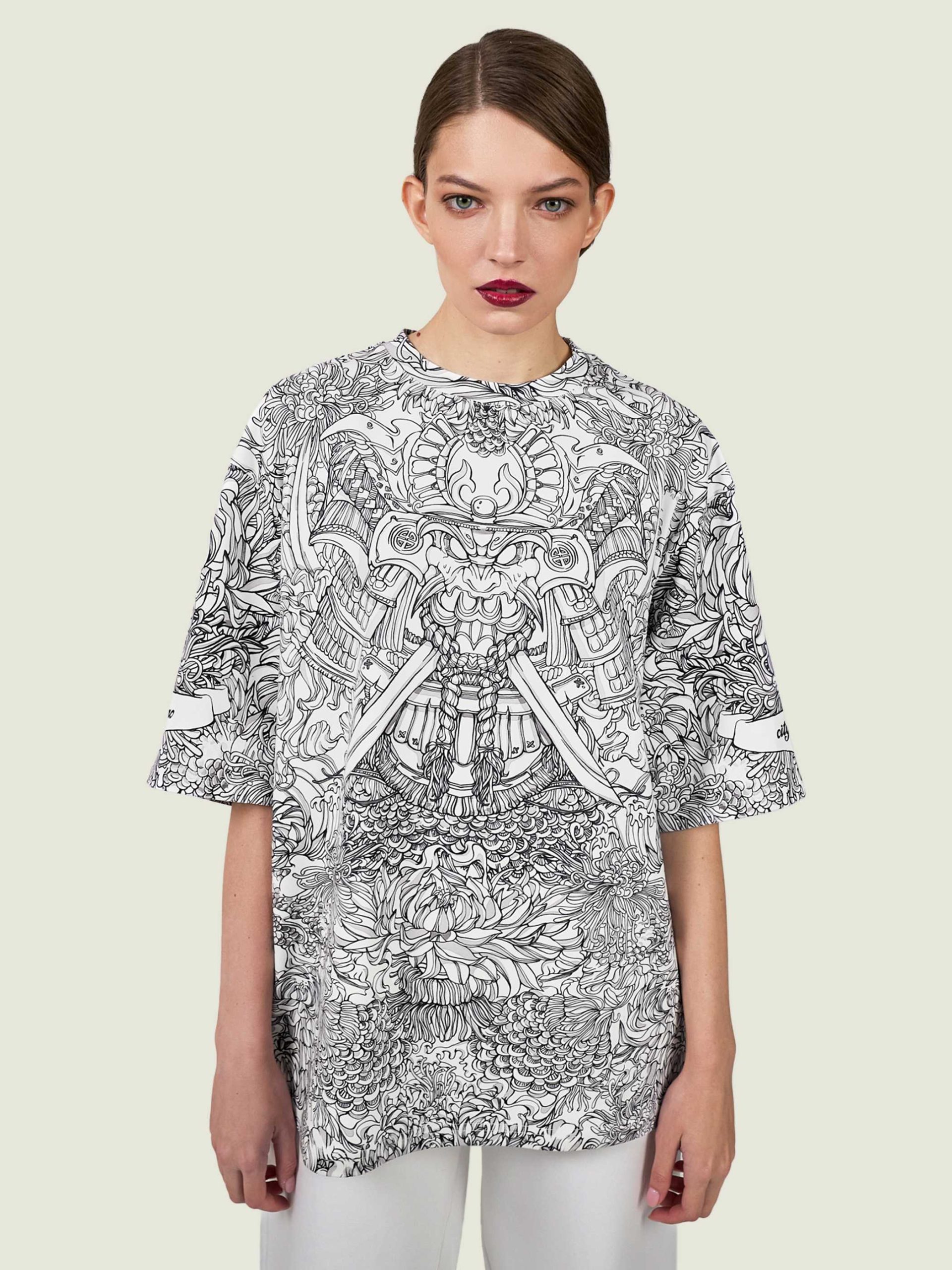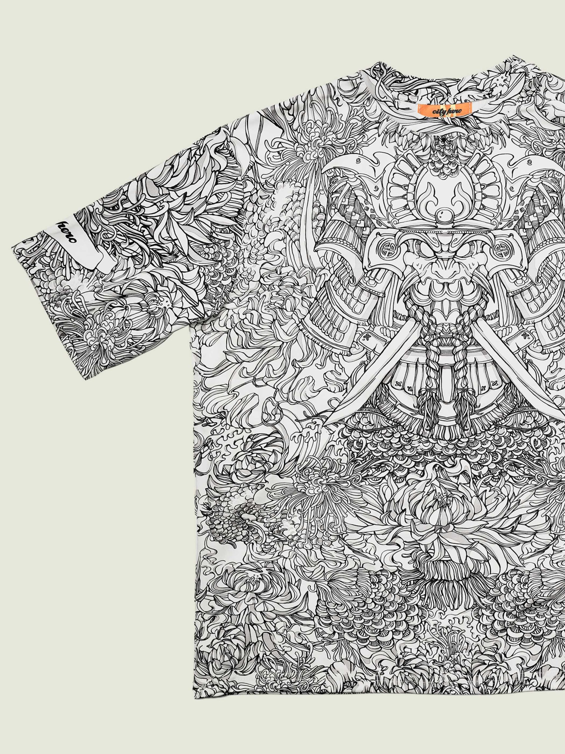Футболка второго поколения в стиле интеллиджент оверсайз в черно-белых тонах с высоко детализированным принтом в виде маски самурая мэнгу, дракона и разнообразных цветов.