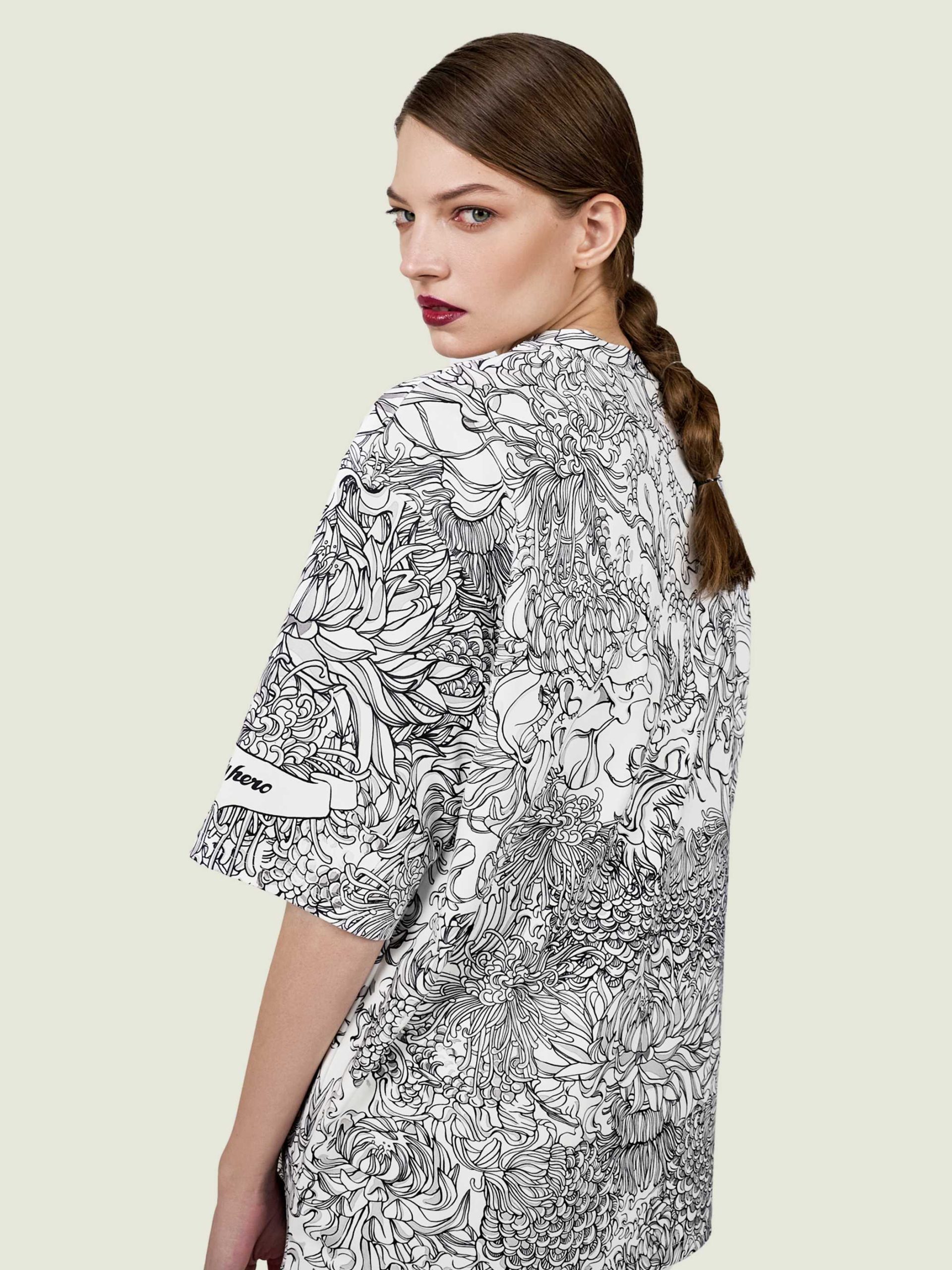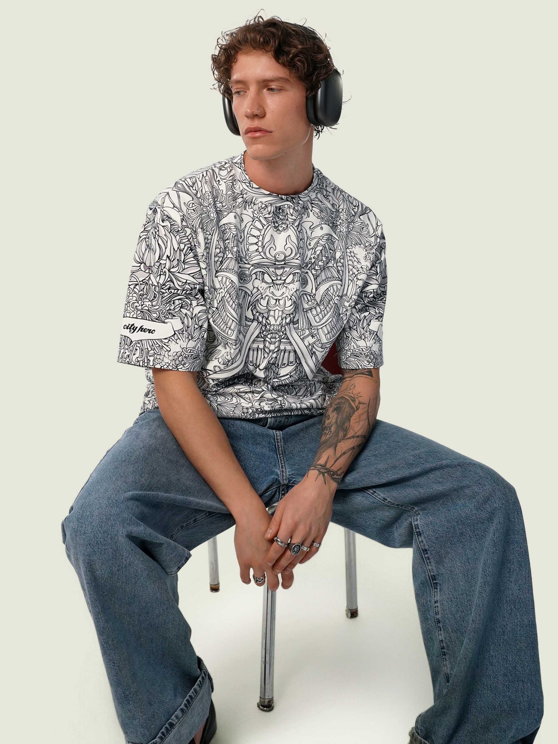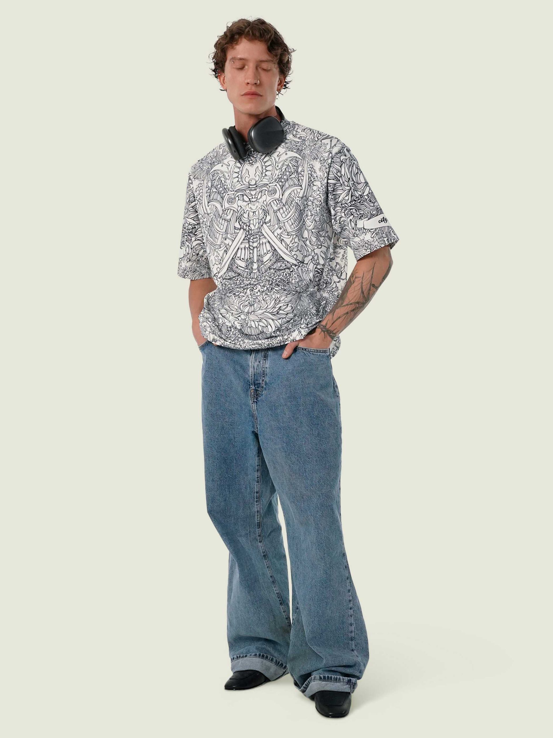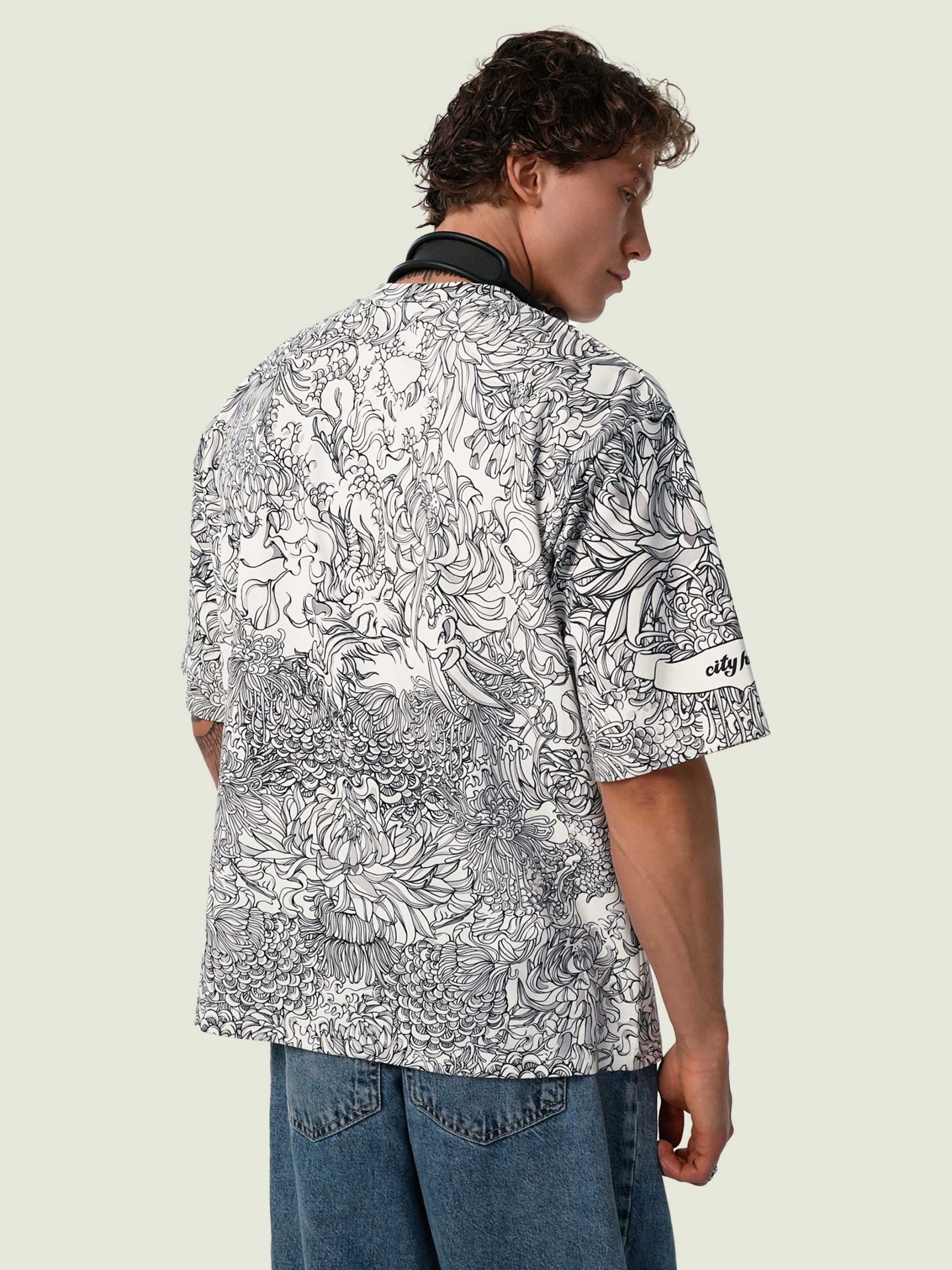 Футболка второго поколения в стиле интеллиджент оверсайз в черно-белых тонах с высоко детализированным принтом в виде маски самурая мэнгу, дракона и разнообразных цветов.