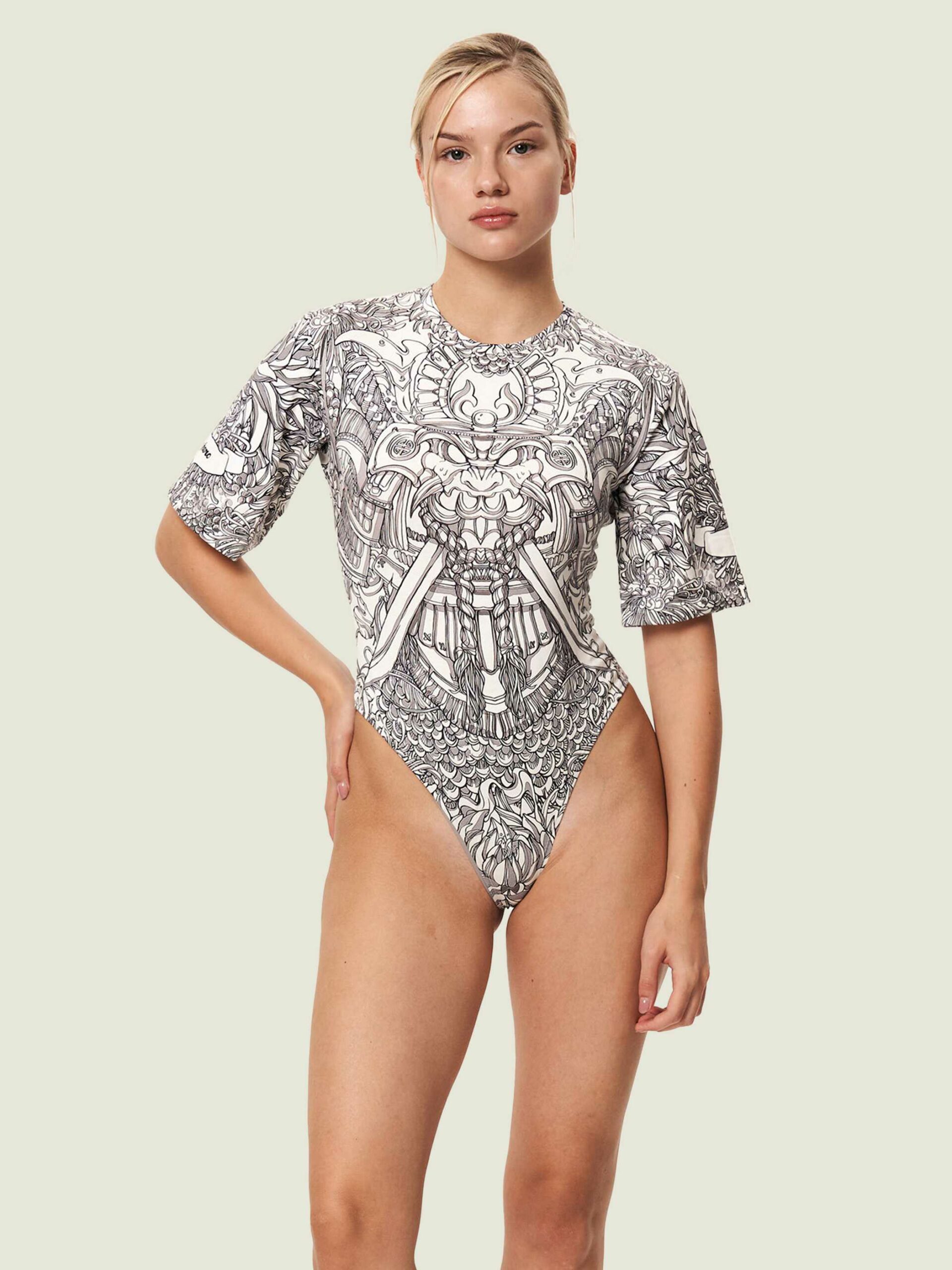 Боди-футболка универсальной формы, с широкими рукавами и прилегающим кроем. Боди можно комбинировать как с базовыми вещами, так и с изделиями CITY HERO того же или другого дизайна.