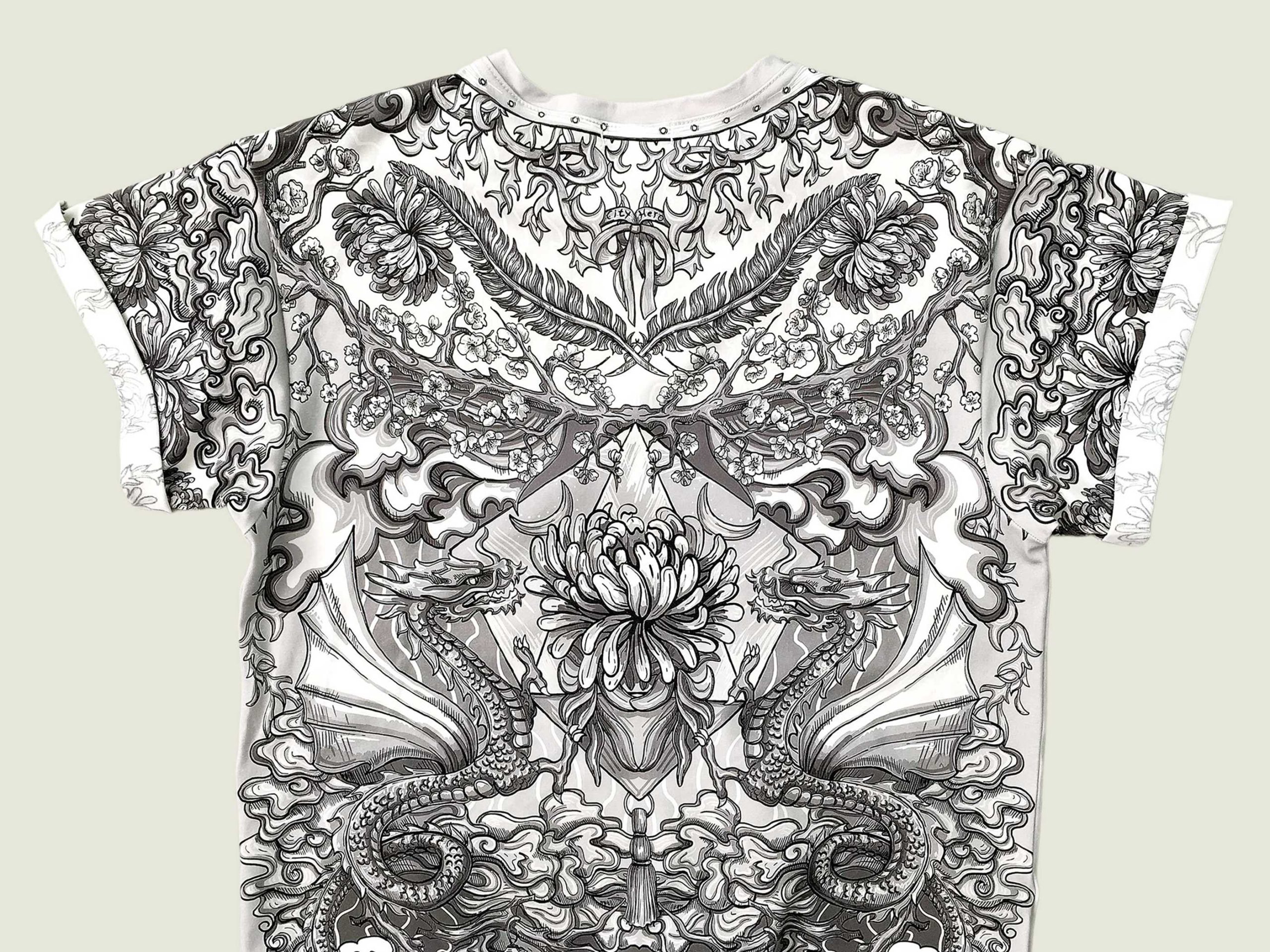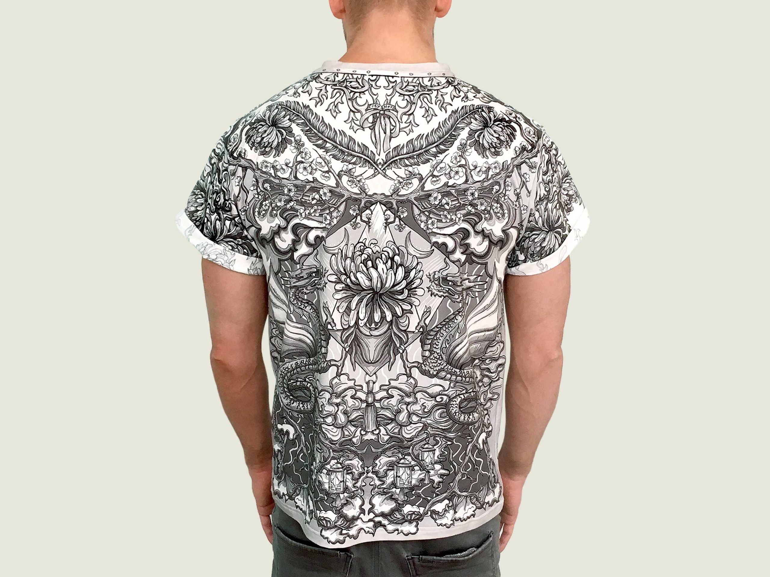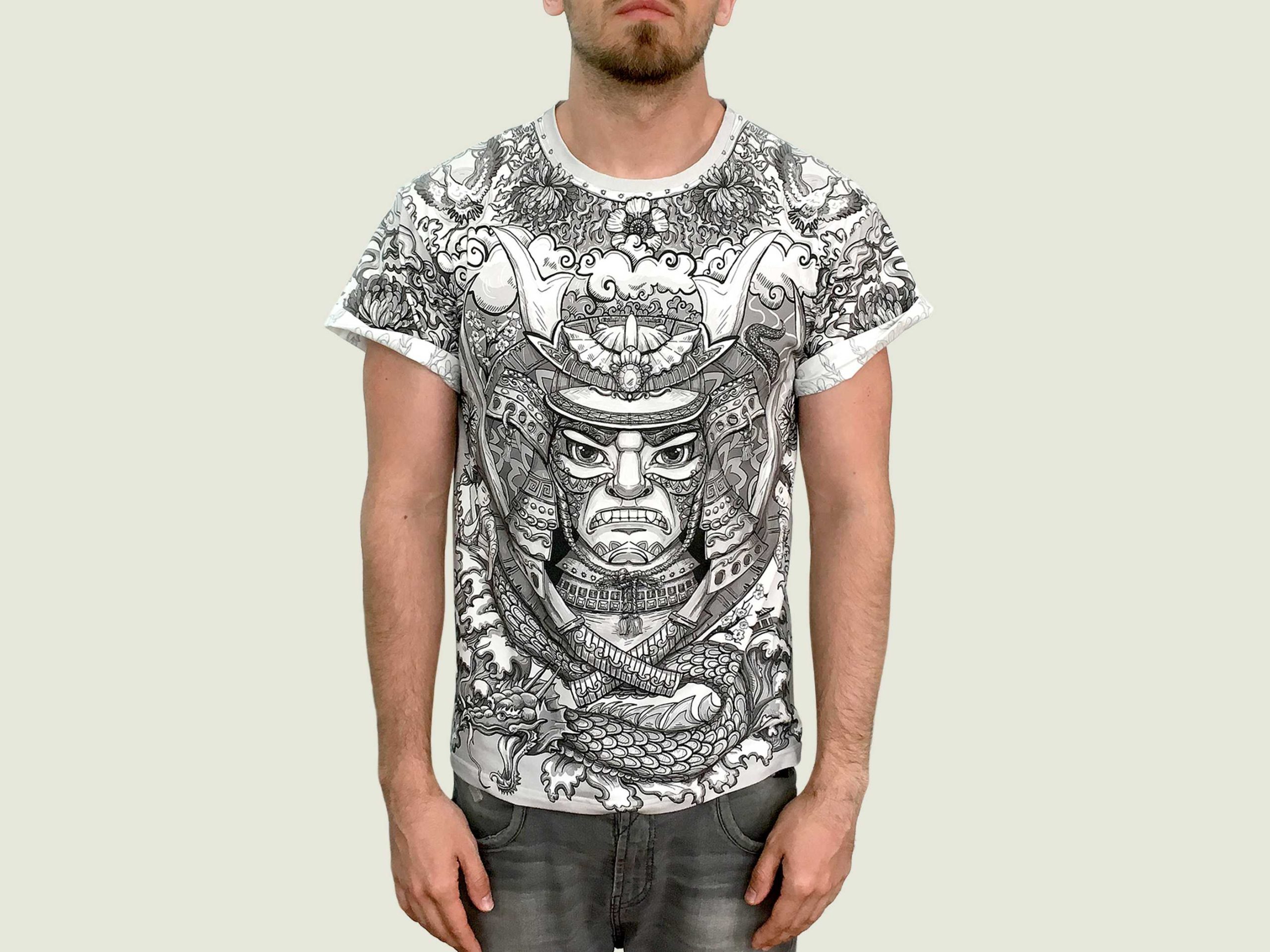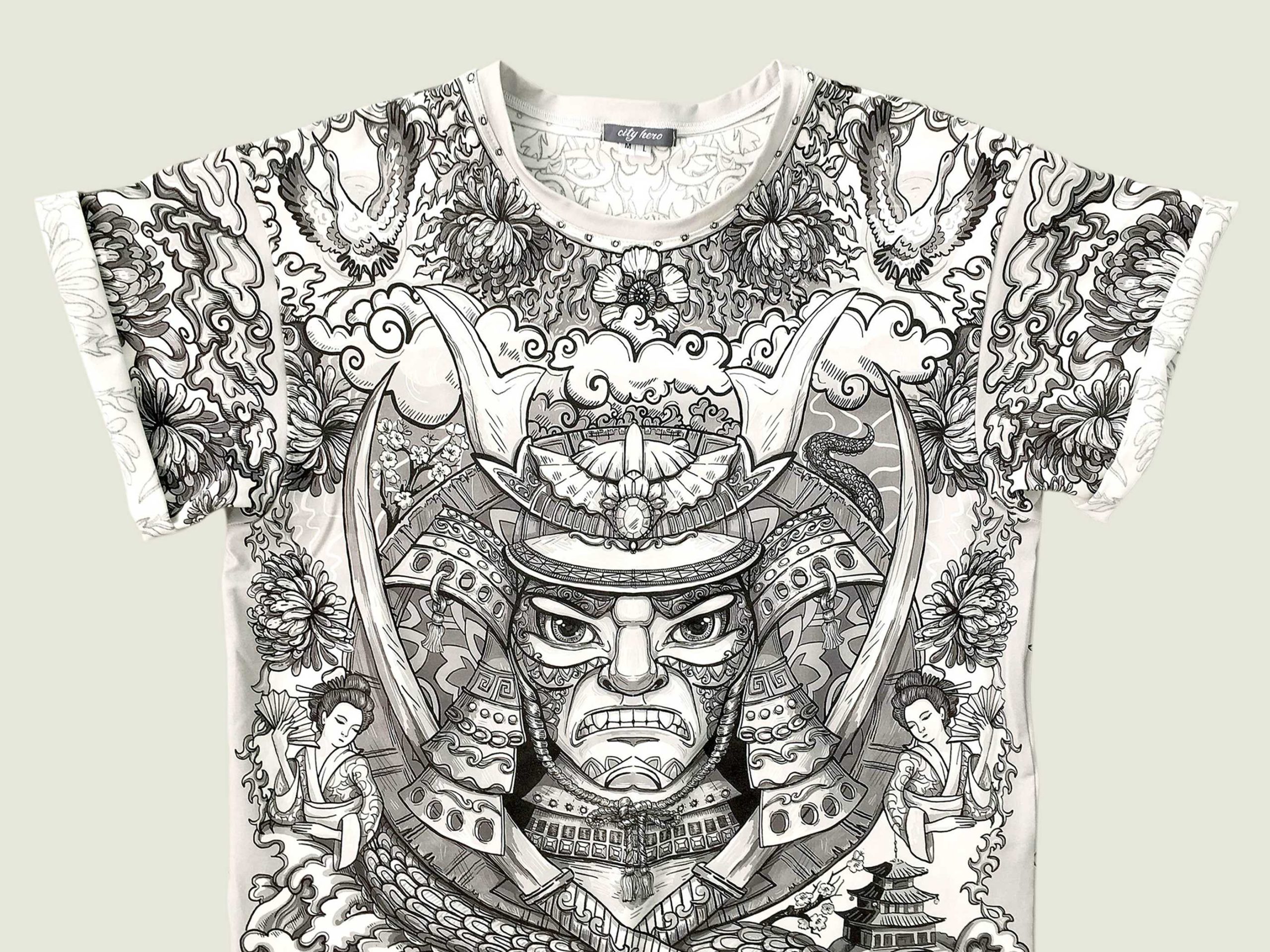 Samurai story 4.0 — Символы японской мифологии переплелись в этом дизайне чтобы рассказать новую самурайскую историю. Цветущая сакура, волшебные драконы, императорские хризантемы, соблазнительные гейши — в этом монохромном дизайне несчетное количество деталей объединены в единую канву. В его центре мы поместили традиционную боевую маску — мэнгу, стилизованную в духе японский анимации.