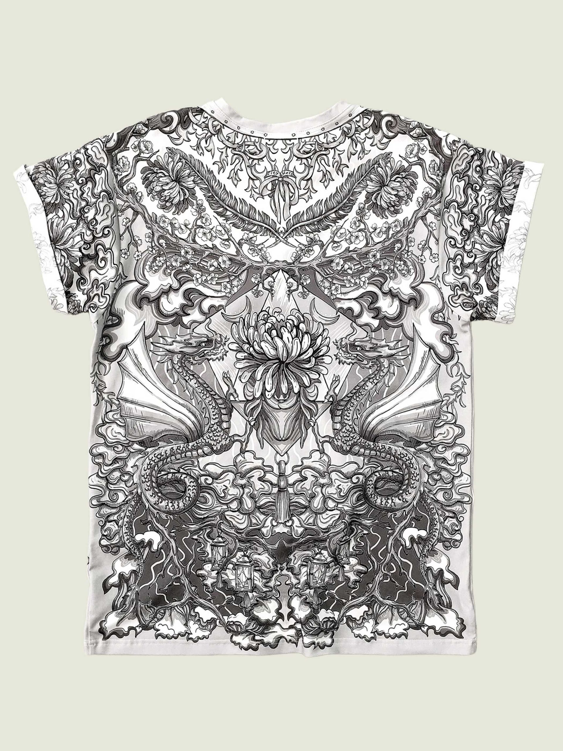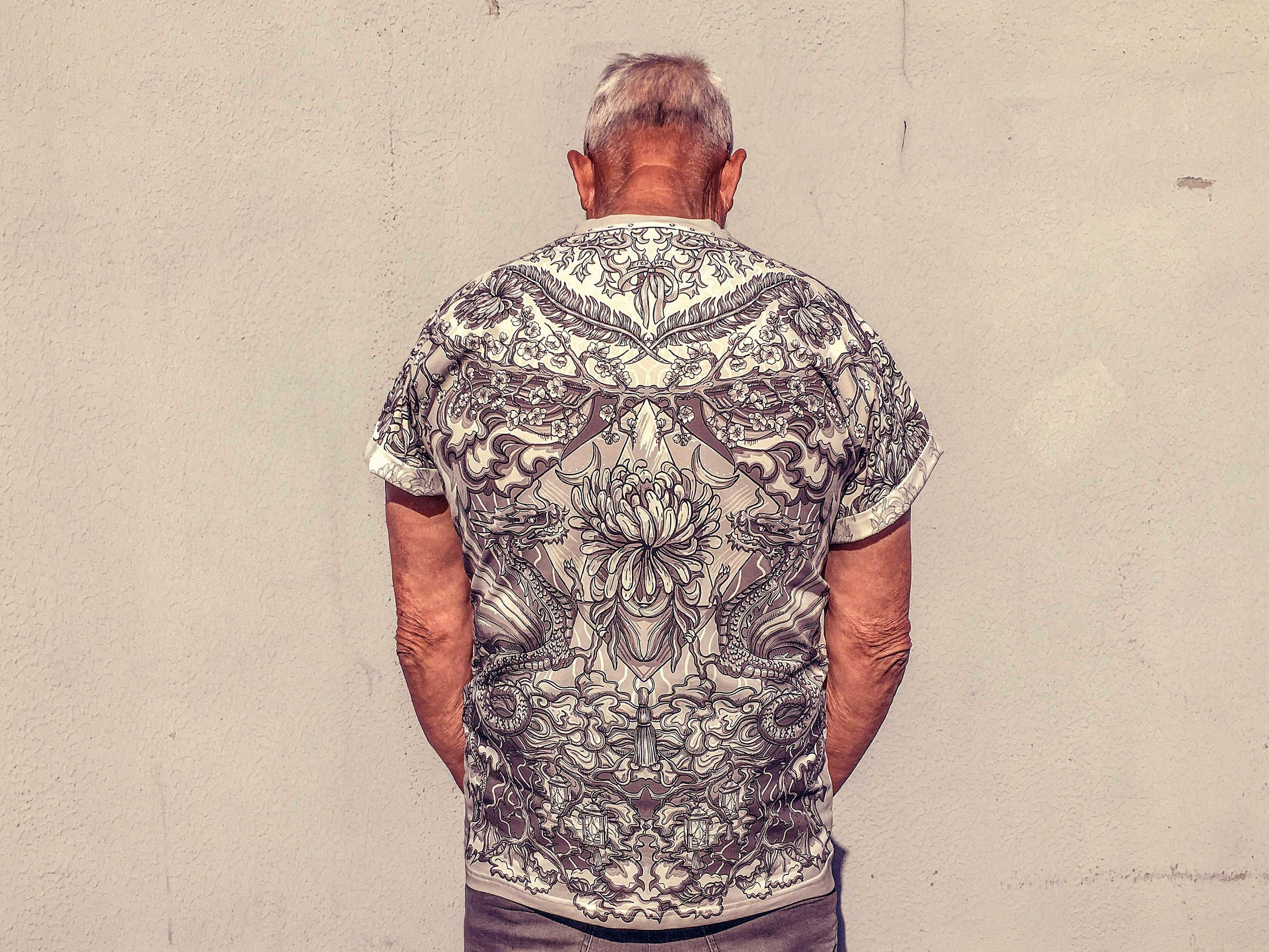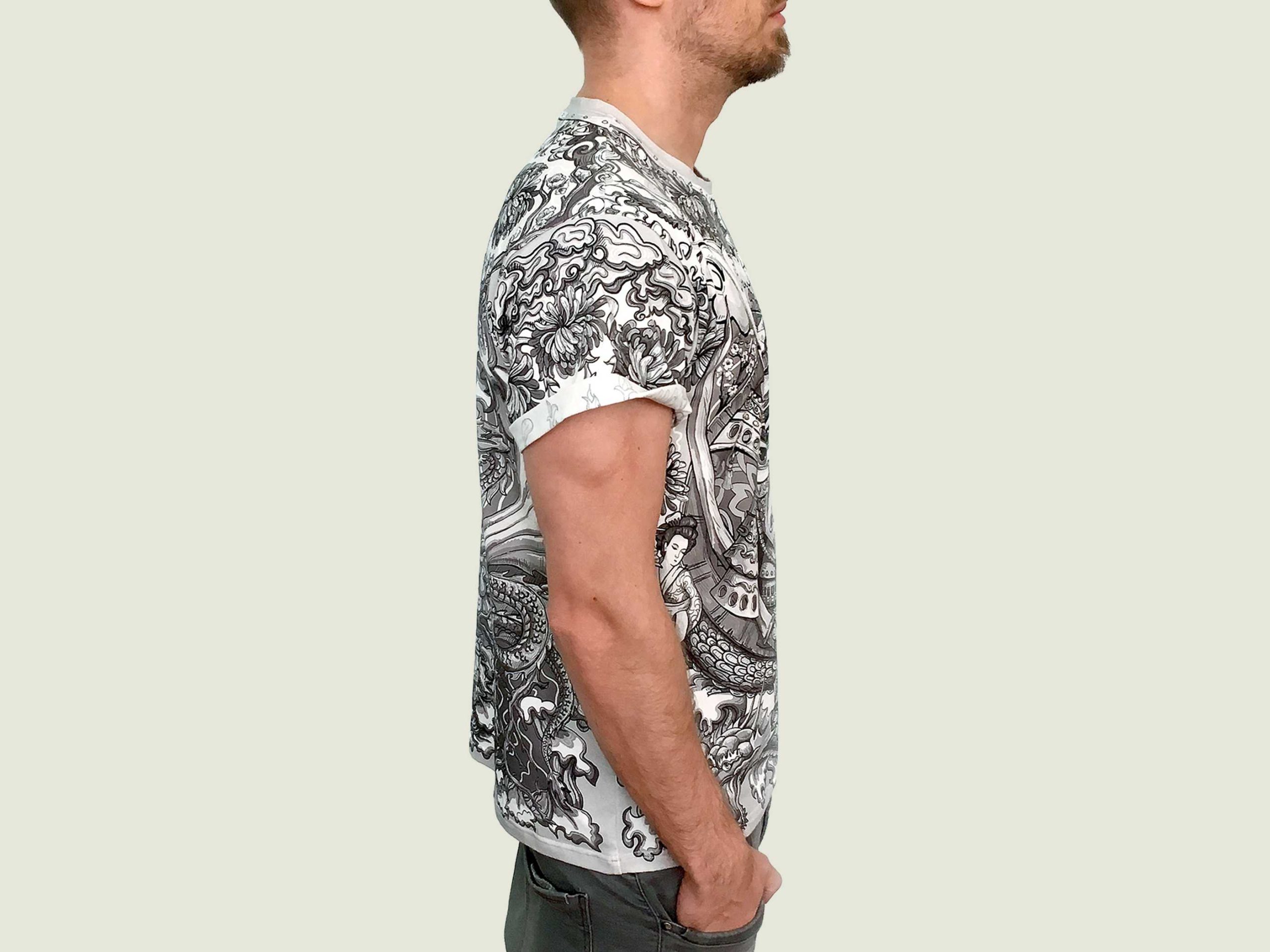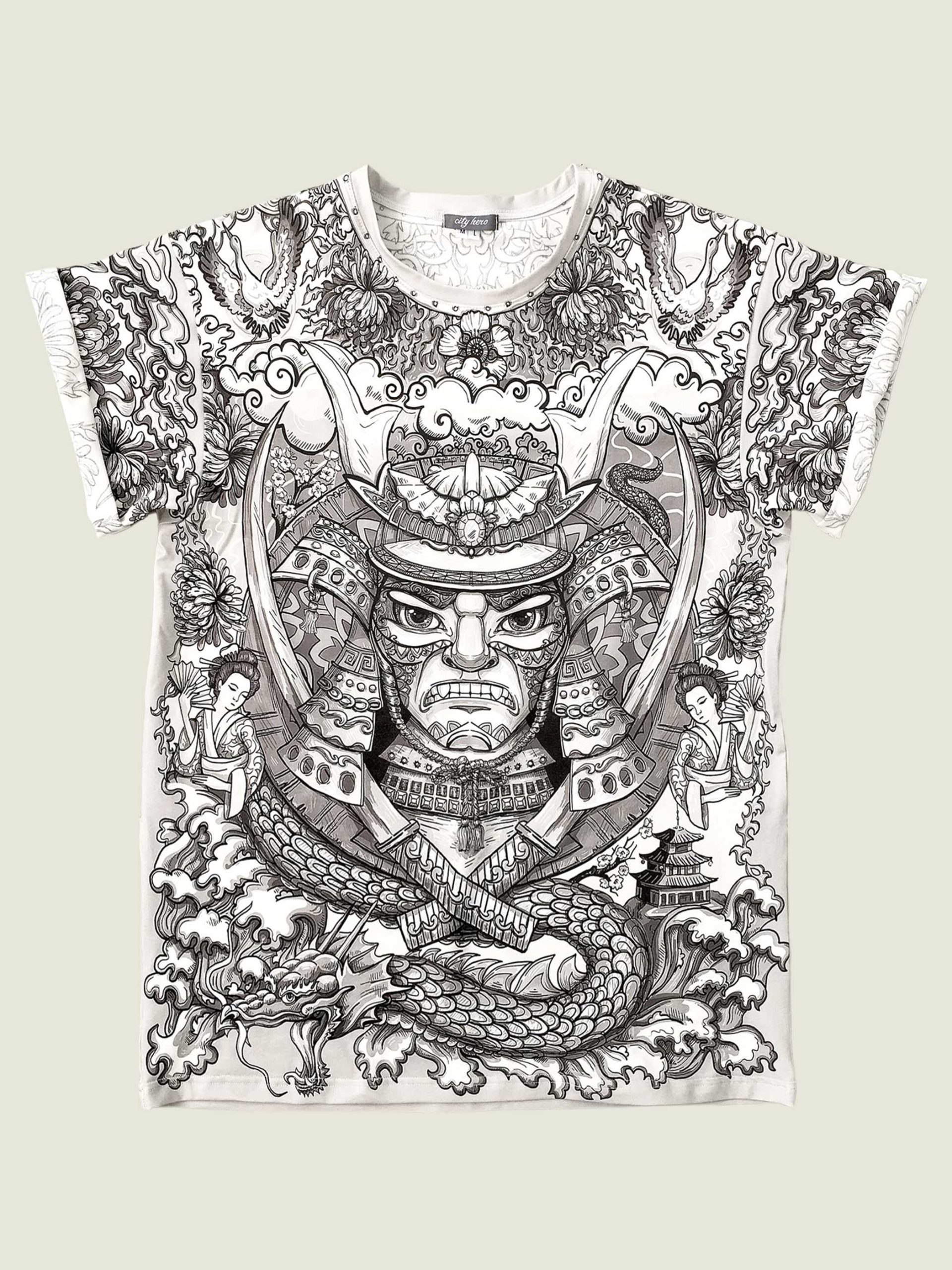 Samurai story 4.0 — Символы японской мифологии переплелись в этом дизайне чтобы рассказать новую самурайскую историю. Цветущая сакура, волшебные драконы, императорские хризантемы, соблазнительные гейши — в этом монохромном дизайне несчетное количество деталей объединены в единую канву. В его центре мы поместили традиционную боевую маску — мэнгу, стилизованную в духе японский анимации.