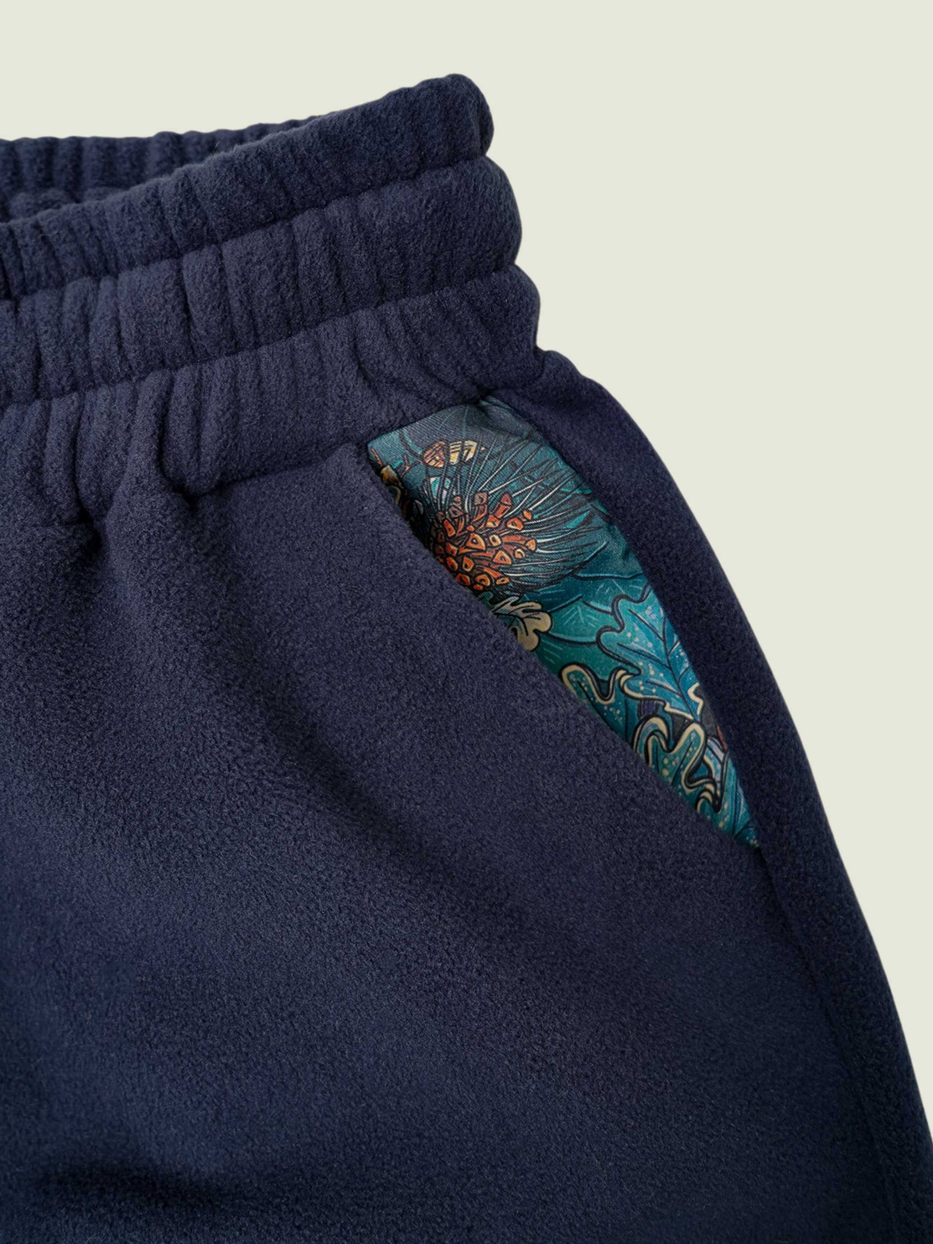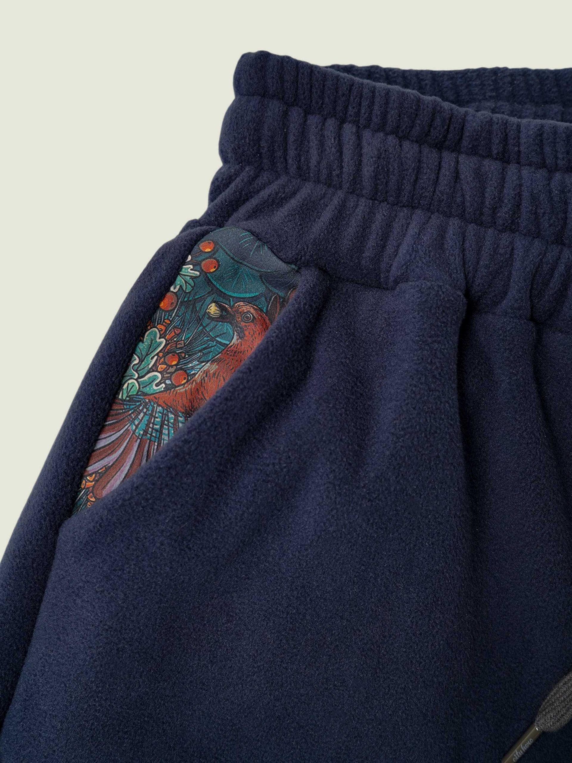 Тёплые зимние джоггеры в стиле интеллиджент оверсайз CITY HERO из толстого уютного флиса в синем цвете, с интересной деталью в виде украшенных текстильной графикой карманами. Рисунок продолжает сюжет с одноименной олимпийки. Низ штанин на резинке. Удобные объемные боковые карманы-ловушки, сконструированы так, чтобы из них не выпадало содержимое. Изделие спроектировано, как для комбинирования с базовыми вещами, так и для дополнения костюмного тотал-лука того же дизайна.