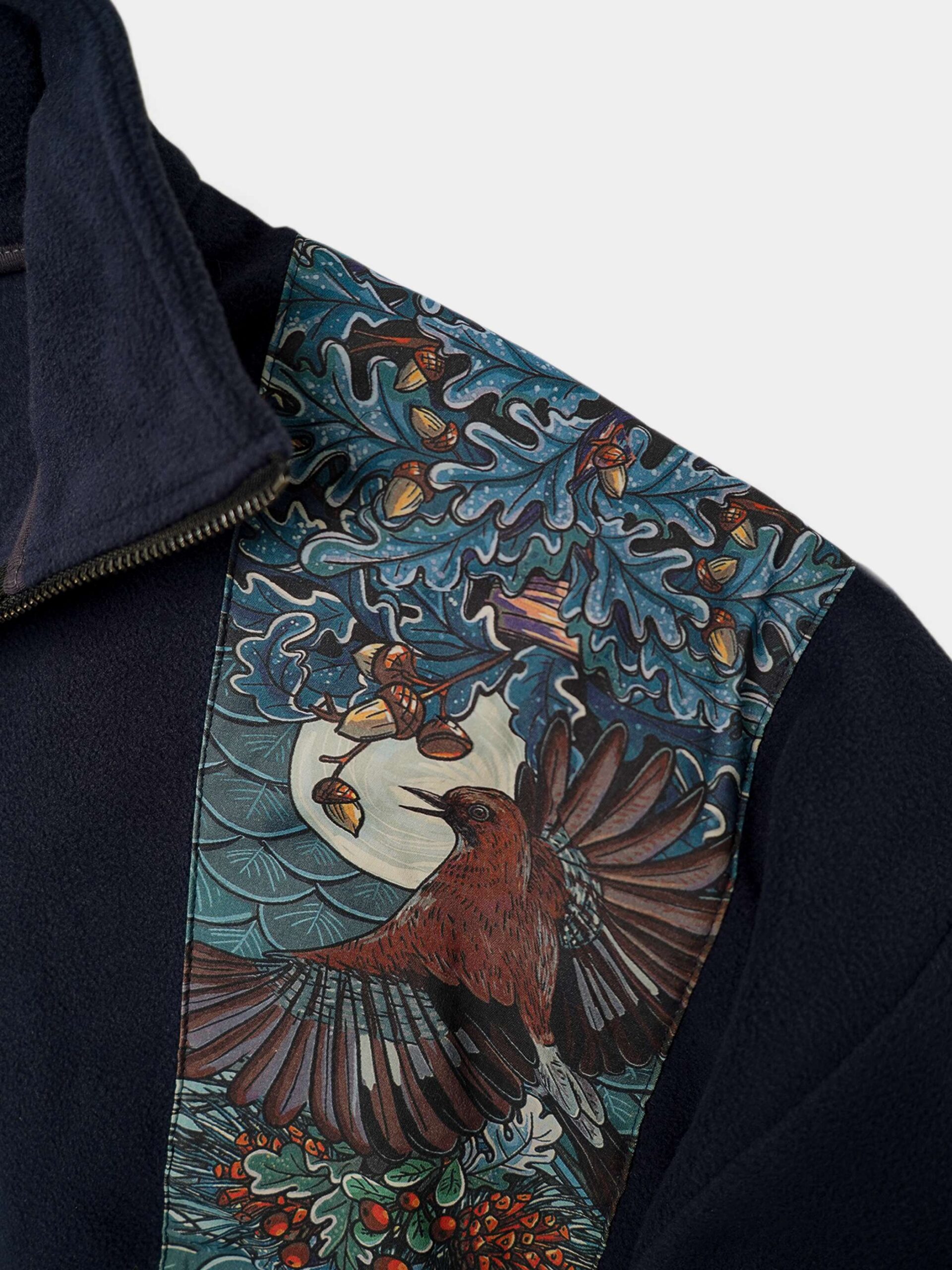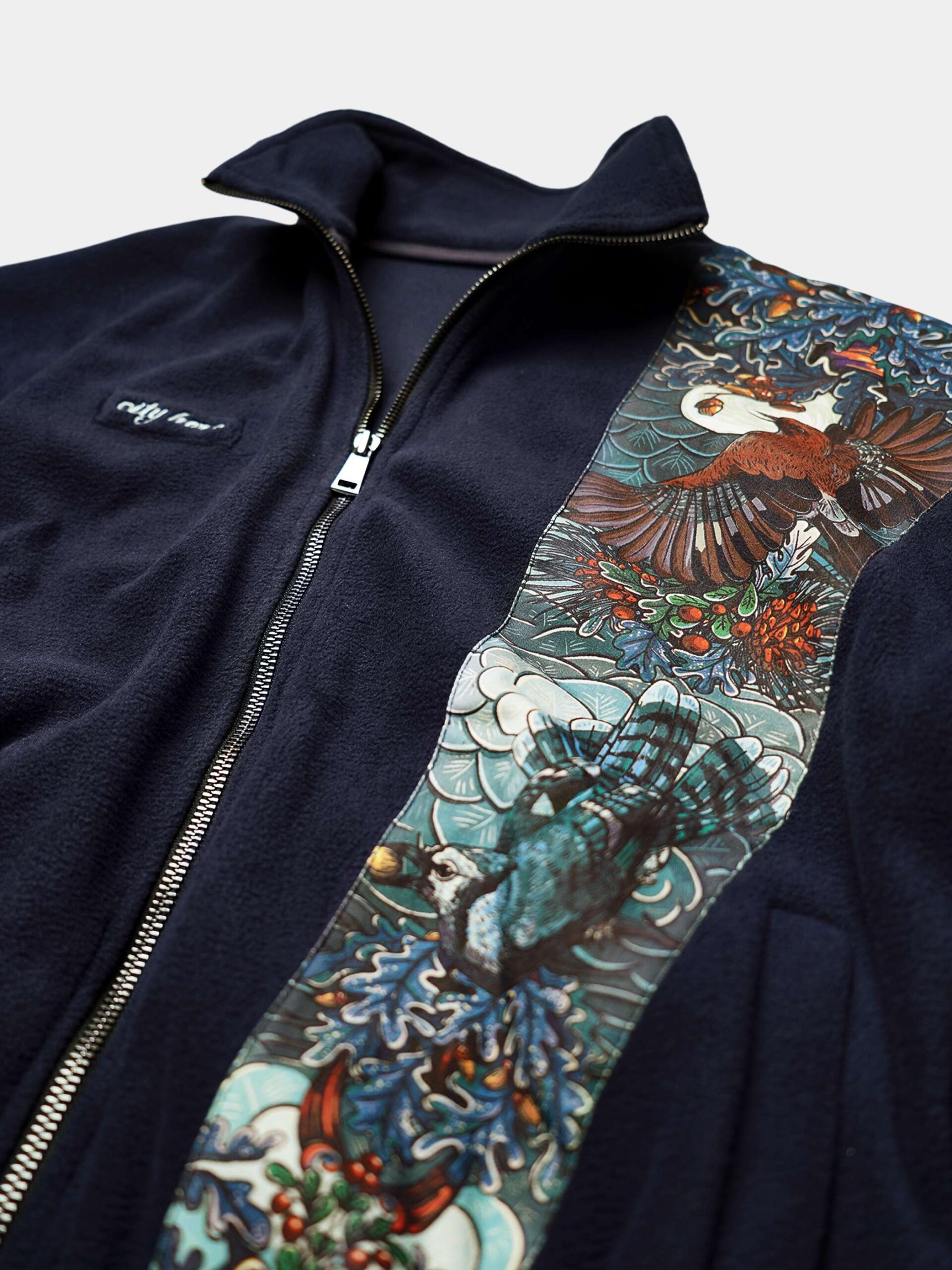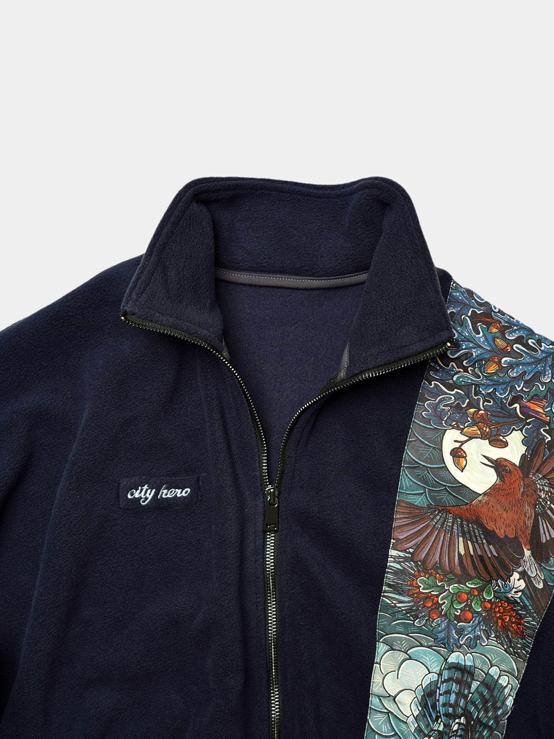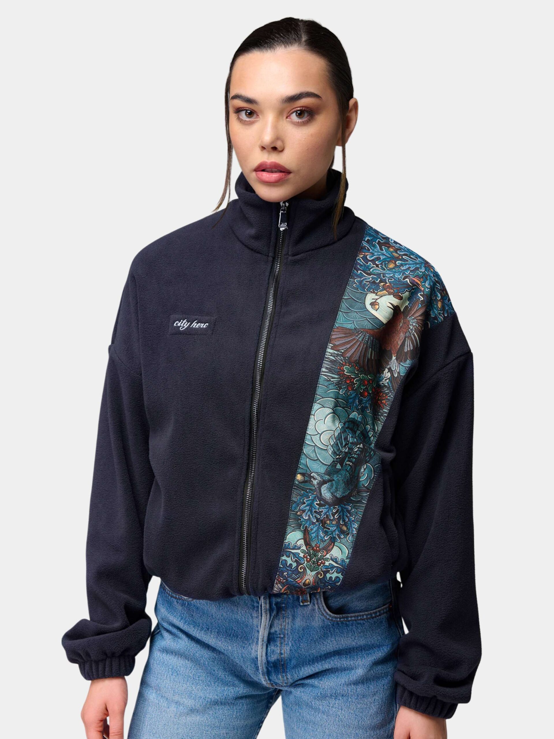Толстовка оснащена двумя удобными карманами, металлической молнией с двумя бегунками, манжетами на резинках и высоким воротником-стойкой.