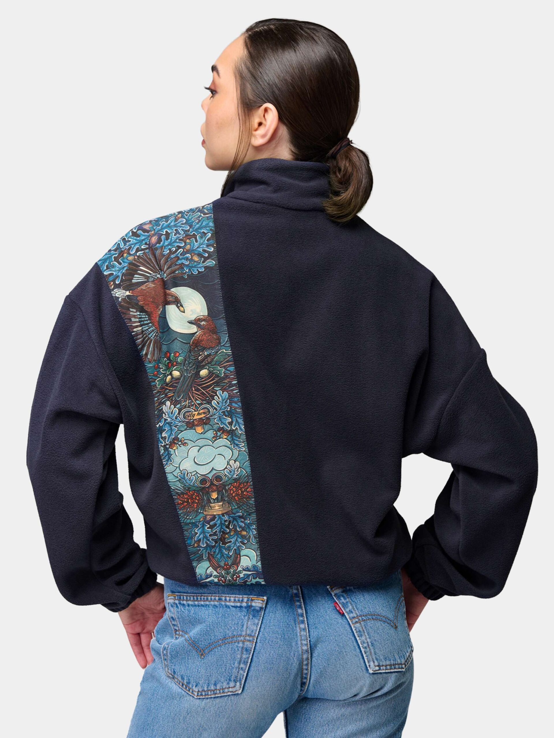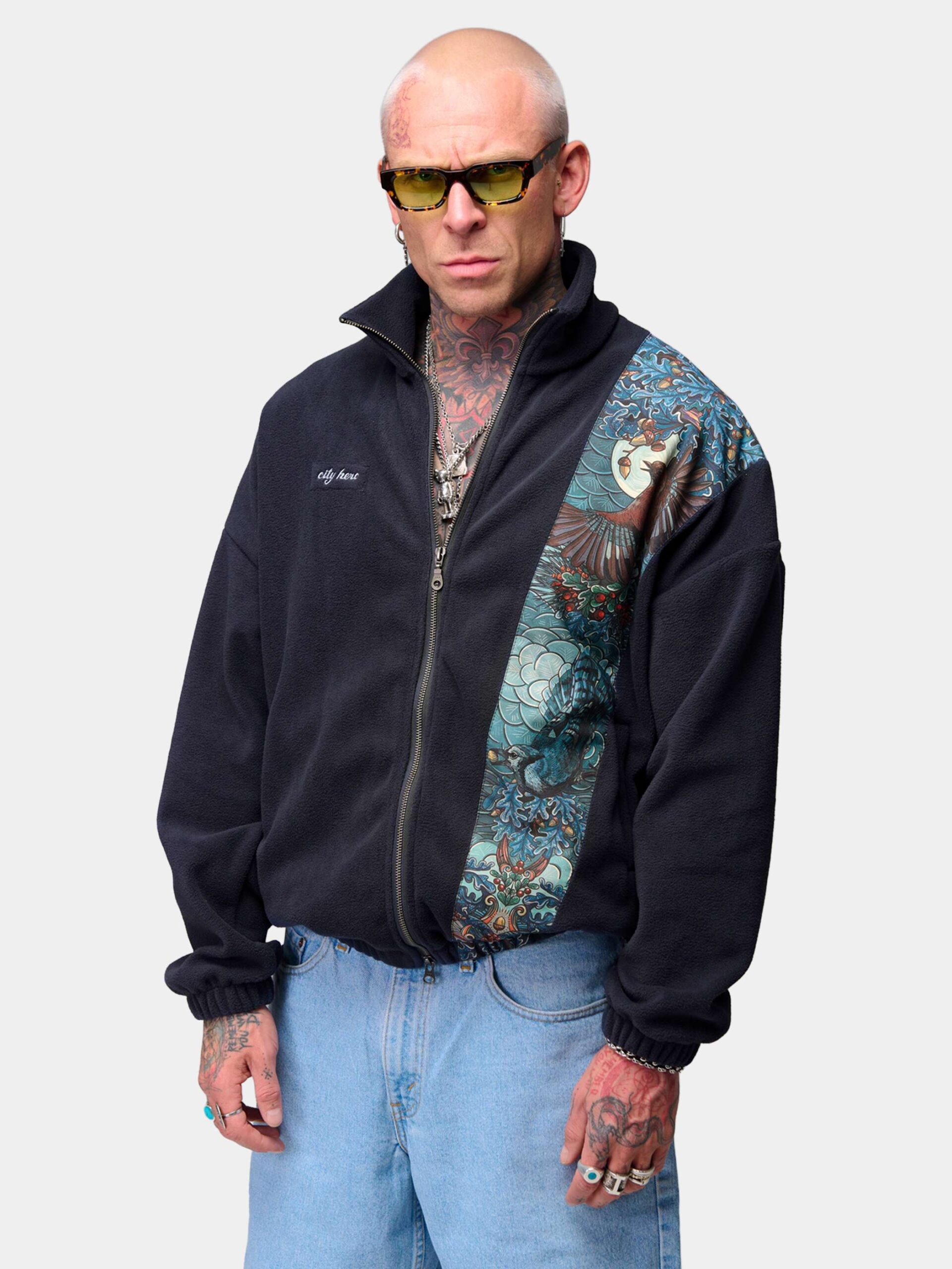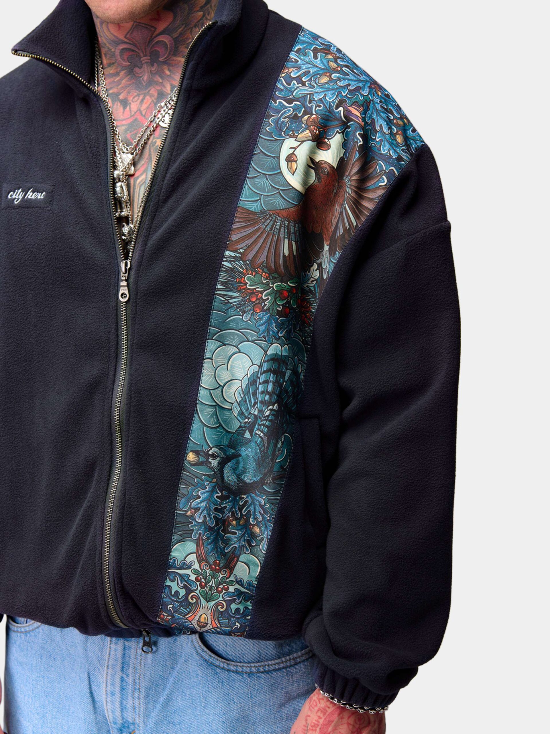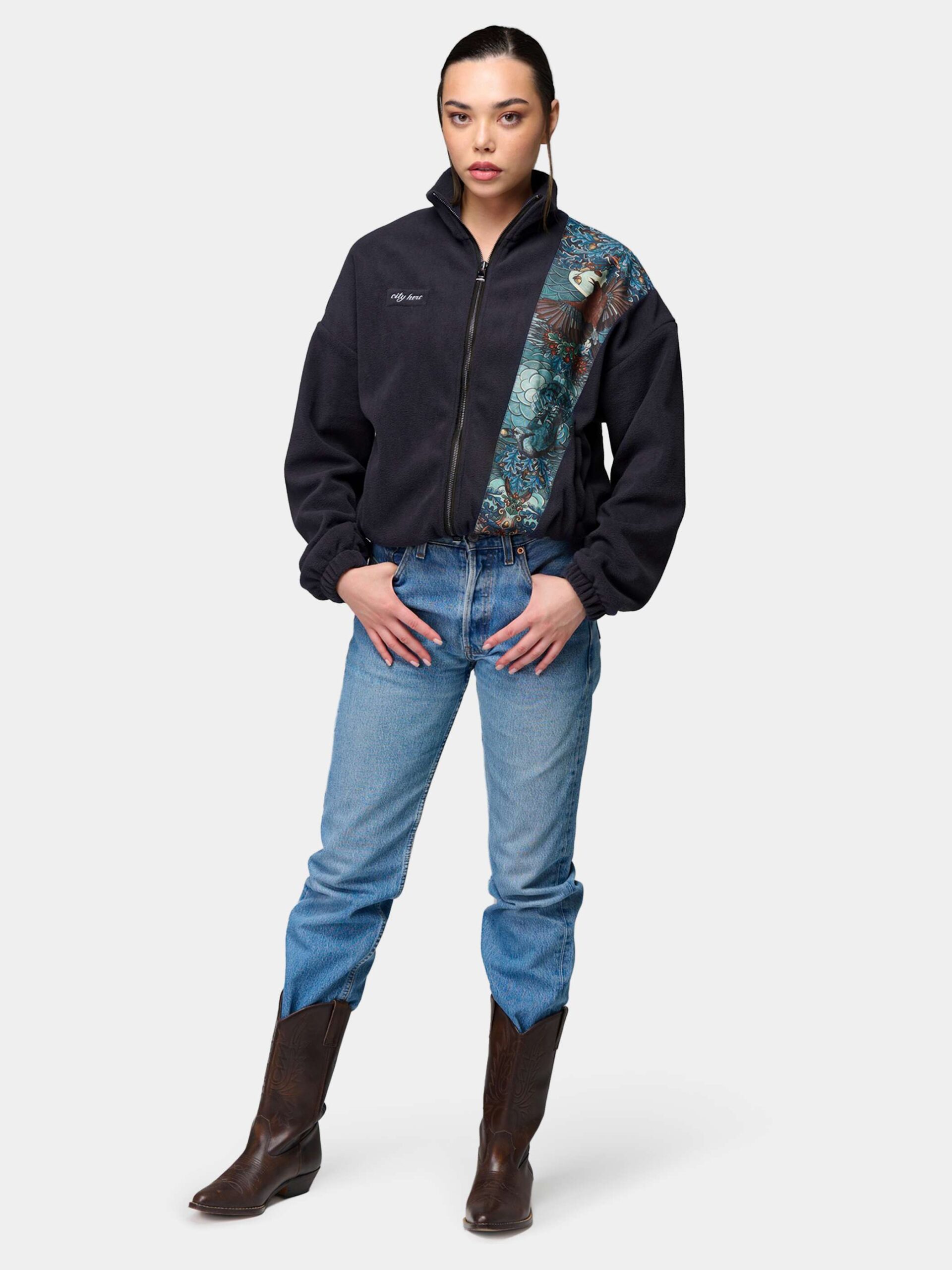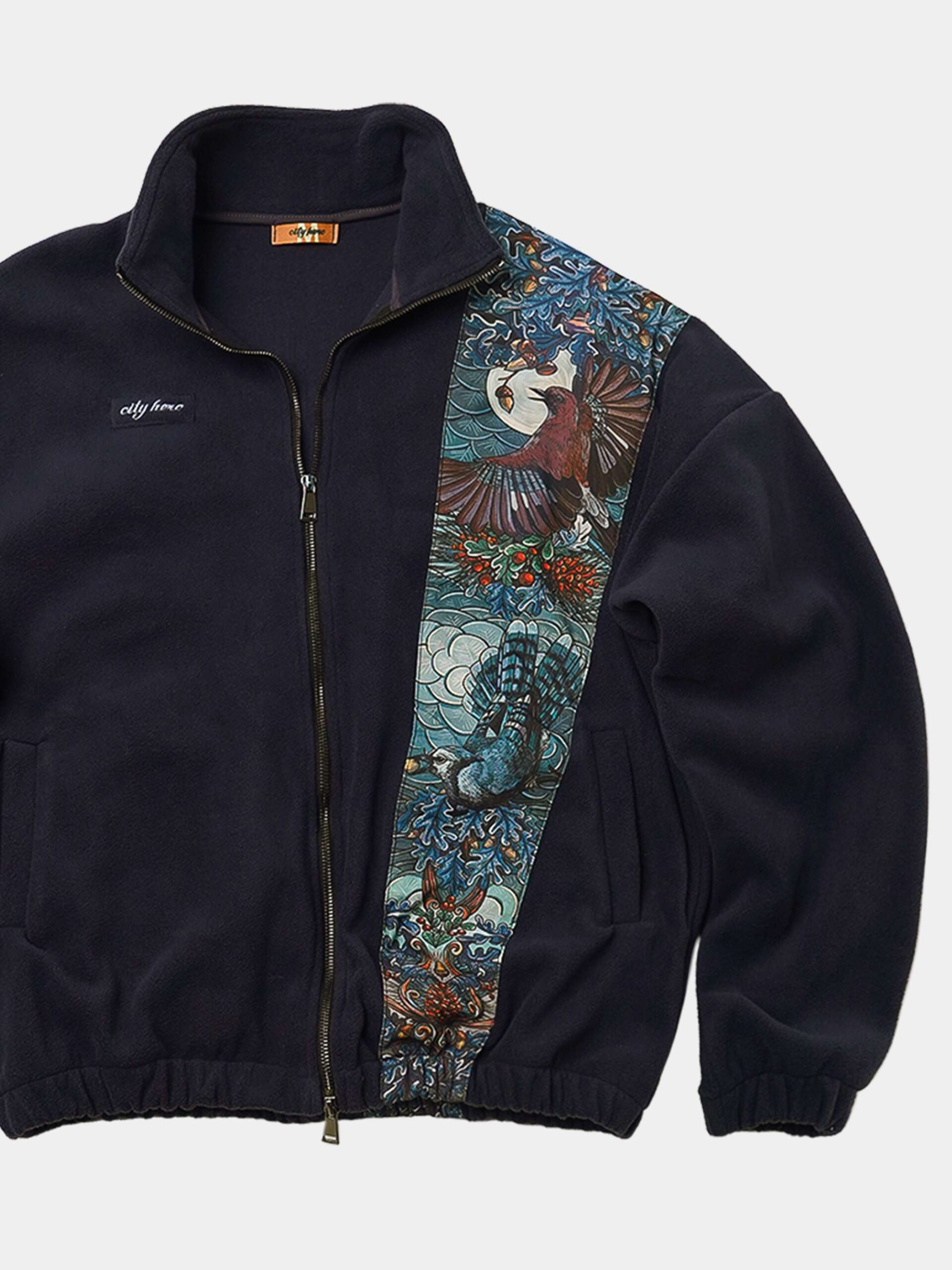 Толстовка оснащена двумя удобными карманами, металлической молнией с двумя бегунками, манжетами на резинках и высоким воротником-стойкой.