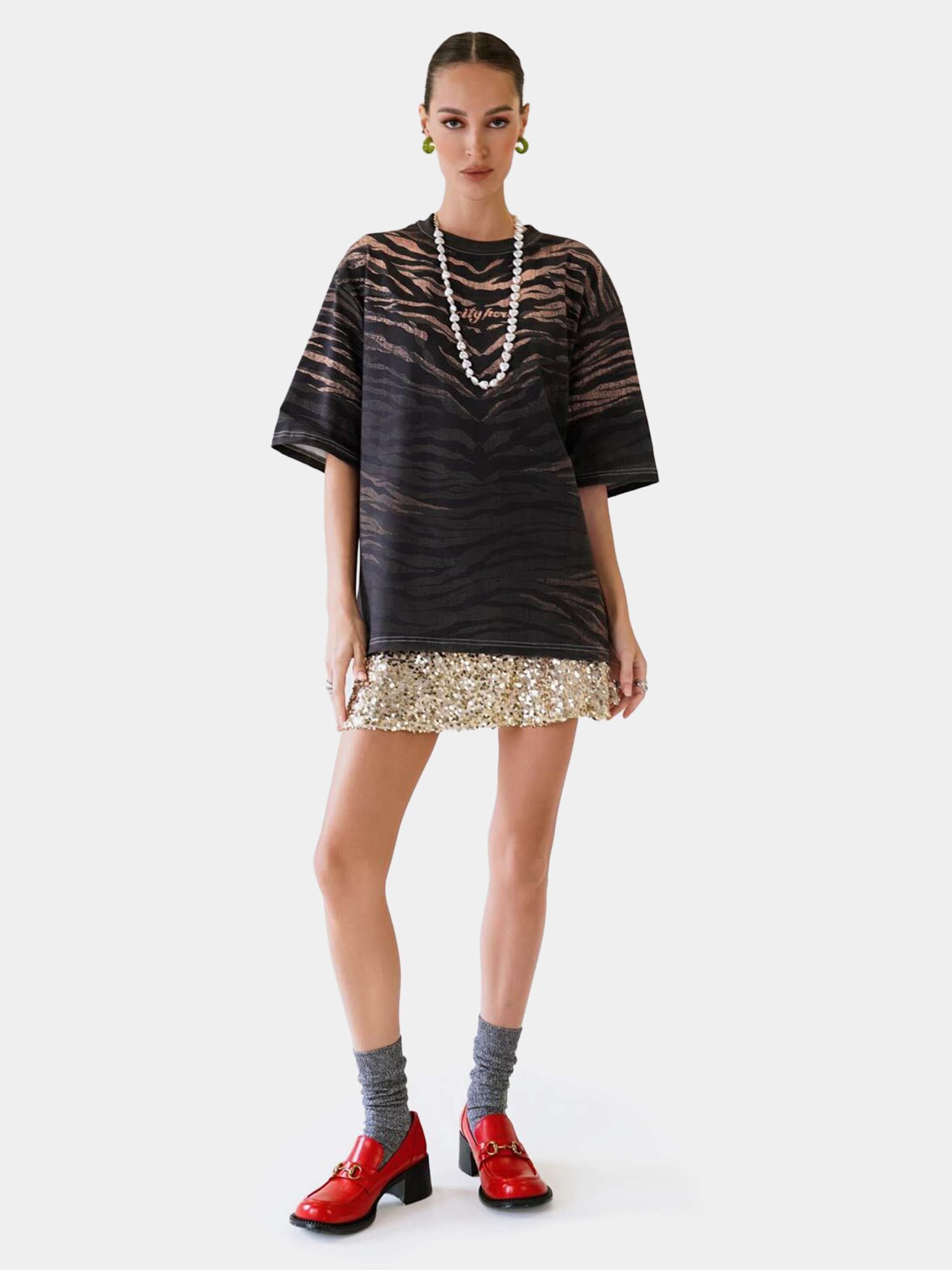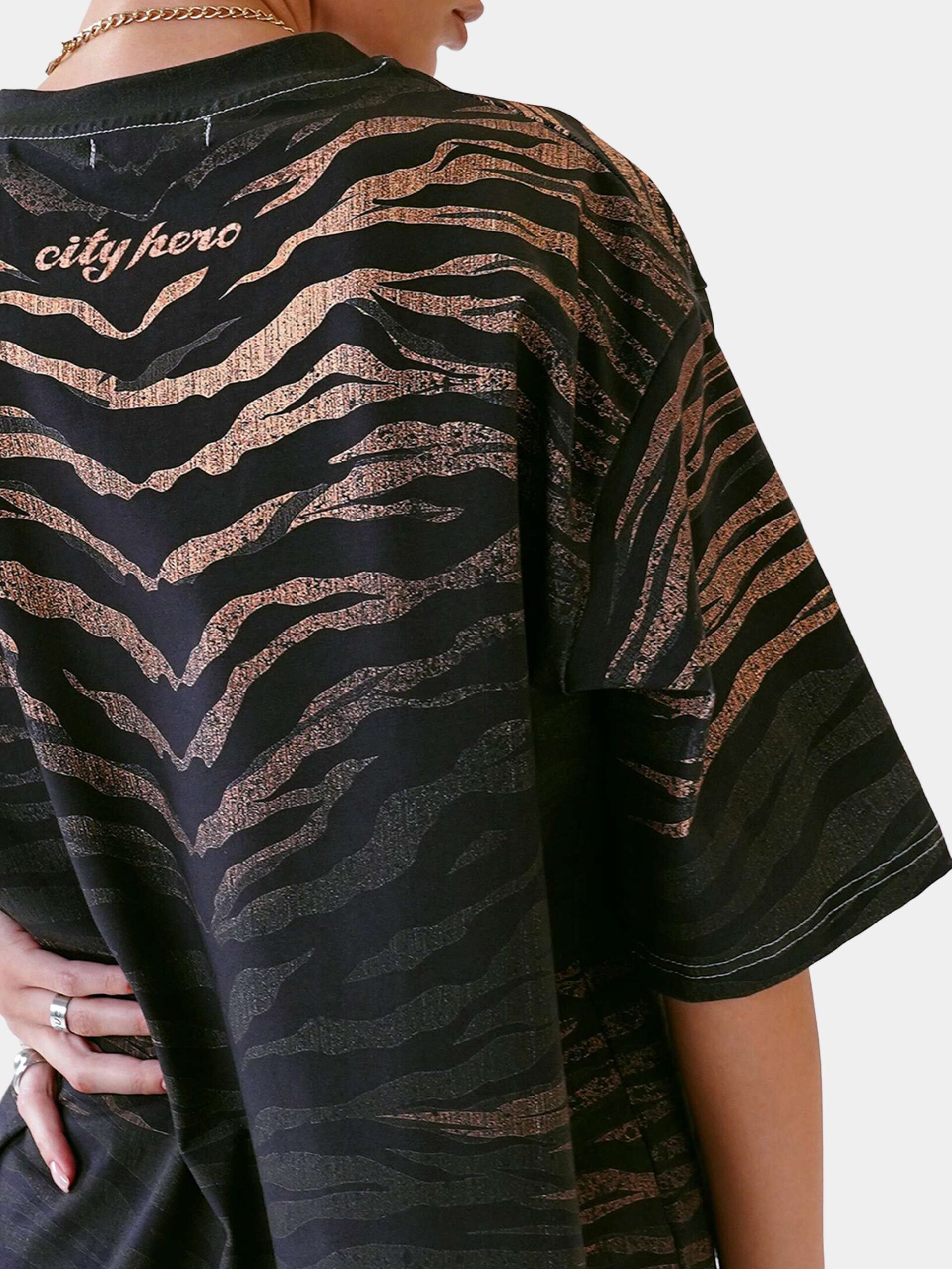 Футболка второго поколения в стиле интеллиджент оверсайз со стилизованным анималистичным принтом Тигр. Жаркие оттенки и анатомичная структура подчёркивают вашу грацию и свободу одновременно.