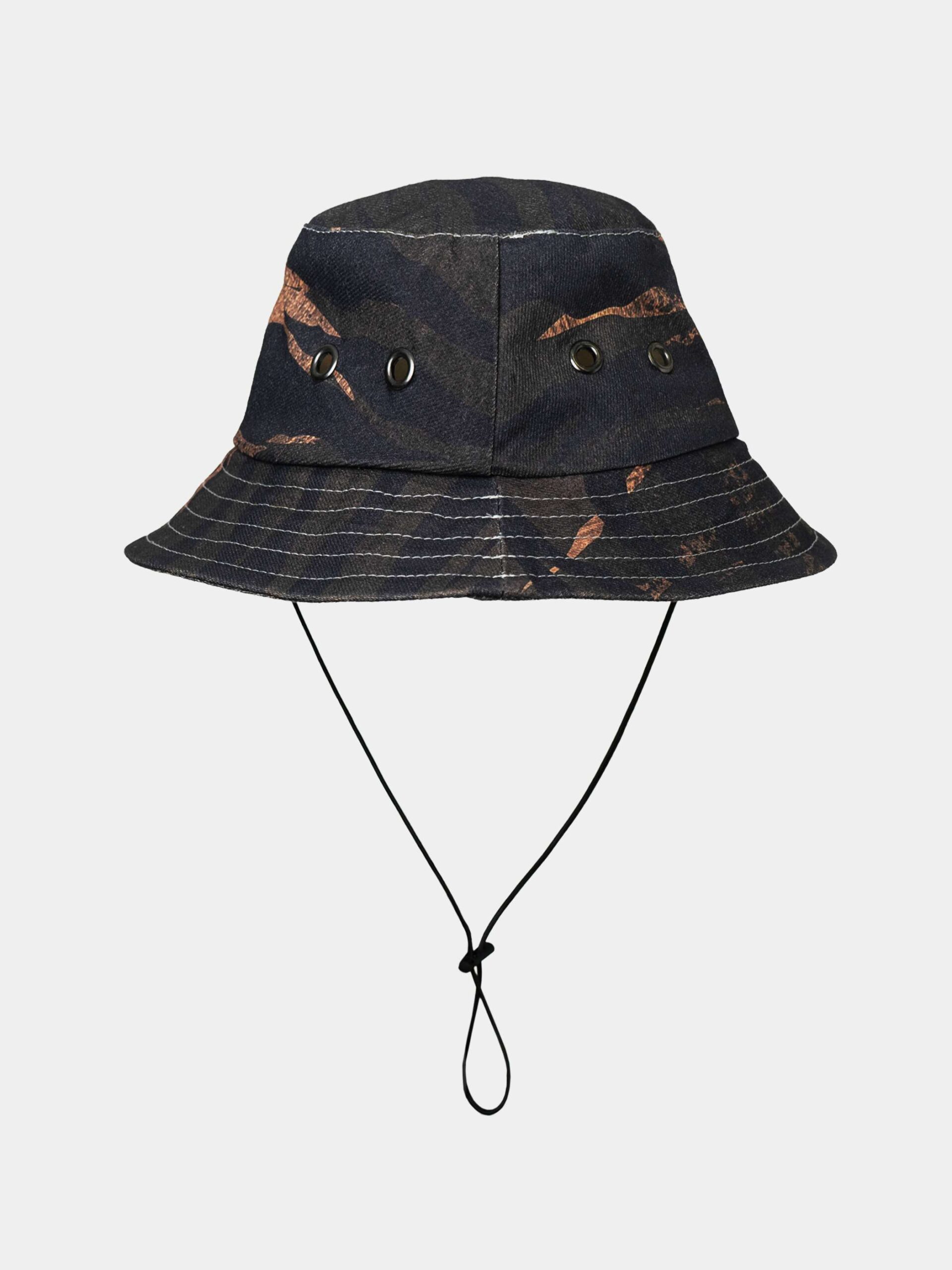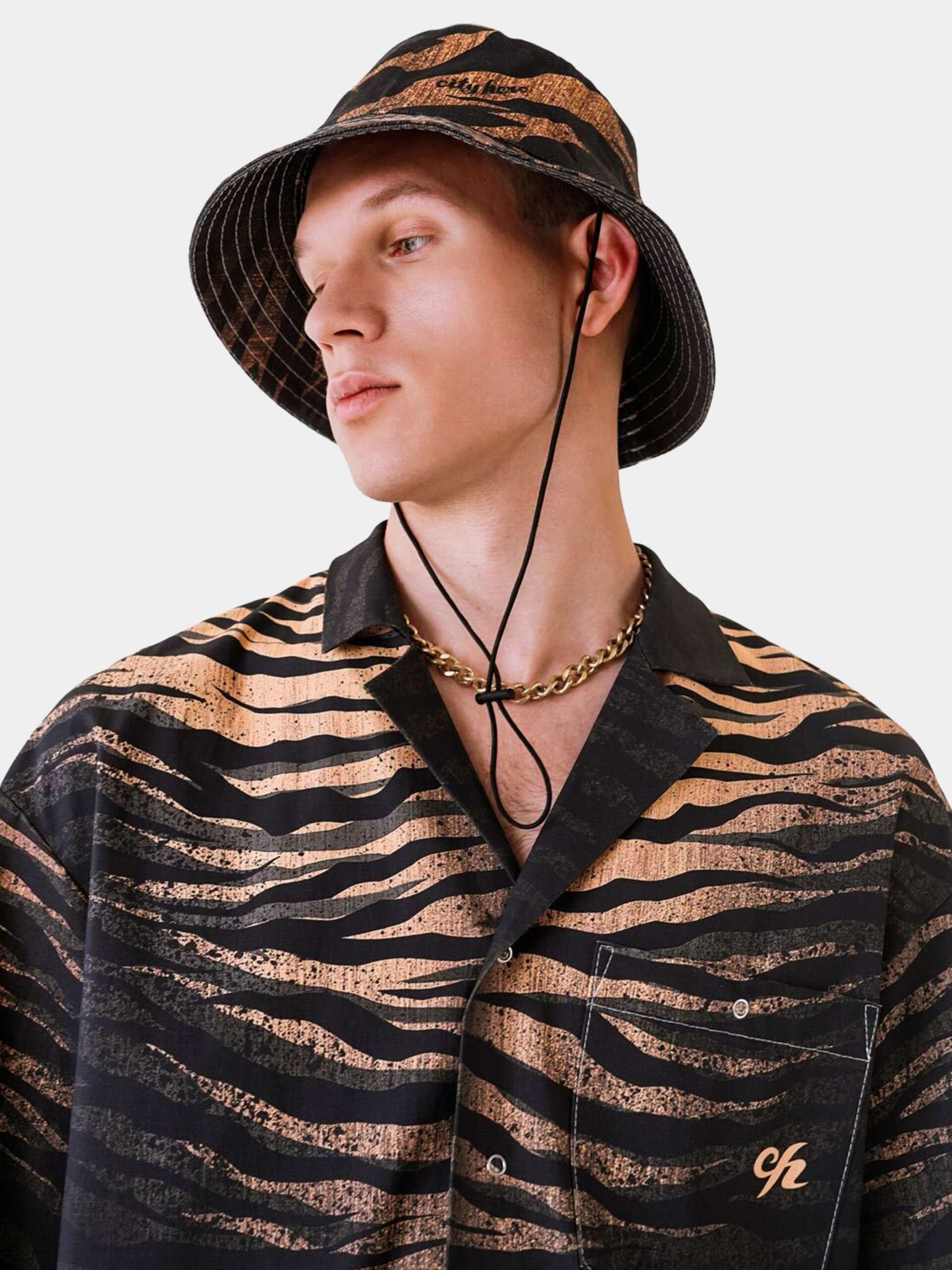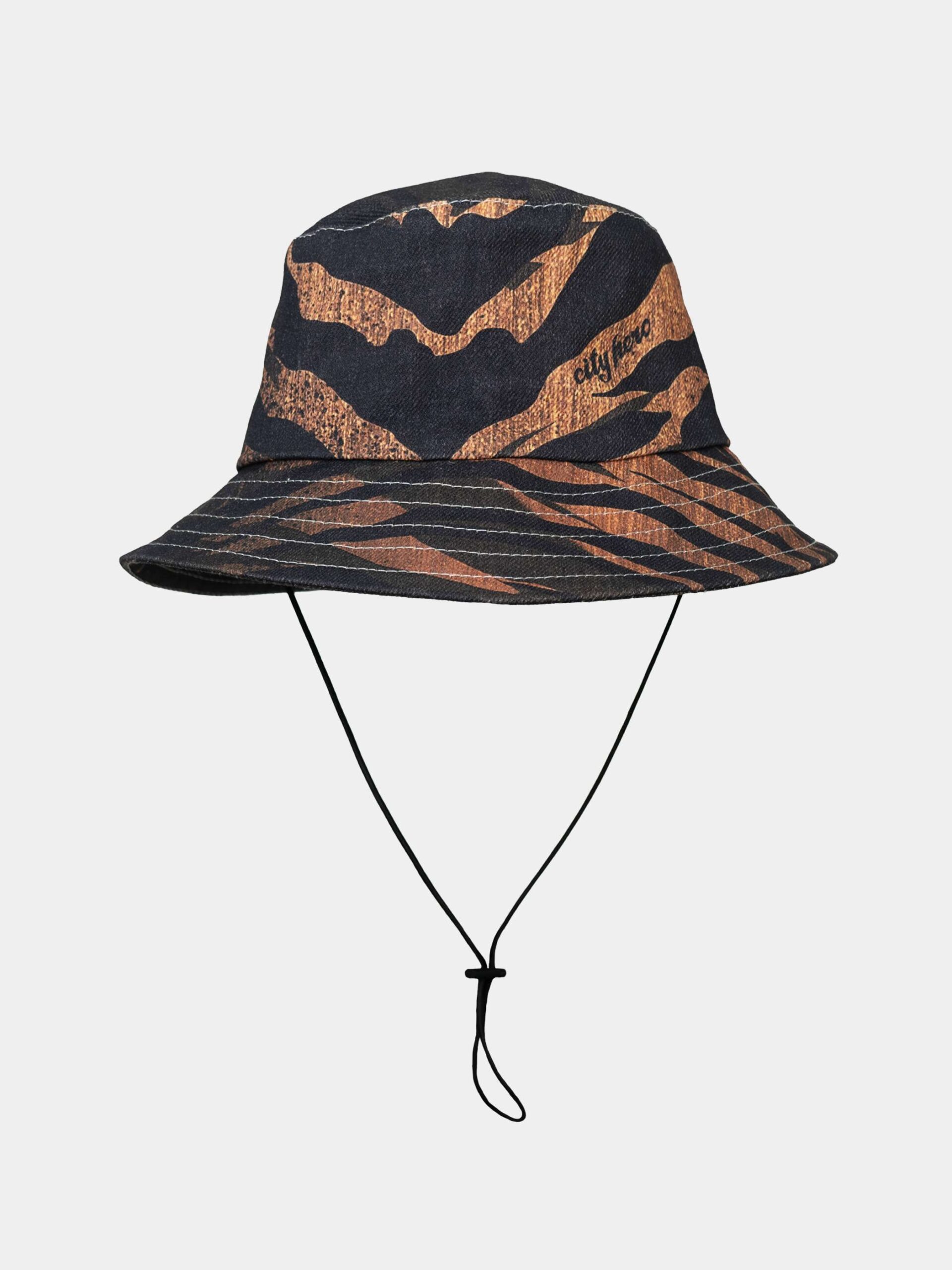 Панама со стилизованным анималистичным принтом Тигр. Выполнена из высококачественного канваса. Оснащена эластичным шнурком с ограничителем и вентиляционными люверсами.