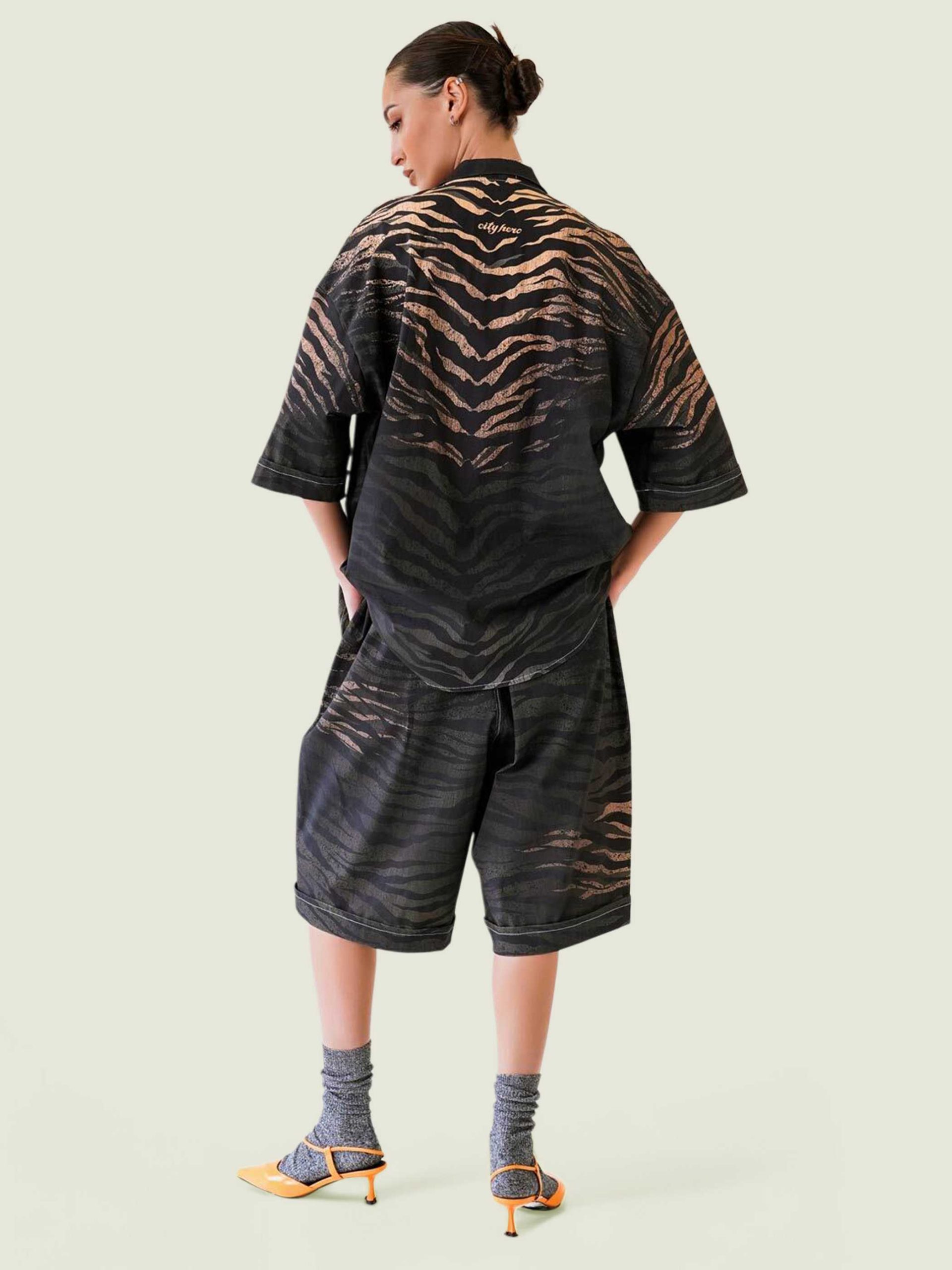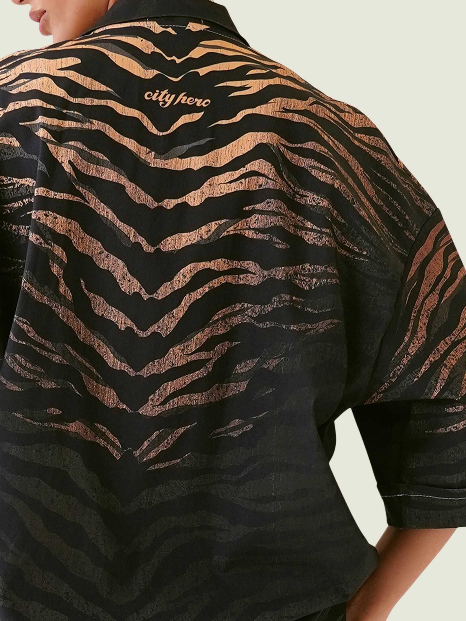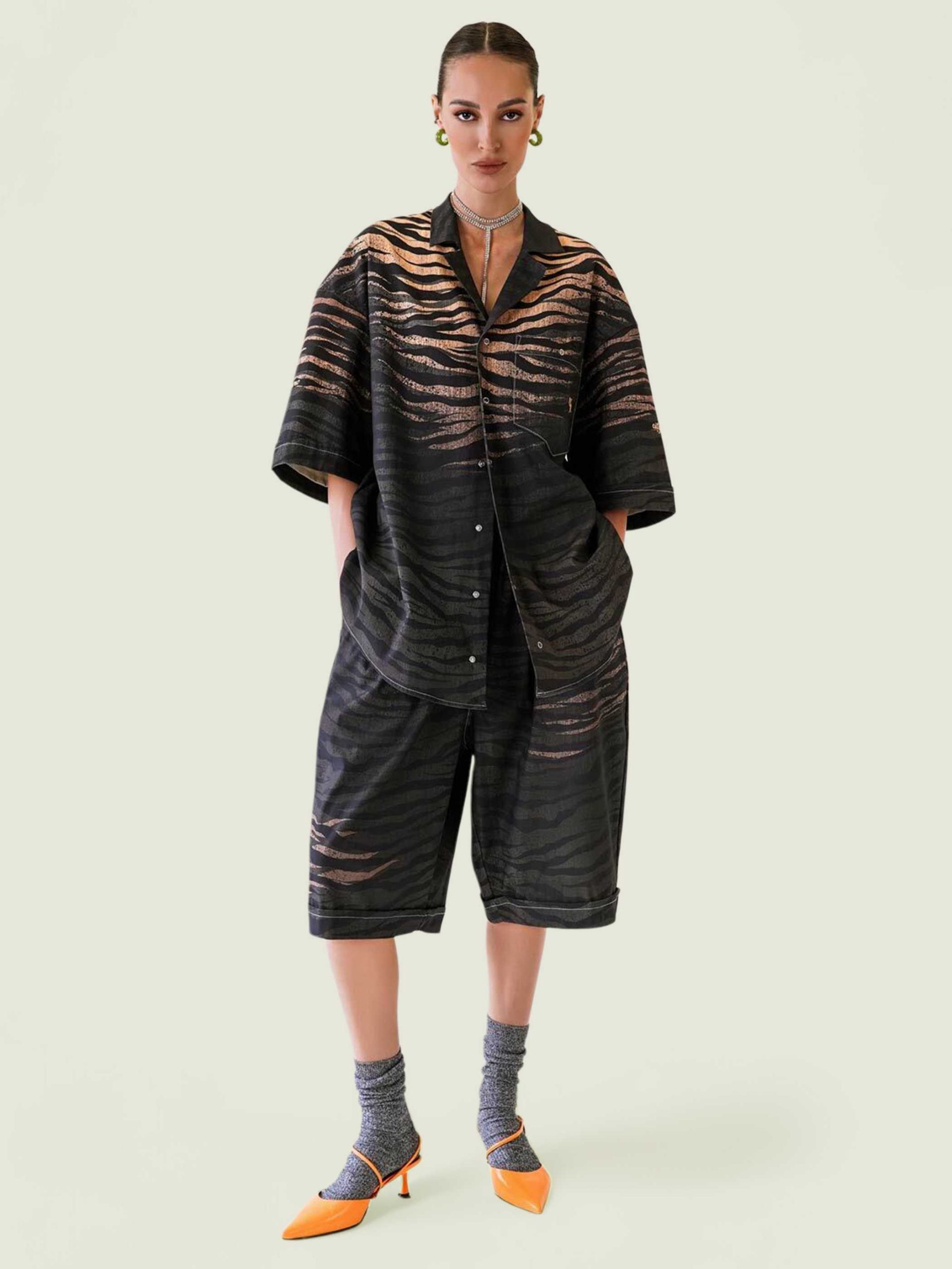 Рубашка с короткими рукавами в стиле оверсайз со стилизованным анималистичным принтом Тигр. Жаркие оттенки и анатомичная структура подчёркивают вашу грацию и свободу одновременно.