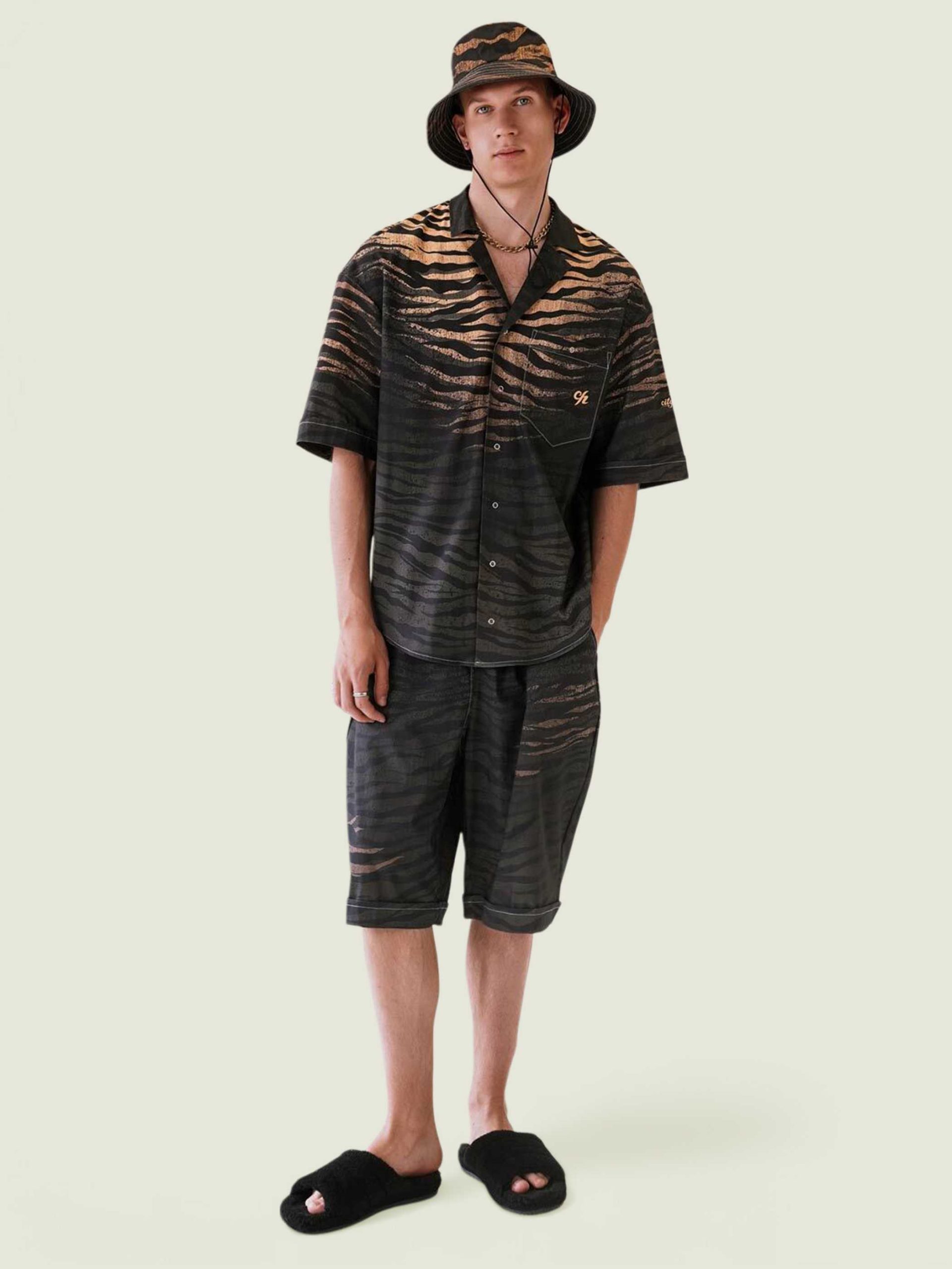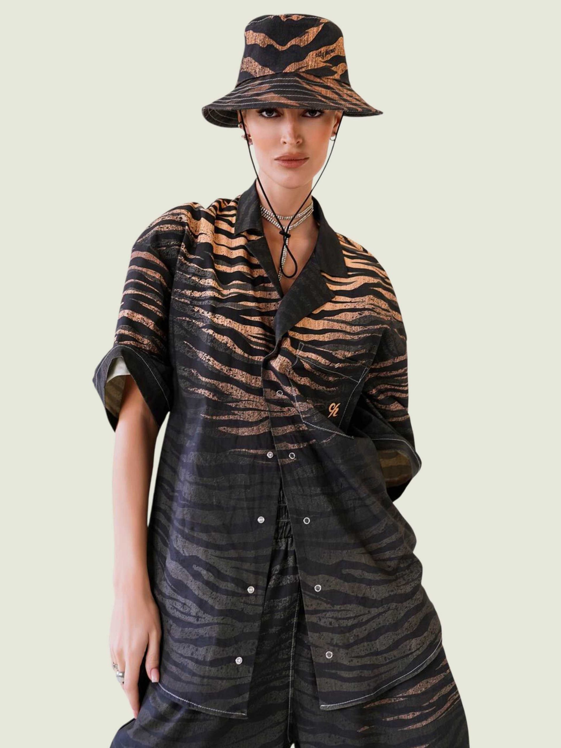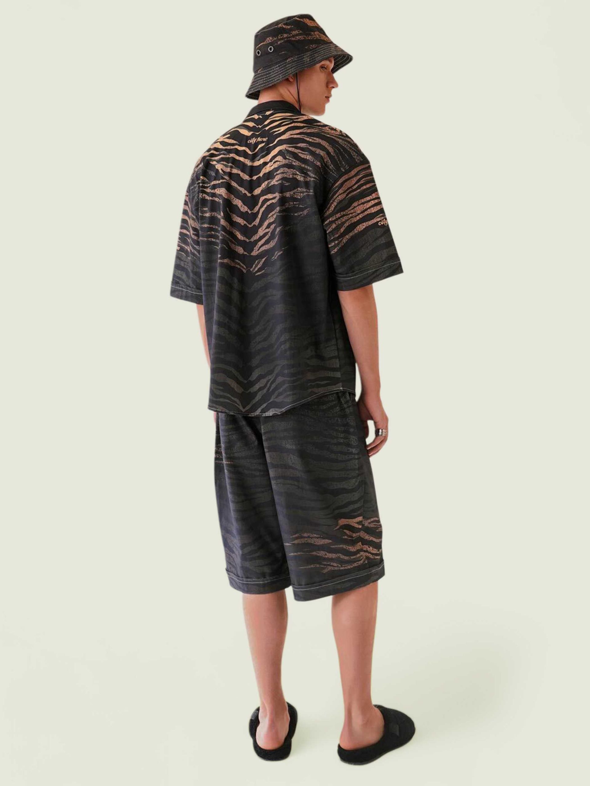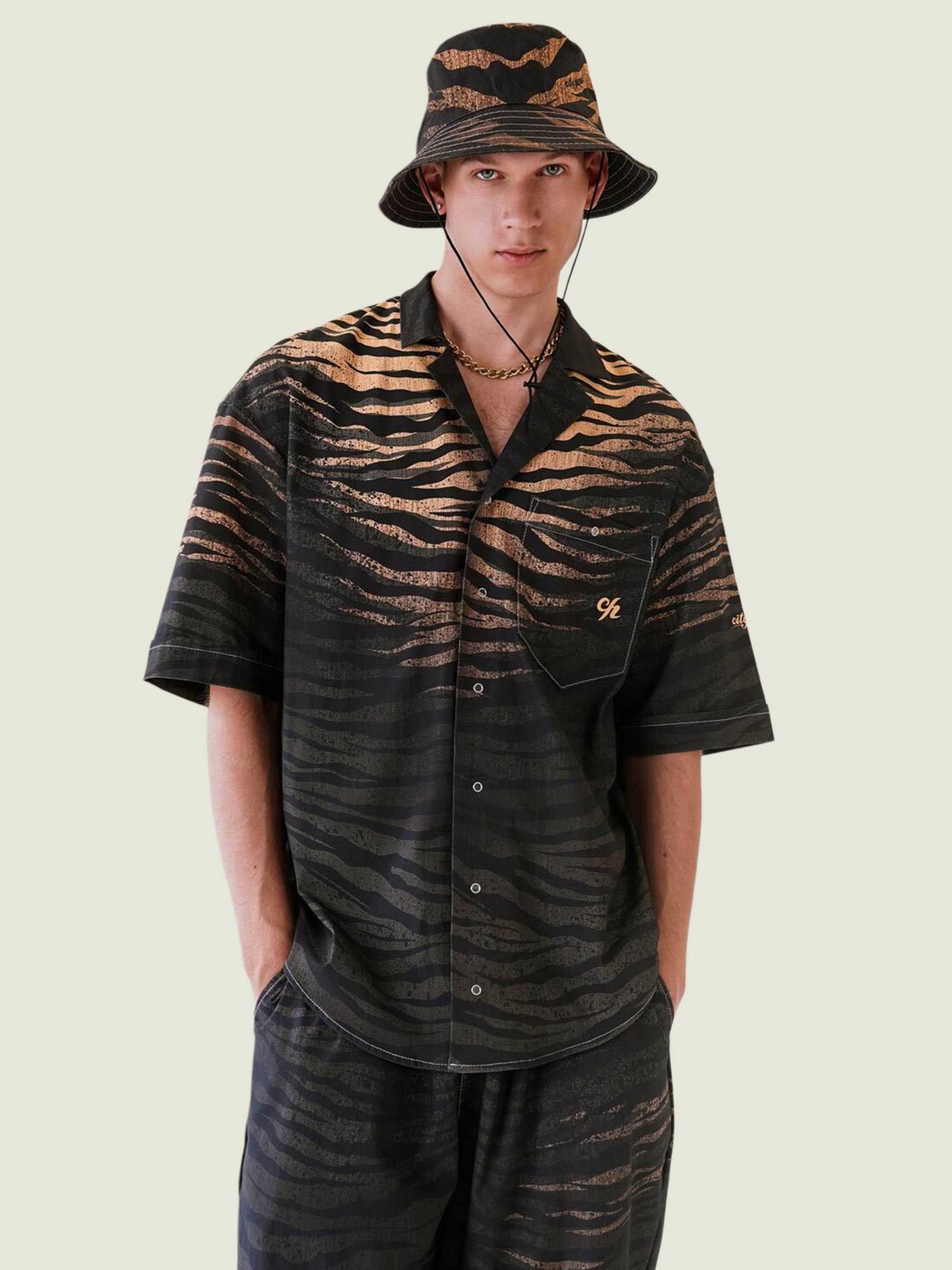 Рубашка с короткими рукавами в стиле оверсайз со стилизованным анималистичным принтом Тигр. Жаркие оттенки и анатомичная структура подчёркивают вашу грацию и свободу одновременно.