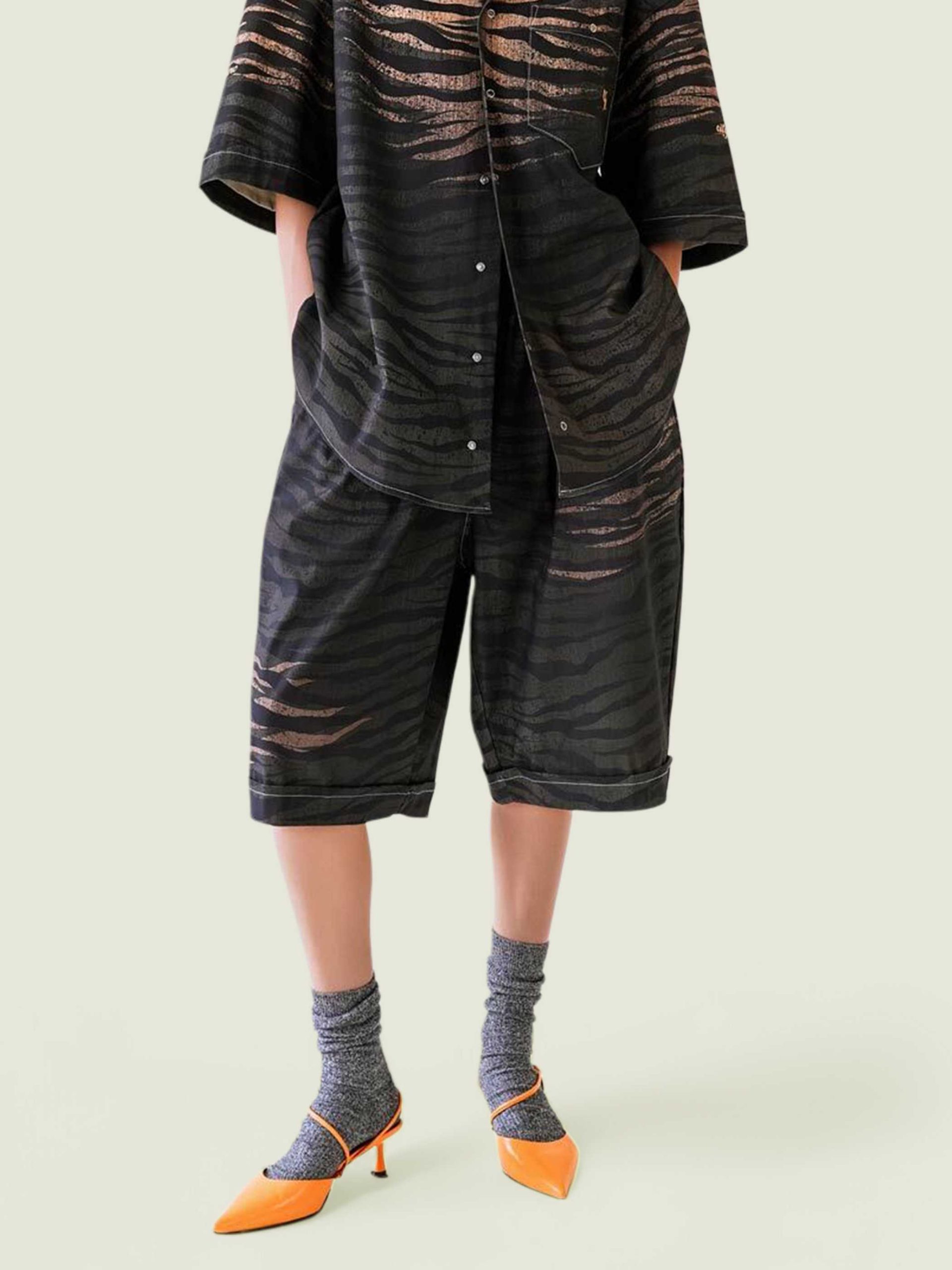 Шорты в стиле оверсайз со стилизованным анималистичным принтом Тигр. Жаркие оттенки и анатомичная структура подчёркивают вашу грацию и свободу одновременно.
