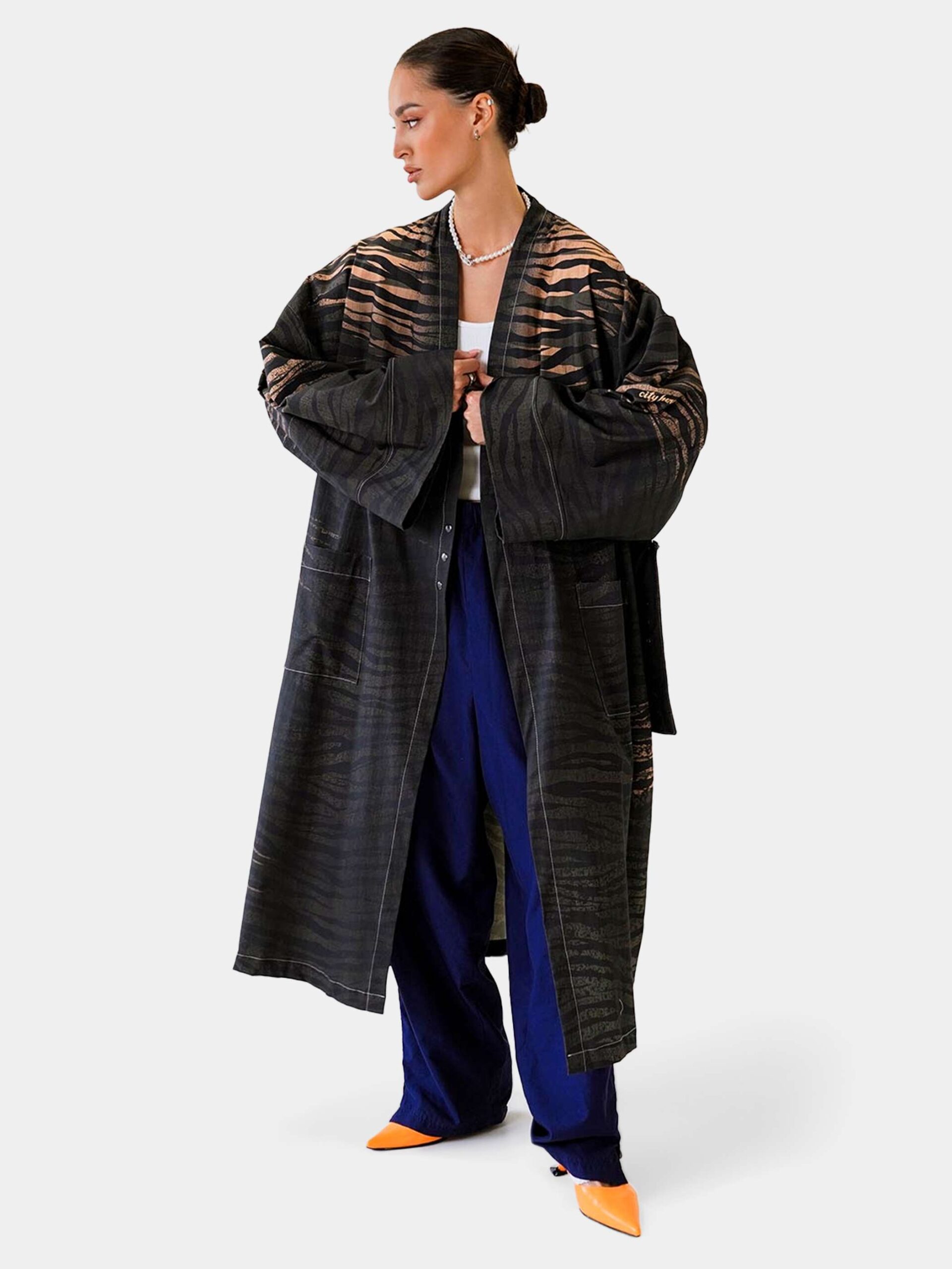 Уличный халат в стиле оверсайз со стилизованным анималистичным принтом Тигр. Жаркие оттенки и анатомичная структура подчёркивают вашу грацию и свободу одновременно.