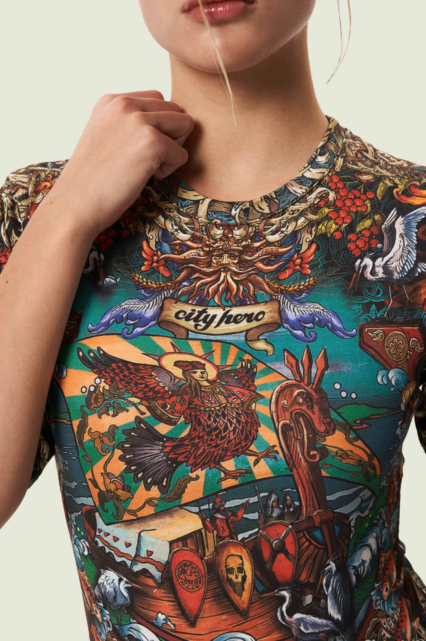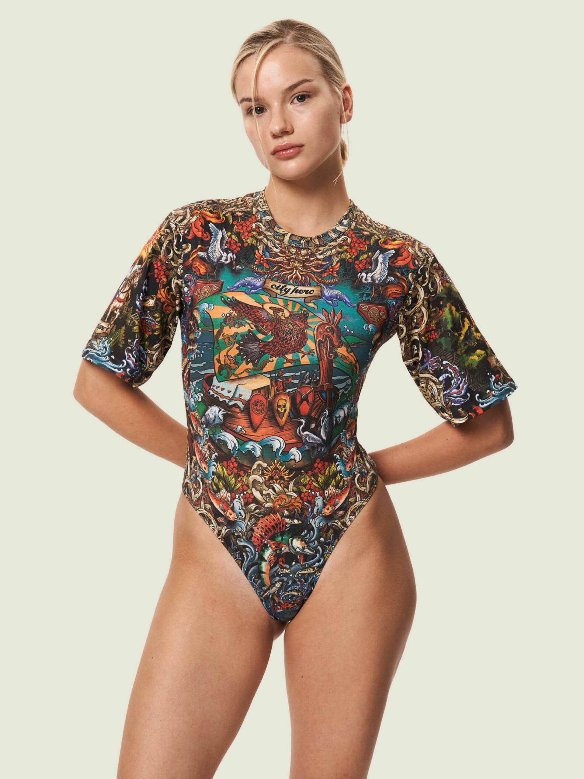 Боди-футболка универсальной формы, с широкими рукавами и прилегающим кроем. Боди можно комбинировать как с базовыми вещами, так и с изделиями CITY HERO того же или другого дизайна.